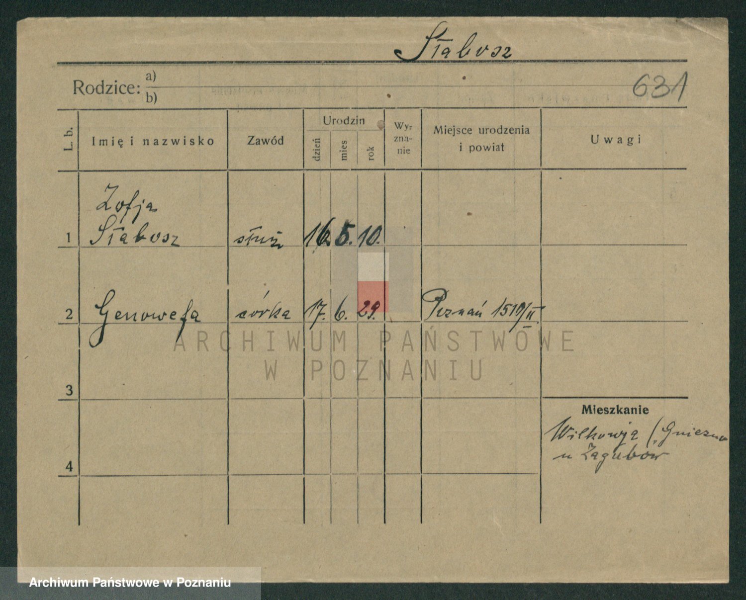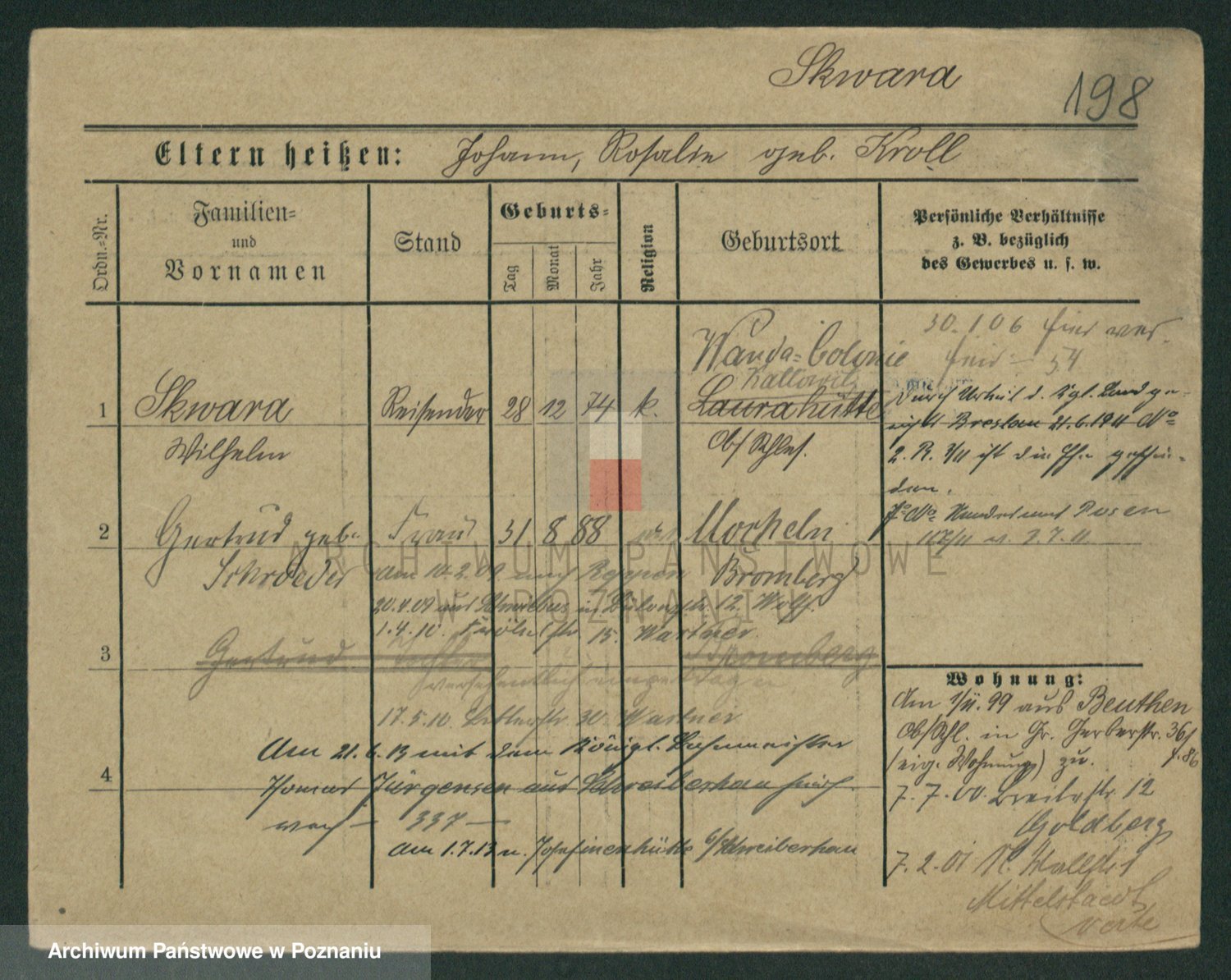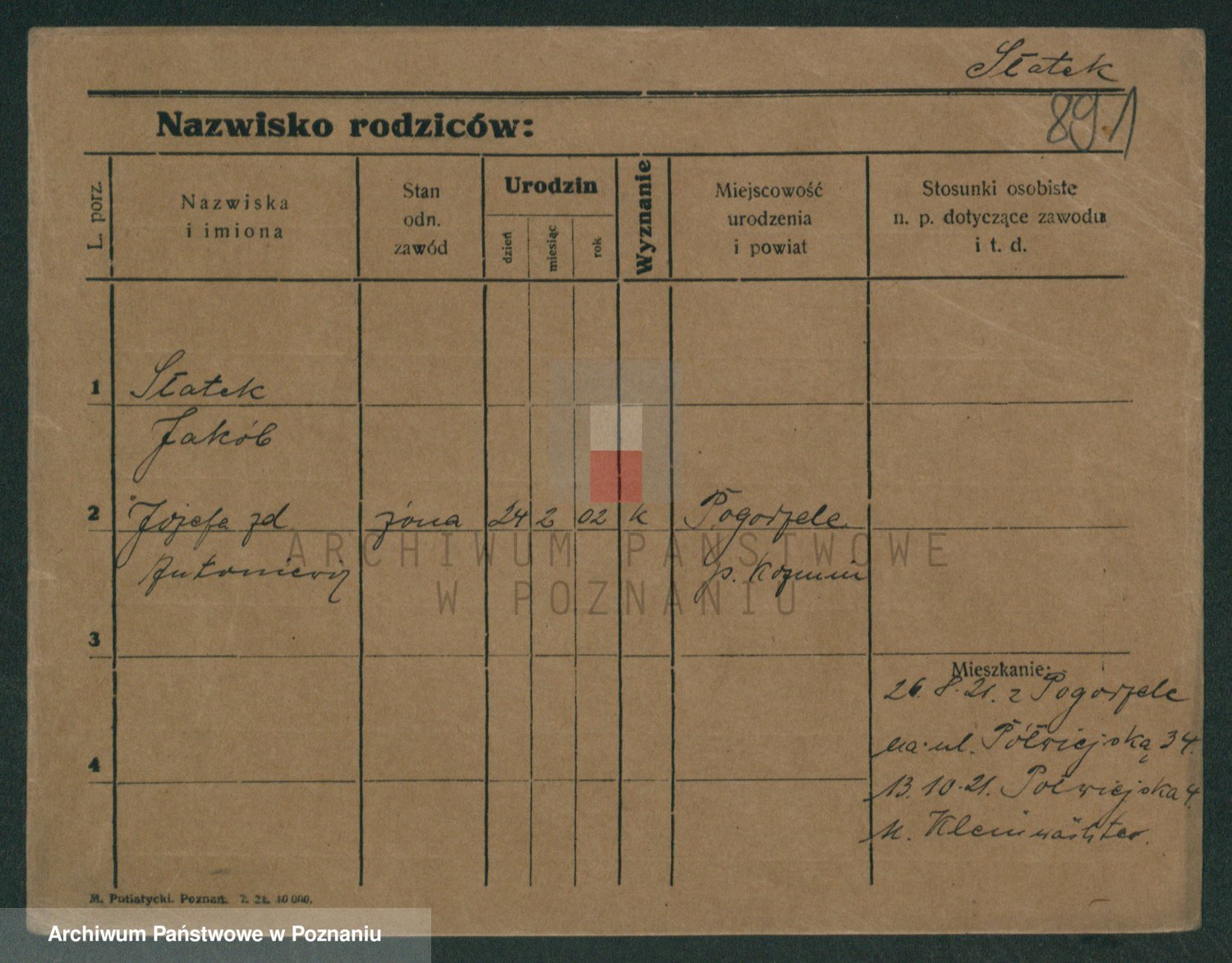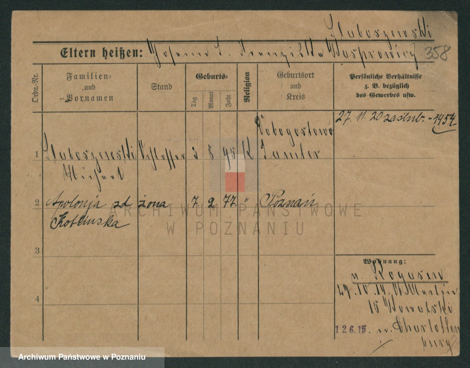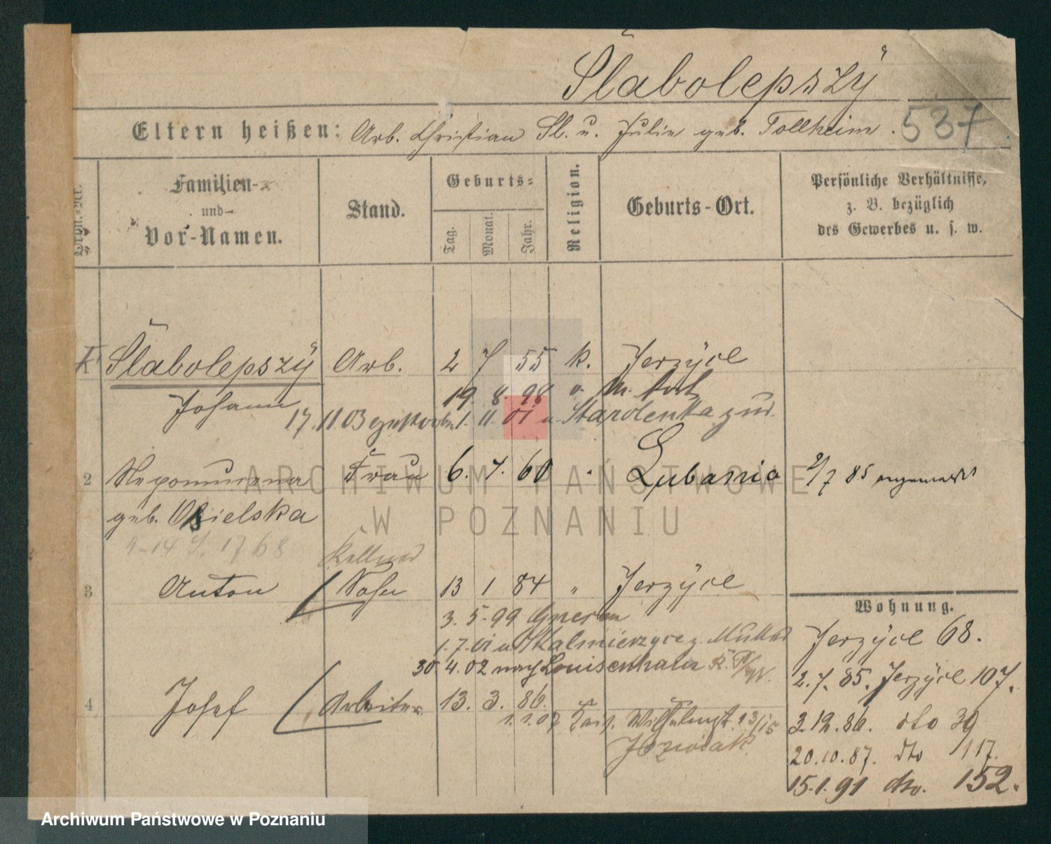 Podgląd karty osobowej dostępny jest po kliknięciu na nazwisko lub ikonkę karty. Można dokonywać powiększenia (ikony na górze) lub przechodzić między kolejnymi skanami (strzałki po bokach).