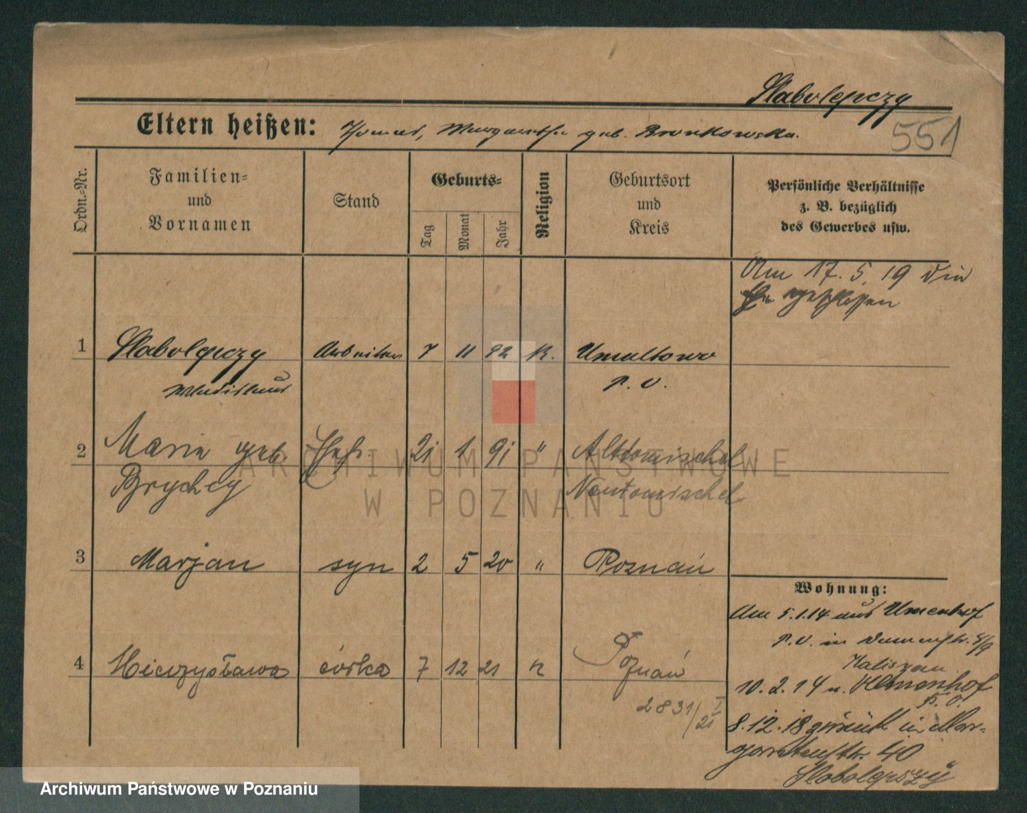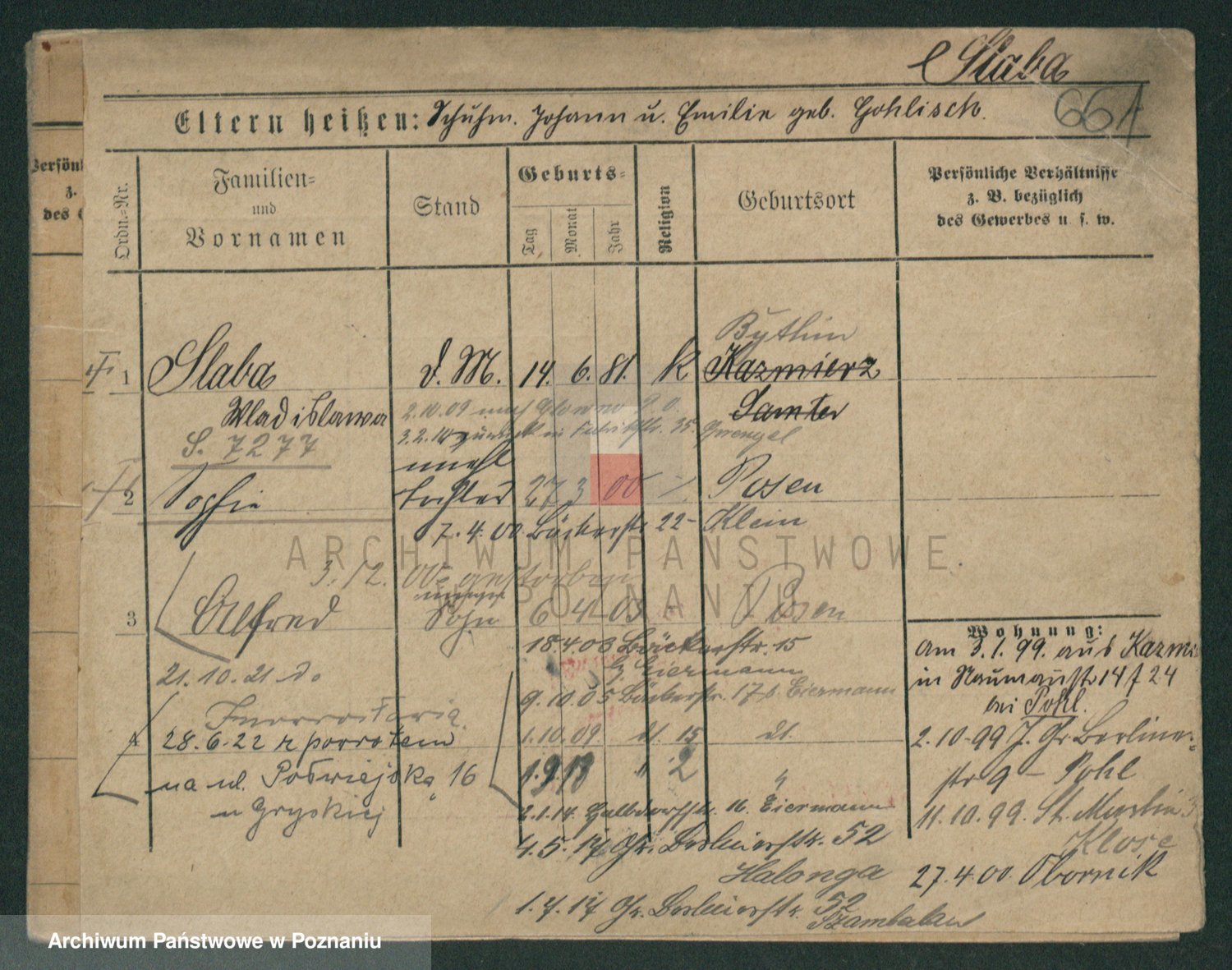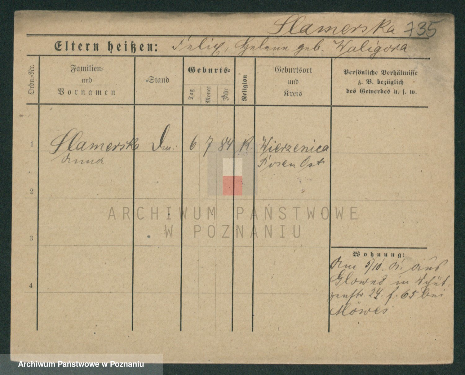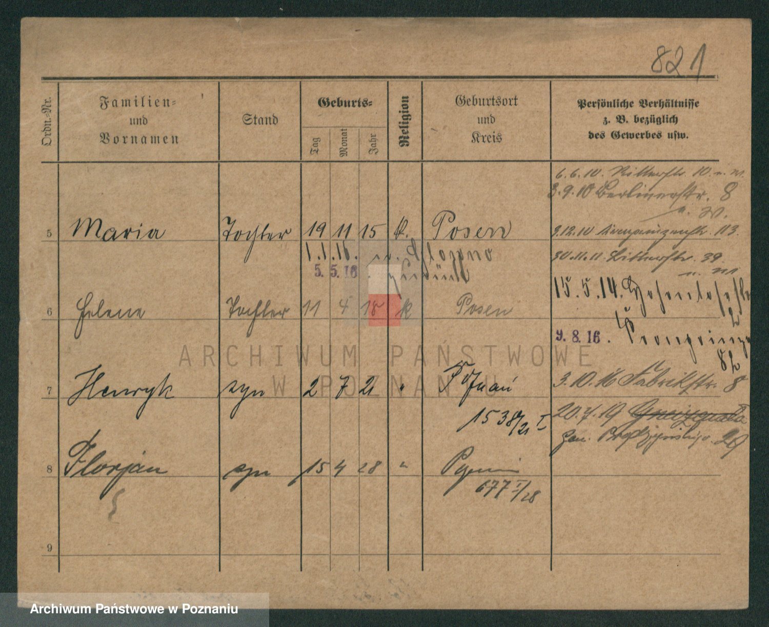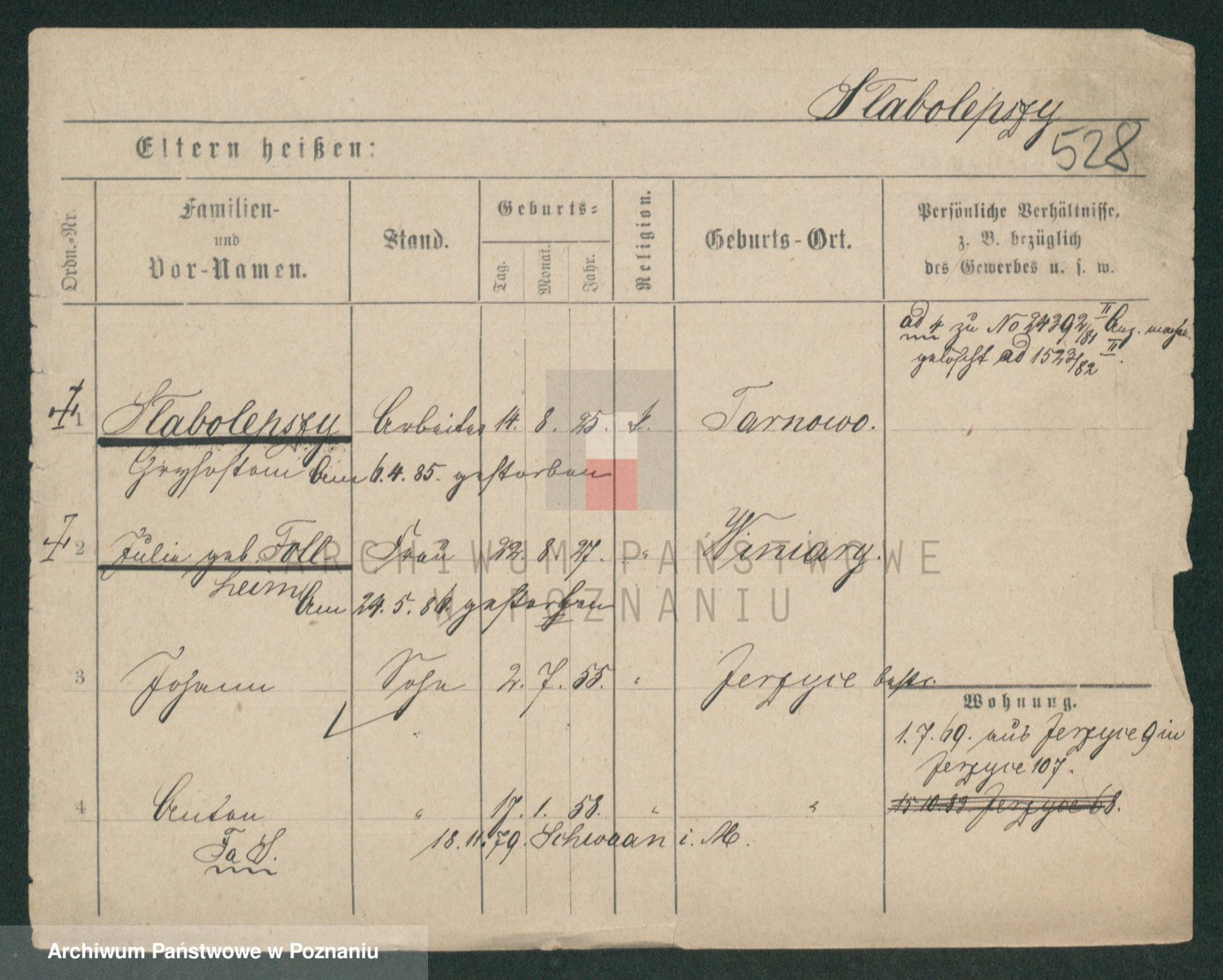 Podgląd karty osobowej dostępny jest po kliknięciu na nazwisko lub ikonkę karty. Można dokonywać powiększenia (ikony na górze) lub przechodzić między kolejnymi skanami (strzałki po bokach).