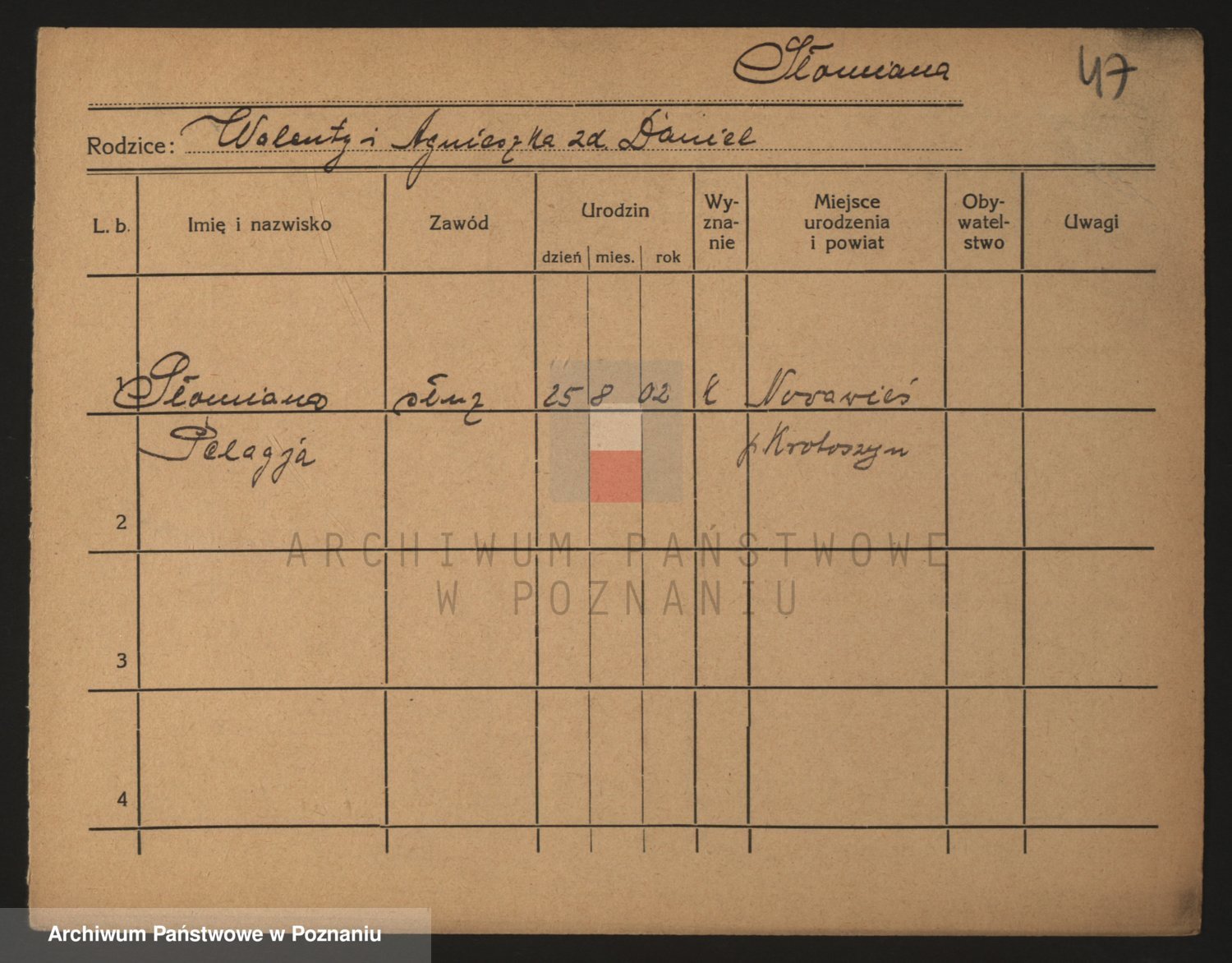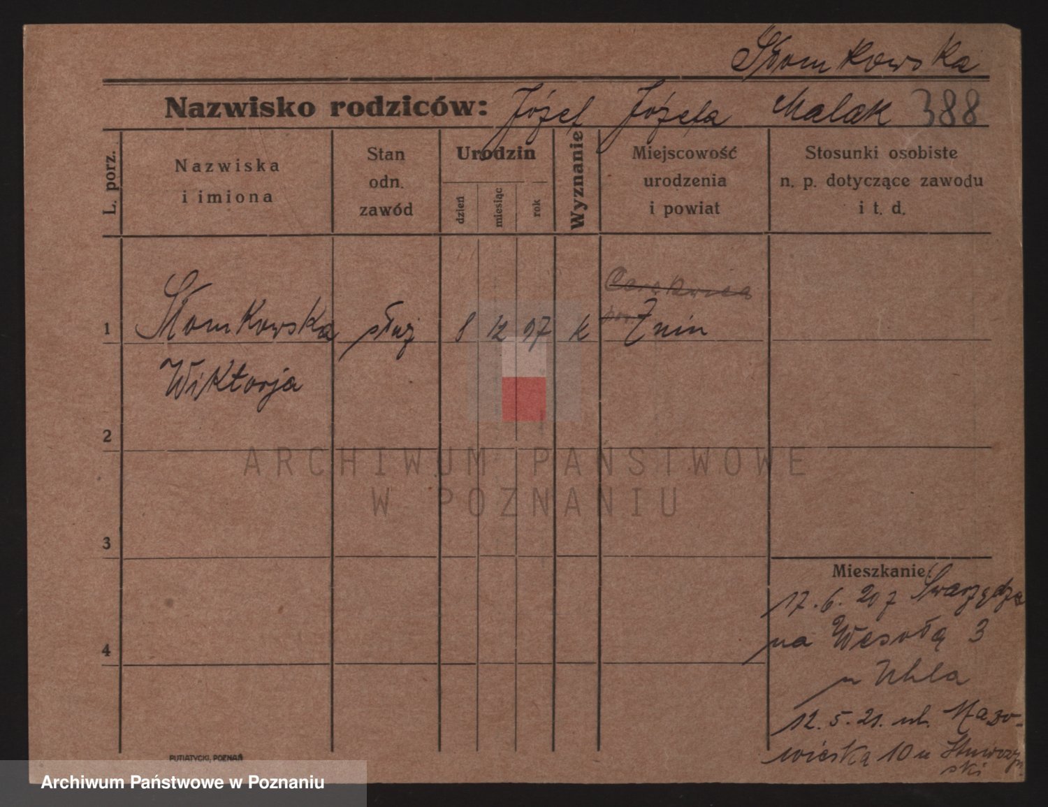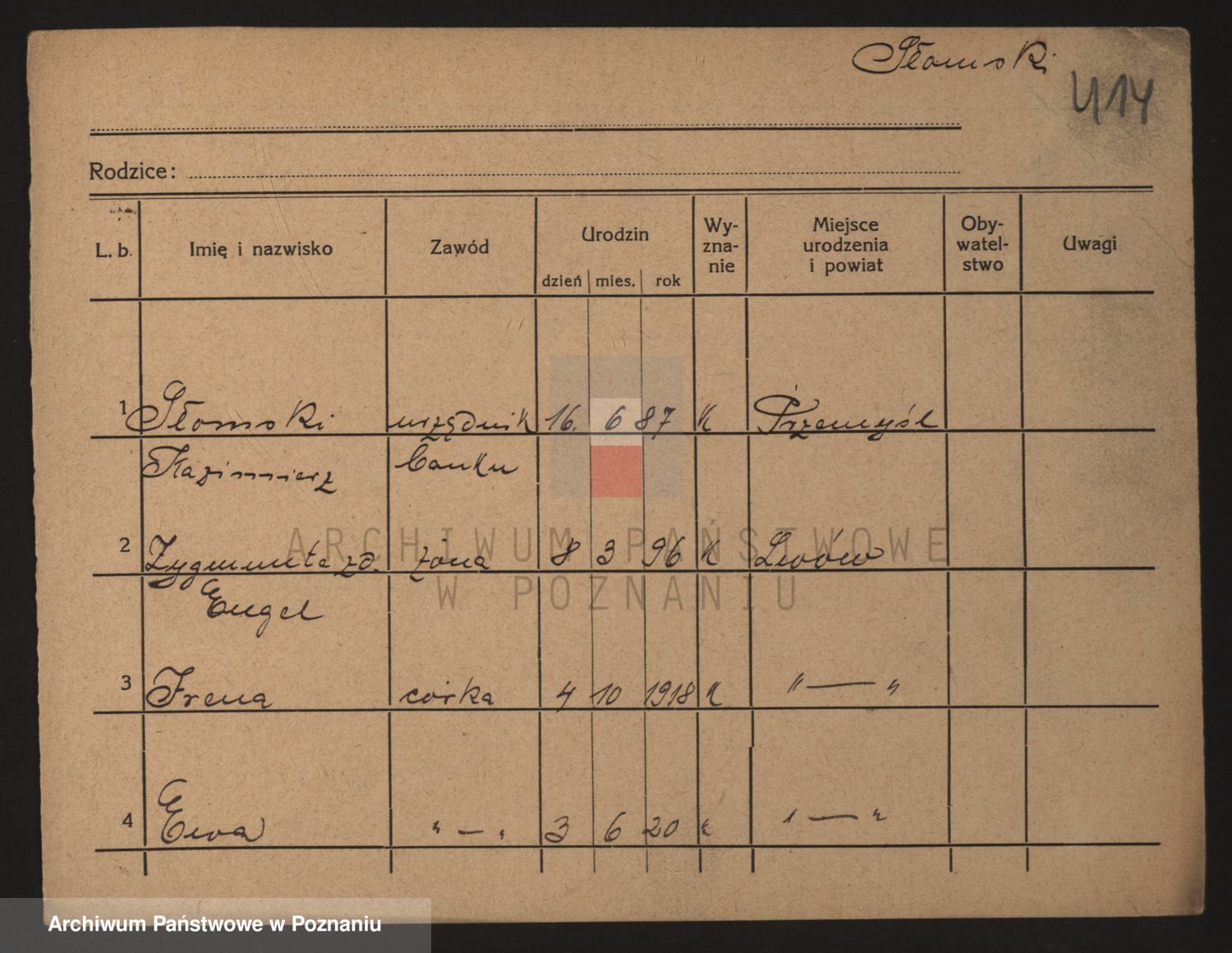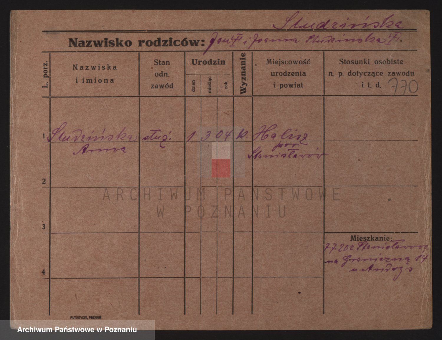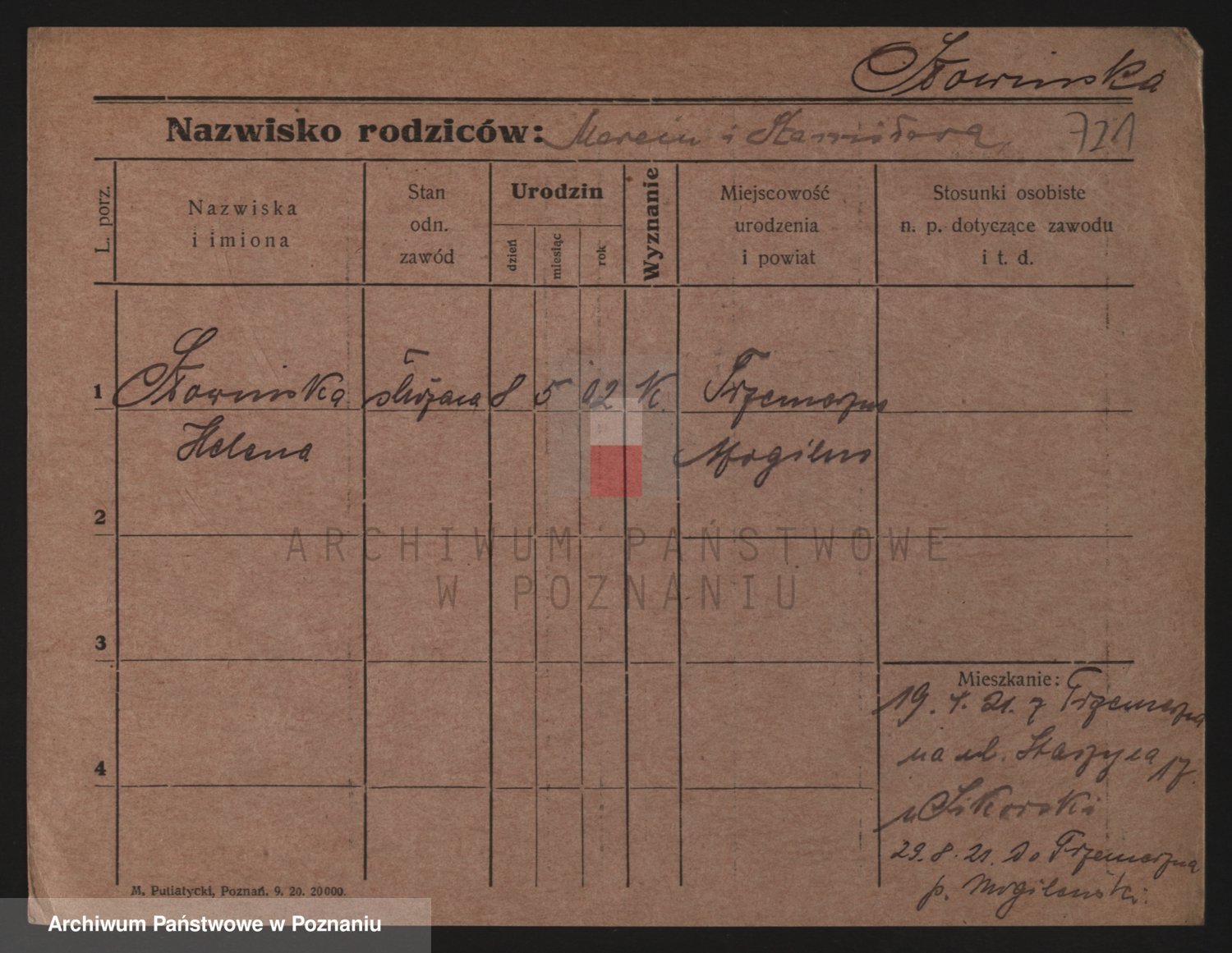 Podgląd karty osobowej dostępny jest po kliknięciu na nazwisko lub ikonkę karty. Można dokonywać powiększenia (ikony na górze) lub przechodzić między kolejnymi skanami (strzałki po bokach).