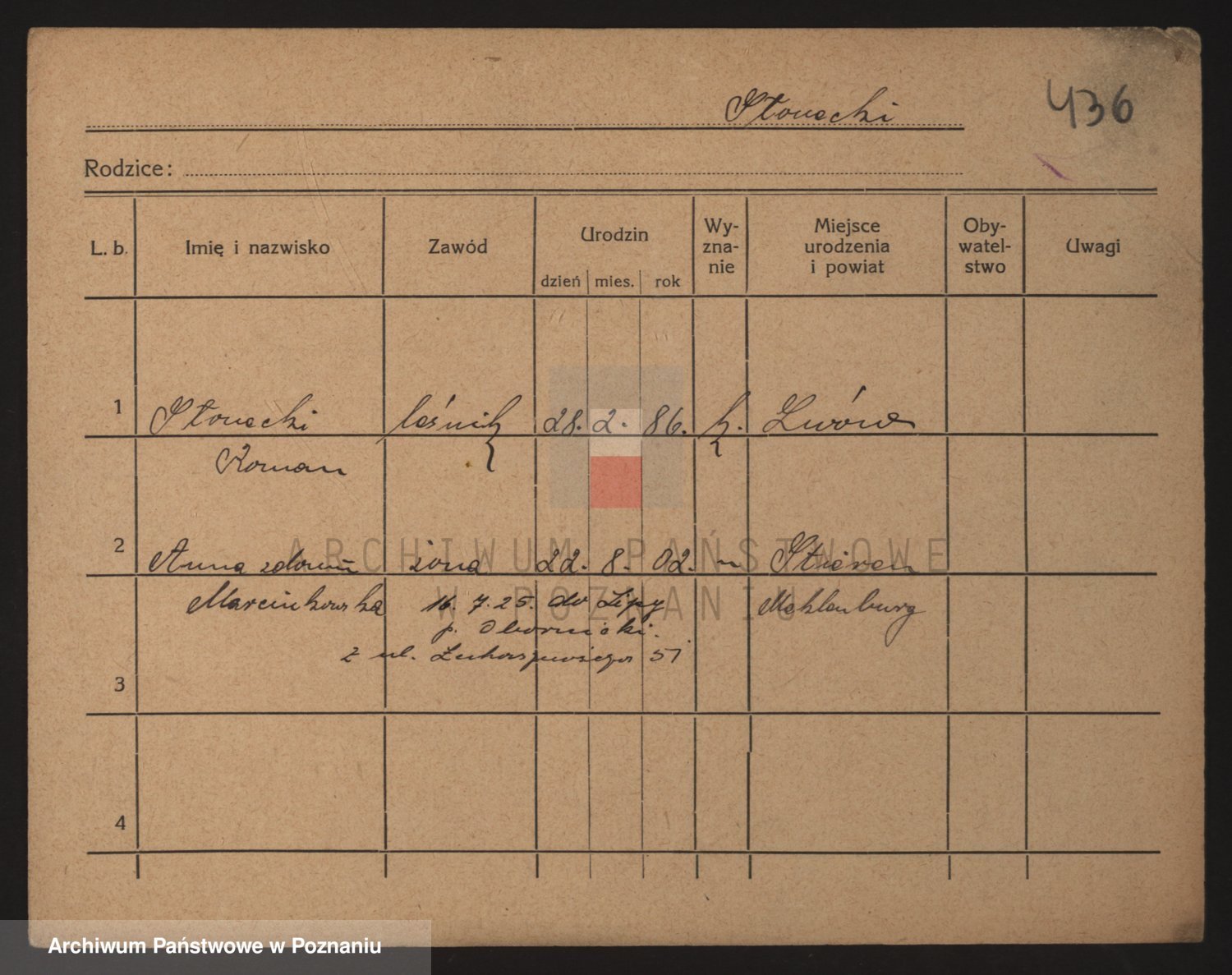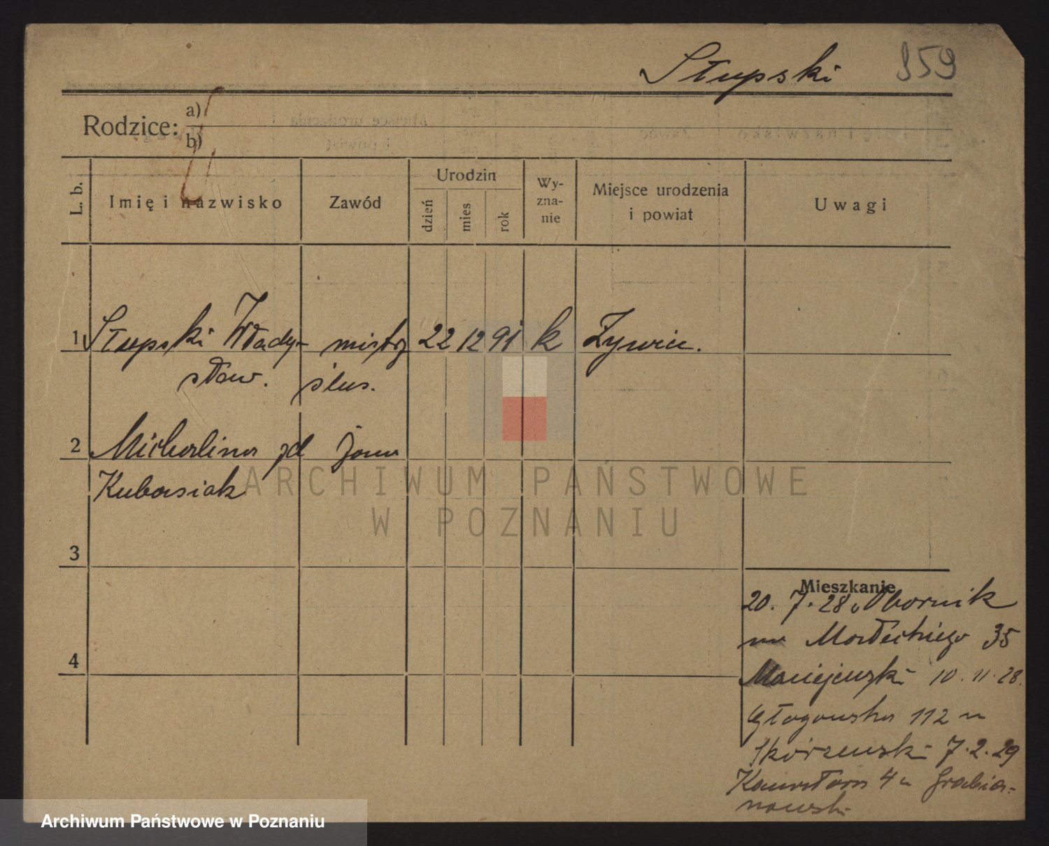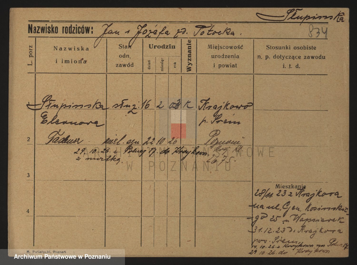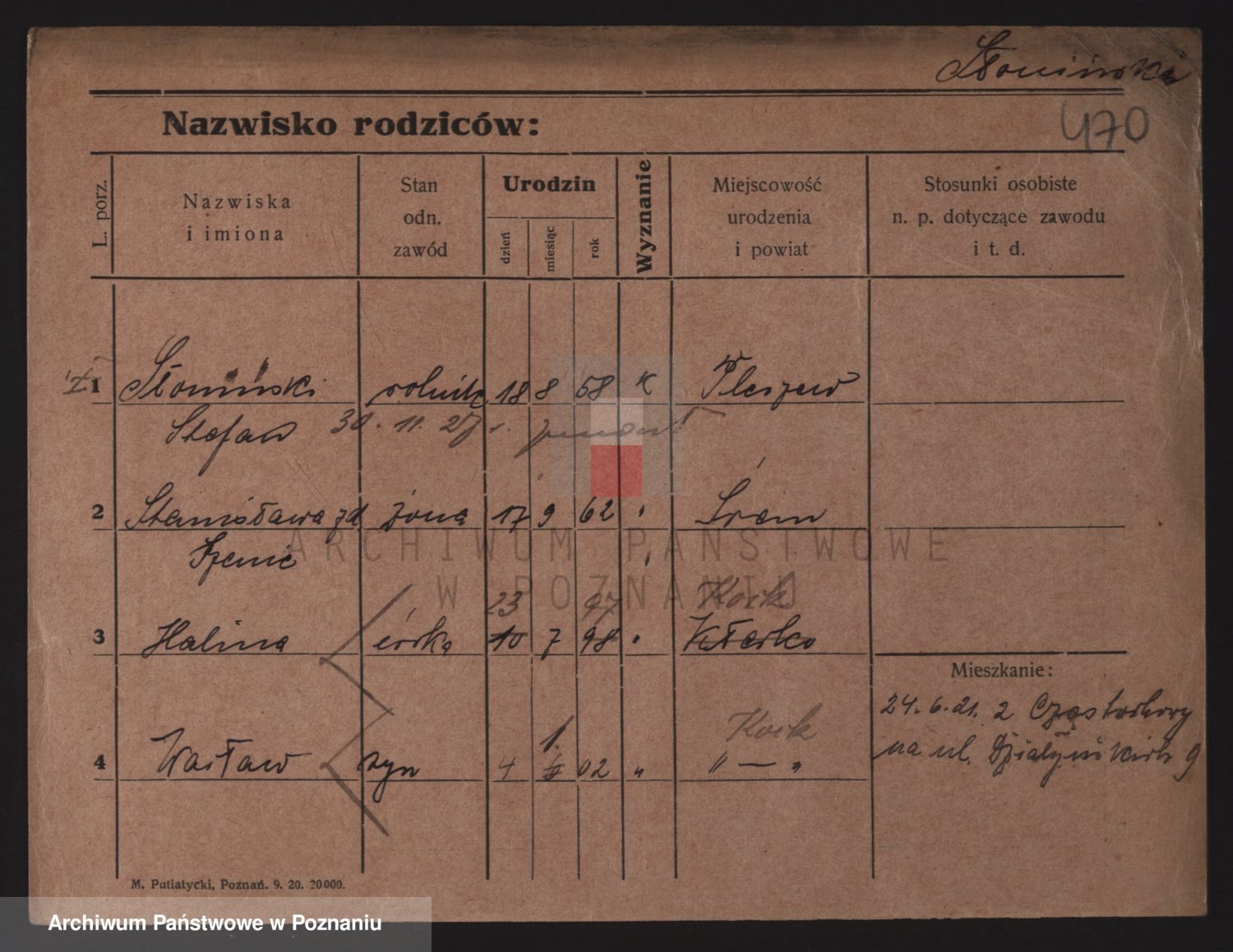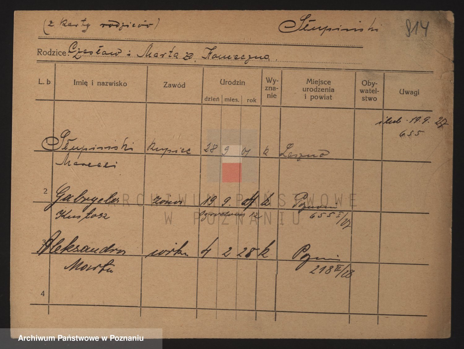 Podgląd karty osobowej dostępny jest po kliknięciu na nazwisko lub ikonkę karty. Można dokonywać powiększenia (ikony na górze) lub przechodzić między kolejnymi skanami (strzałki po bokach).