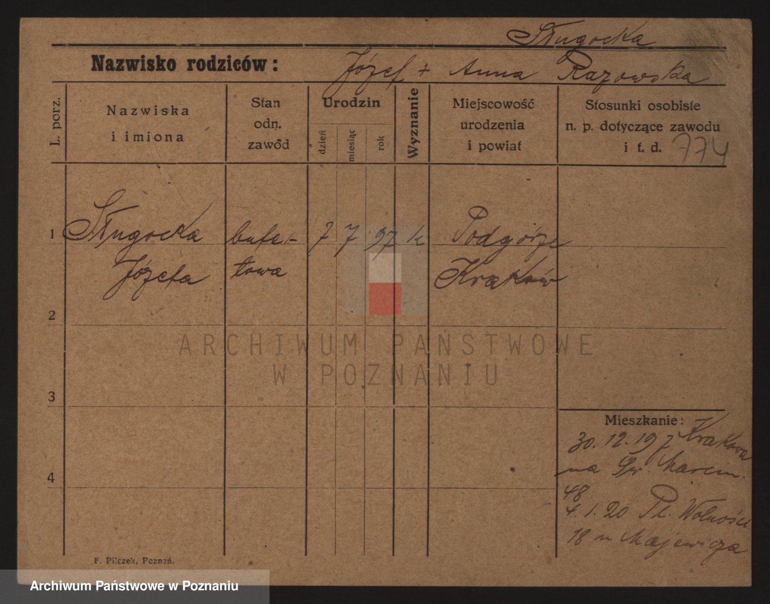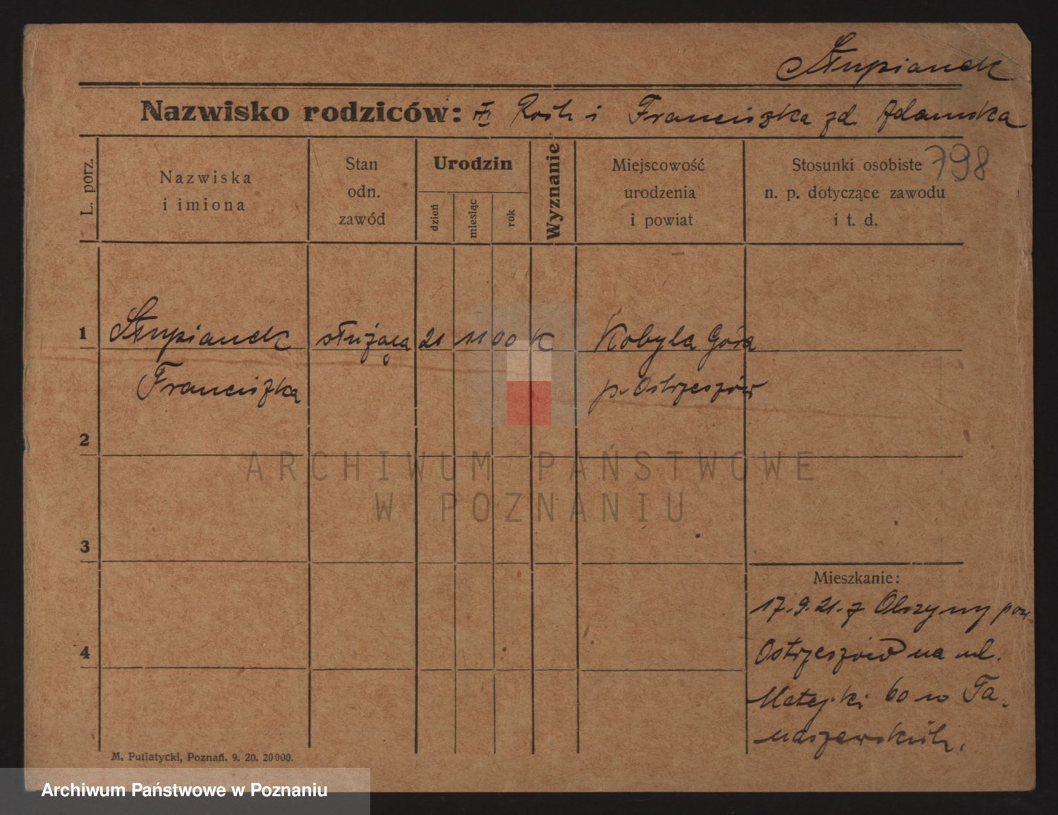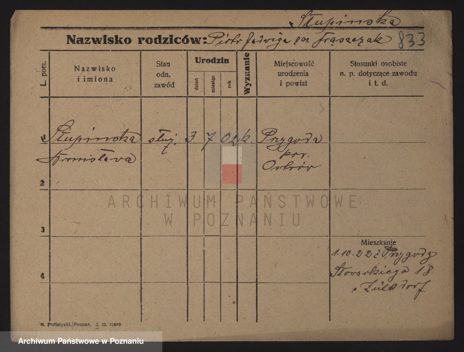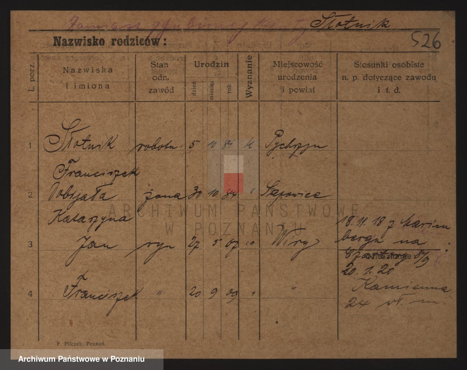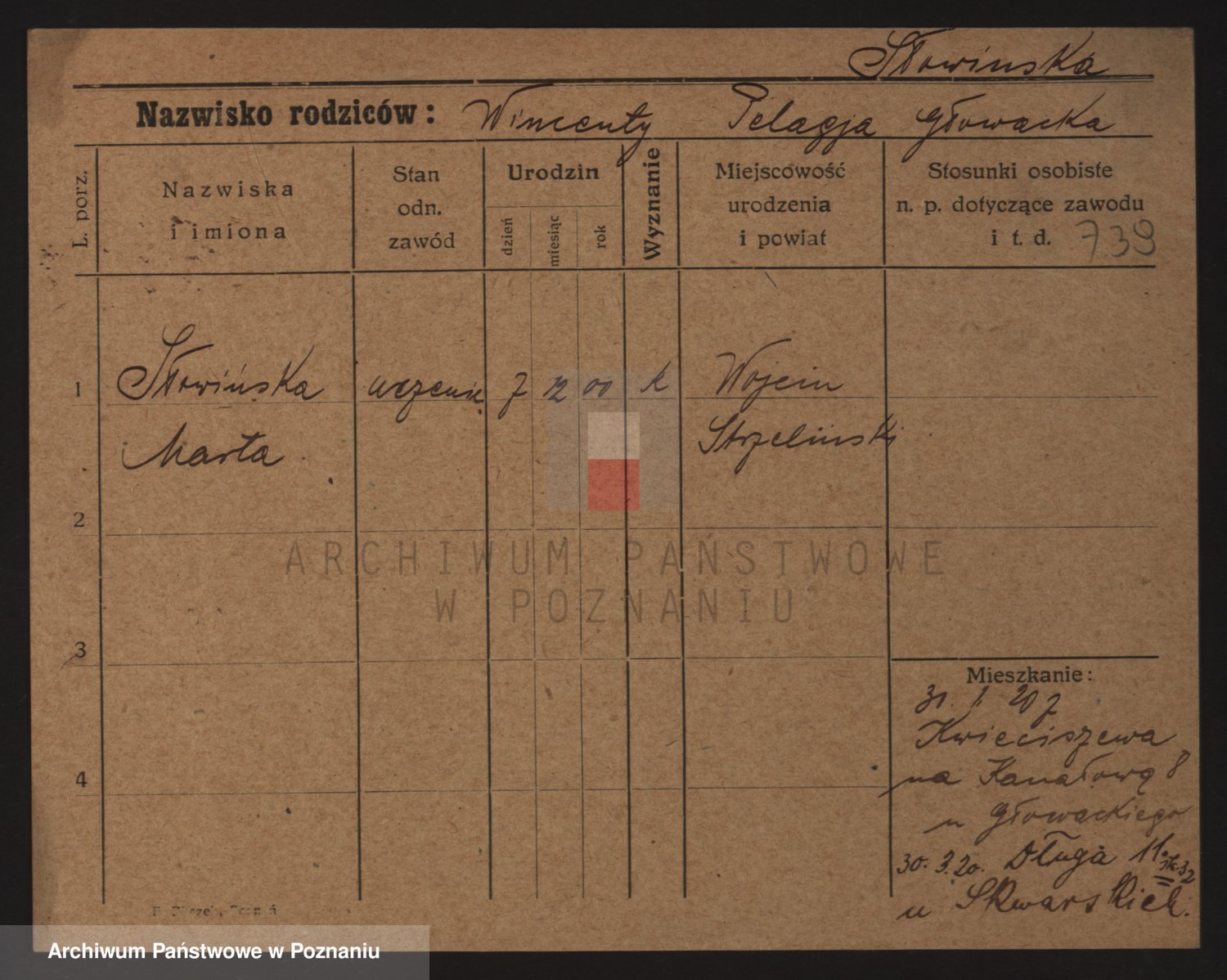 Podgląd karty osobowej dostępny jest po kliknięciu na nazwisko lub ikonkę karty. Można dokonywać powiększenia (ikony na górze) lub przechodzić między kolejnymi skanami (strzałki po bokach).