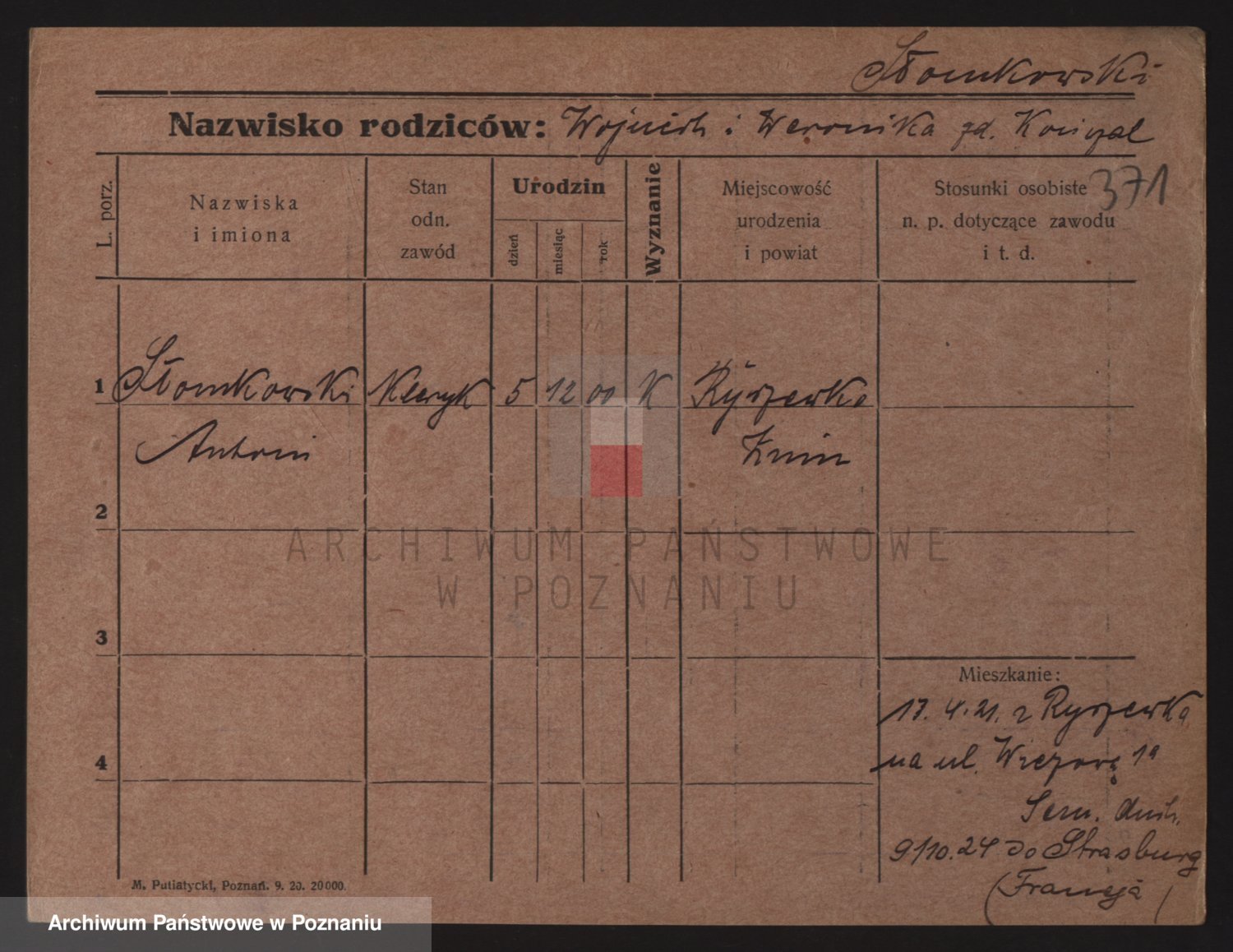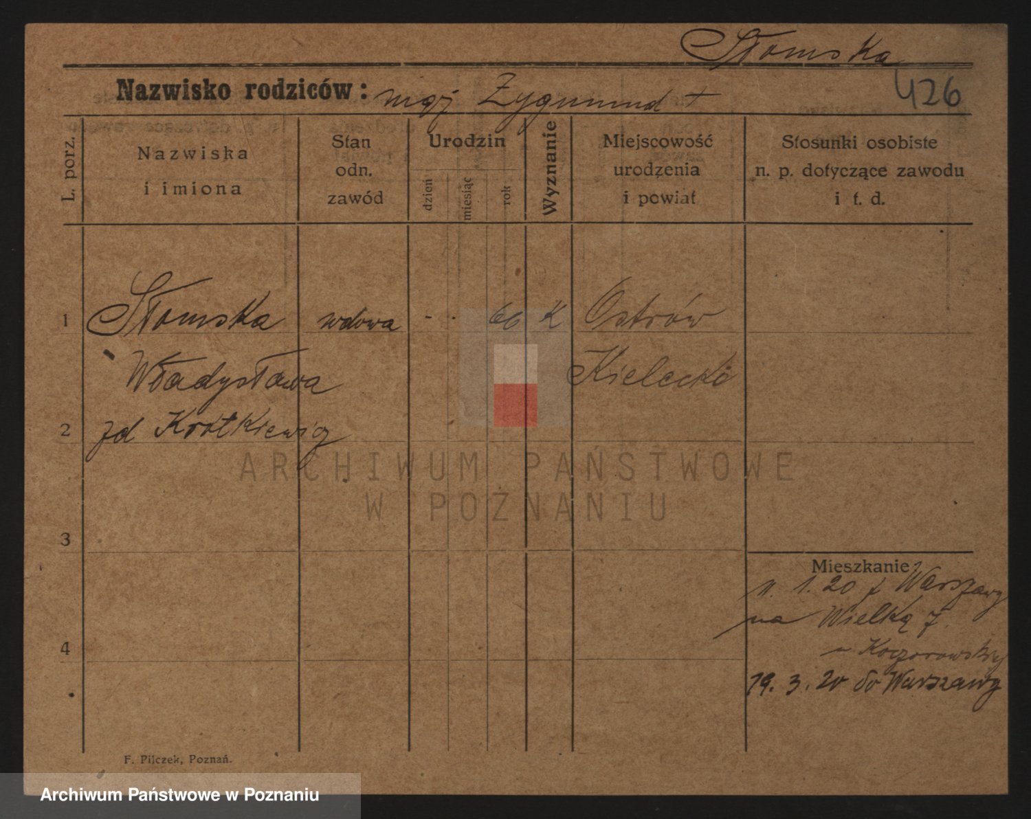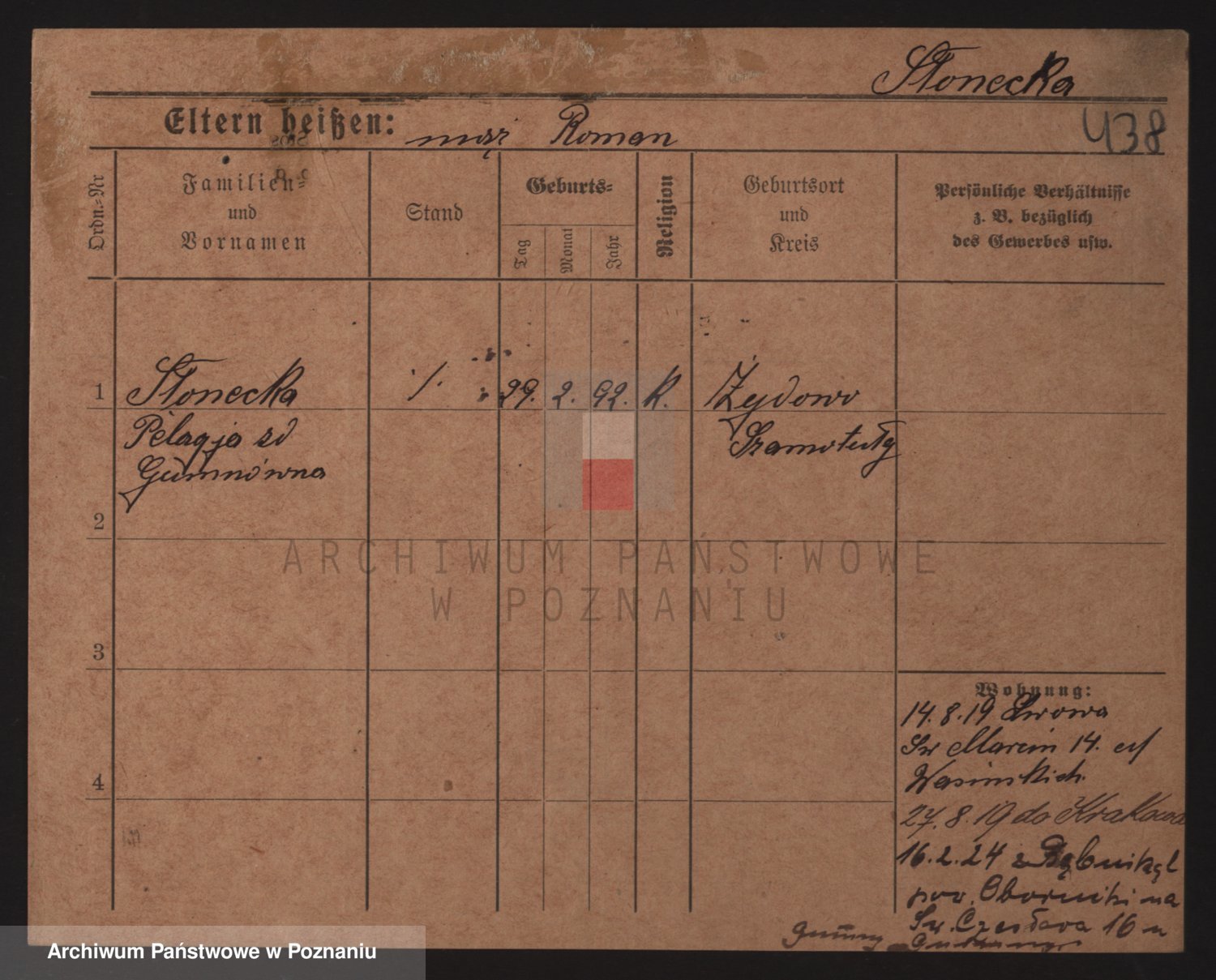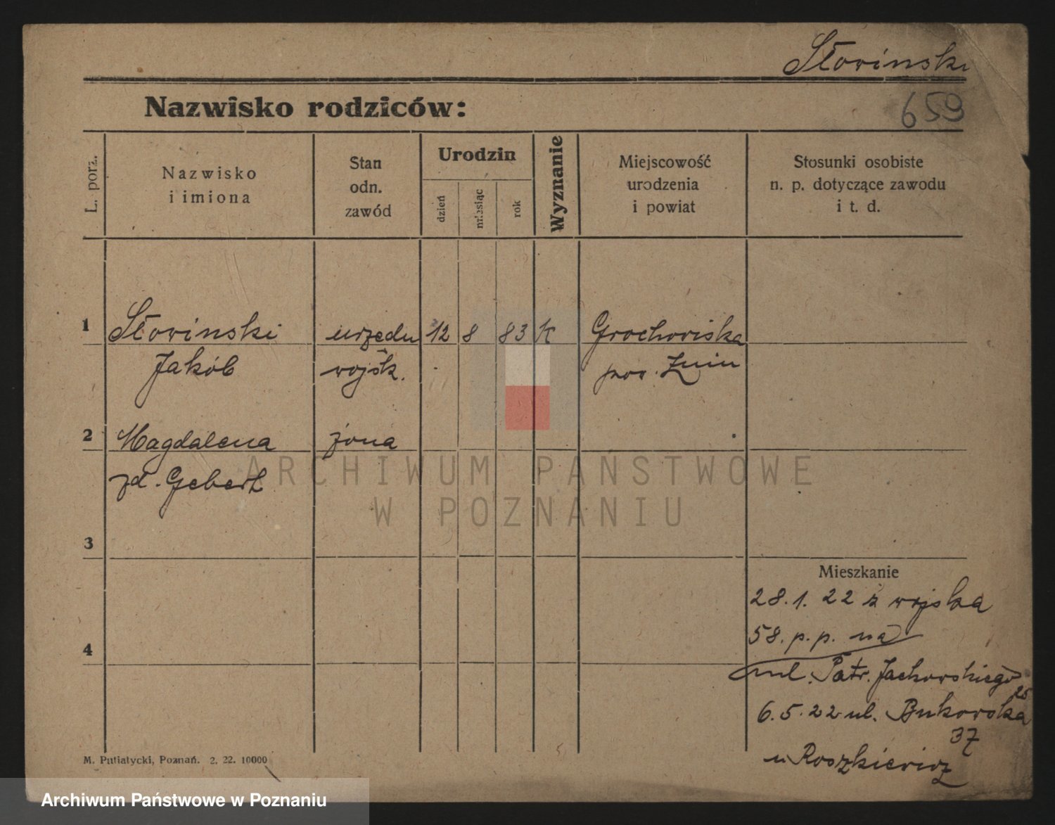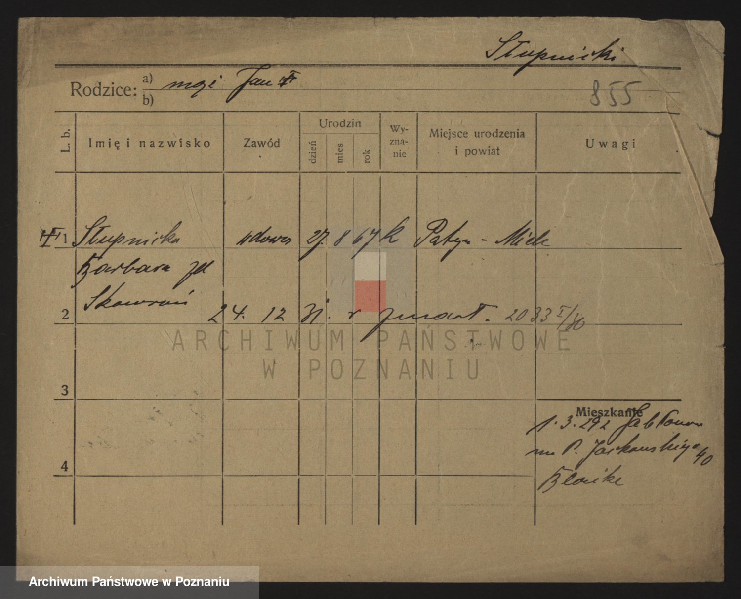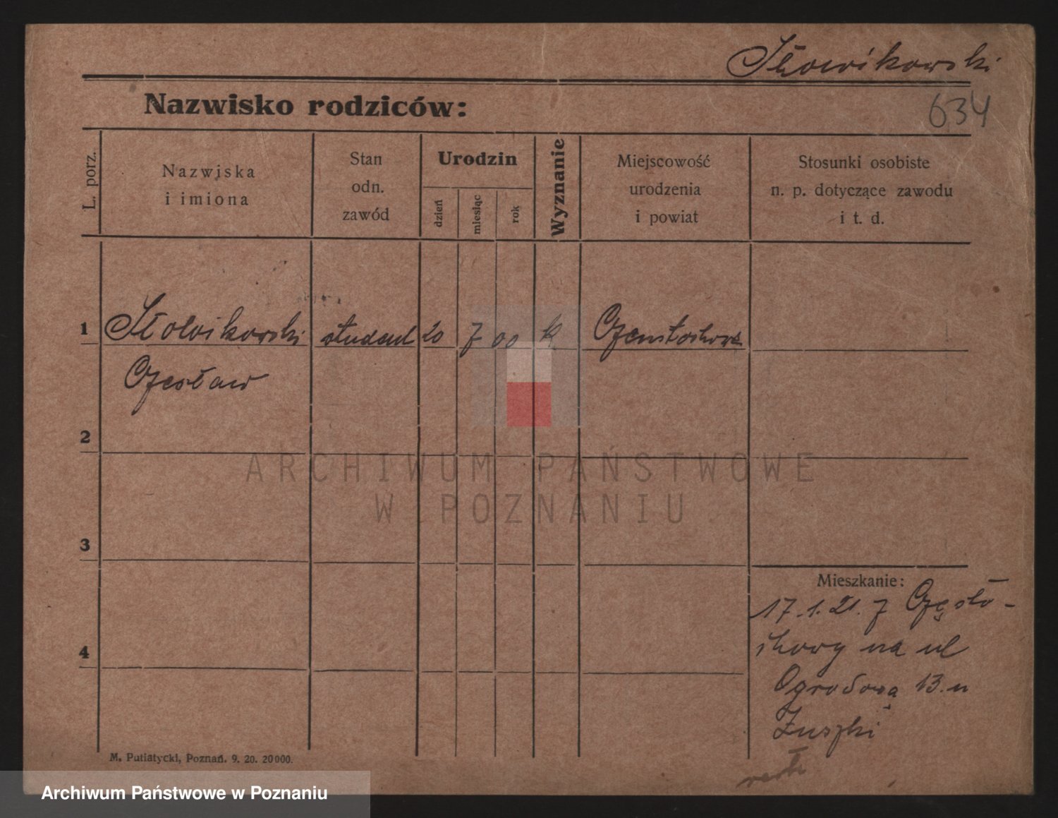 Podgląd karty osobowej dostępny jest po kliknięciu na nazwisko lub ikonkę karty. Można dokonywać powiększenia (ikony na górze) lub przechodzić między kolejnymi skanami (strzałki po bokach).