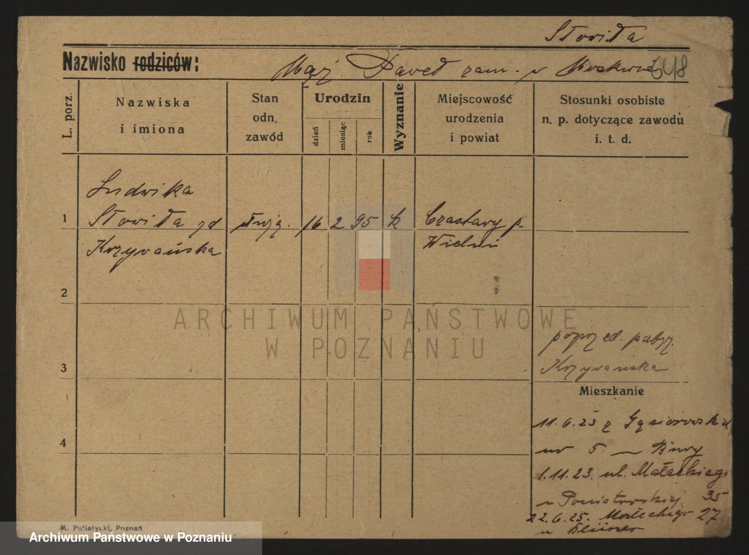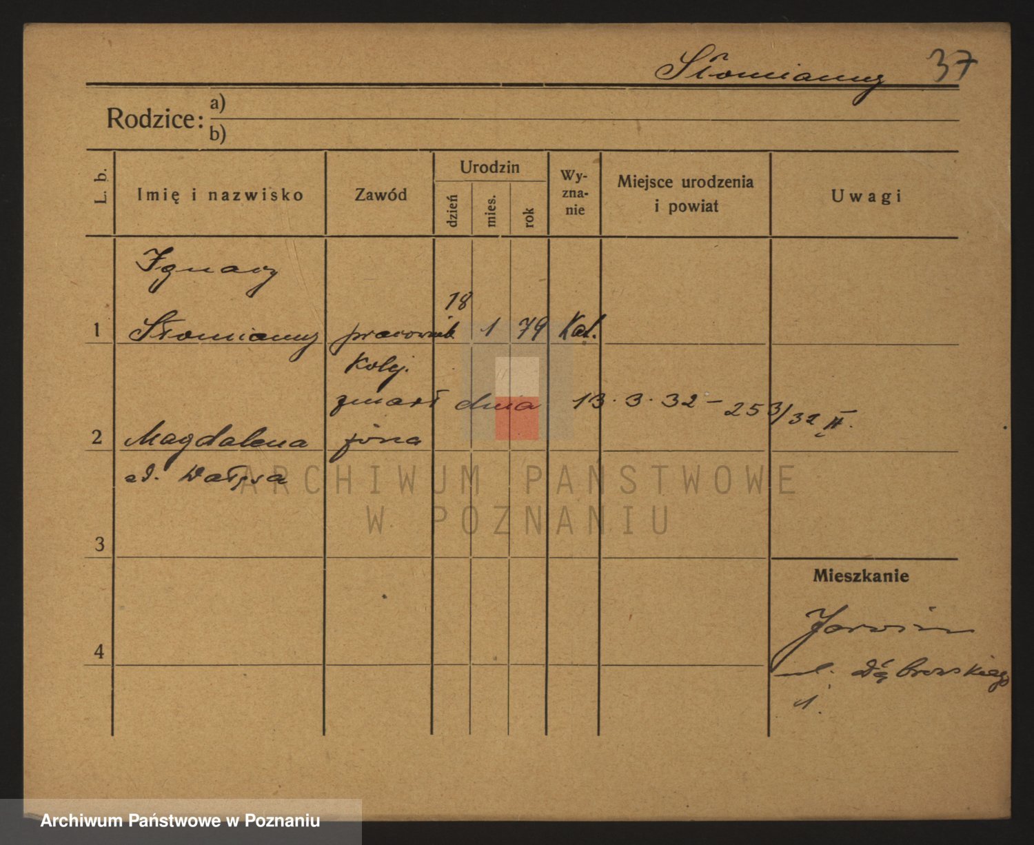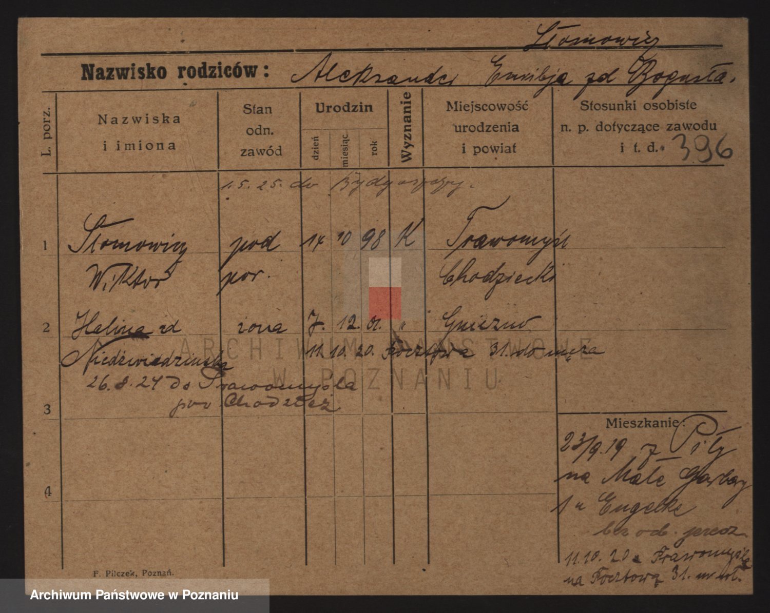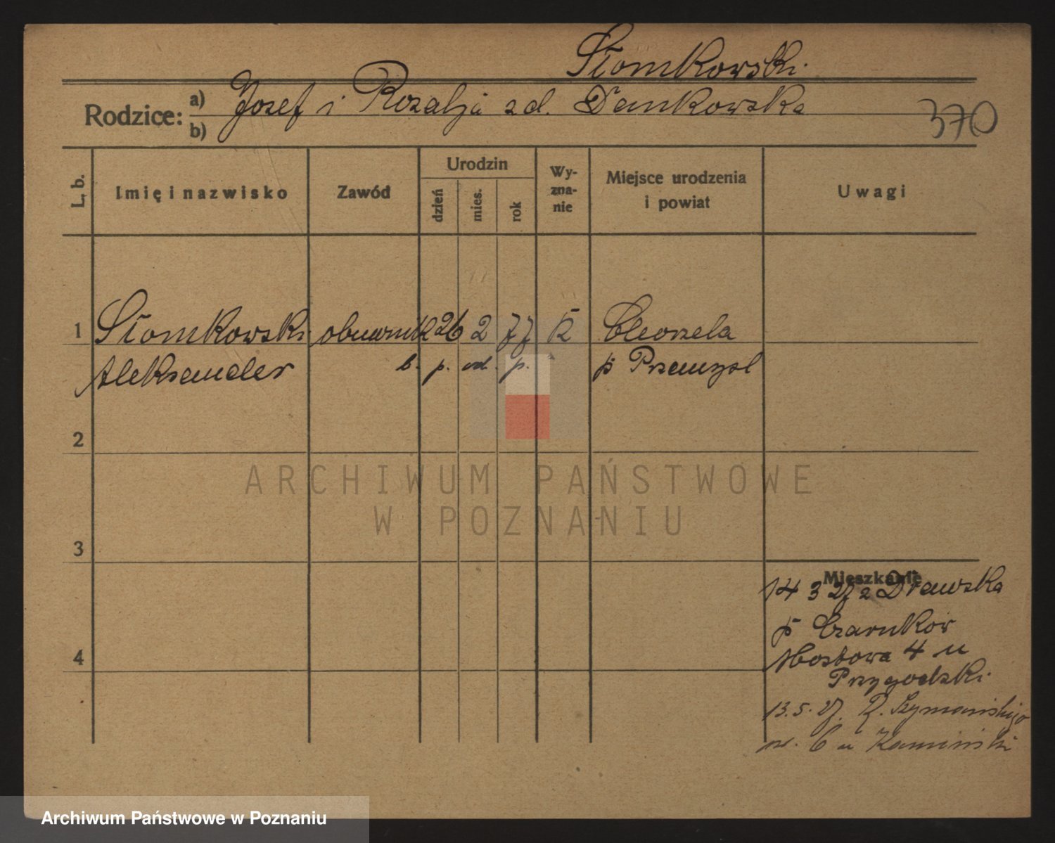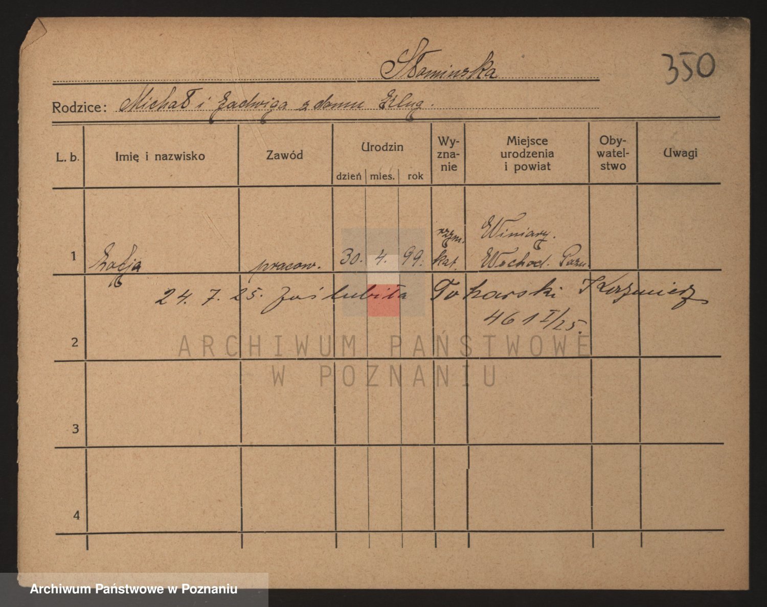 Podgląd karty osobowej dostępny jest po kliknięciu na nazwisko lub ikonkę karty. Można dokonywać powiększenia (ikony na górze) lub przechodzić między kolejnymi skanami (strzałki po bokach).