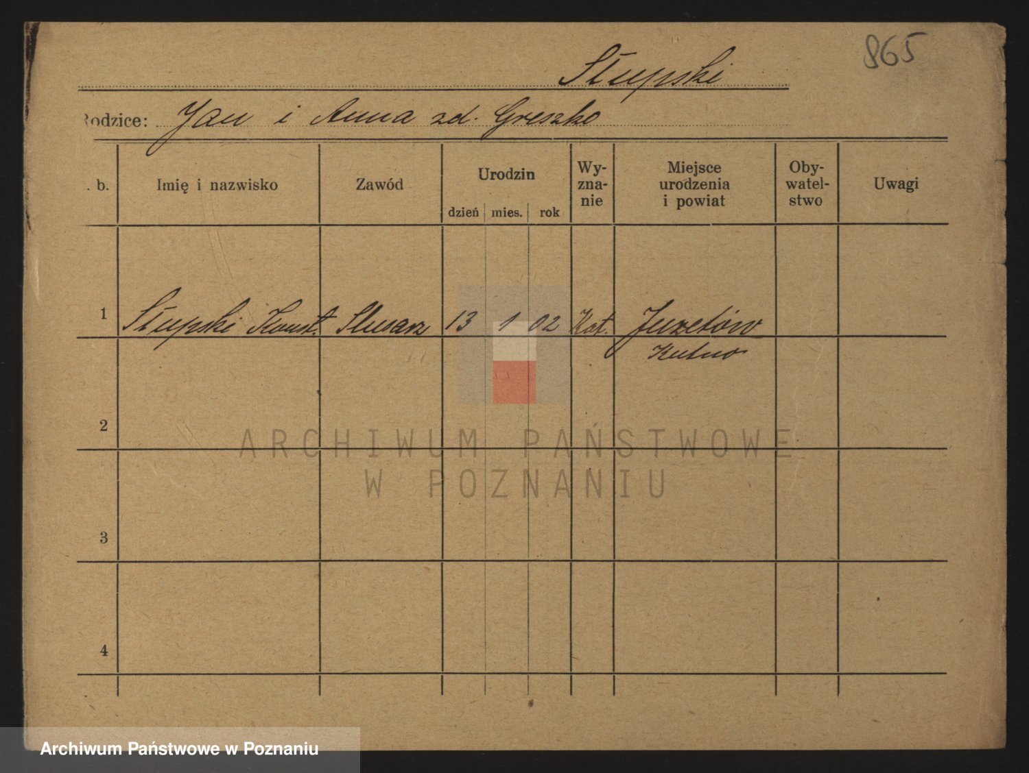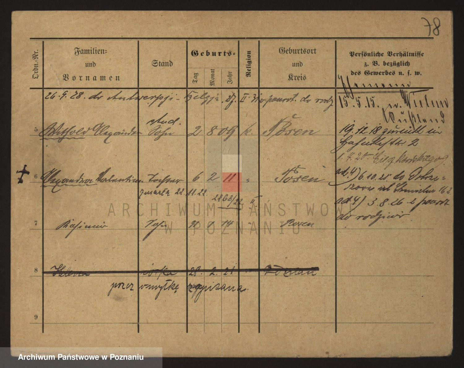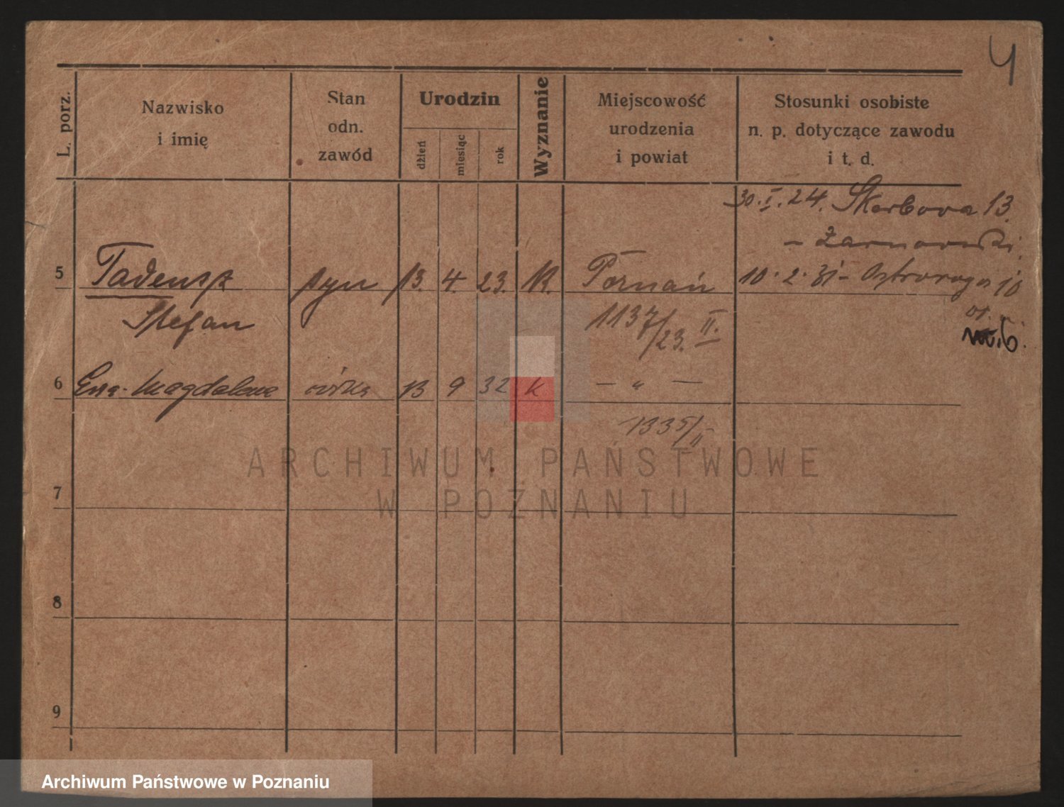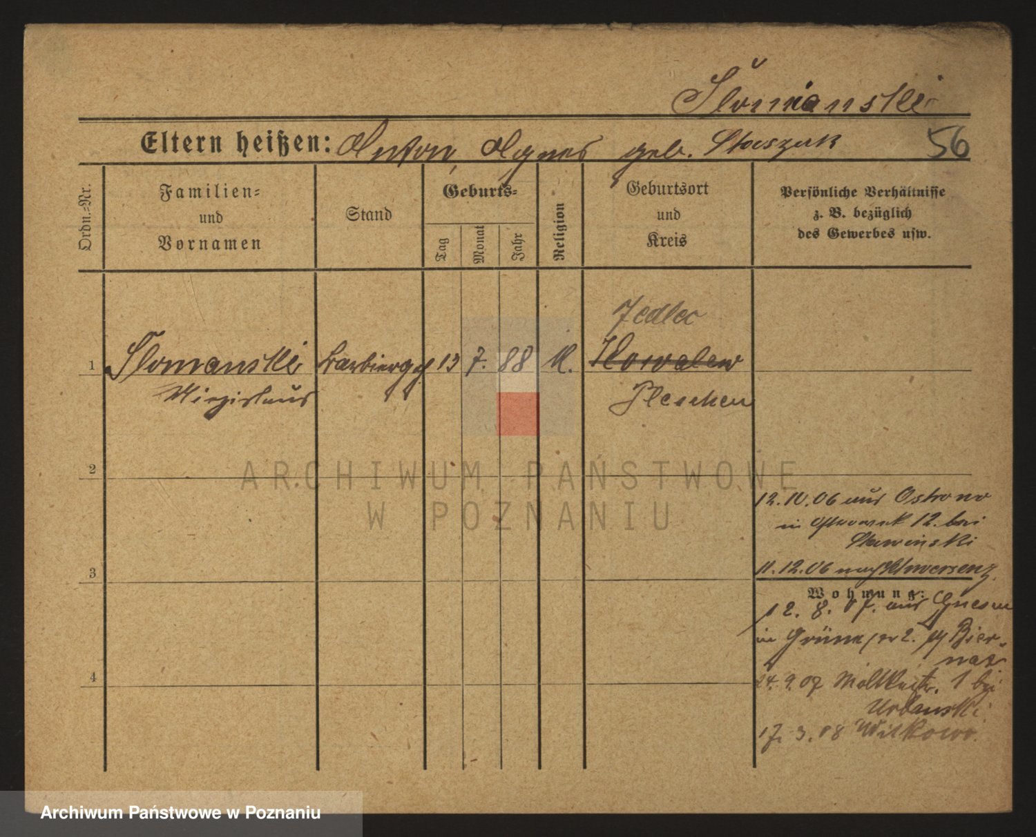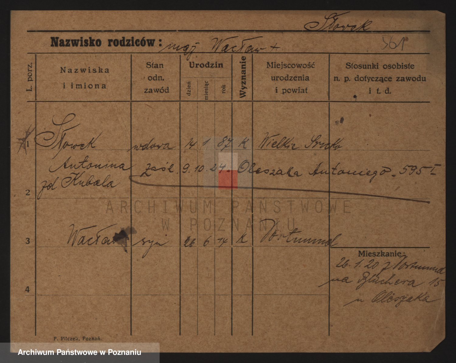Podgląd karty osobowej dostępny jest po kliknięciu na nazwisko lub ikonkę karty. Można dokonywać powiększenia (ikony na górze) lub przechodzić między kolejnymi skanami (strzałki po bokach).