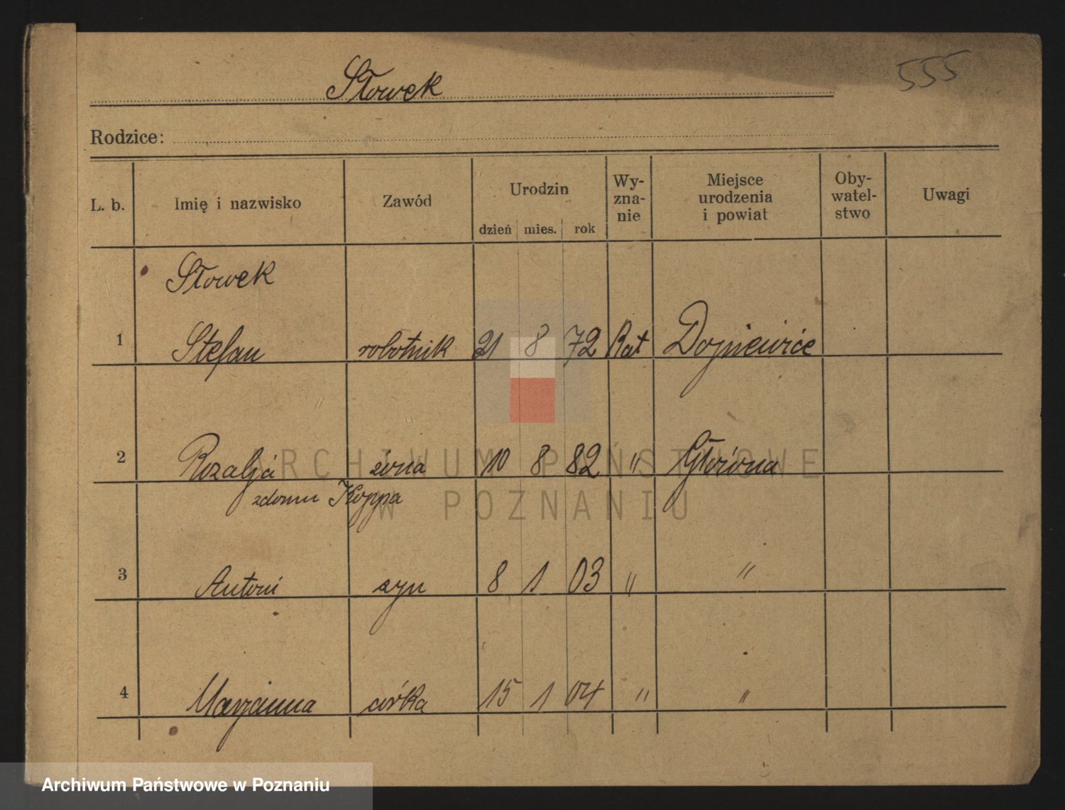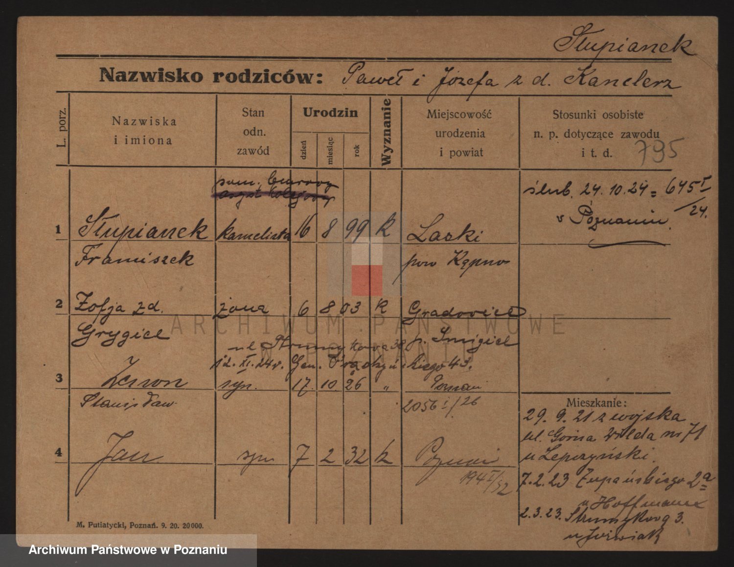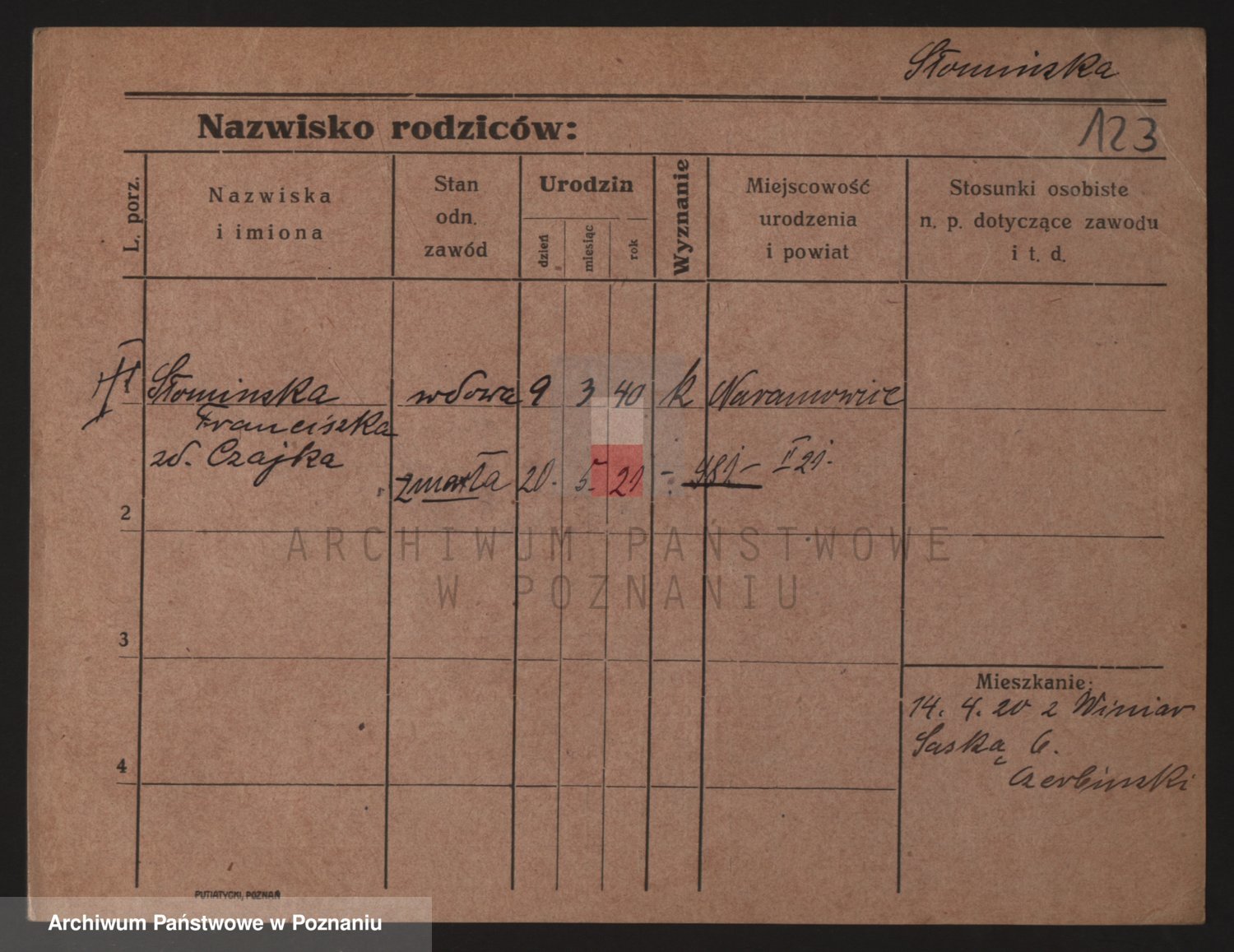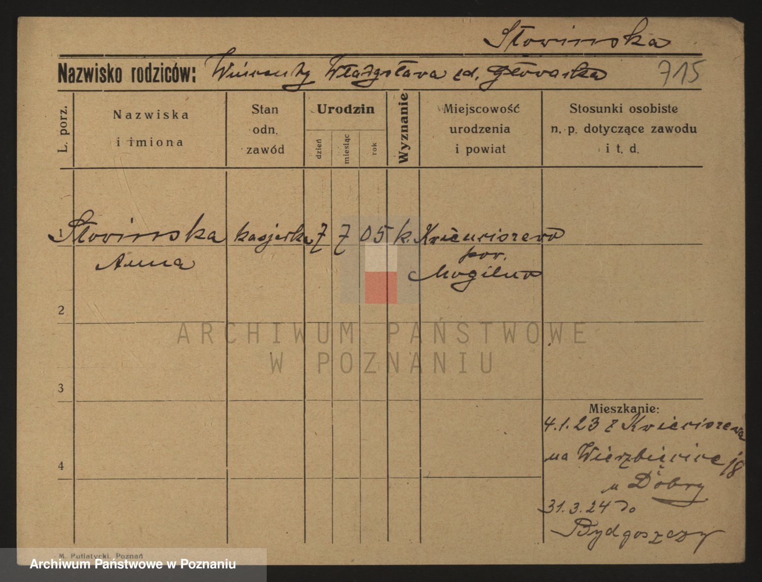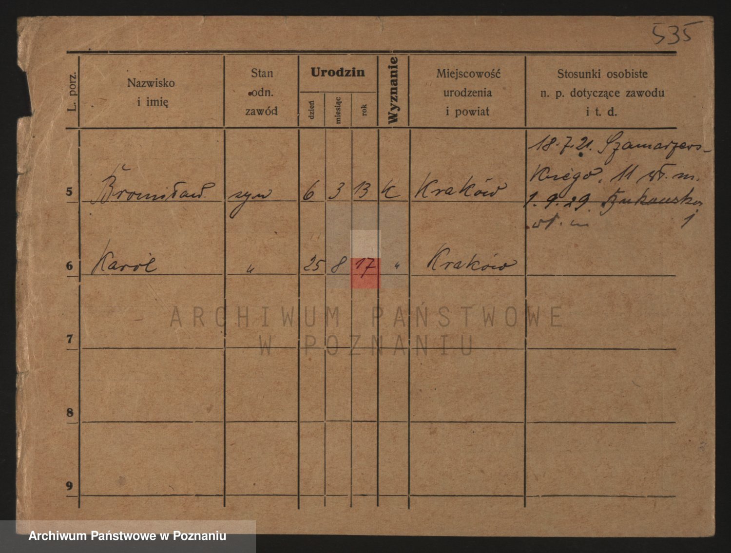 Podgląd karty osobowej dostępny jest po kliknięciu na nazwisko lub ikonkę karty. Można dokonywać powiększenia (ikony na górze) lub przechodzić między kolejnymi skanami (strzałki po bokach).