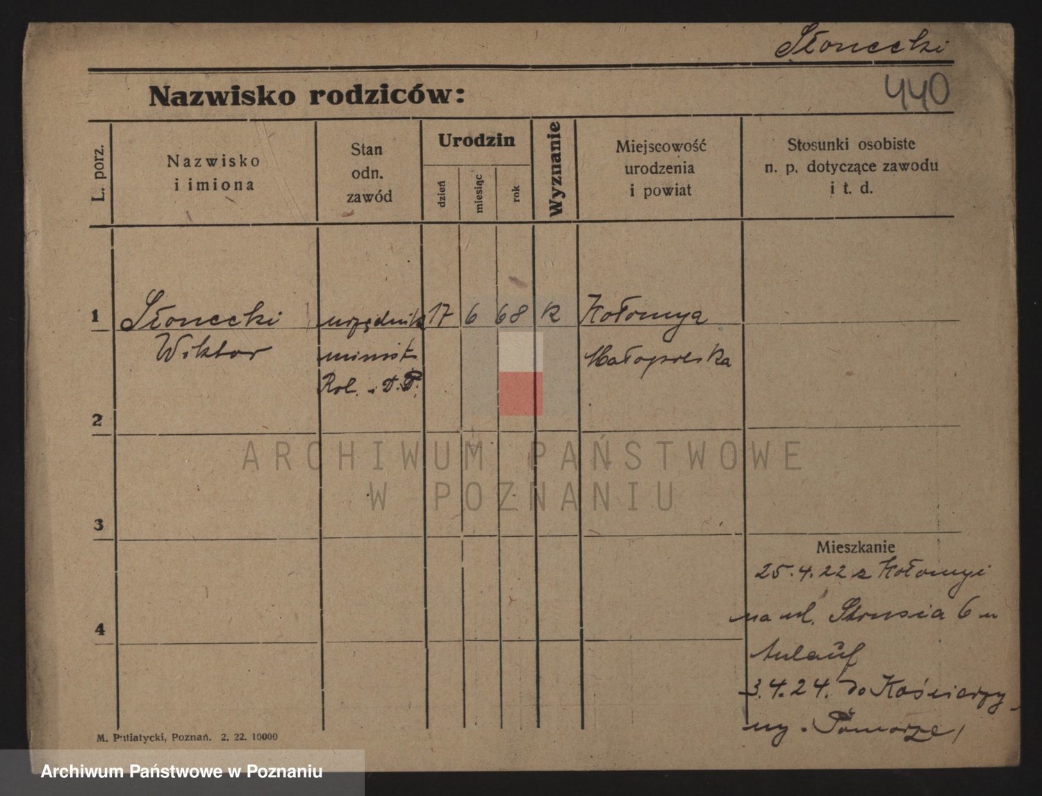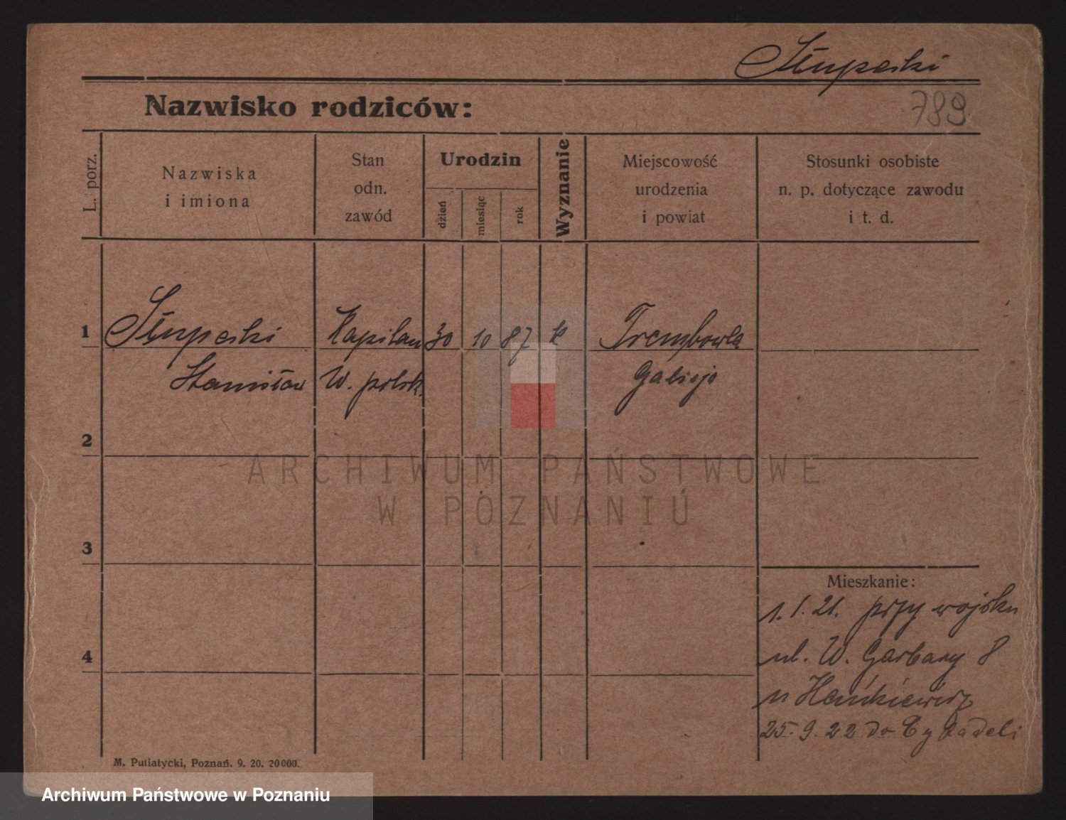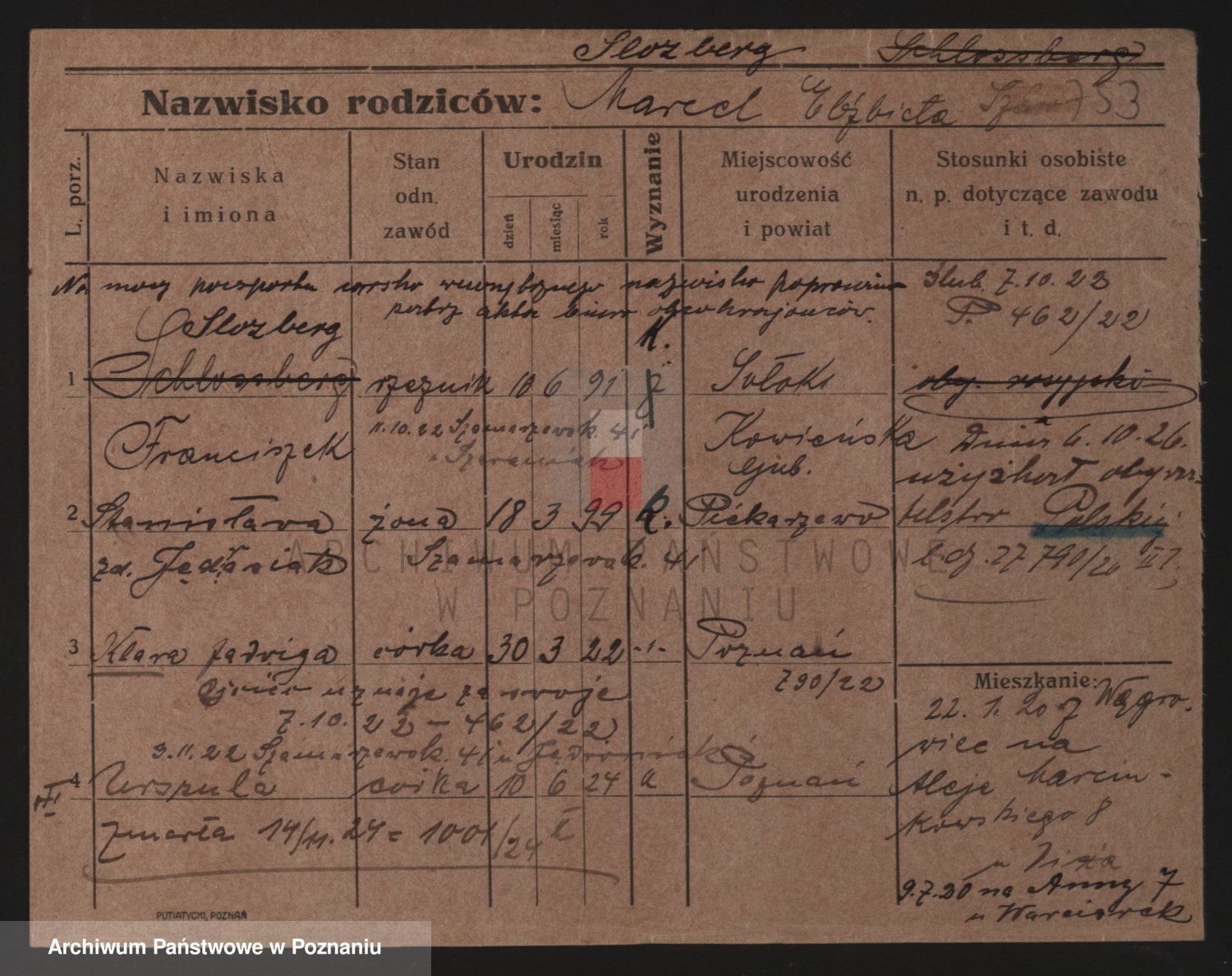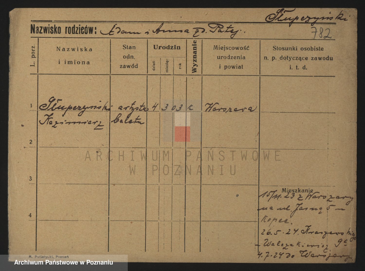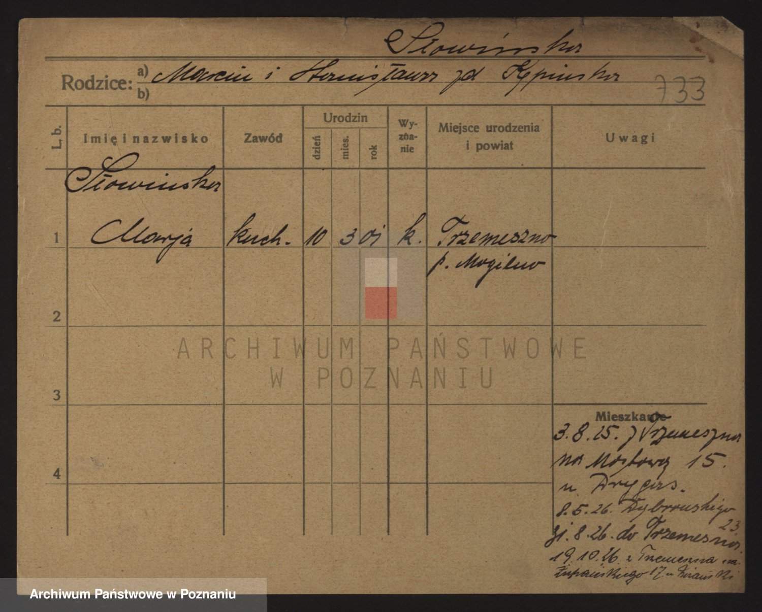 Podgląd karty osobowej dostępny jest po kliknięciu na nazwisko lub ikonkę karty. Można dokonywać powiększenia (ikony na górze) lub przechodzić między kolejnymi skanami (strzałki po bokach).