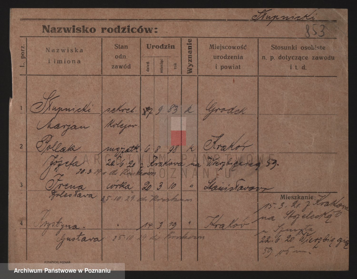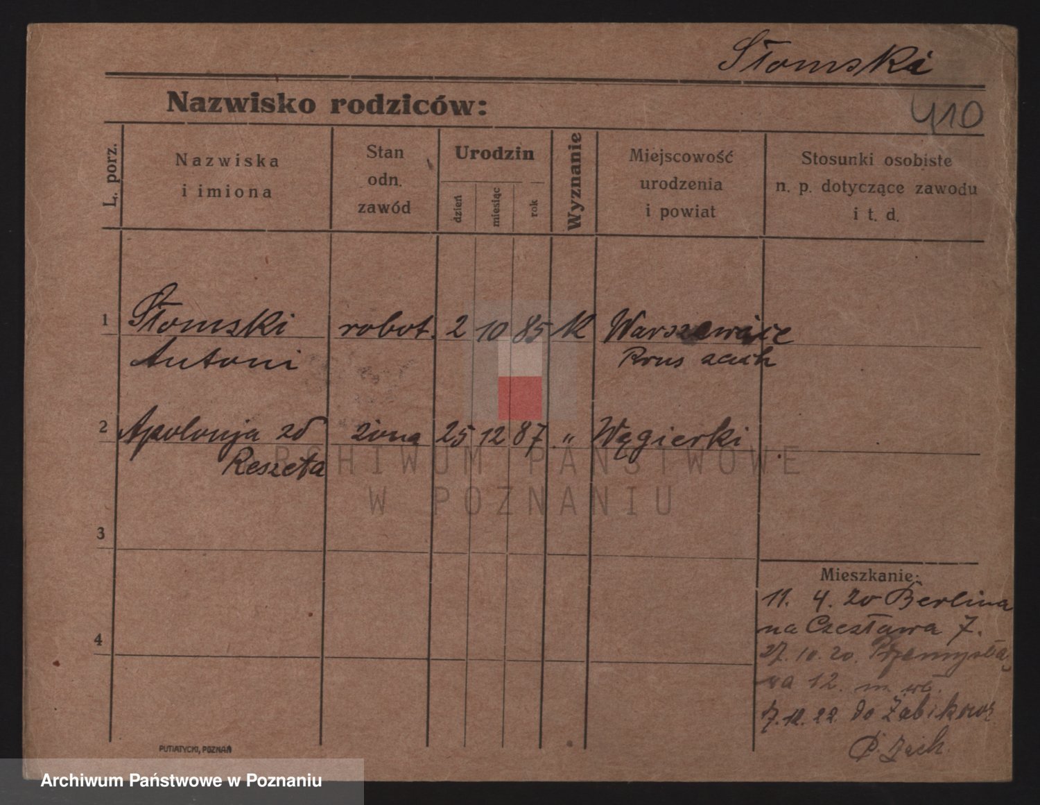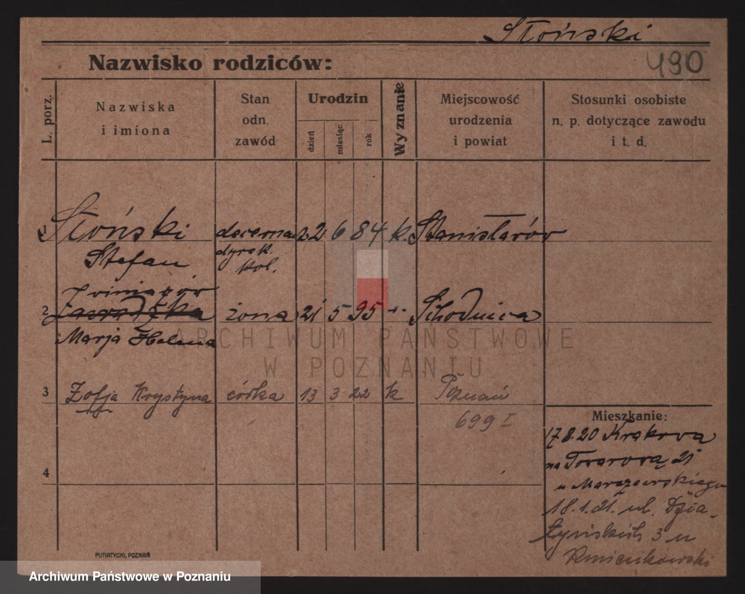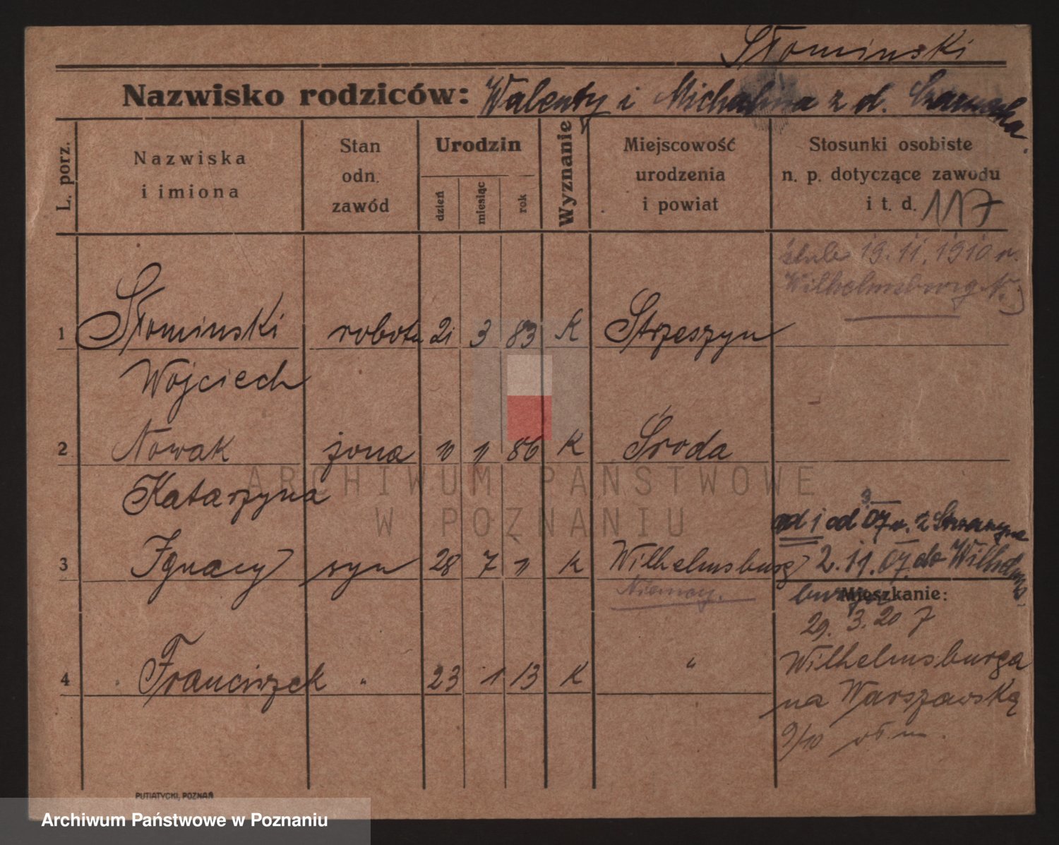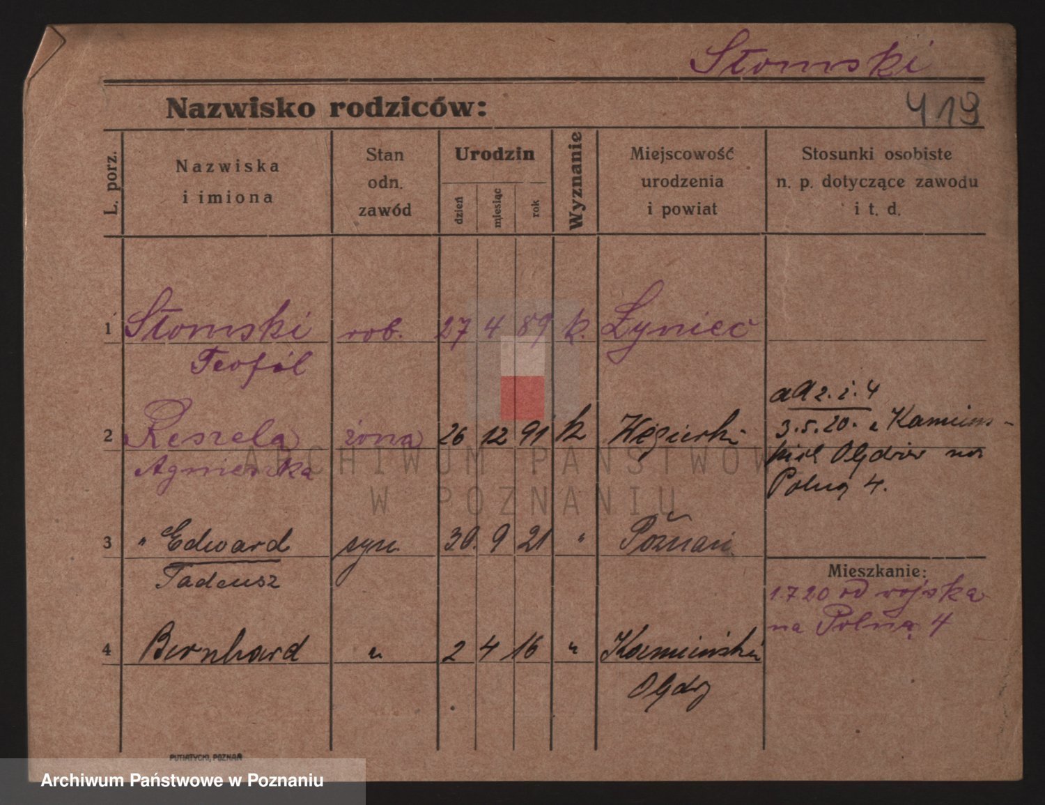Podgląd karty osobowej dostępny jest po kliknięciu na nazwisko lub ikonkę karty. Można dokonywać powiększenia (ikony na górze) lub przechodzić między kolejnymi skanami (strzałki po bokach).