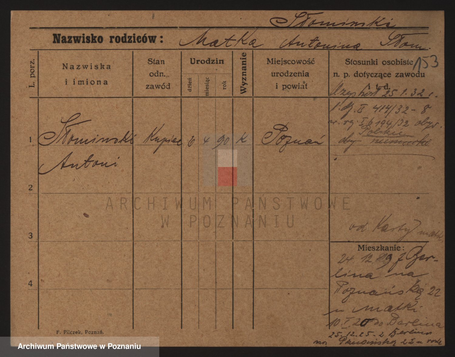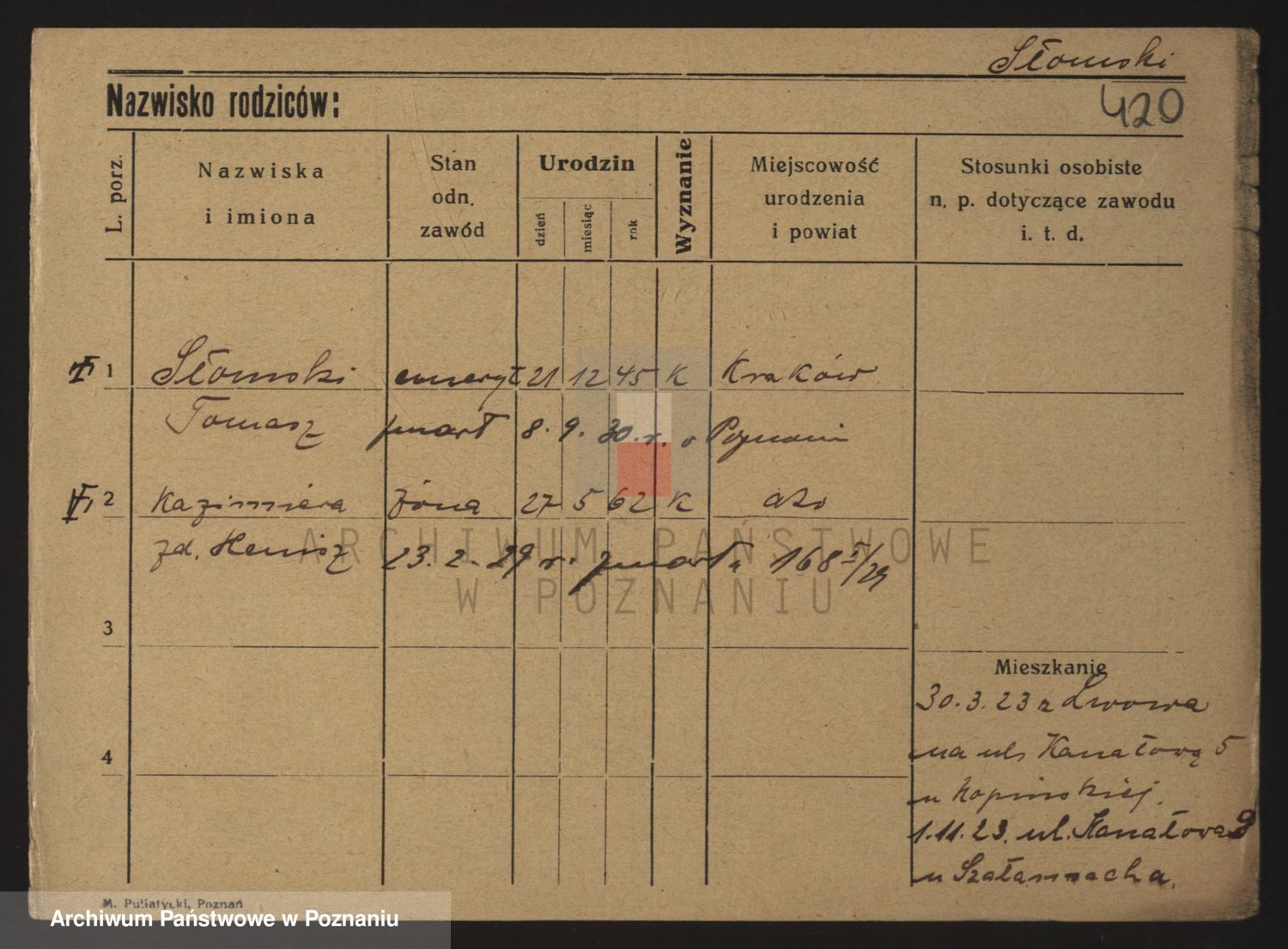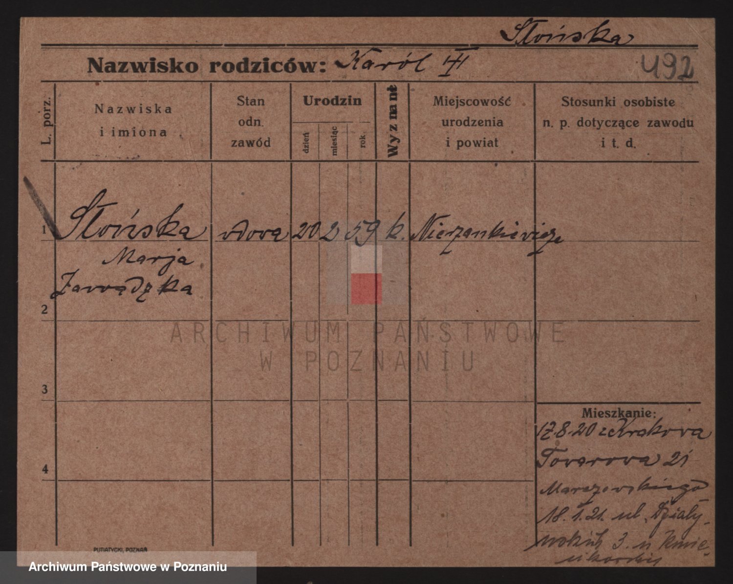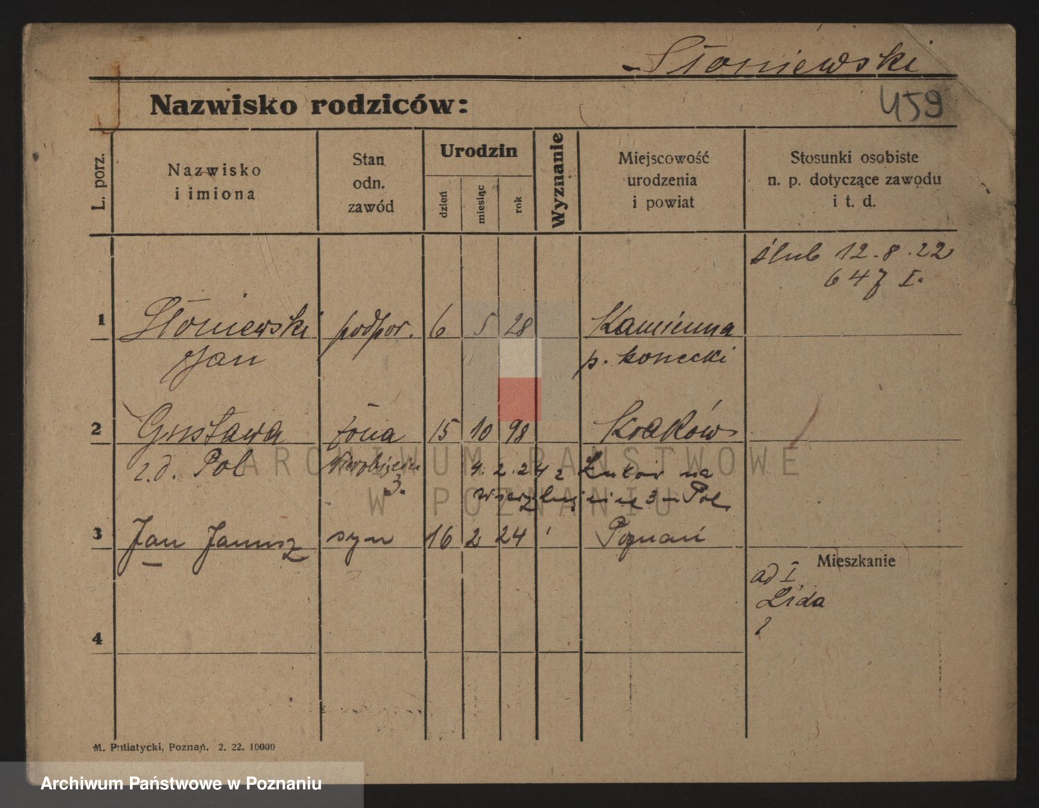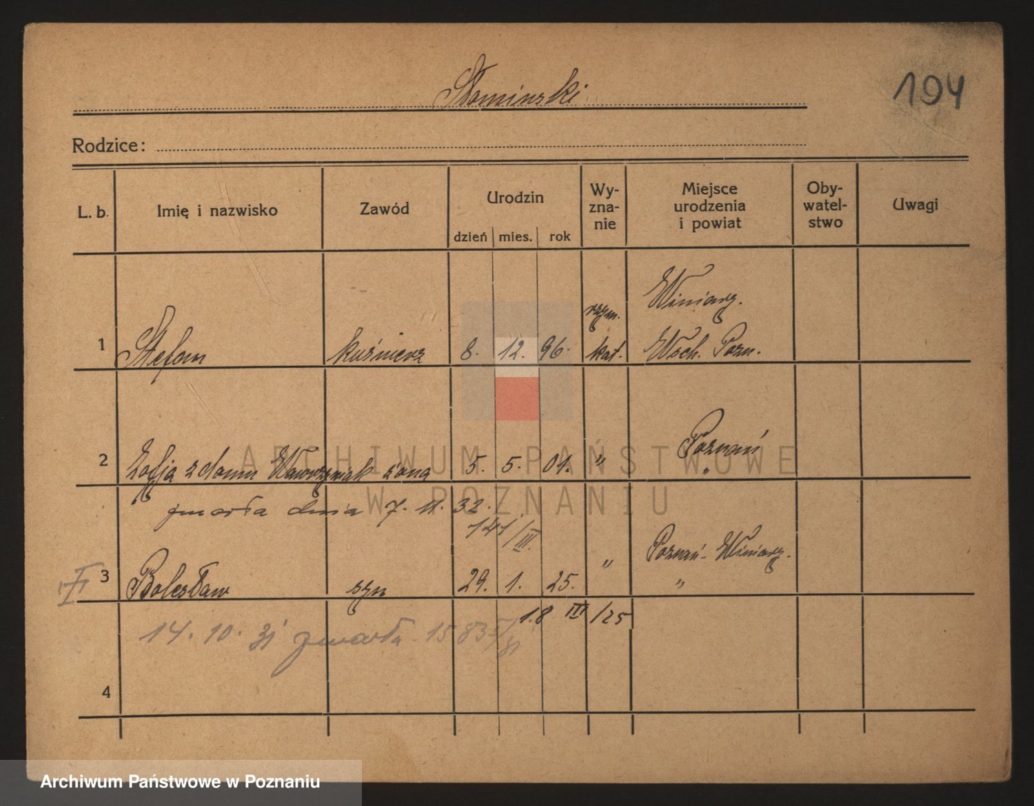 Podgląd karty osobowej dostępny jest po kliknięciu na nazwisko lub ikonkę karty. Można dokonywać powiększenia (ikony na górze) lub przechodzić między kolejnymi skanami (strzałki po bokach).
