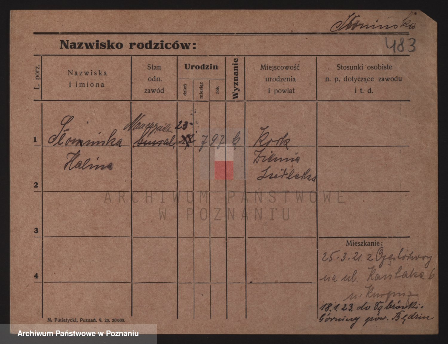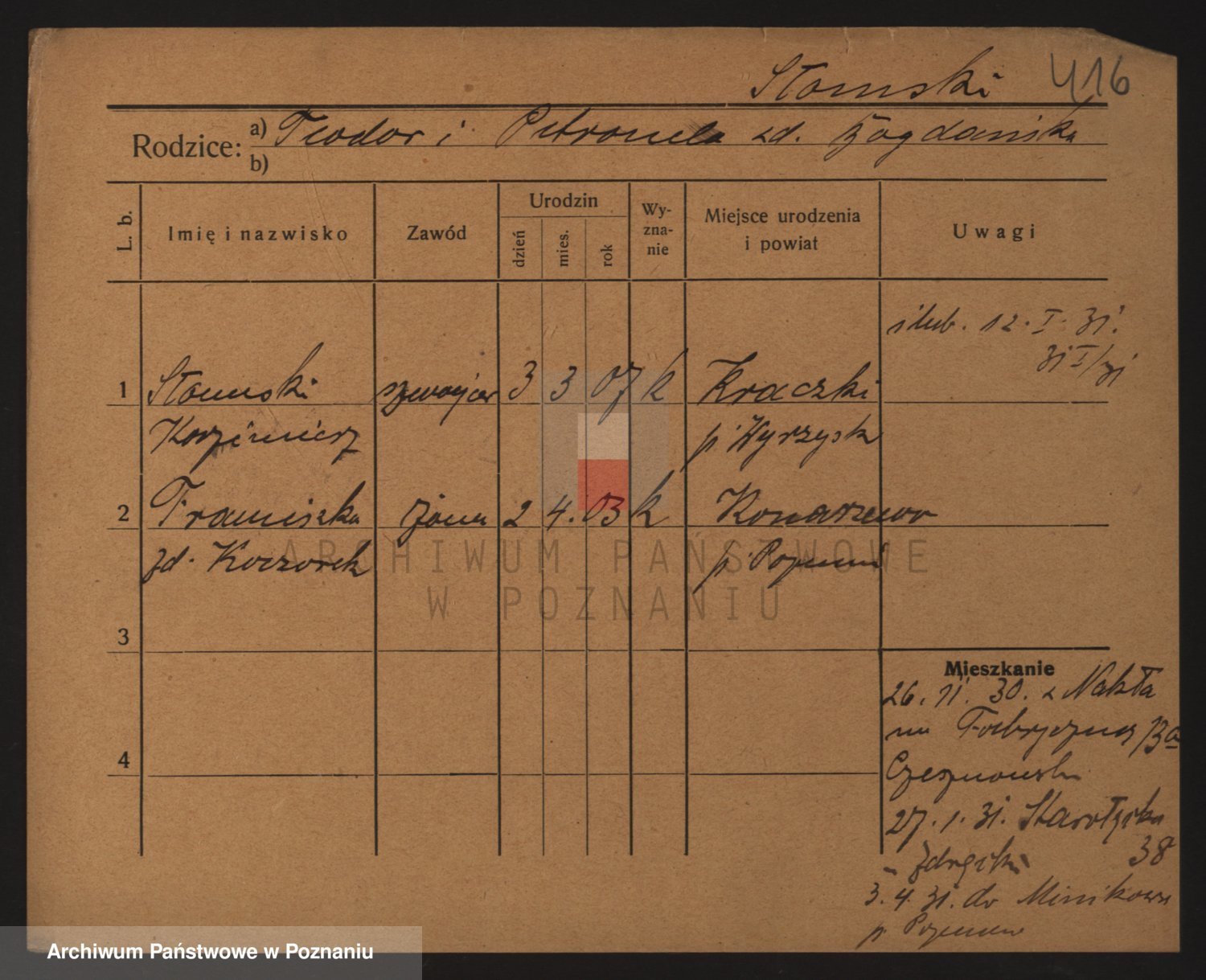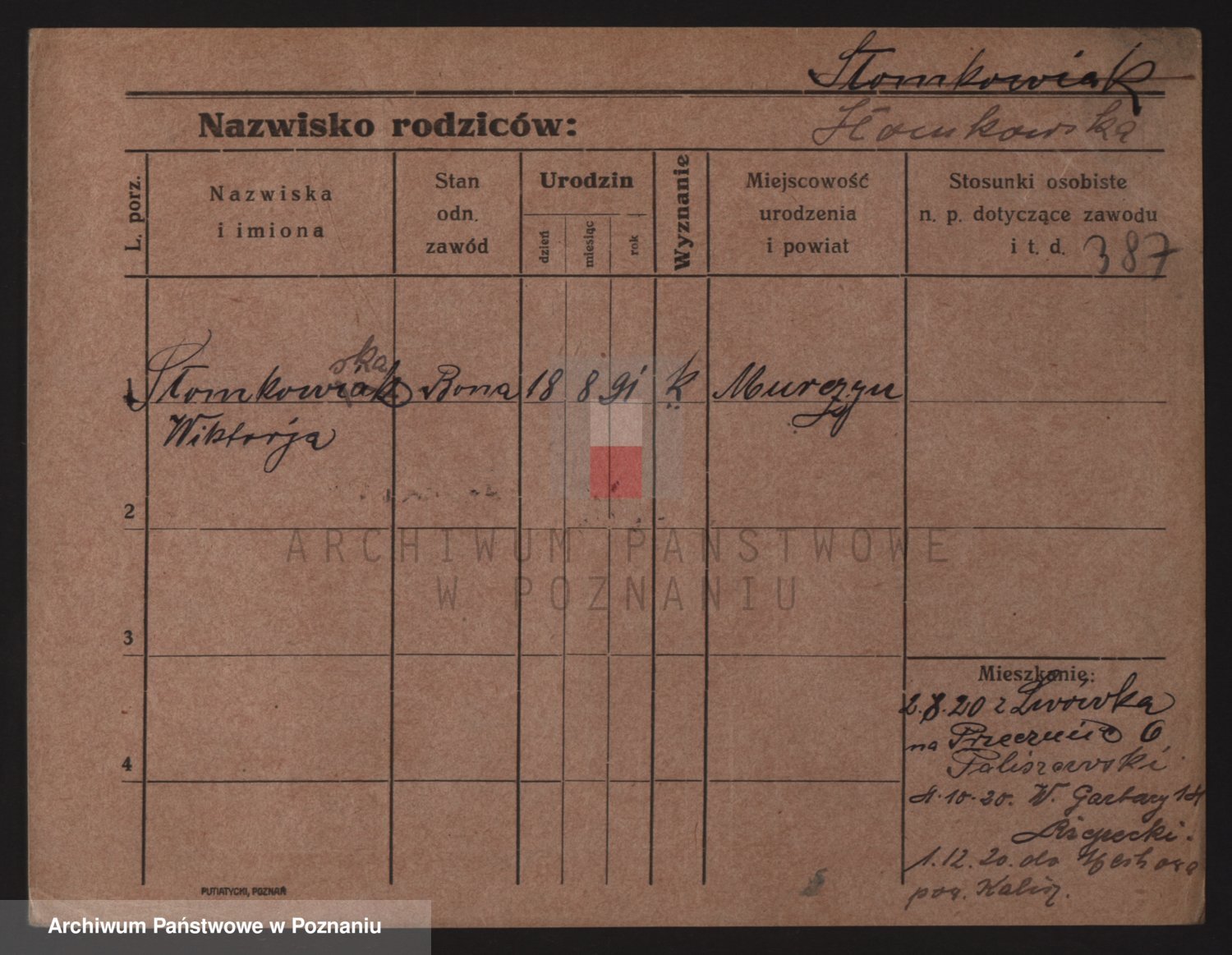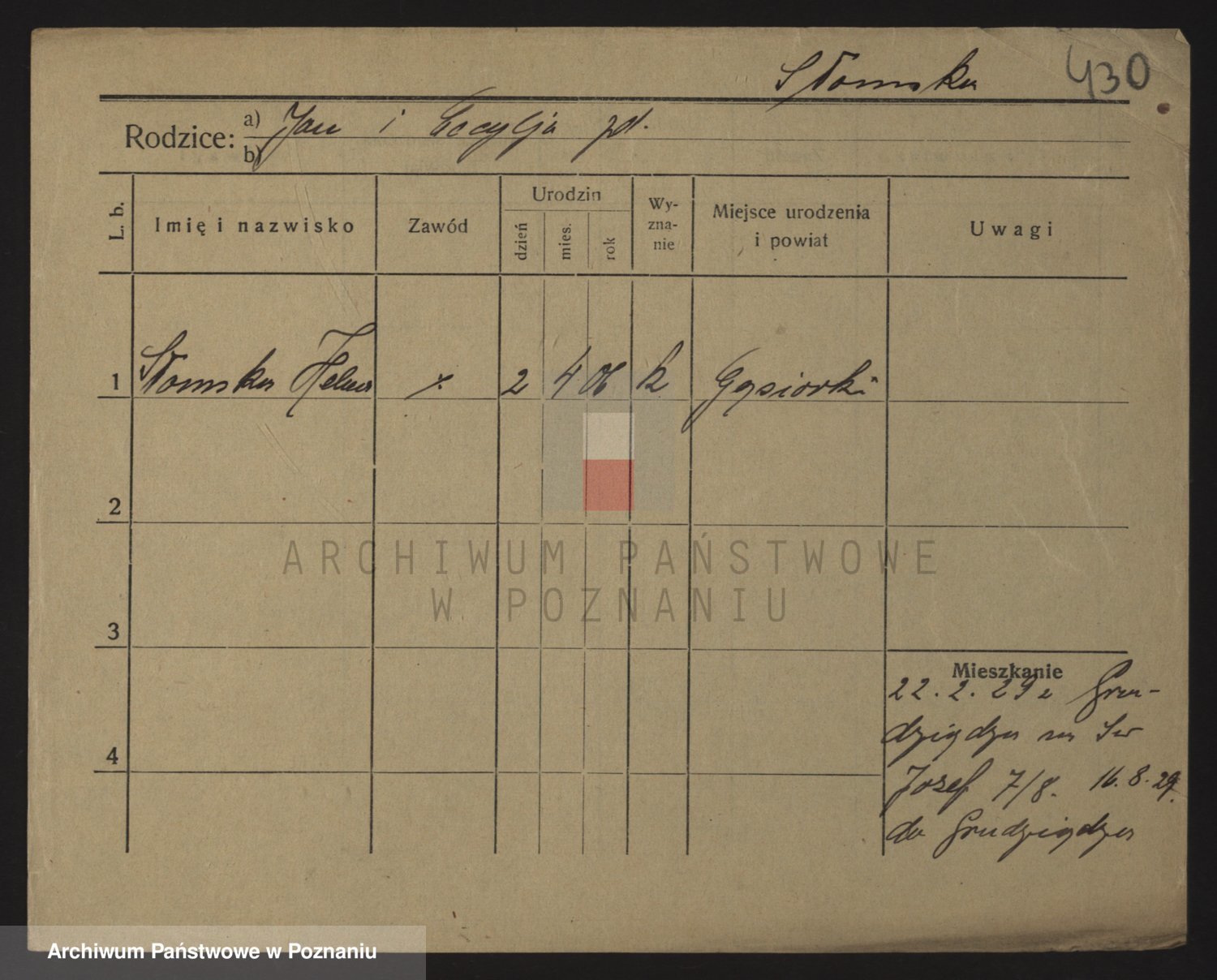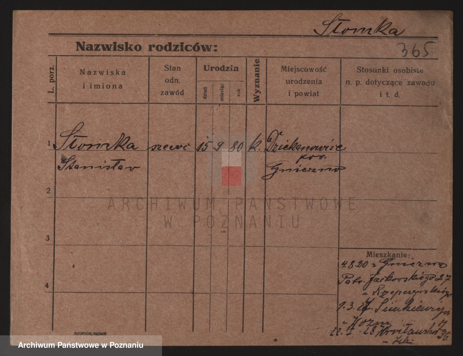 Podgląd karty osobowej dostępny jest po kliknięciu na nazwisko lub ikonkę karty. Można dokonywać powiększenia (ikony na górze) lub przechodzić między kolejnymi skanami (strzałki po bokach).