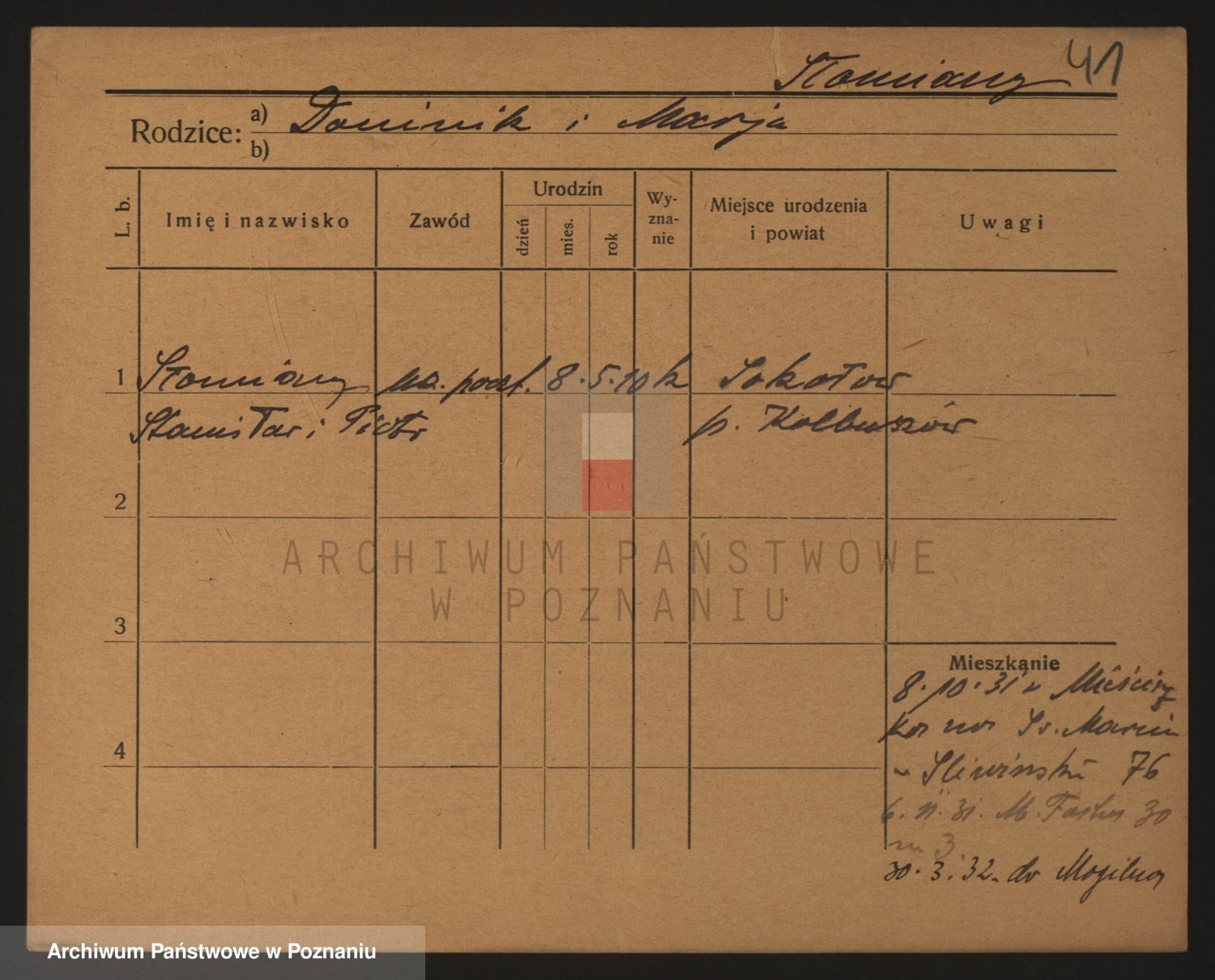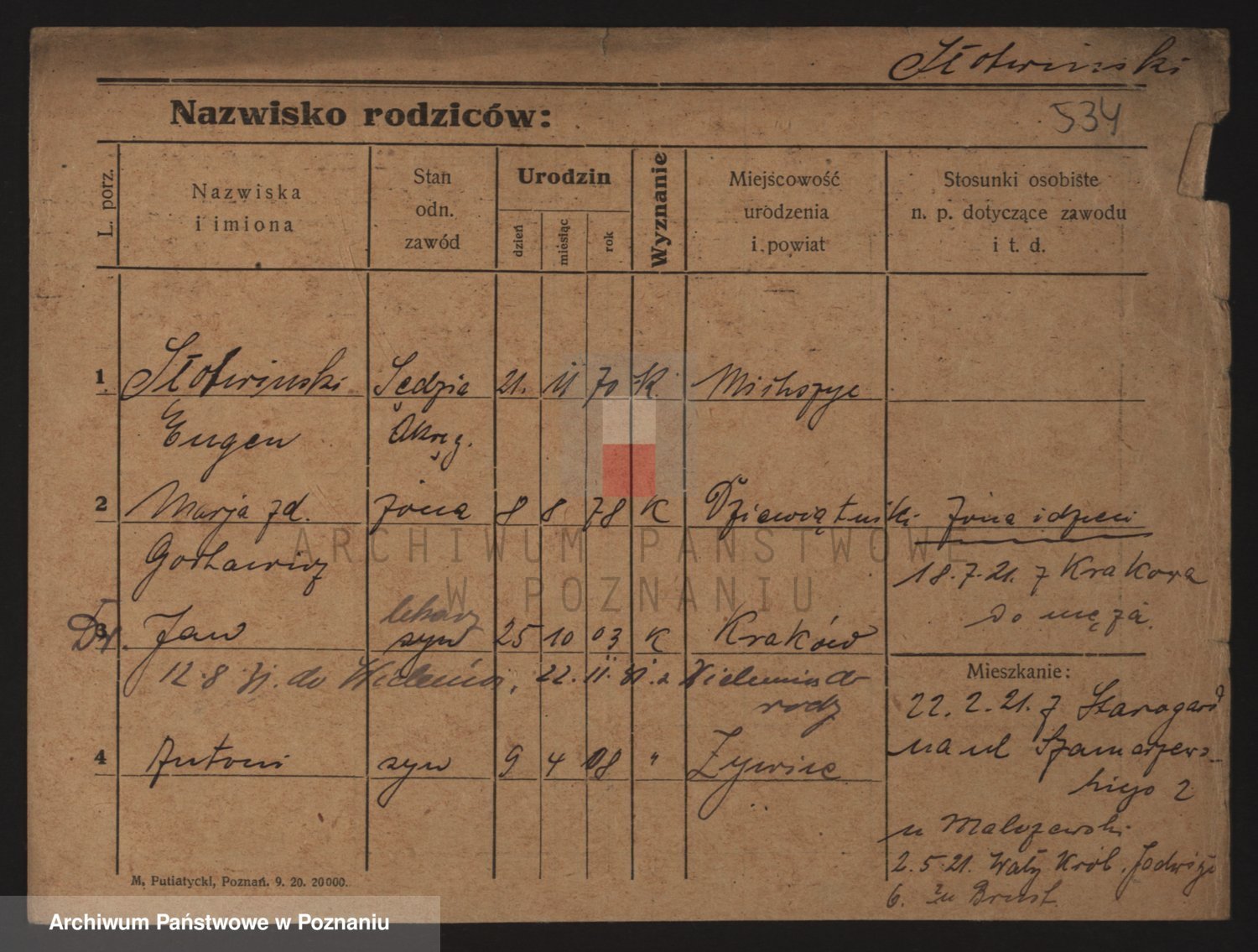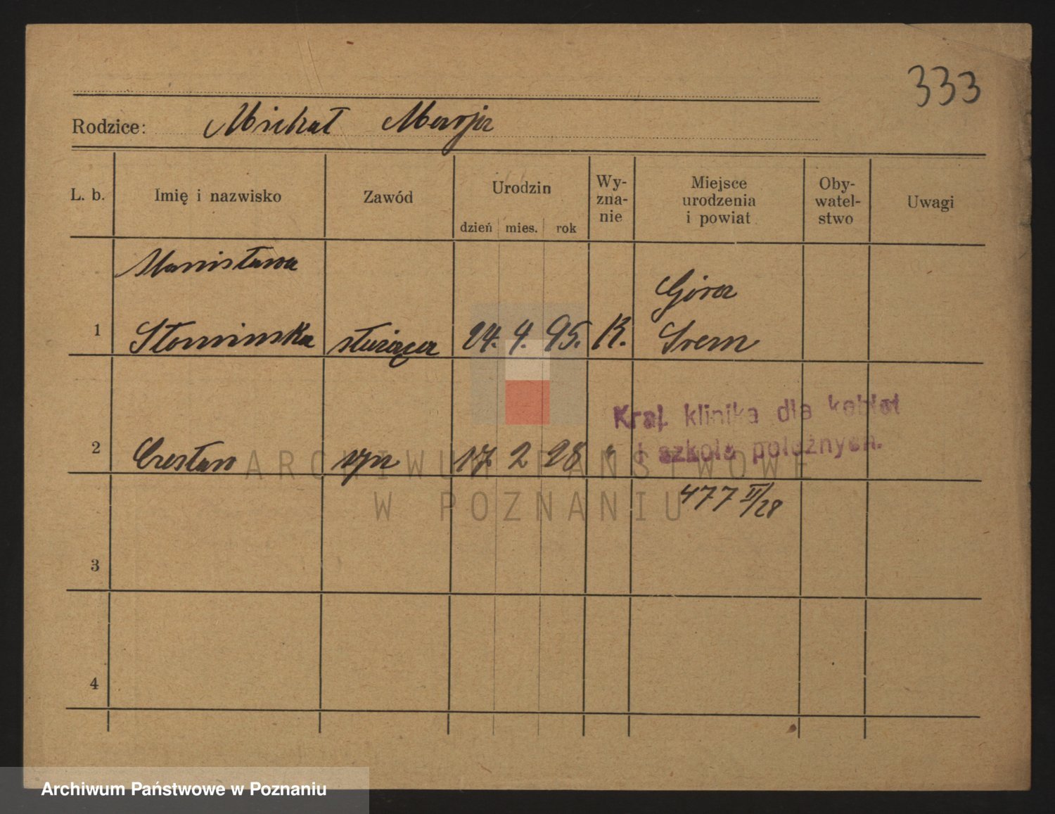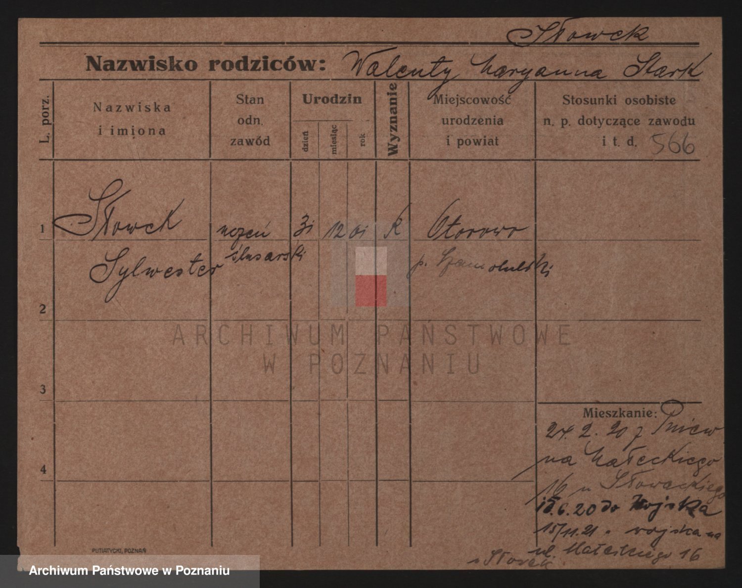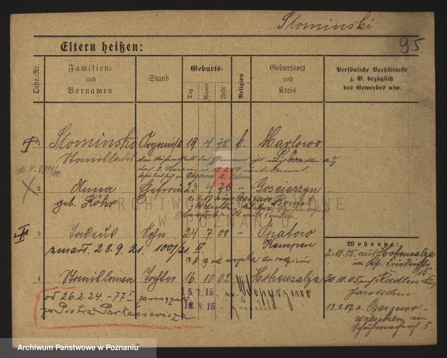 Podgląd karty osobowej dostępny jest po kliknięciu na nazwisko lub ikonkę karty. Można dokonywać powiększenia (ikony na górze) lub przechodzić między kolejnymi skanami (strzałki po bokach).