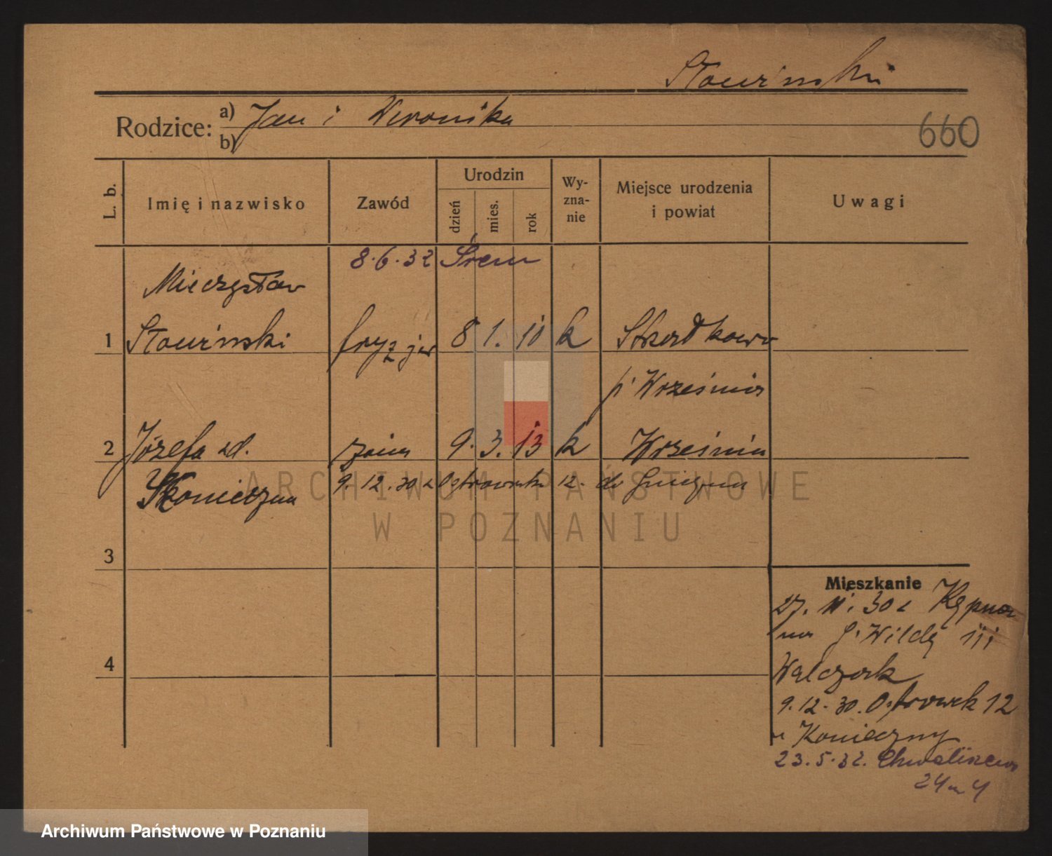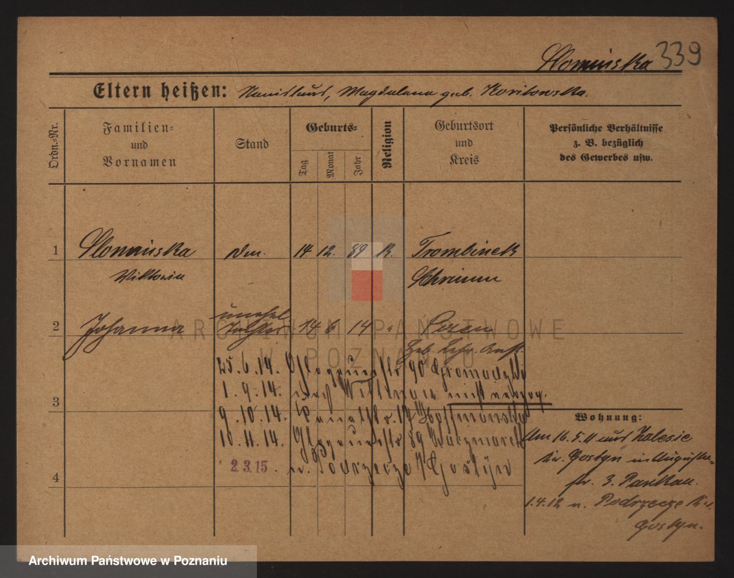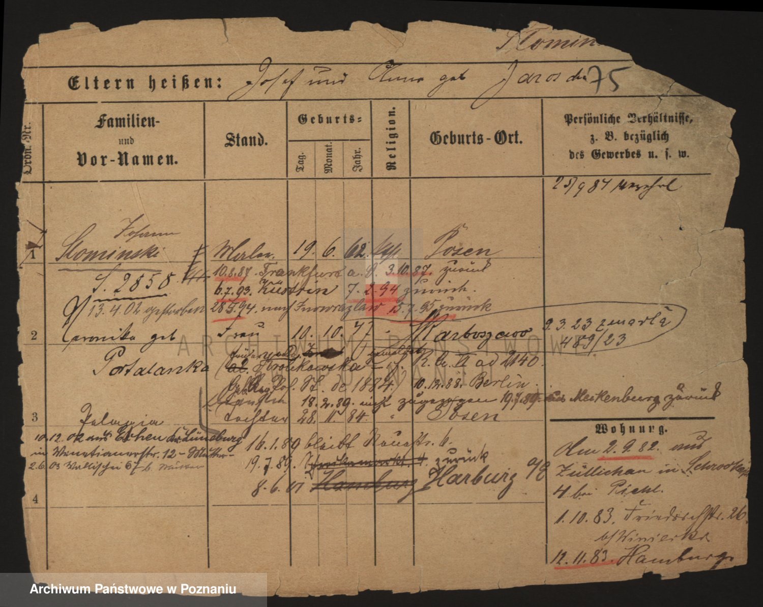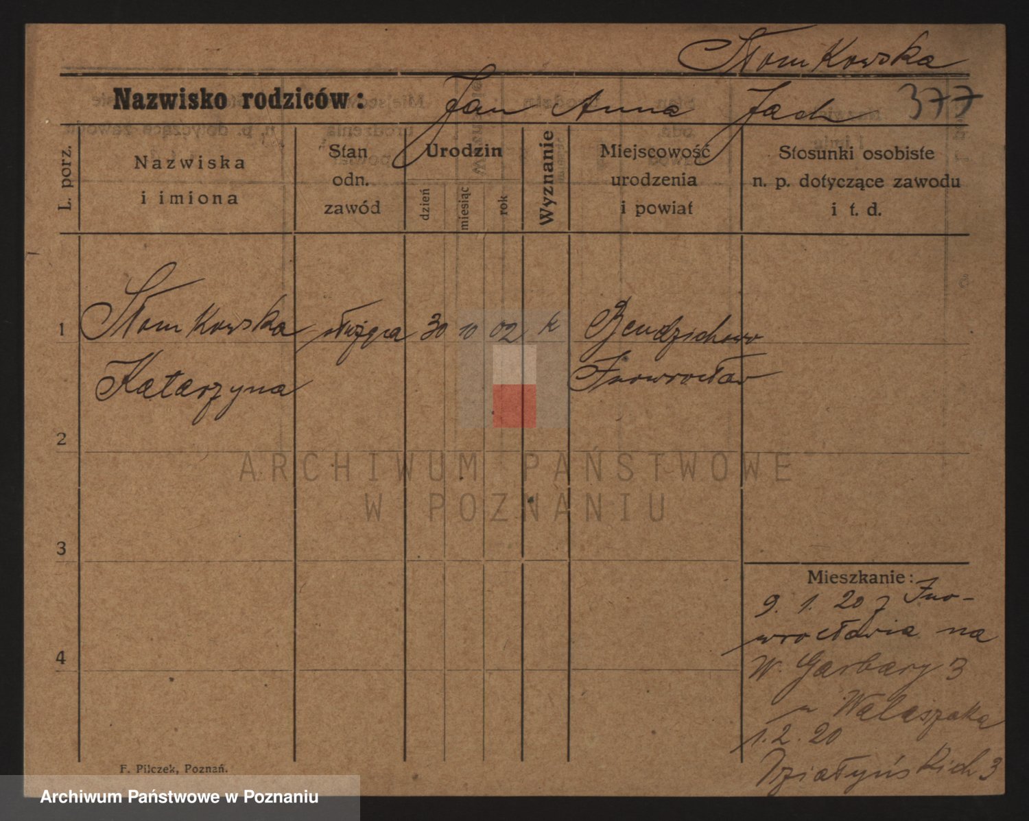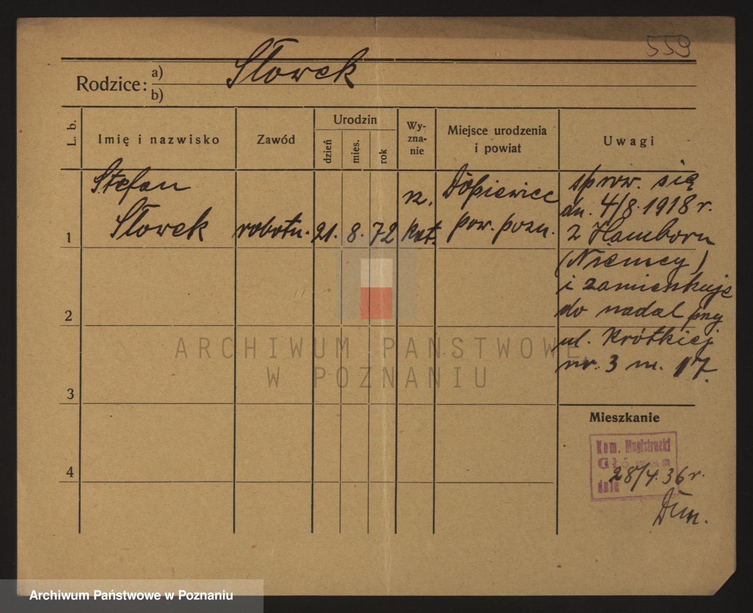 Podgląd karty osobowej dostępny jest po kliknięciu na nazwisko lub ikonkę karty. Można dokonywać powiększenia (ikony na górze) lub przechodzić między kolejnymi skanami (strzałki po bokach).