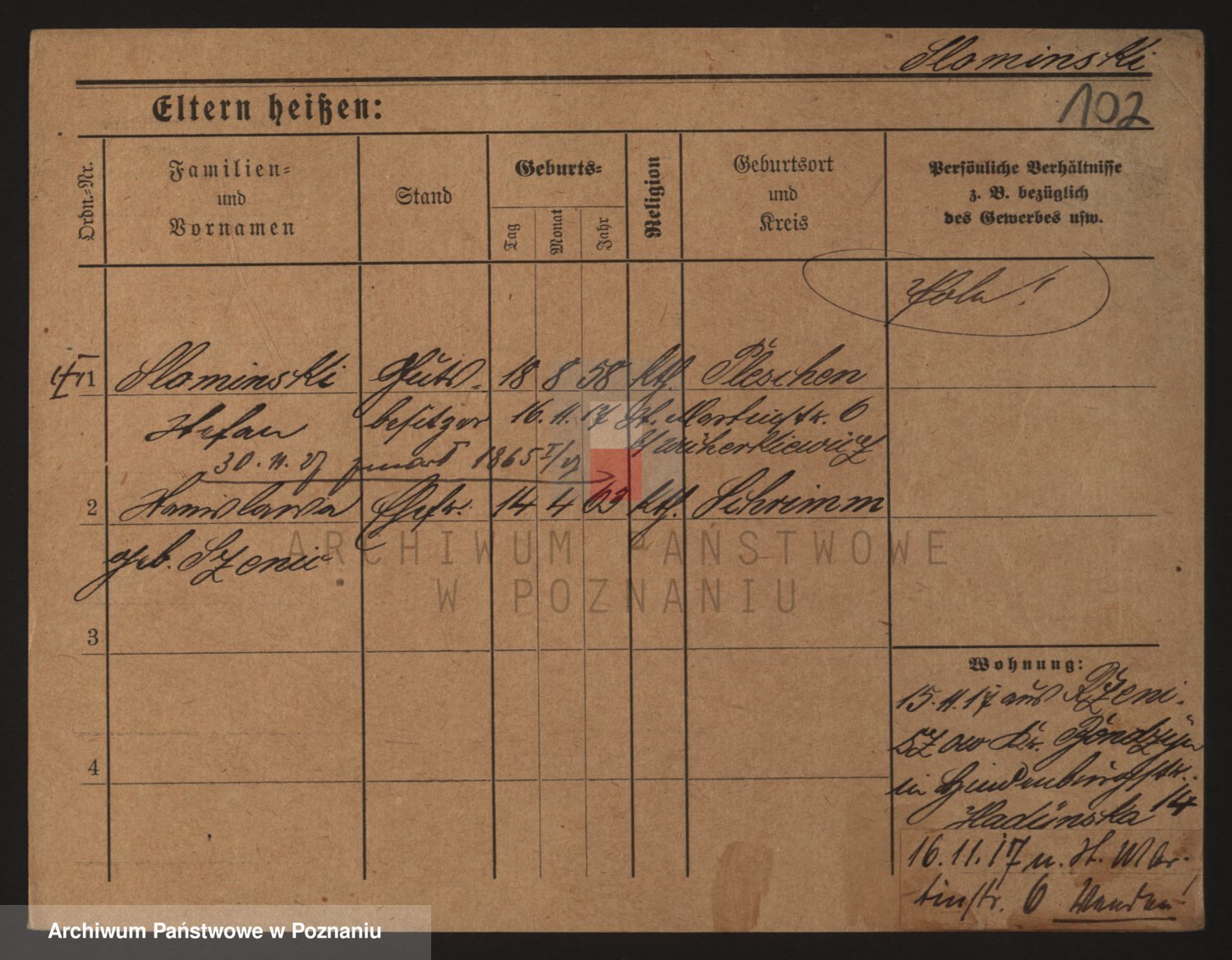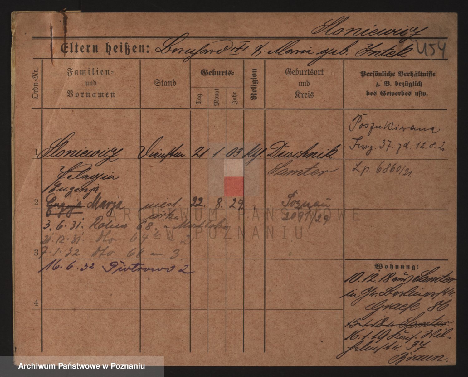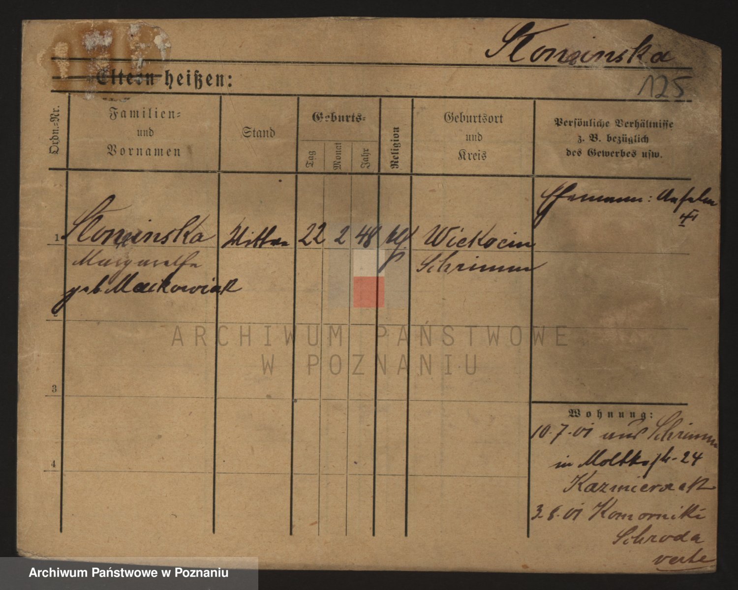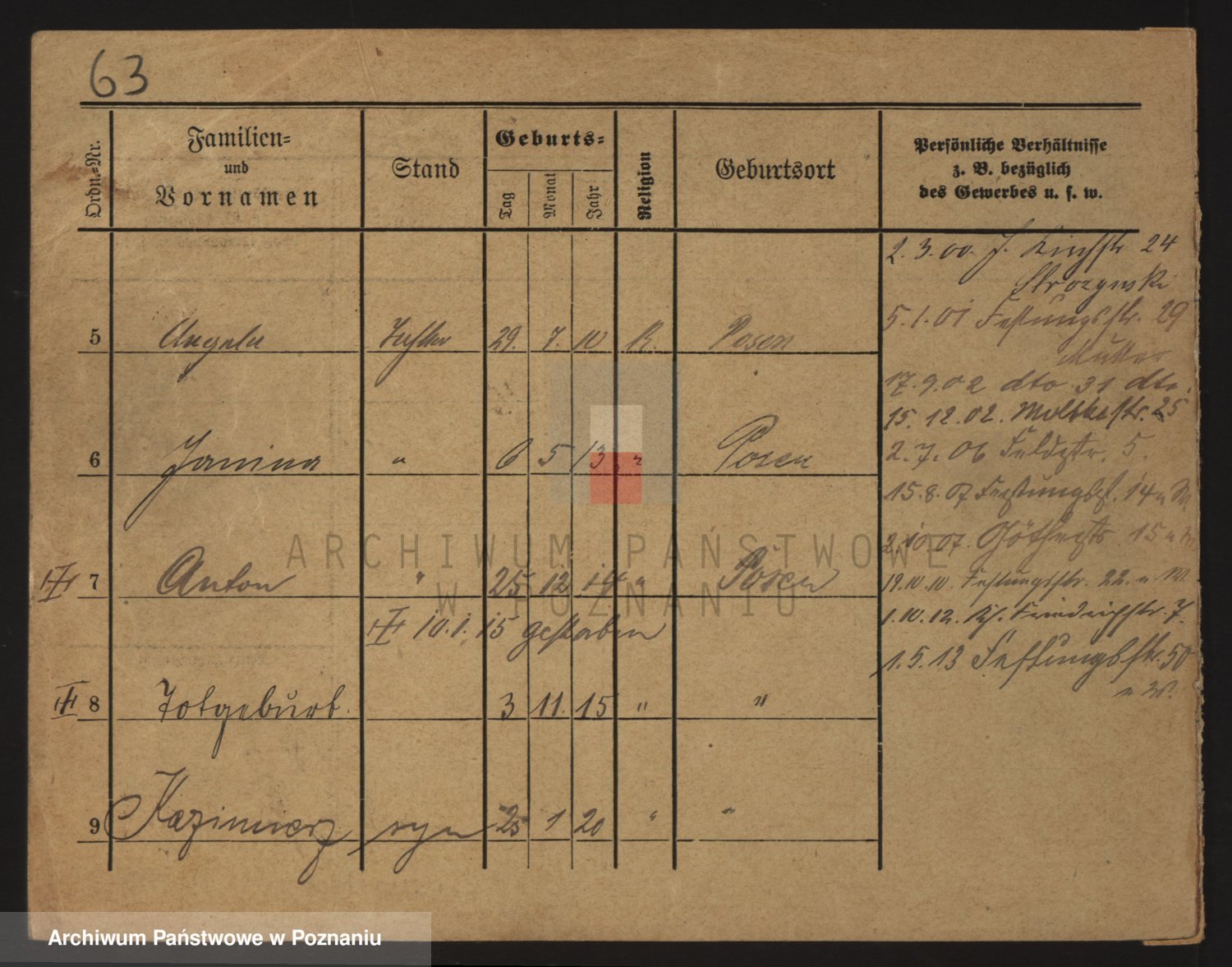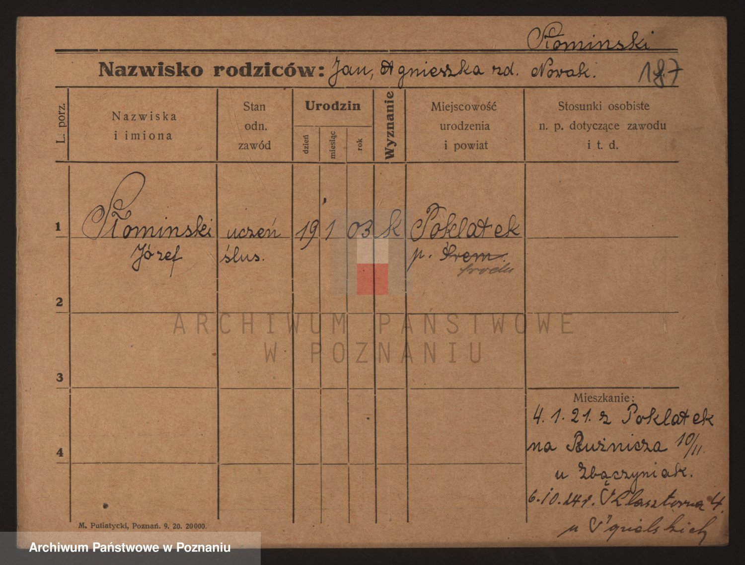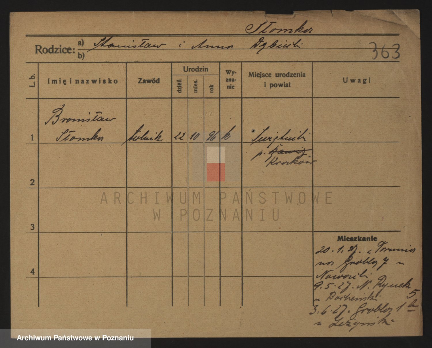 Podgląd karty osobowej dostępny jest po kliknięciu na nazwisko lub ikonkę karty. Można dokonywać powiększenia (ikony na górze) lub przechodzić między kolejnymi skanami (strzałki po bokach).