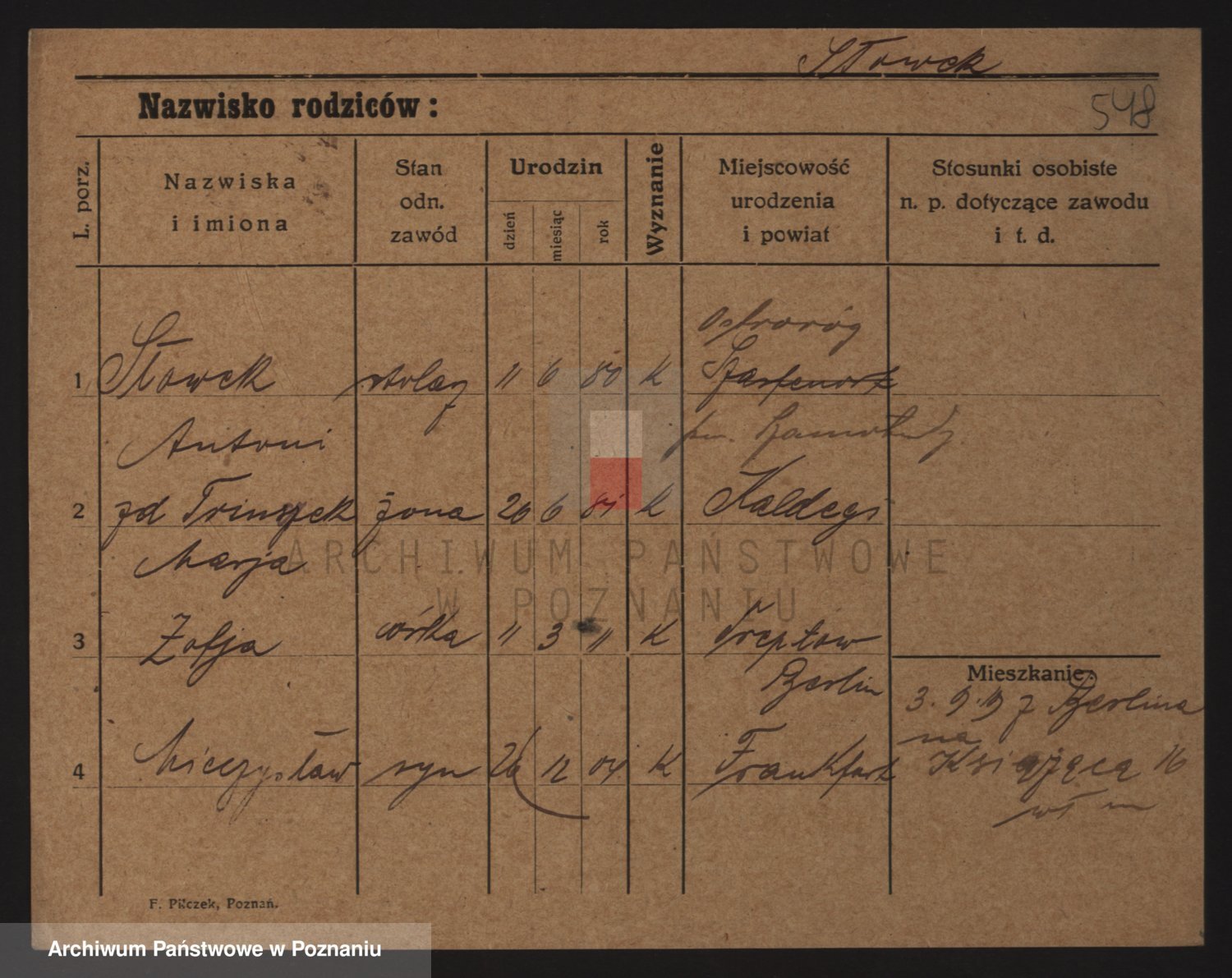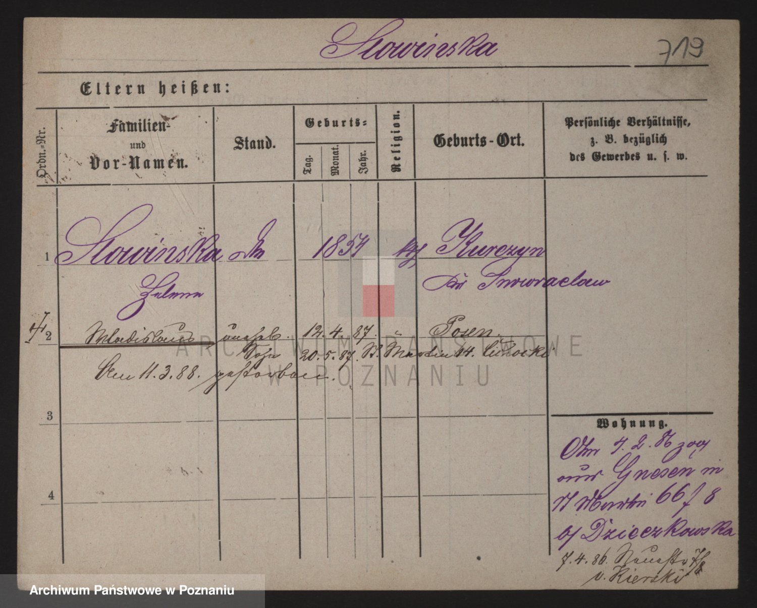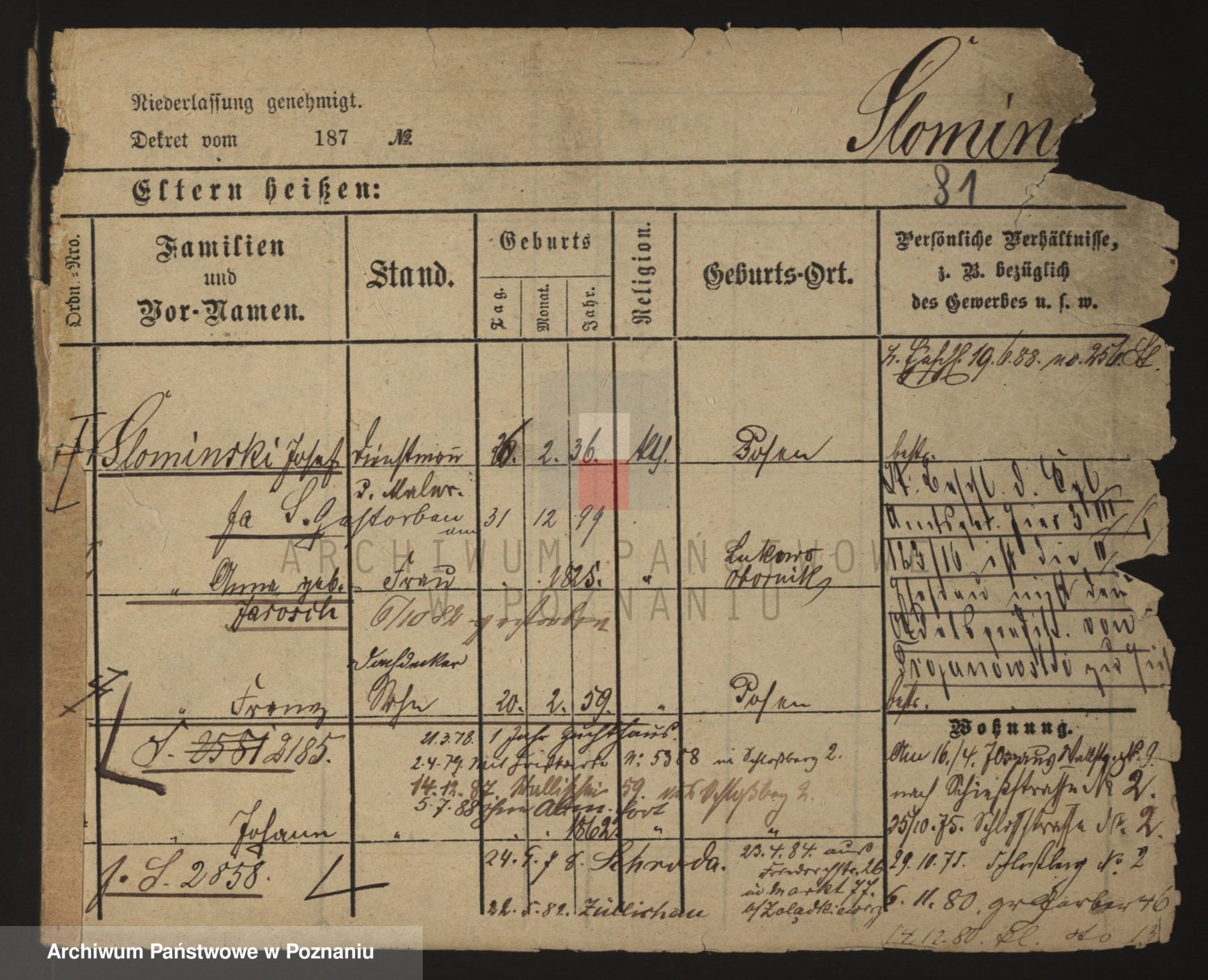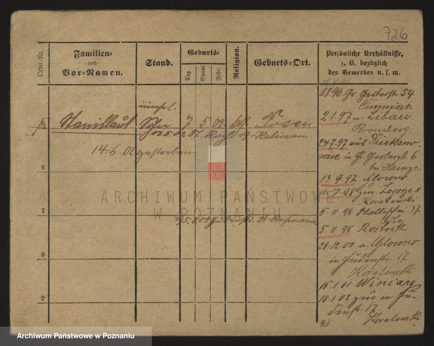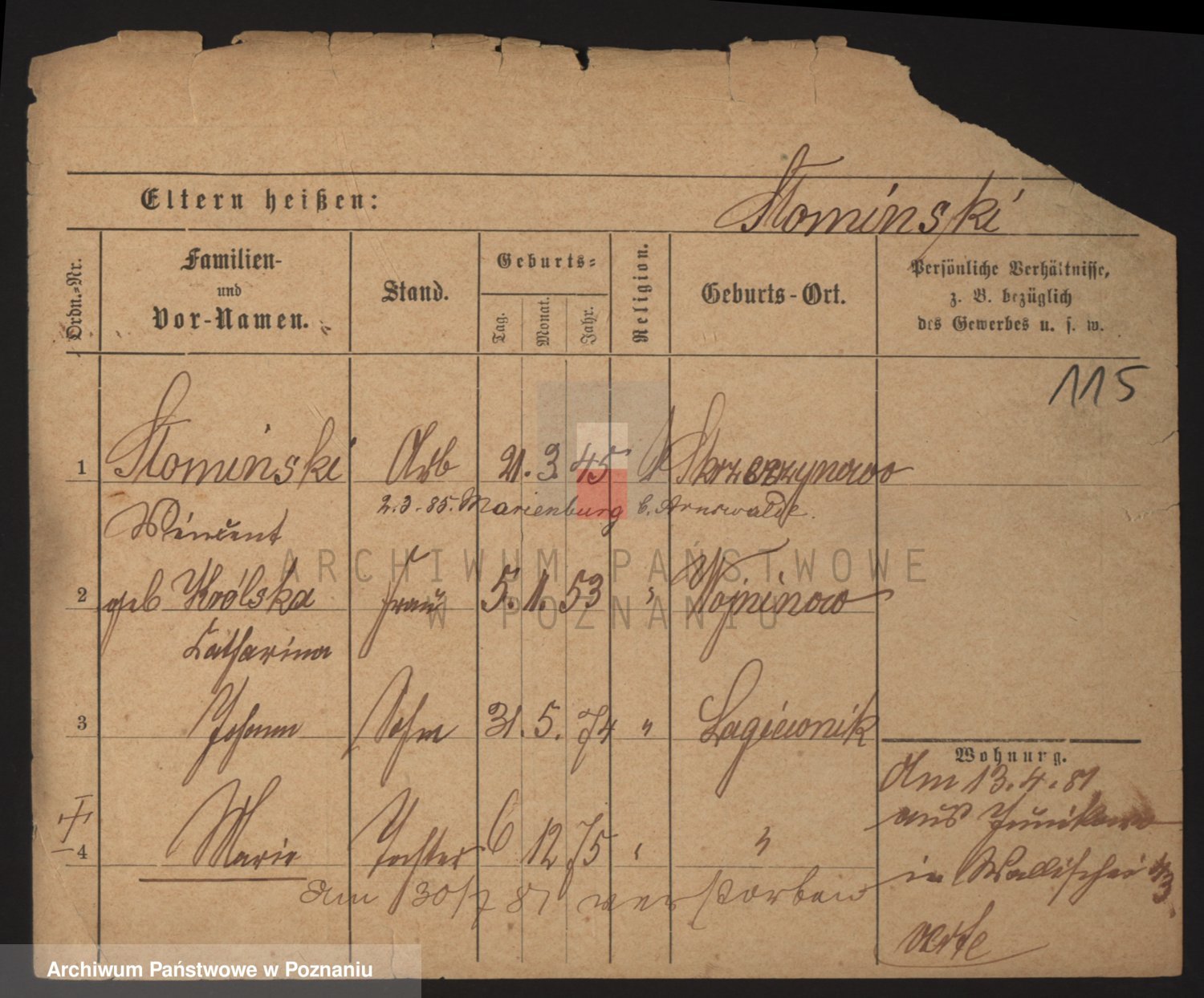 Podgląd karty osobowej dostępny jest po kliknięciu na nazwisko lub ikonkę karty. Można dokonywać powiększenia (ikony na górze) lub przechodzić między kolejnymi skanami (strzałki po bokach).