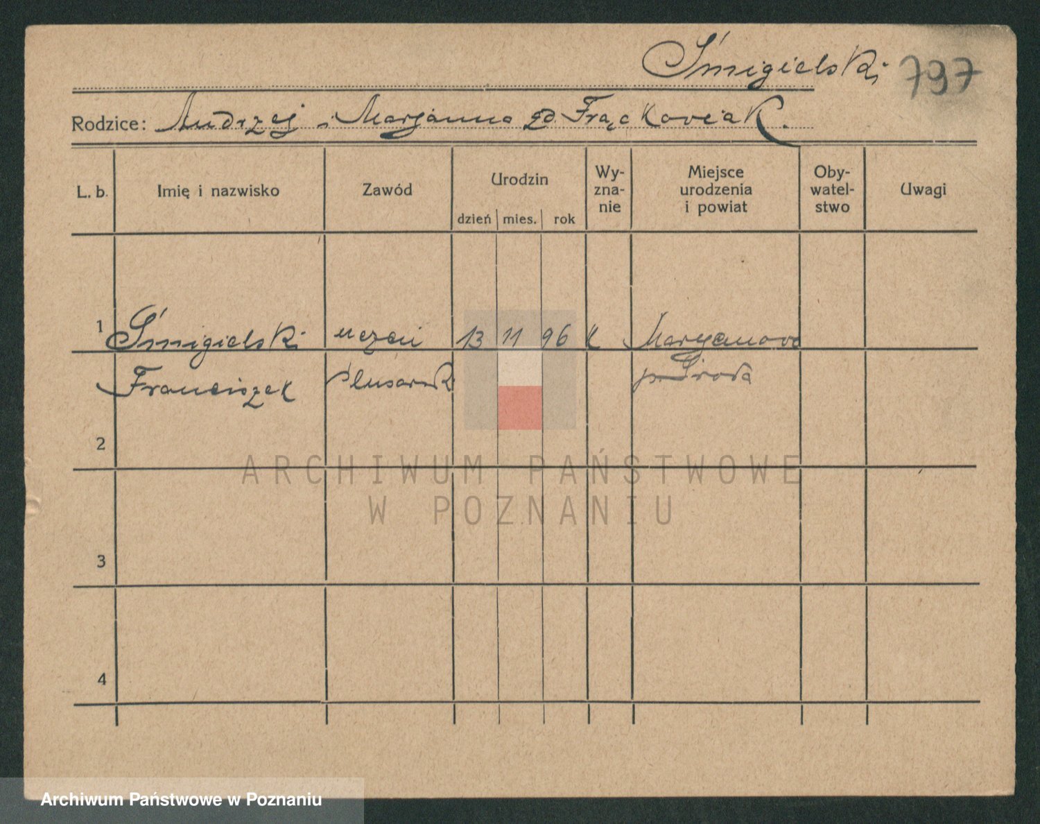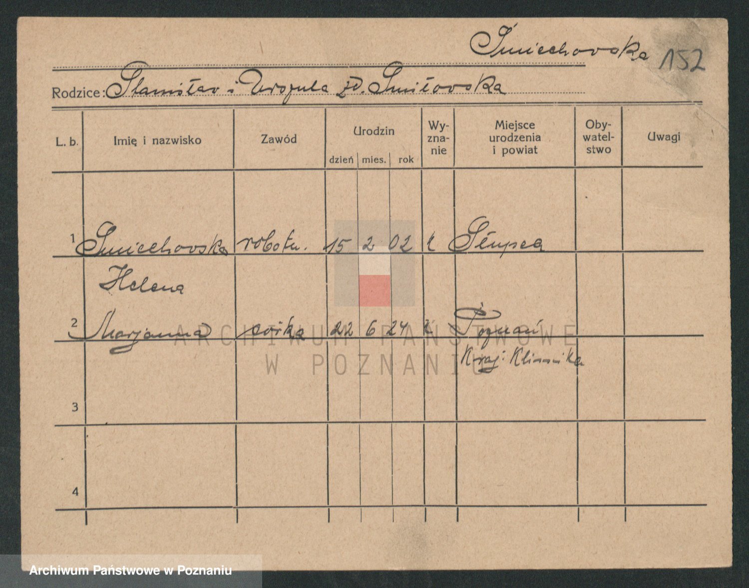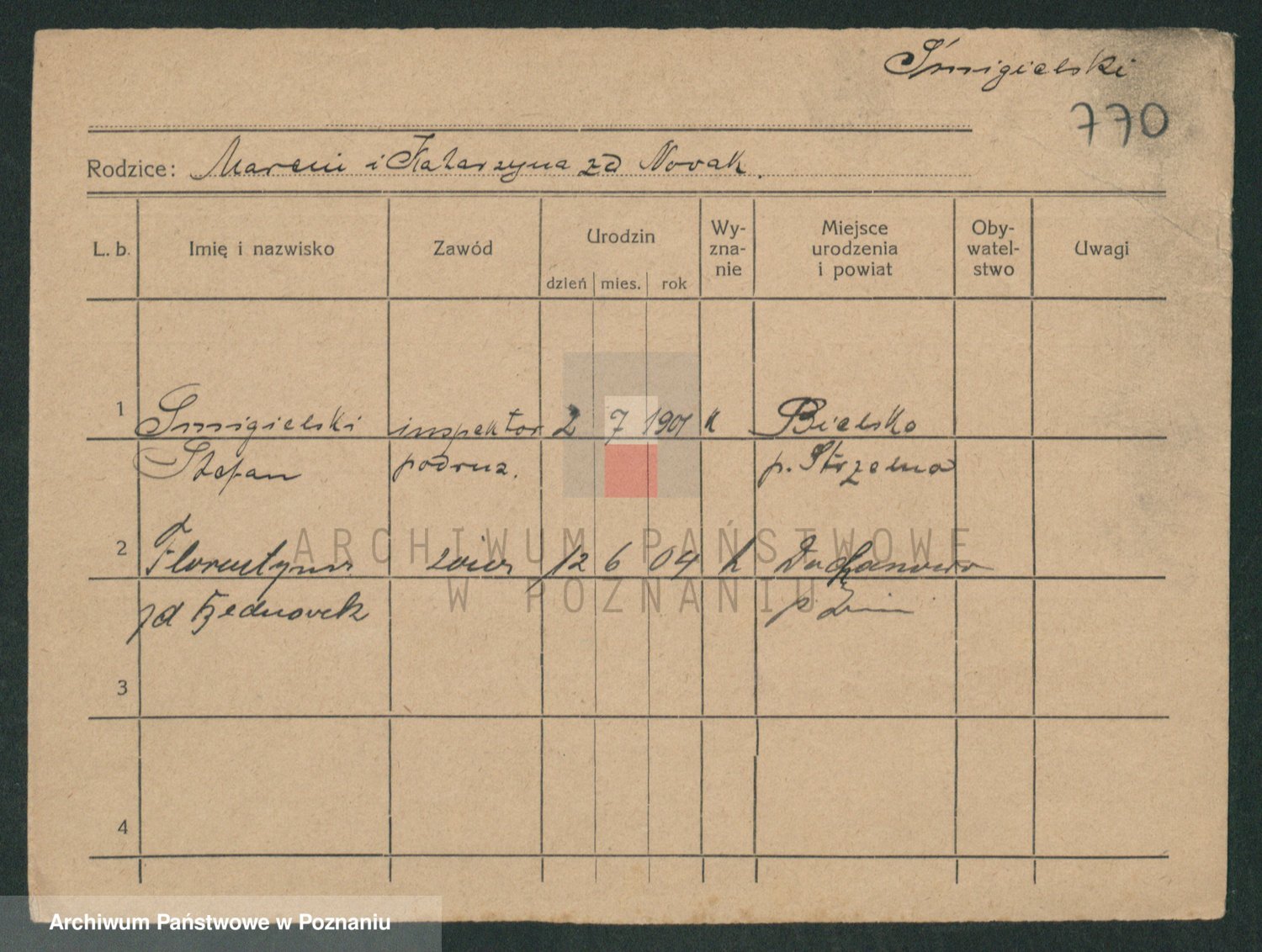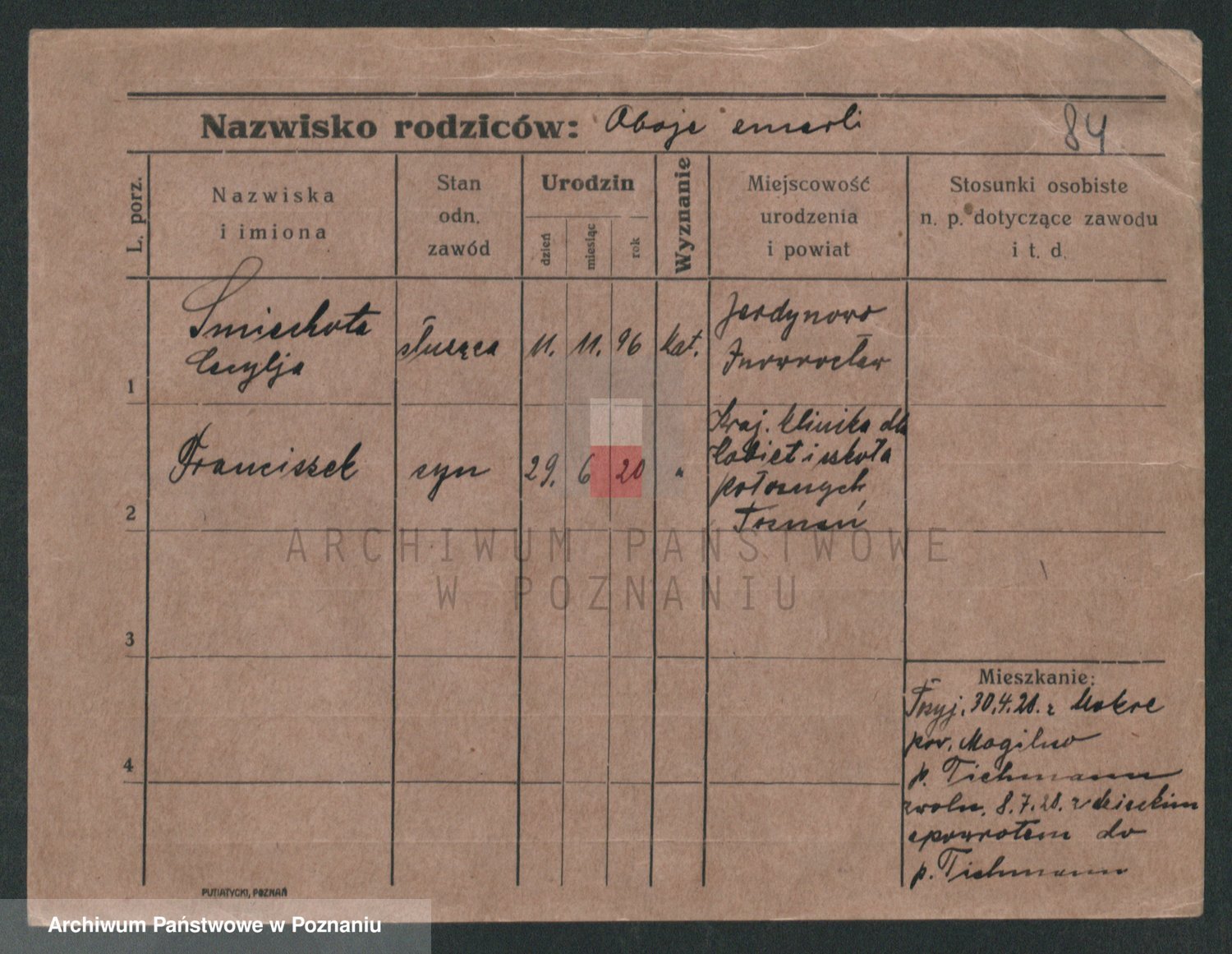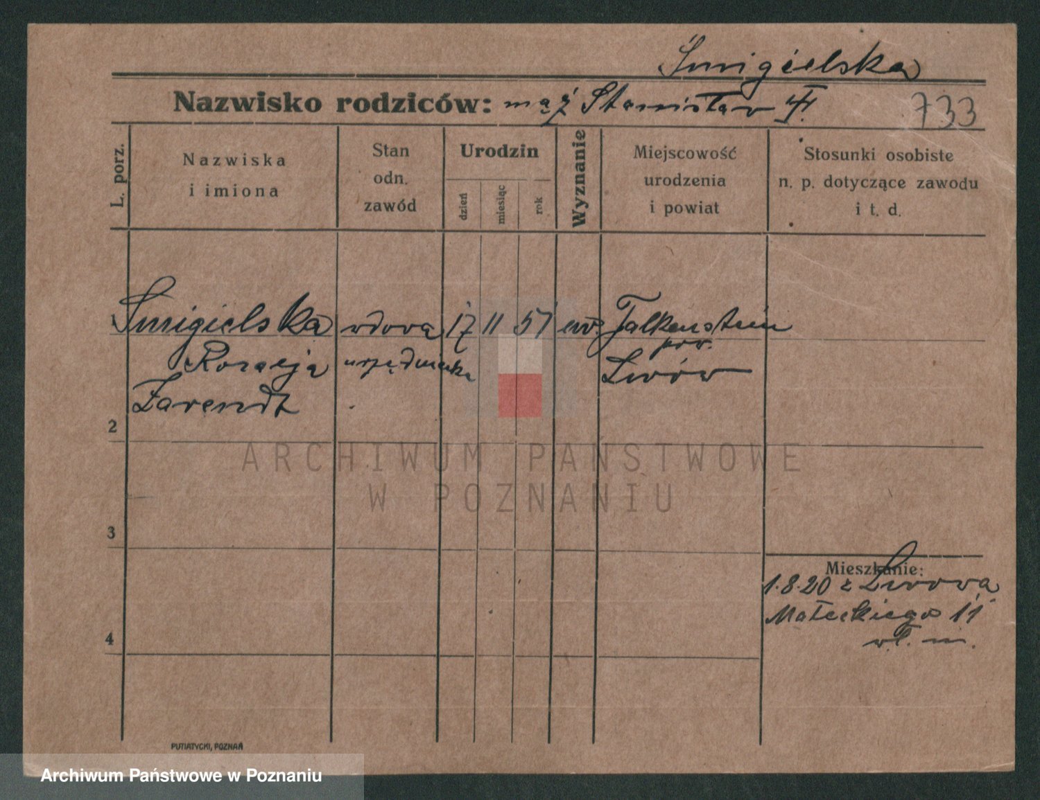 Podgląd karty osobowej dostępny jest po kliknięciu na nazwisko lub ikonkę karty. Można dokonywać powiększenia (ikony na górze) lub przechodzić między kolejnymi skanami (strzałki po bokach).