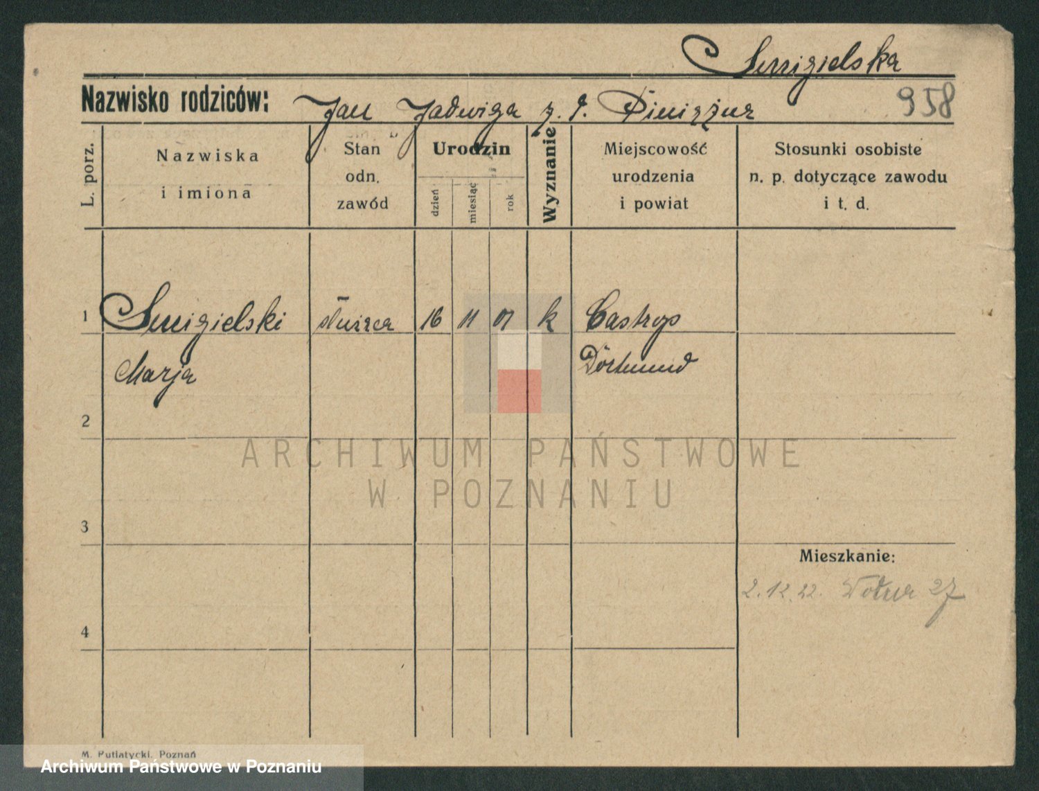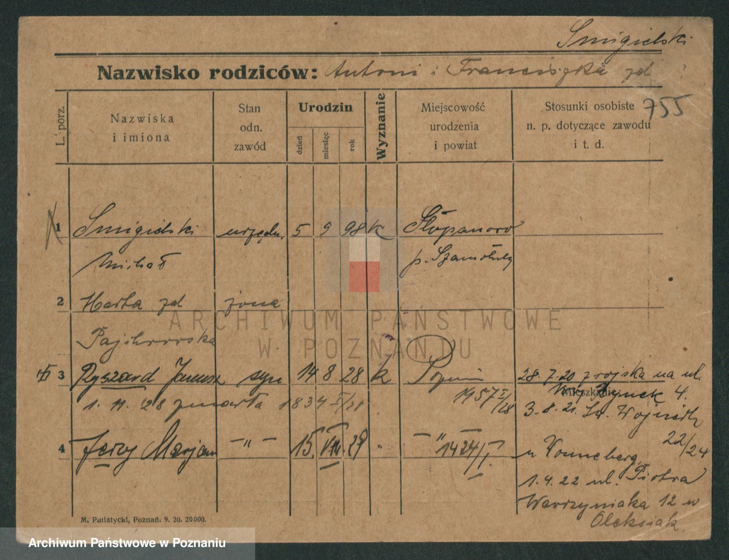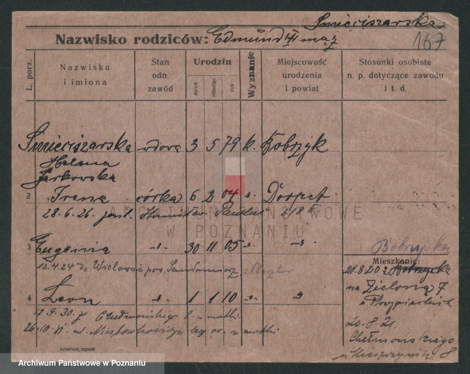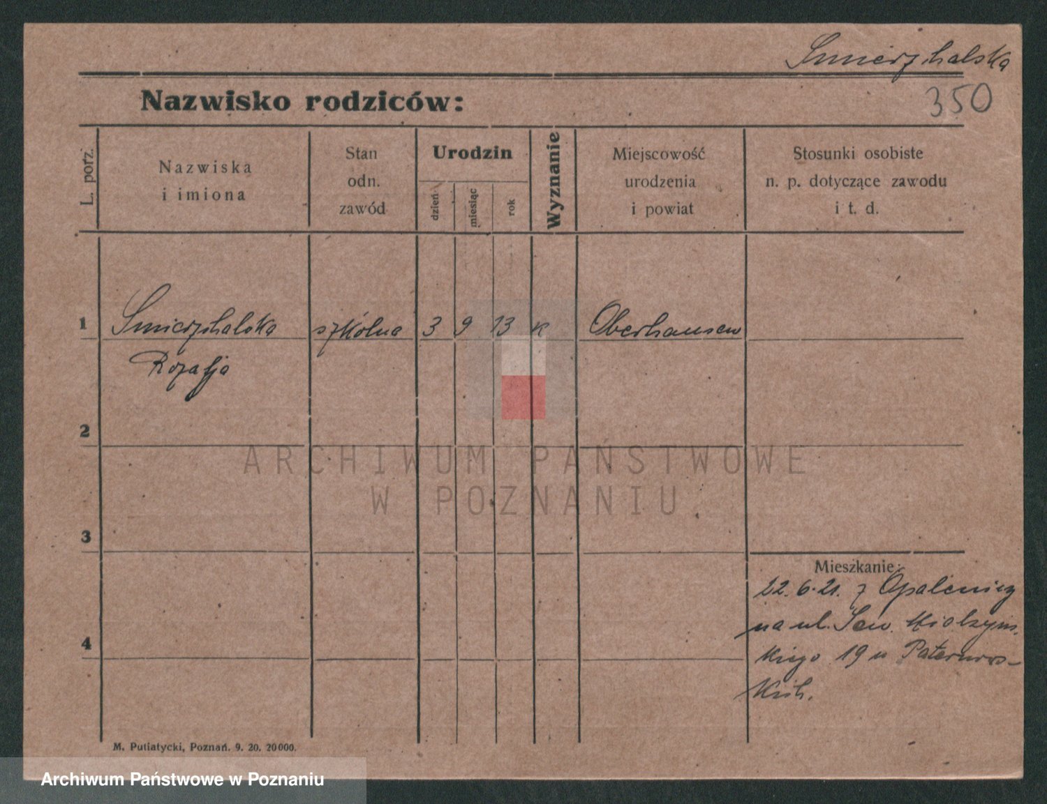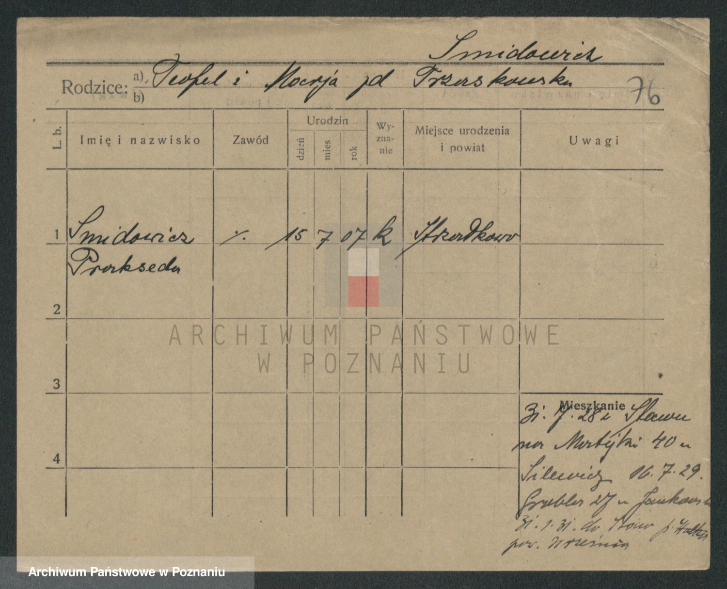 Podgląd karty osobowej dostępny jest po kliknięciu na nazwisko lub ikonkę karty. Można dokonywać powiększenia (ikony na górze) lub przechodzić między kolejnymi skanami (strzałki po bokach).