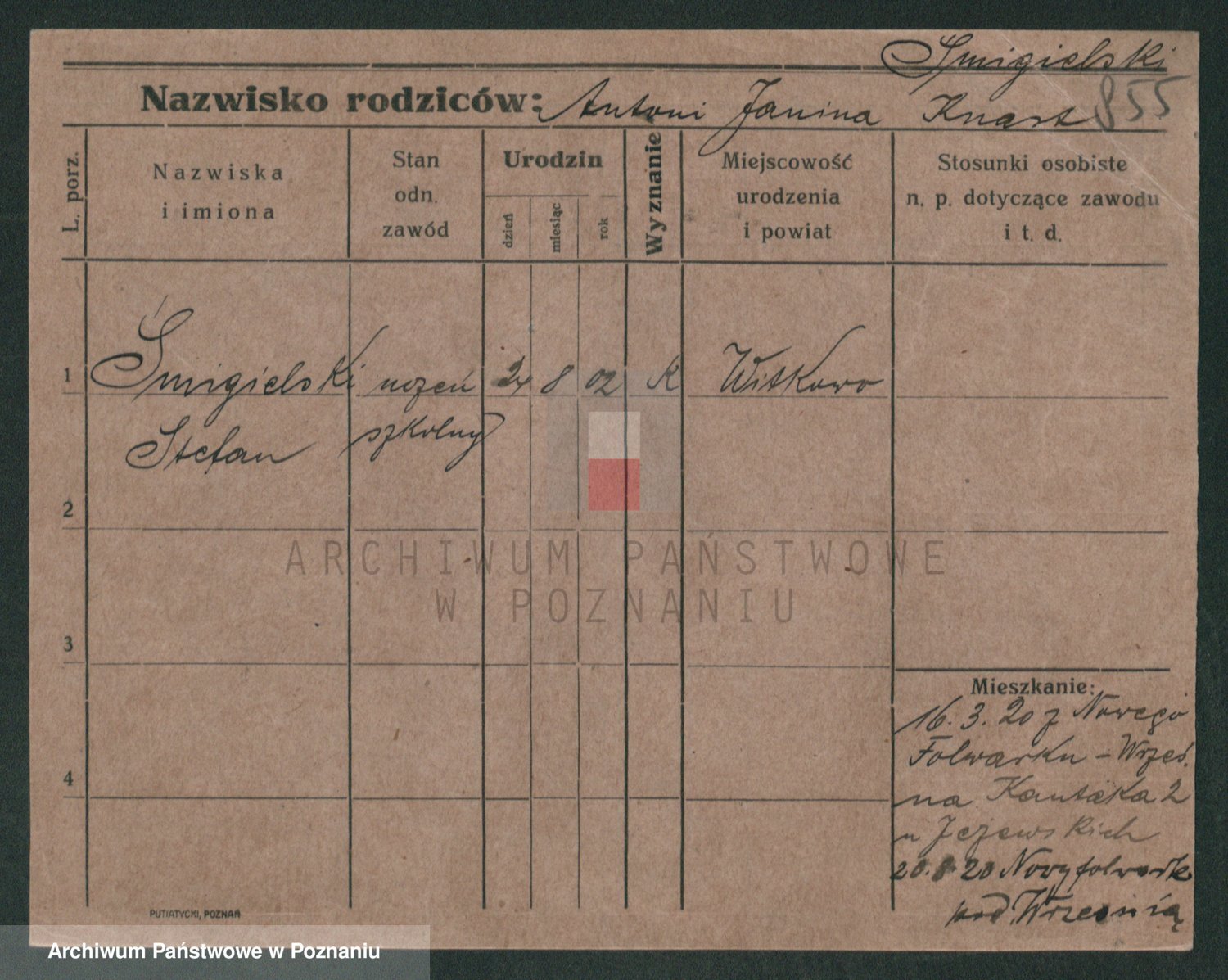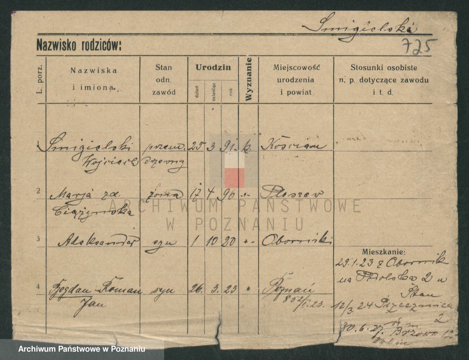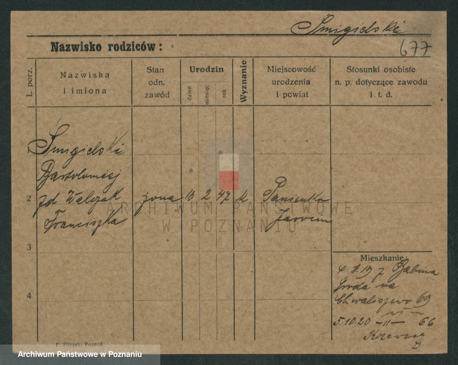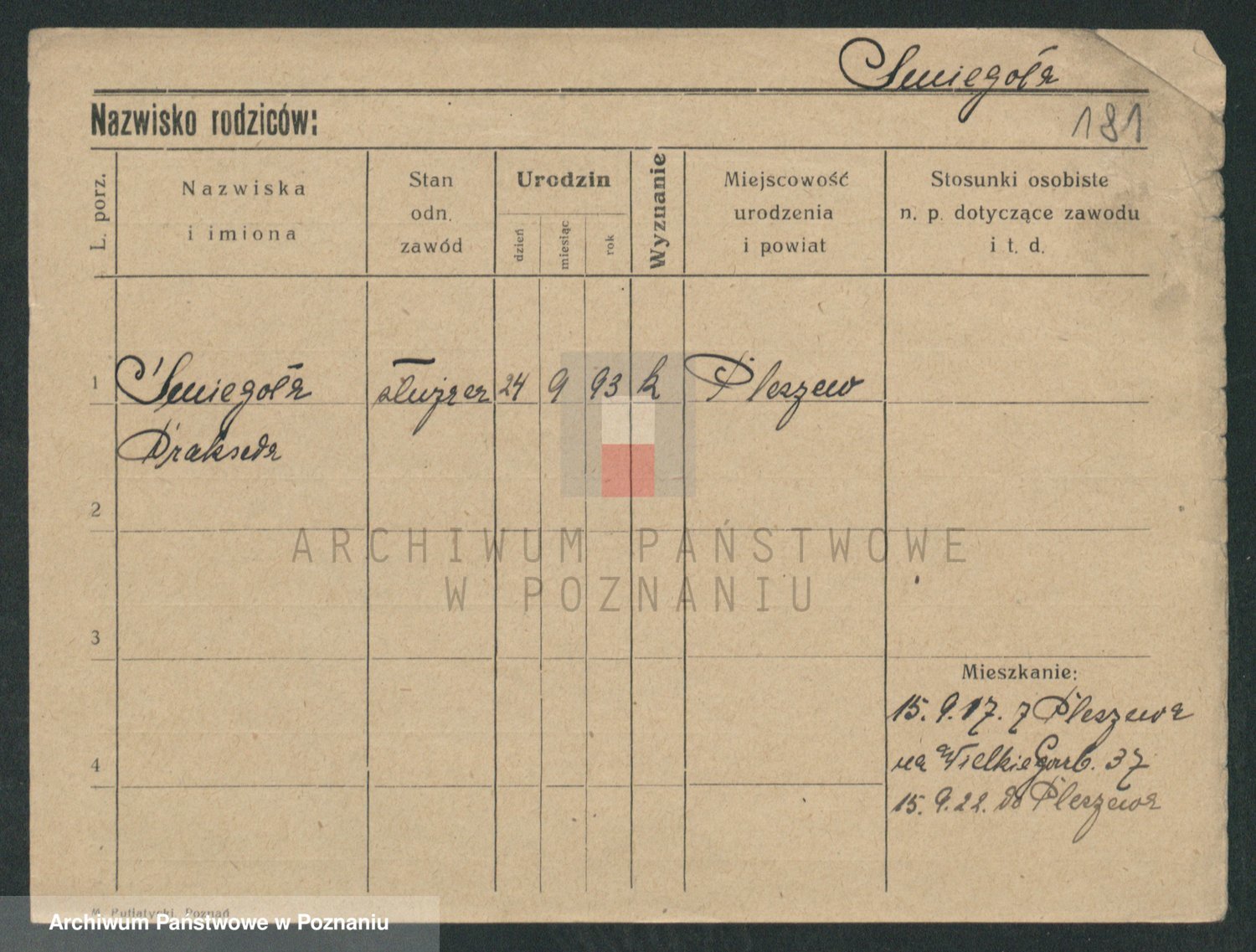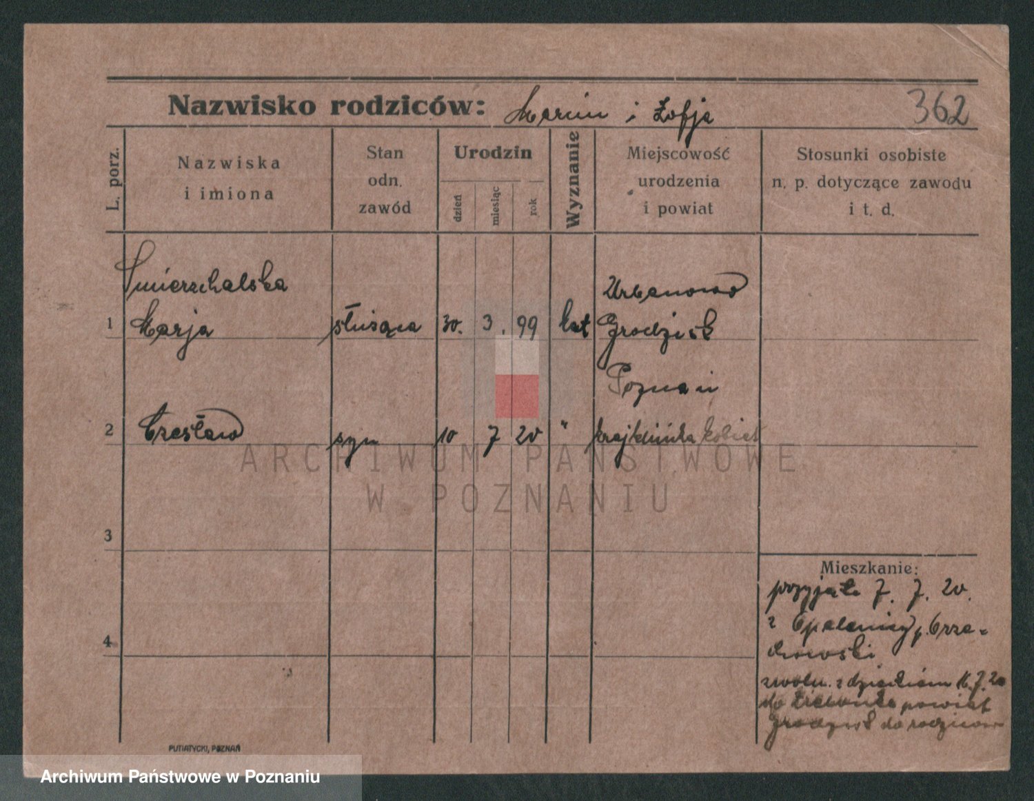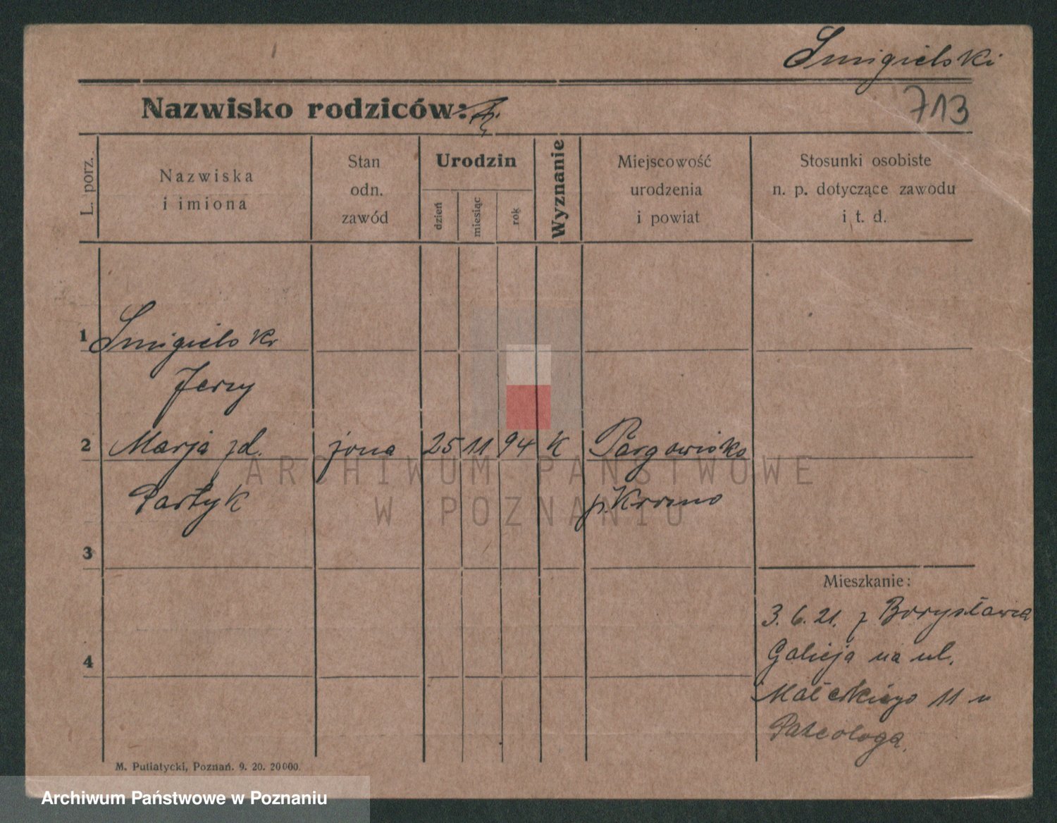 Podgląd karty osobowej dostępny jest po kliknięciu na nazwisko lub ikonkę karty. Można dokonywać powiększenia (ikony na górze) lub przechodzić między kolejnymi skanami (strzałki po bokach).