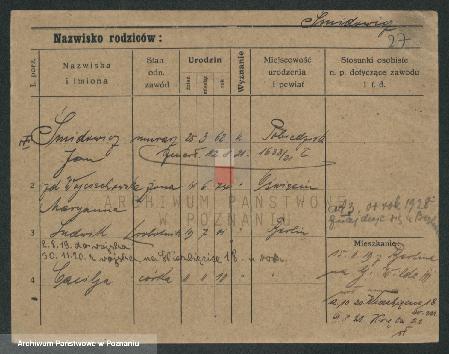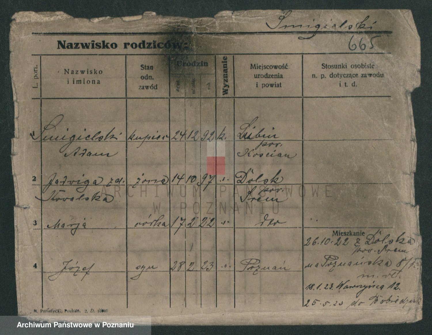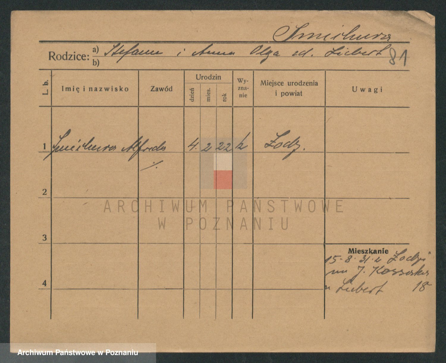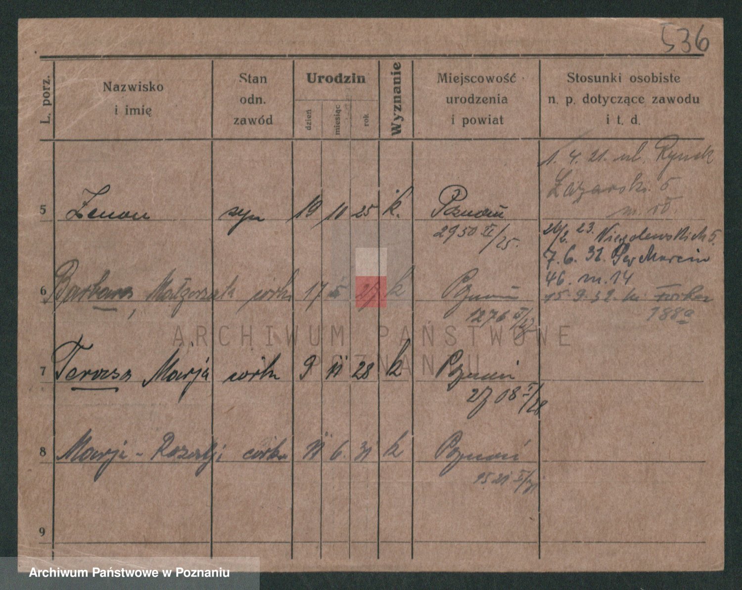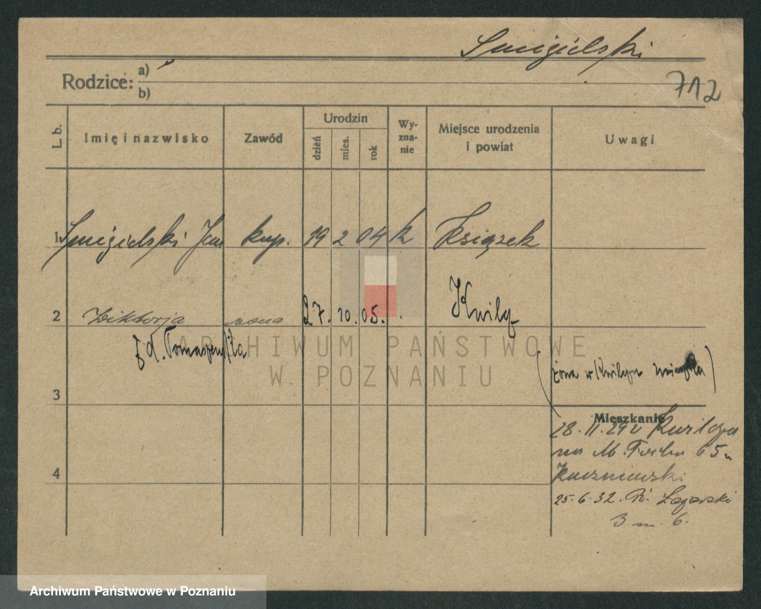Podgląd karty osobowej dostępny jest po kliknięciu na nazwisko lub ikonkę karty. Można dokonywać powiększenia (ikony na górze) lub przechodzić między kolejnymi skanami (strzałki po bokach).