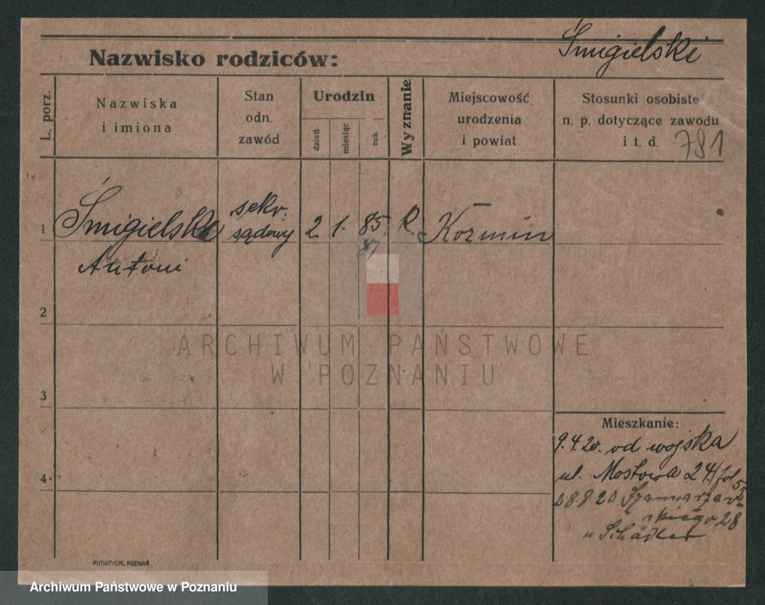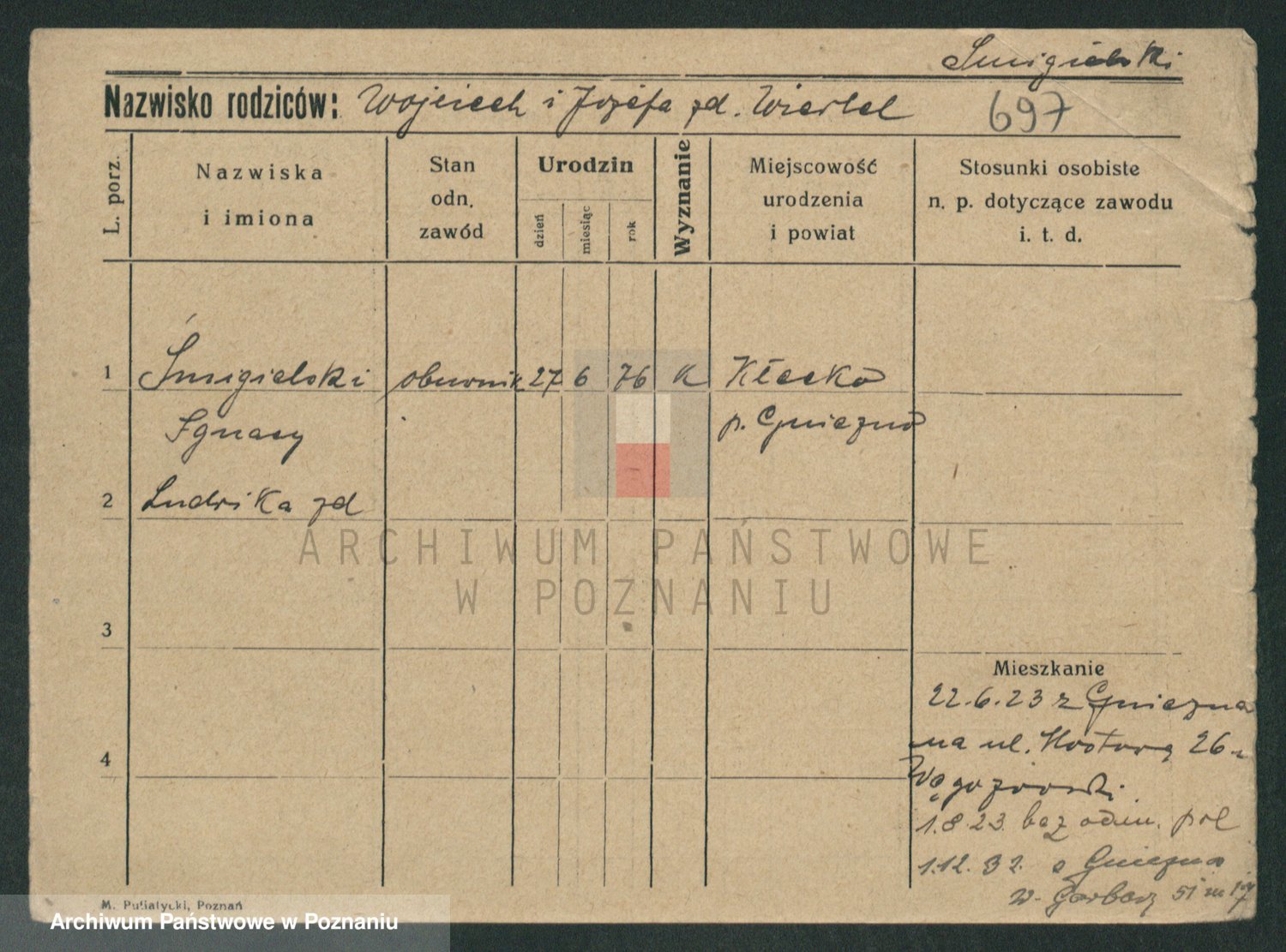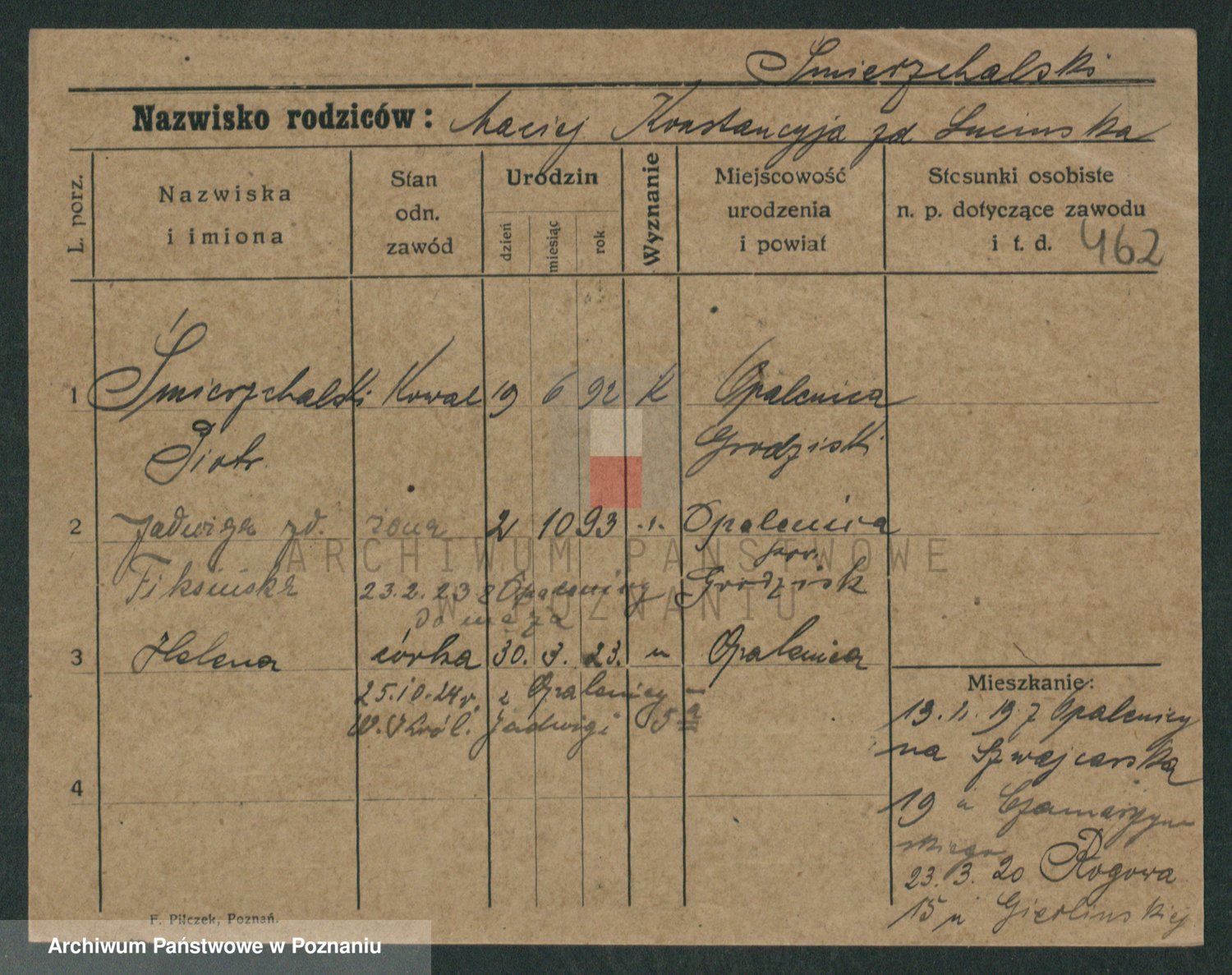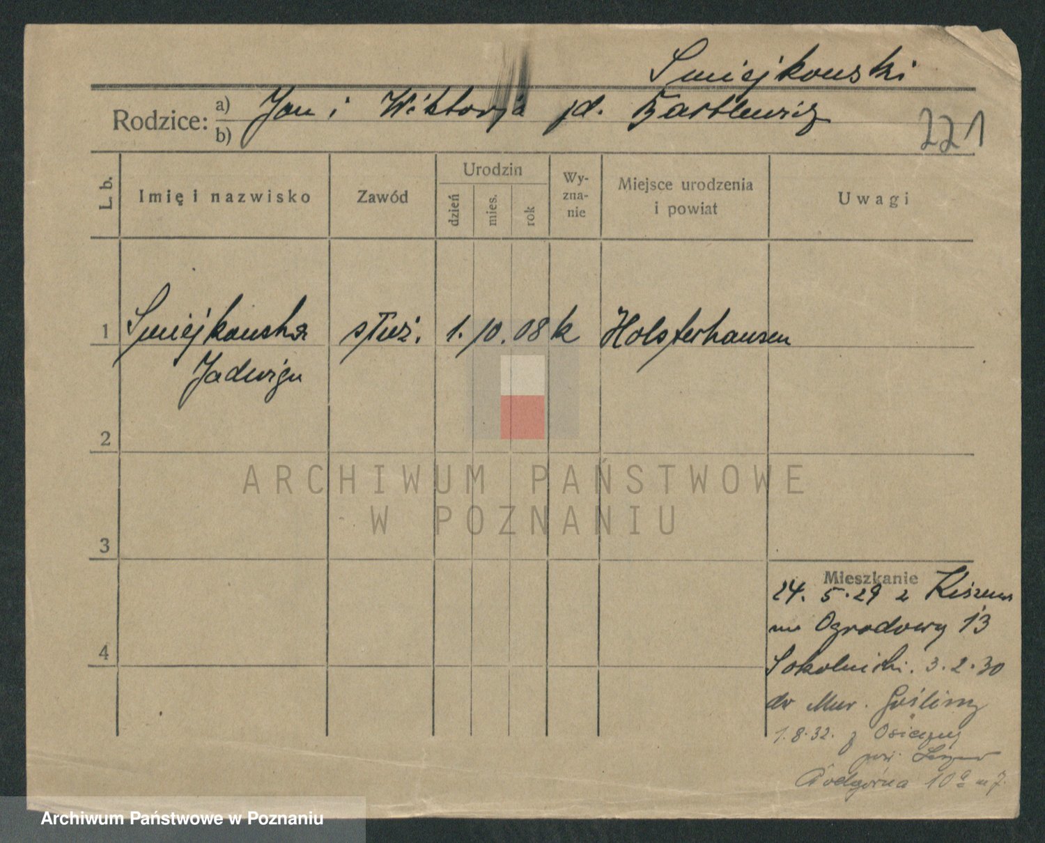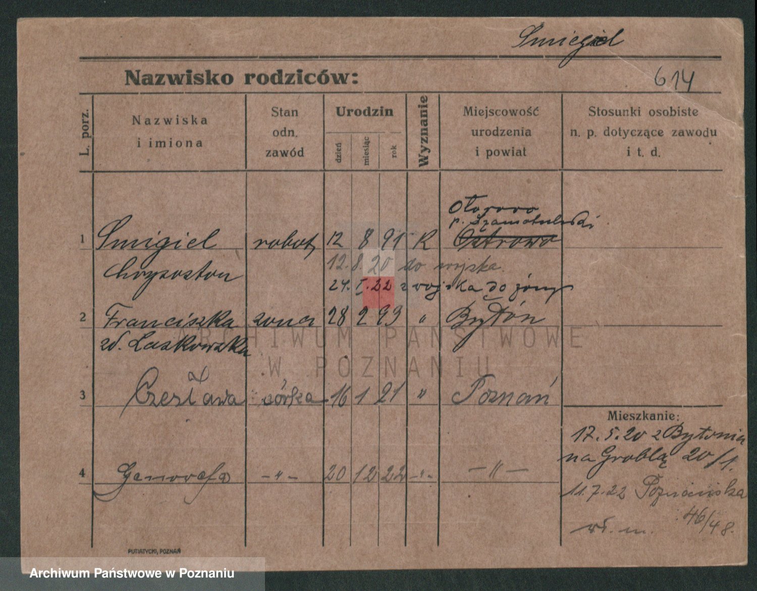 Podgląd karty osobowej dostępny jest po kliknięciu na nazwisko lub ikonkę karty. Można dokonywać powiększenia (ikony na górze) lub przechodzić między kolejnymi skanami (strzałki po bokach).