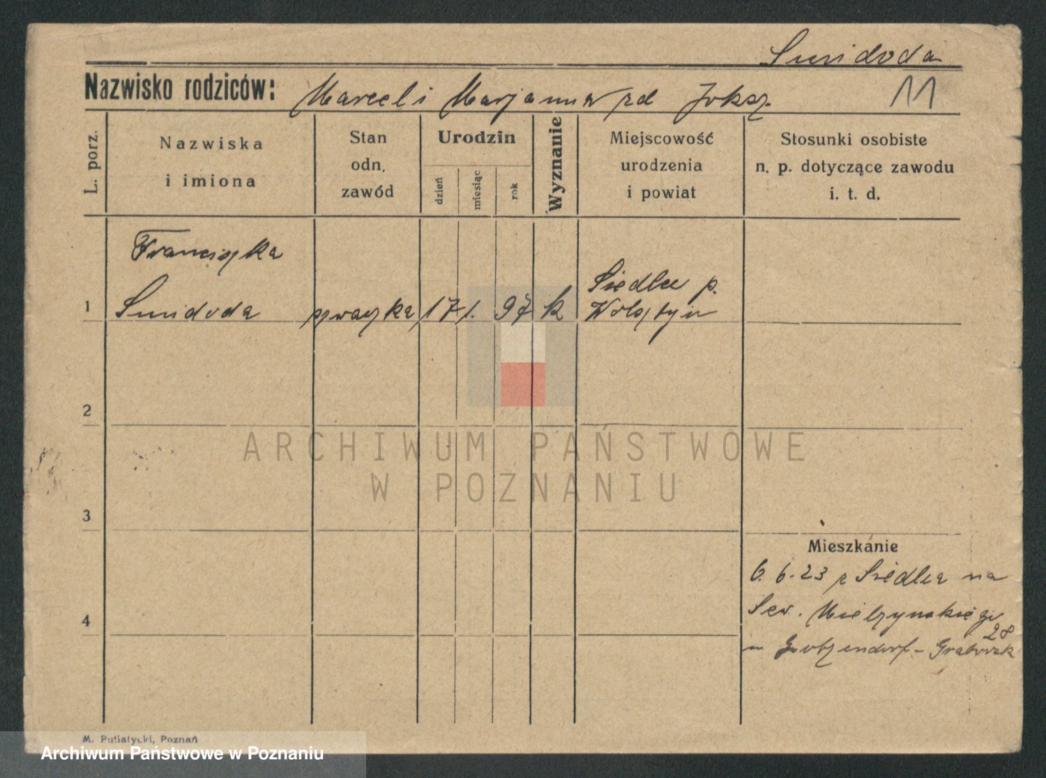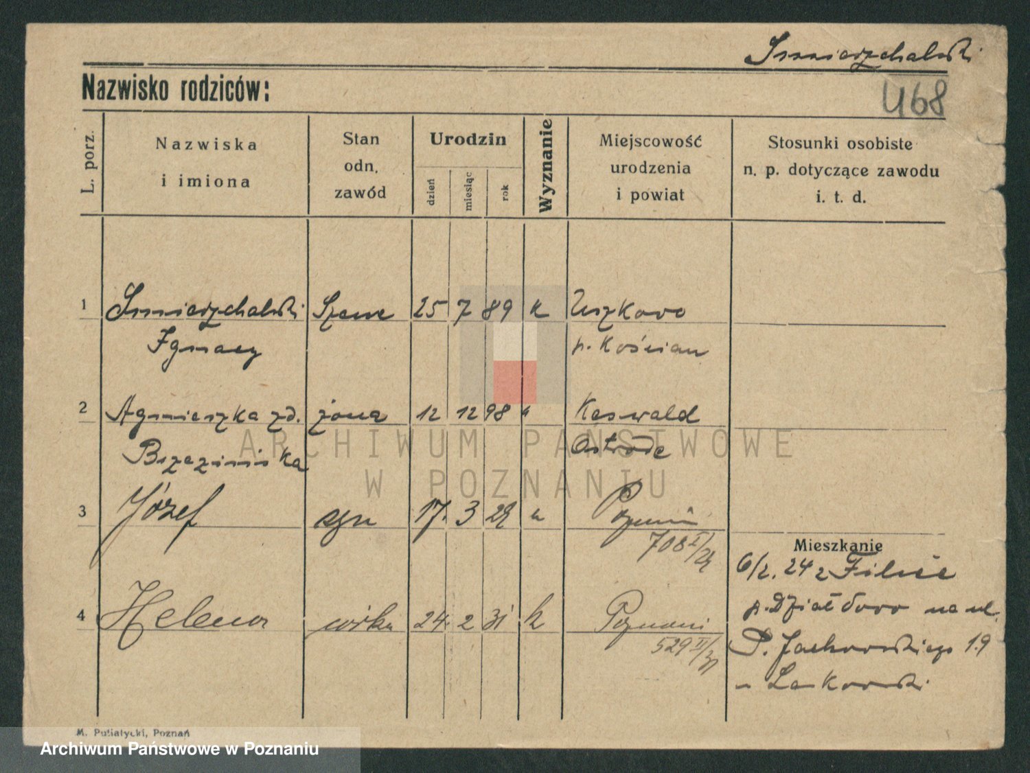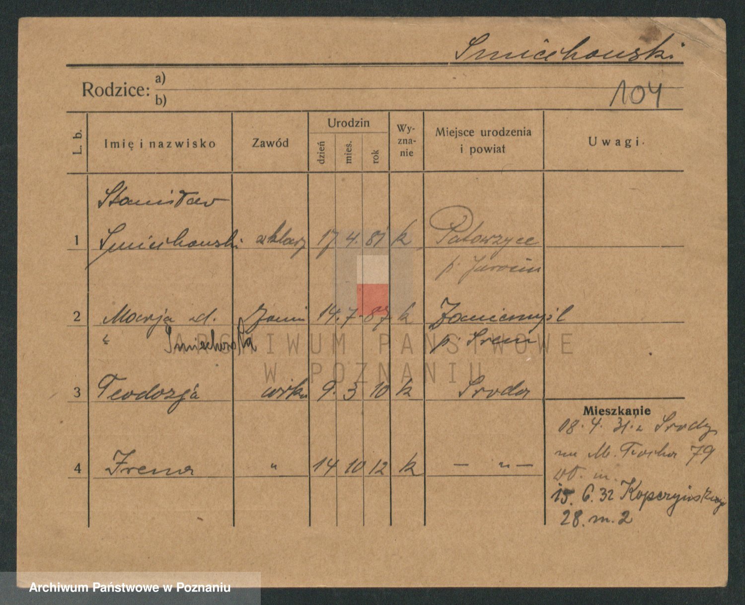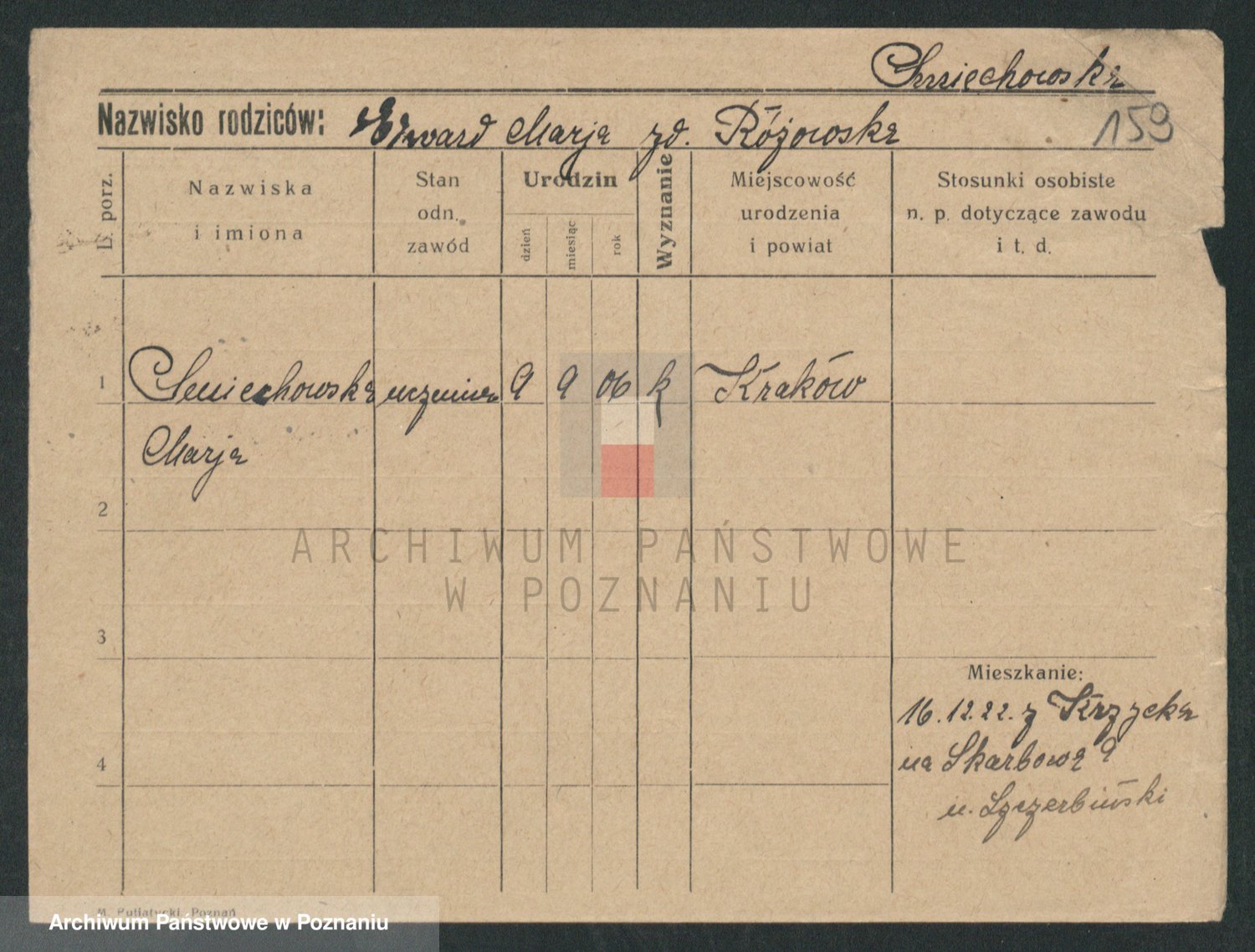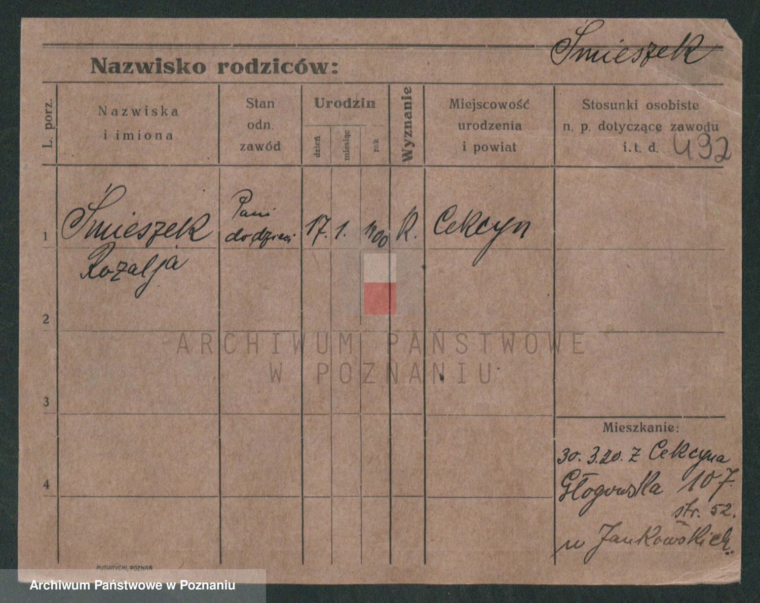 Podgląd karty osobowej dostępny jest po kliknięciu na nazwisko lub ikonkę karty. Można dokonywać powiększenia (ikony na górze) lub przechodzić między kolejnymi skanami (strzałki po bokach).
