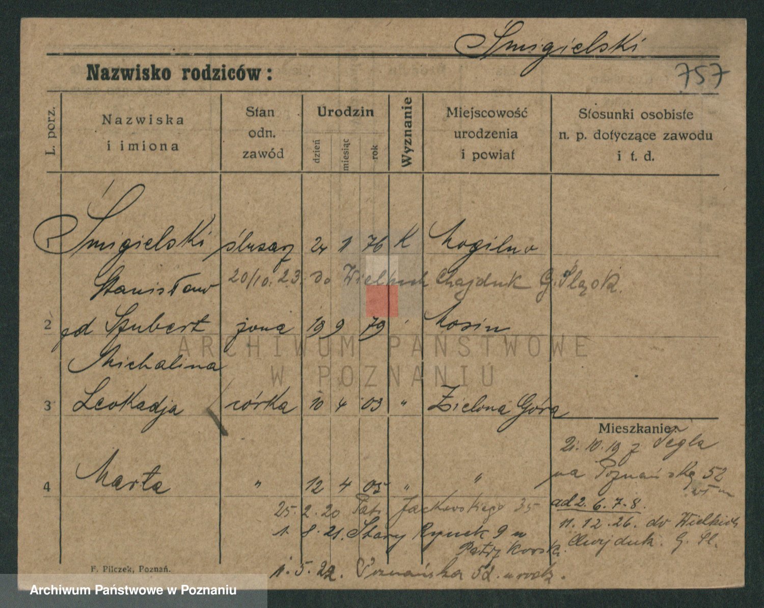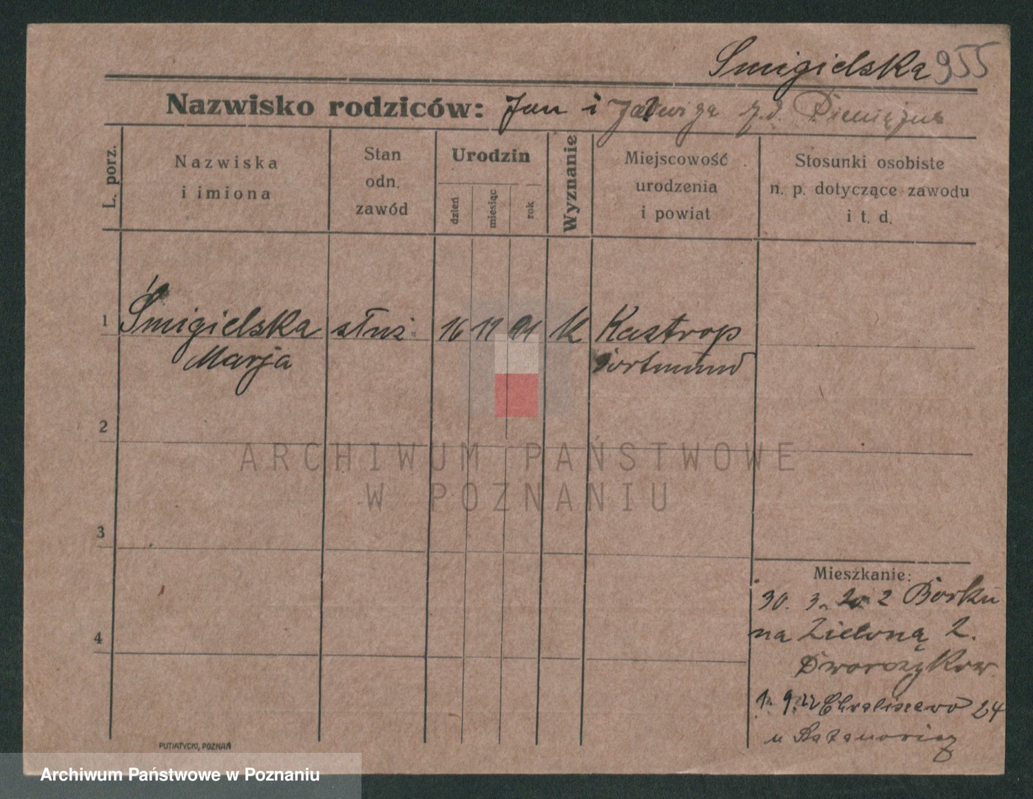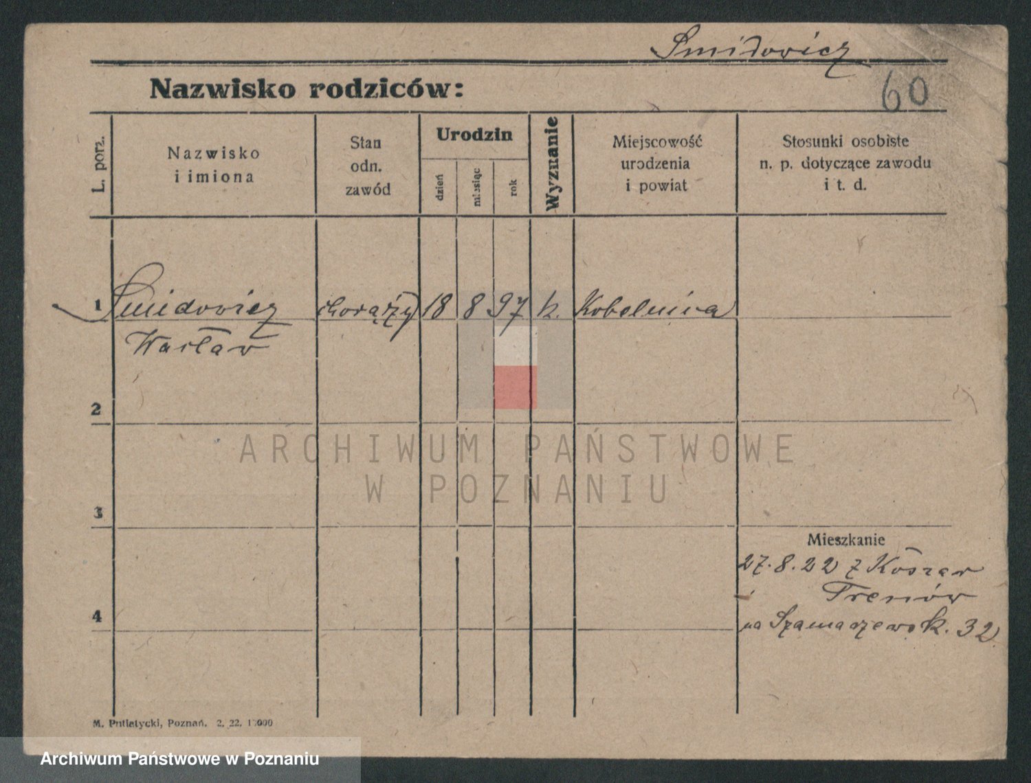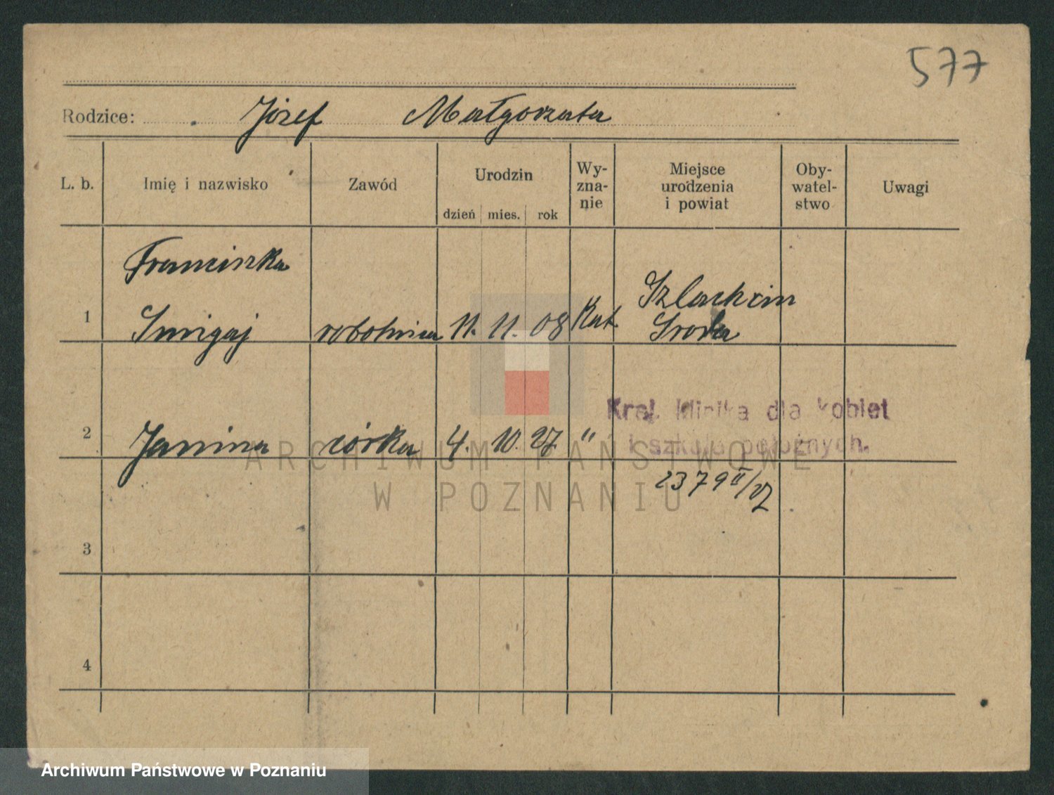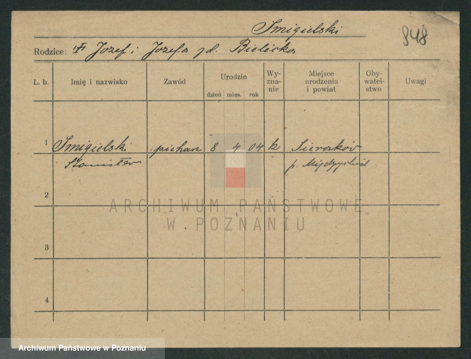 Podgląd karty osobowej dostępny jest po kliknięciu na nazwisko lub ikonkę karty. Można dokonywać powiększenia (ikony na górze) lub przechodzić między kolejnymi skanami (strzałki po bokach).