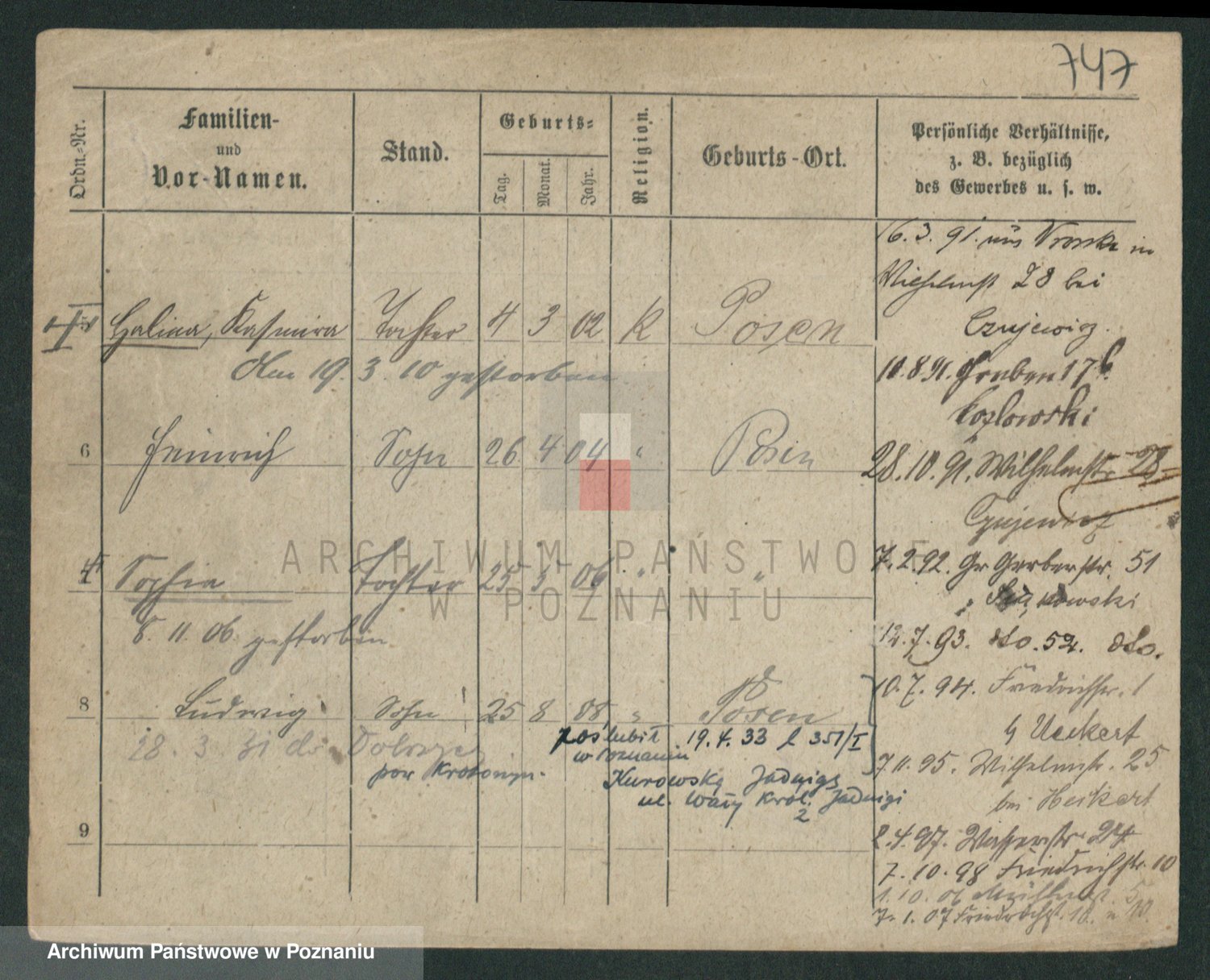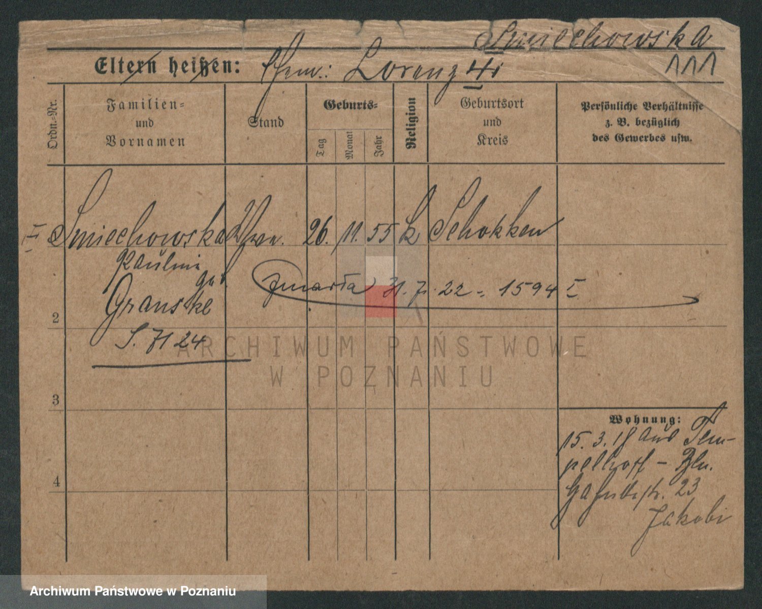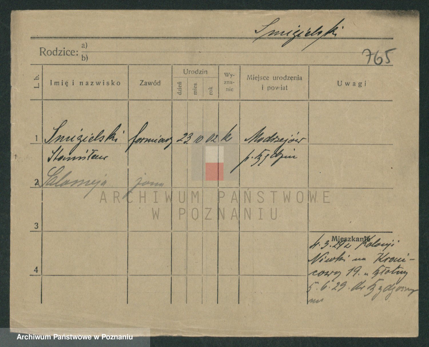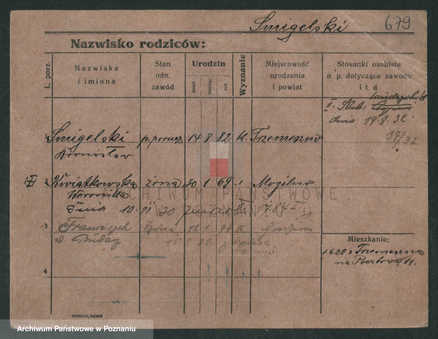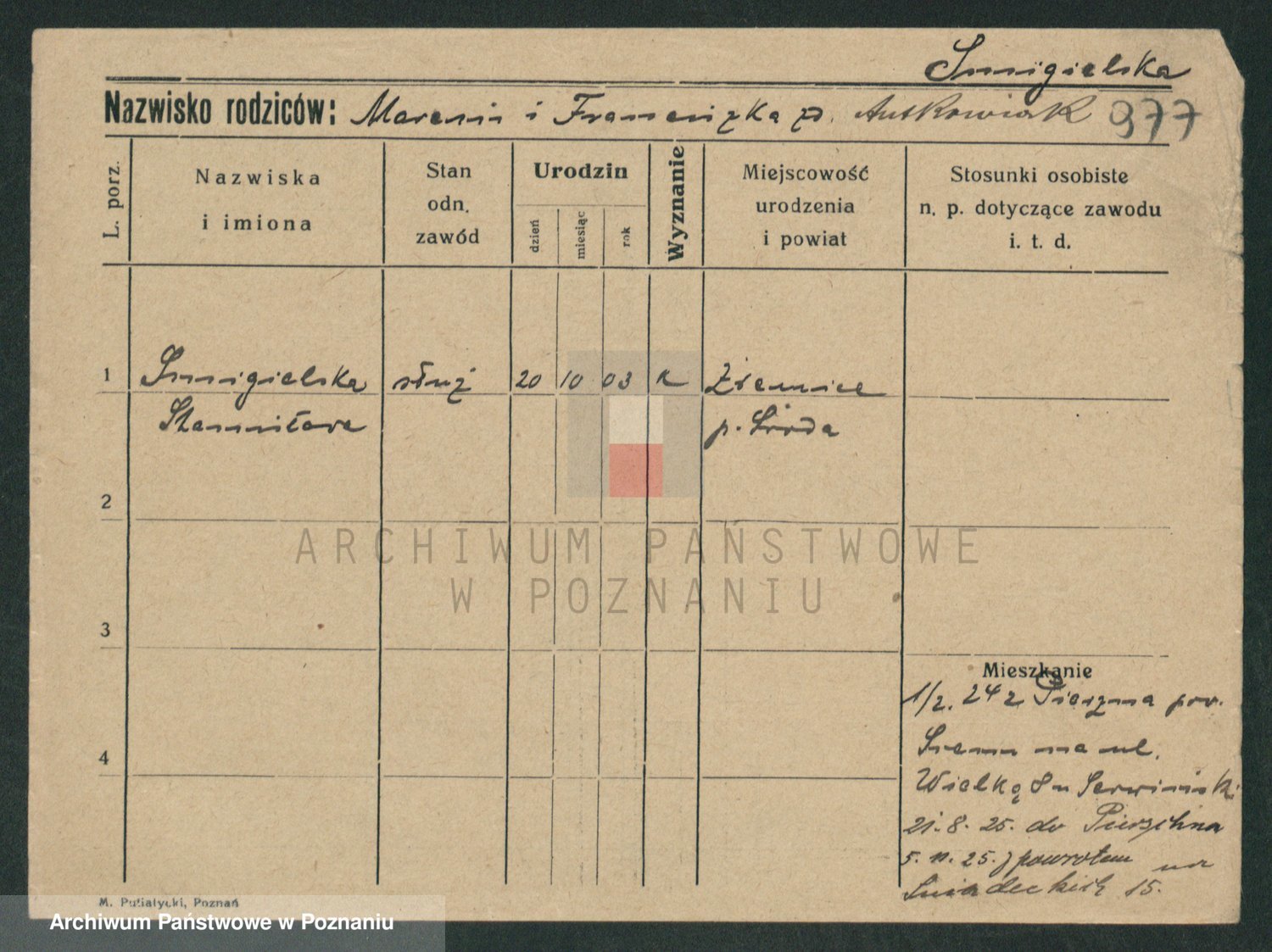 Podgląd karty osobowej dostępny jest po kliknięciu na nazwisko lub ikonkę karty. Można dokonywać powiększenia (ikony na górze) lub przechodzić między kolejnymi skanami (strzałki po bokach).