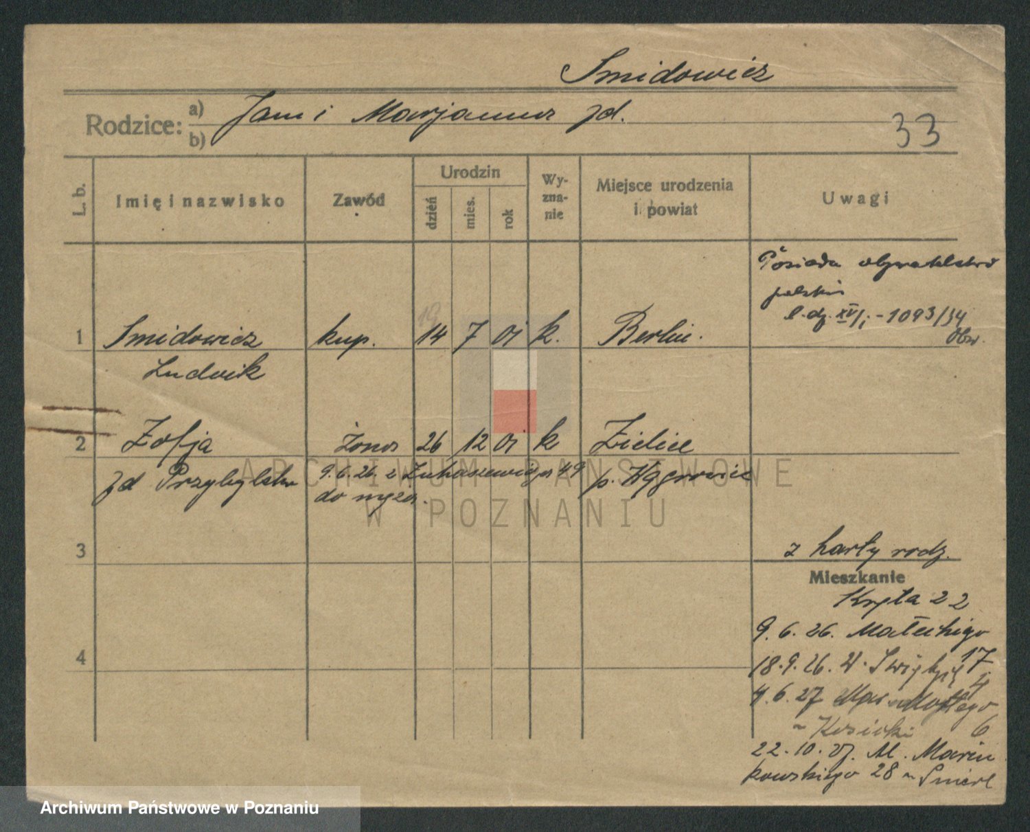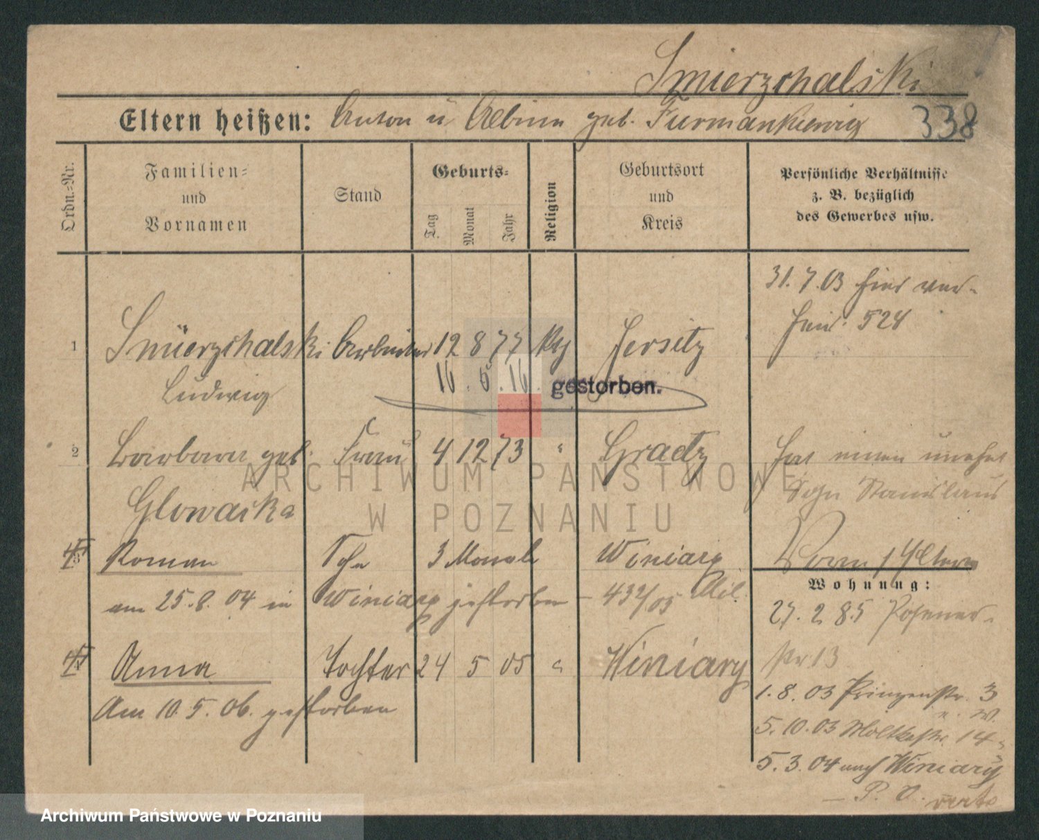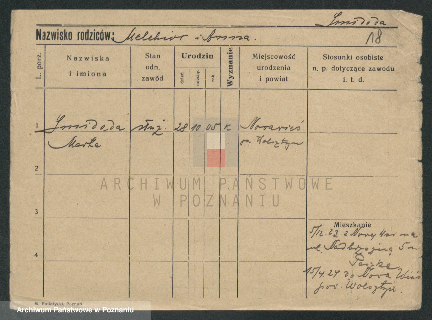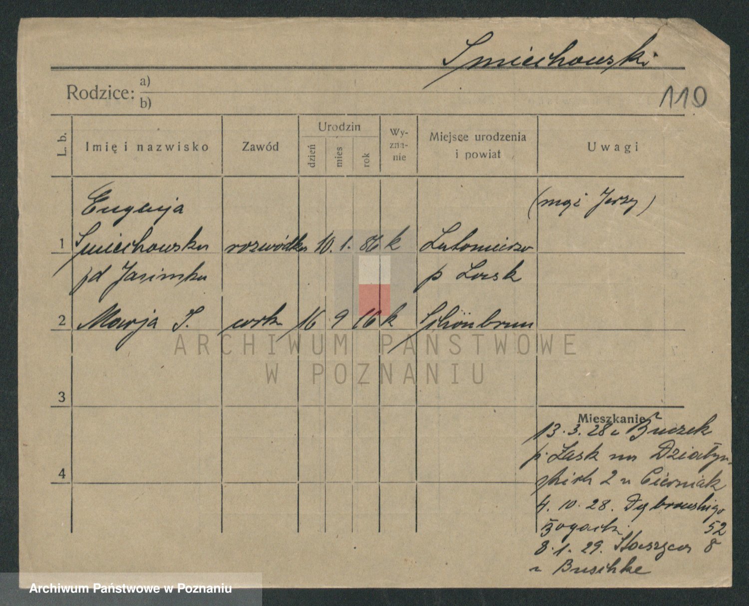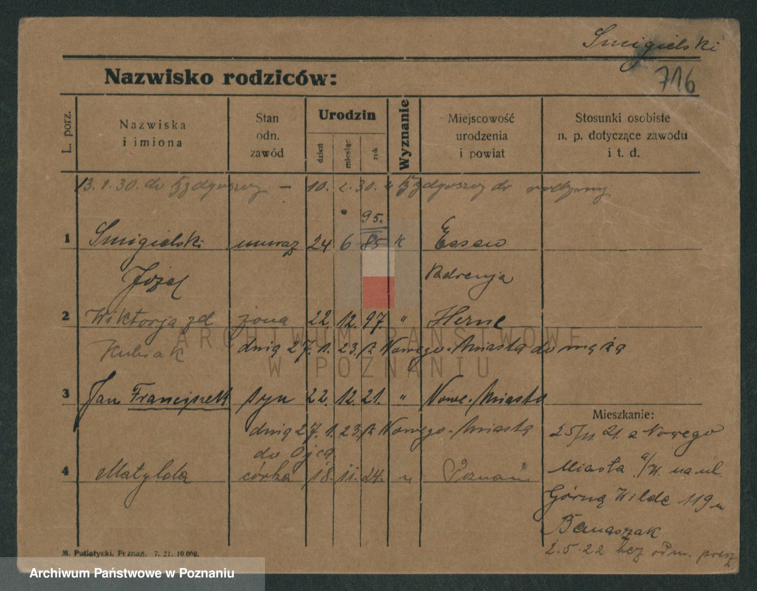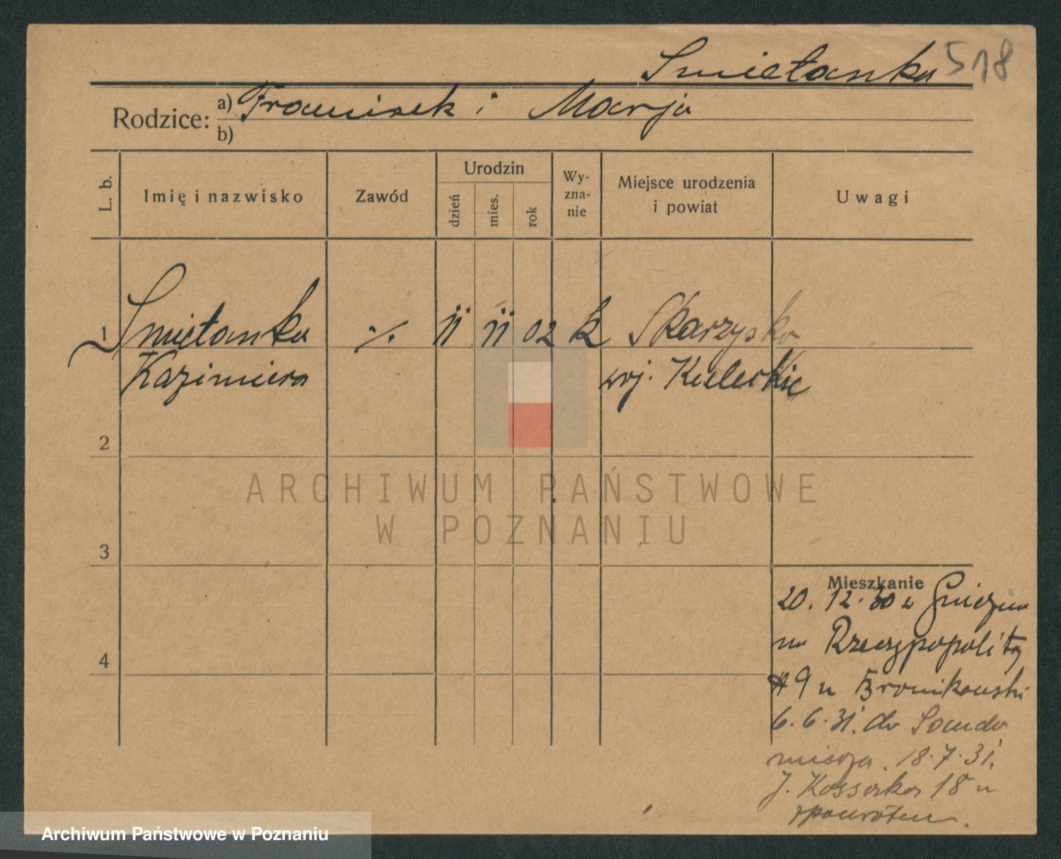 Podgląd karty osobowej dostępny jest po kliknięciu na nazwisko lub ikonkę karty. Można dokonywać powiększenia (ikony na górze) lub przechodzić między kolejnymi skanami (strzałki po bokach).