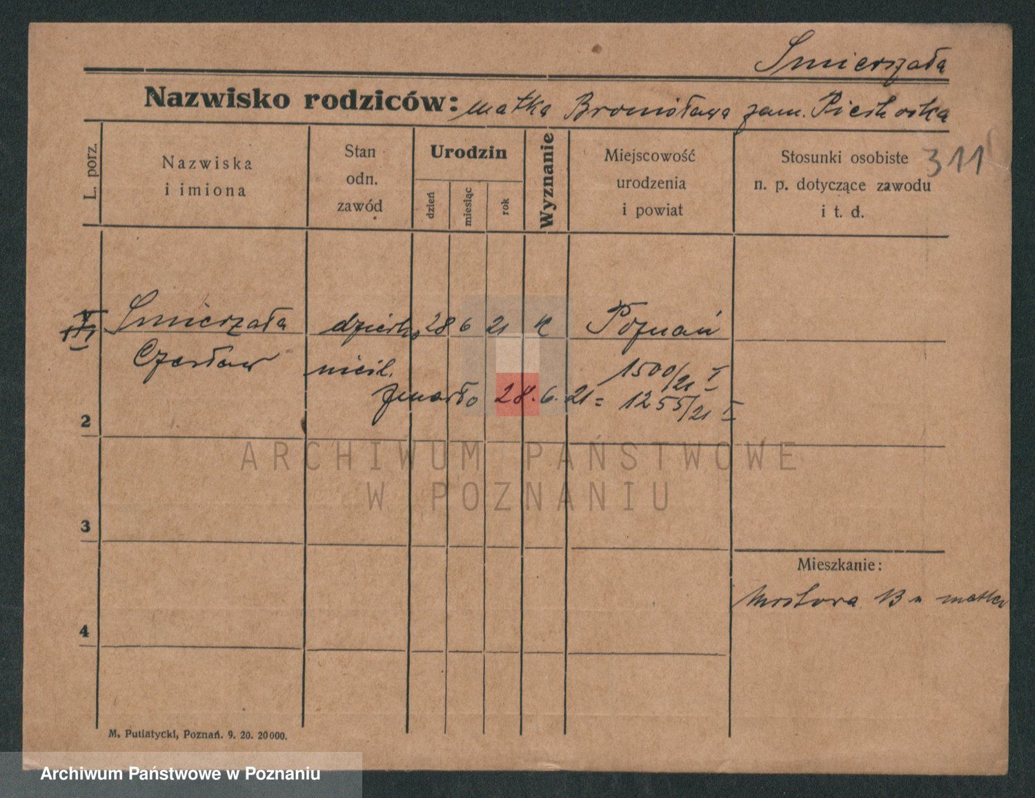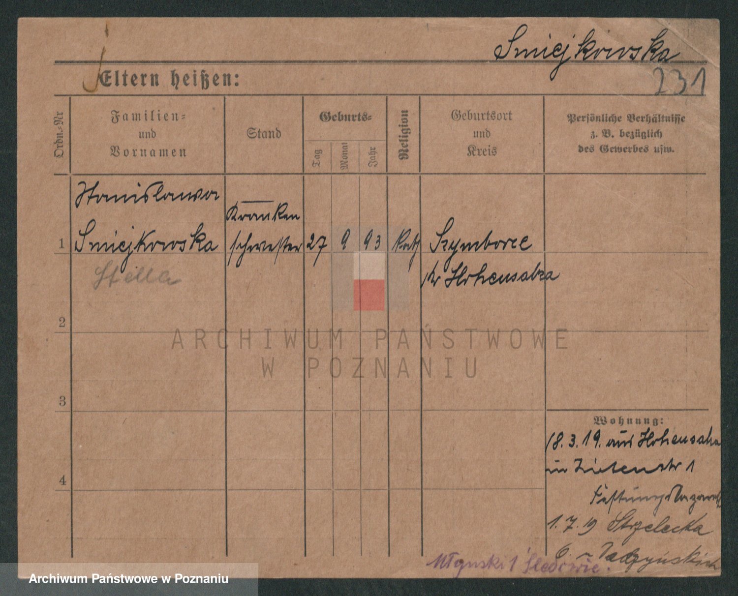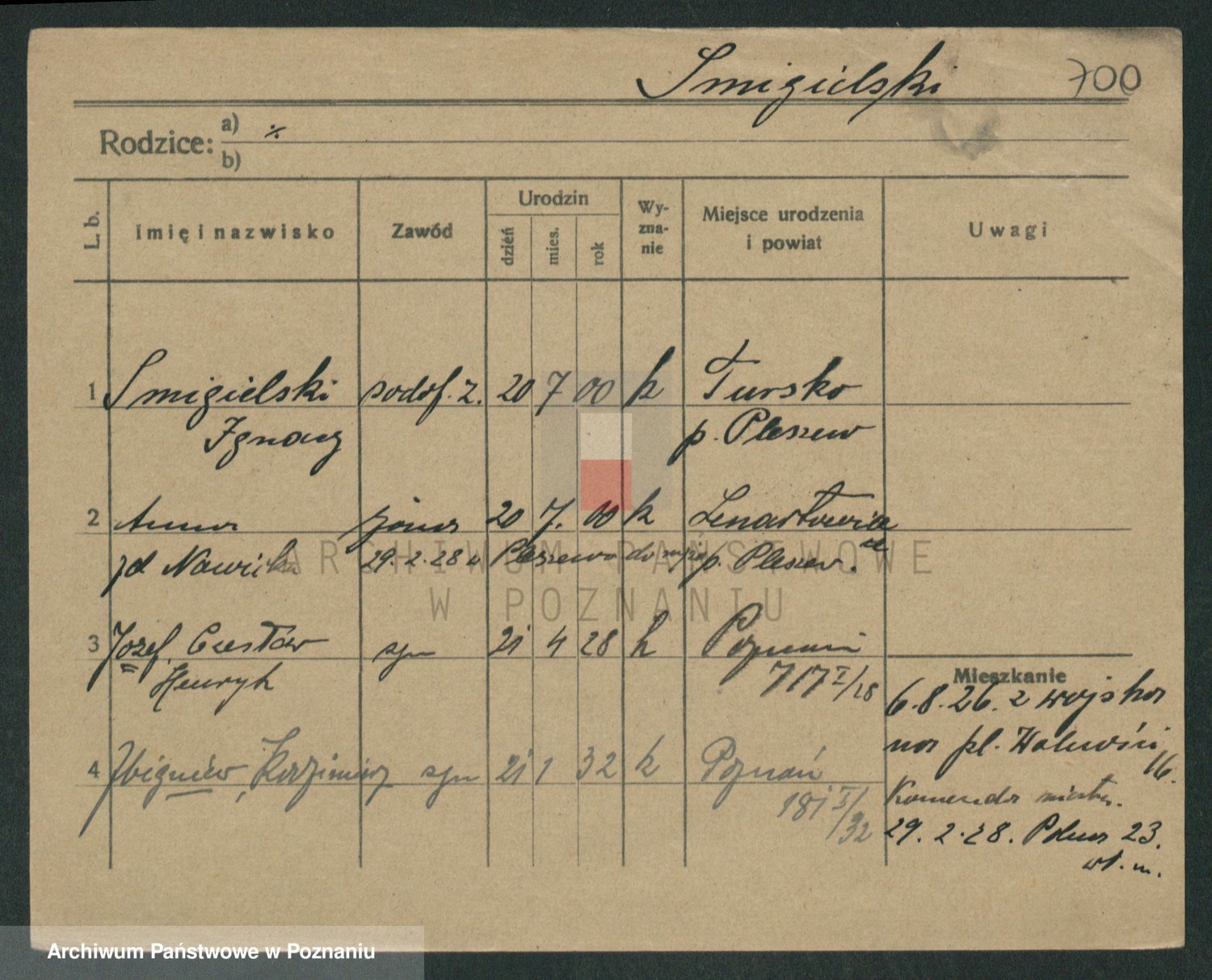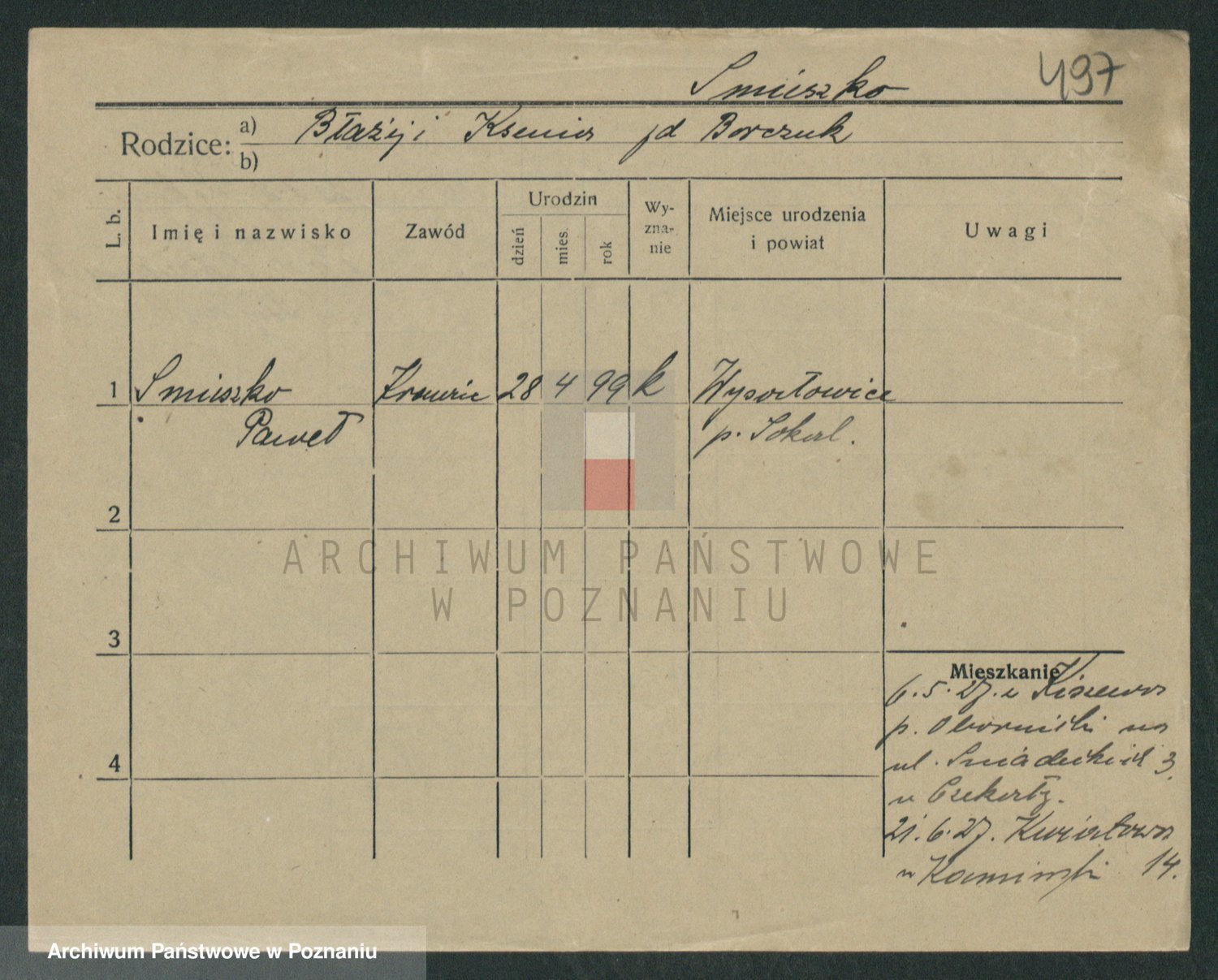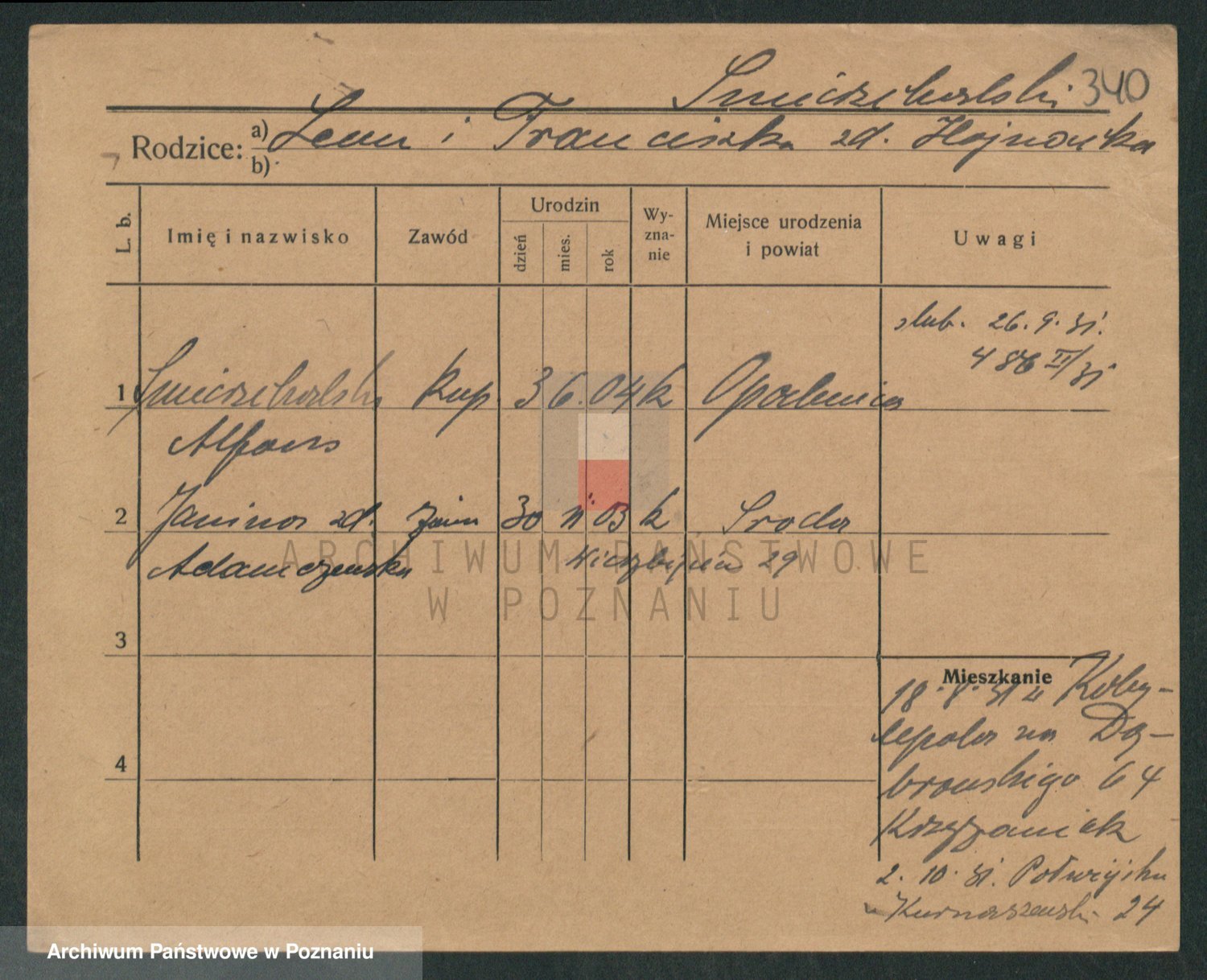 Podgląd karty osobowej dostępny jest po kliknięciu na nazwisko lub ikonkę karty. Można dokonywać powiększenia (ikony na górze) lub przechodzić między kolejnymi skanami (strzałki po bokach).