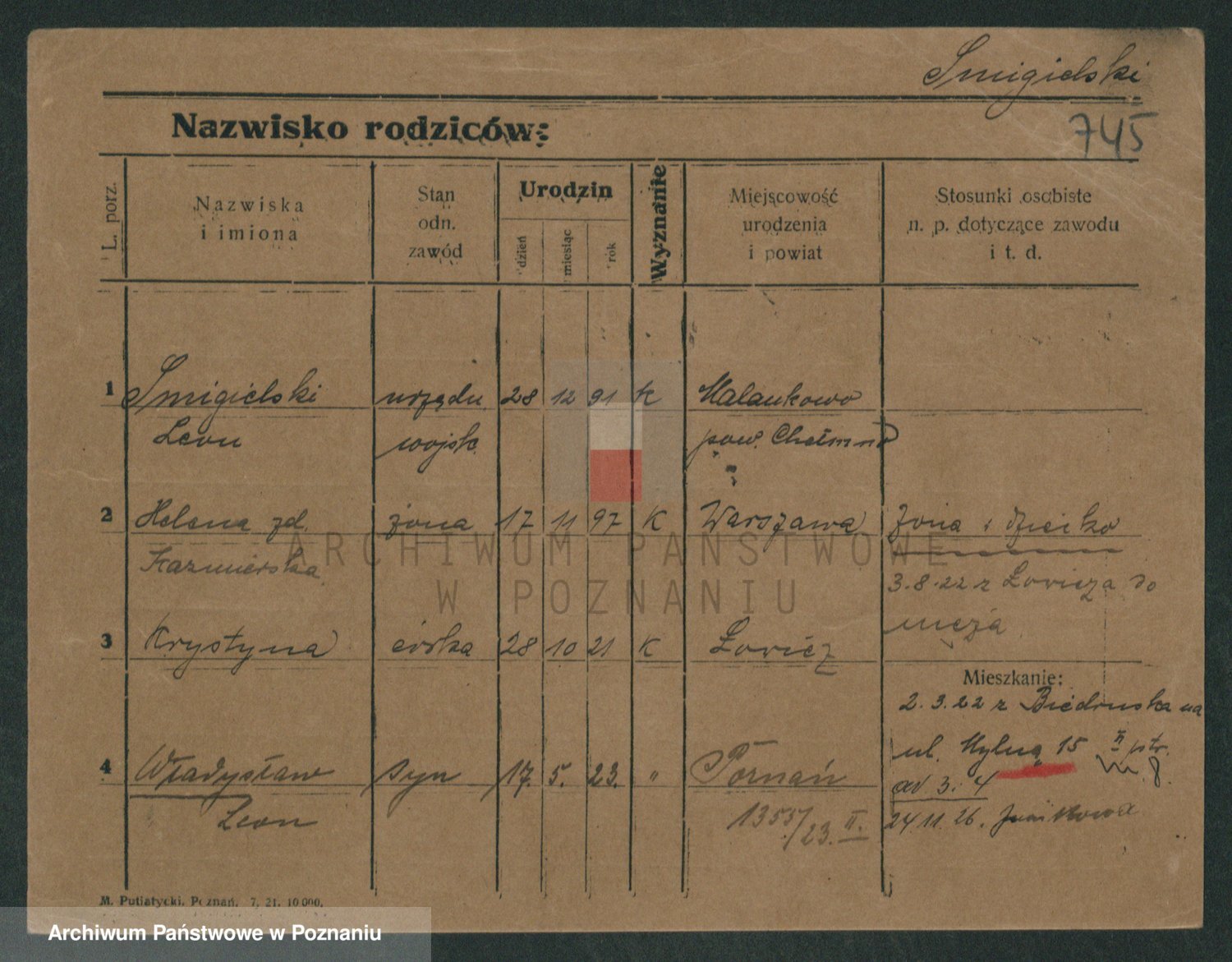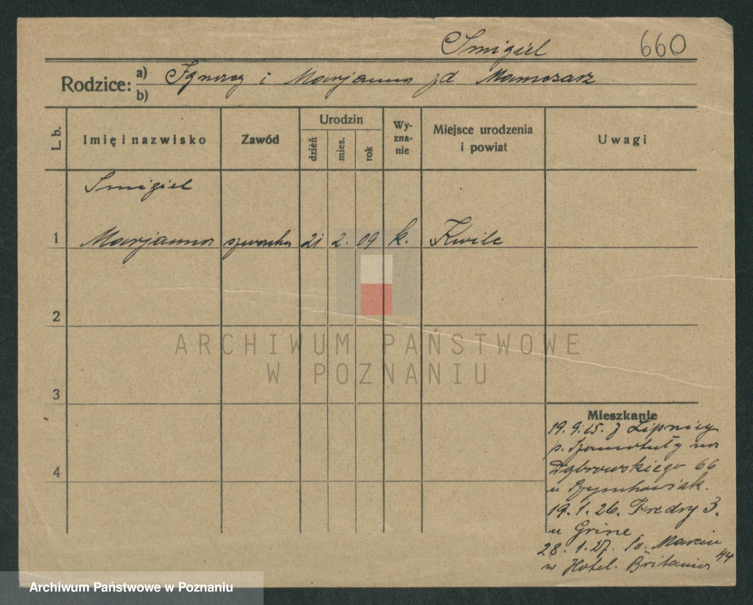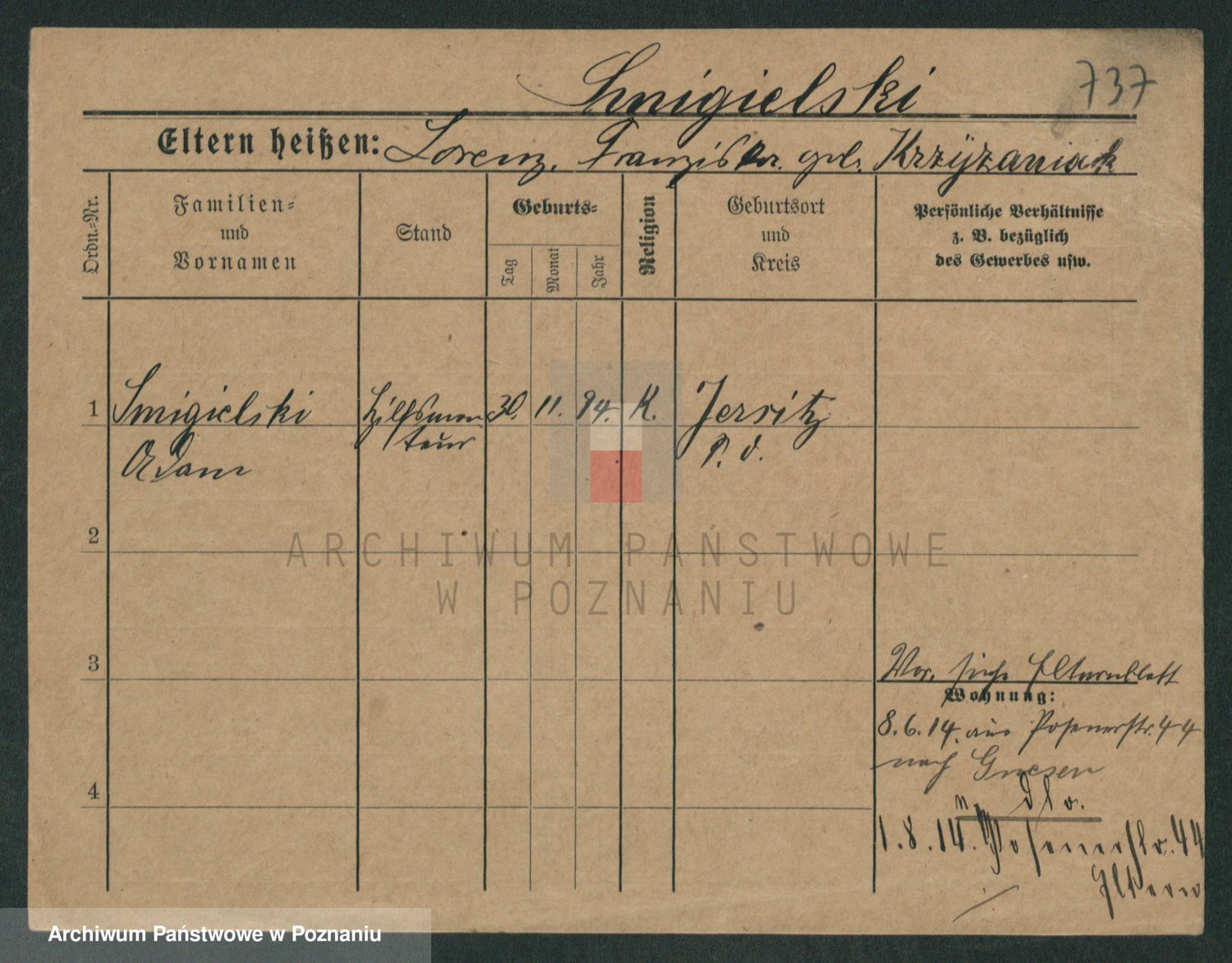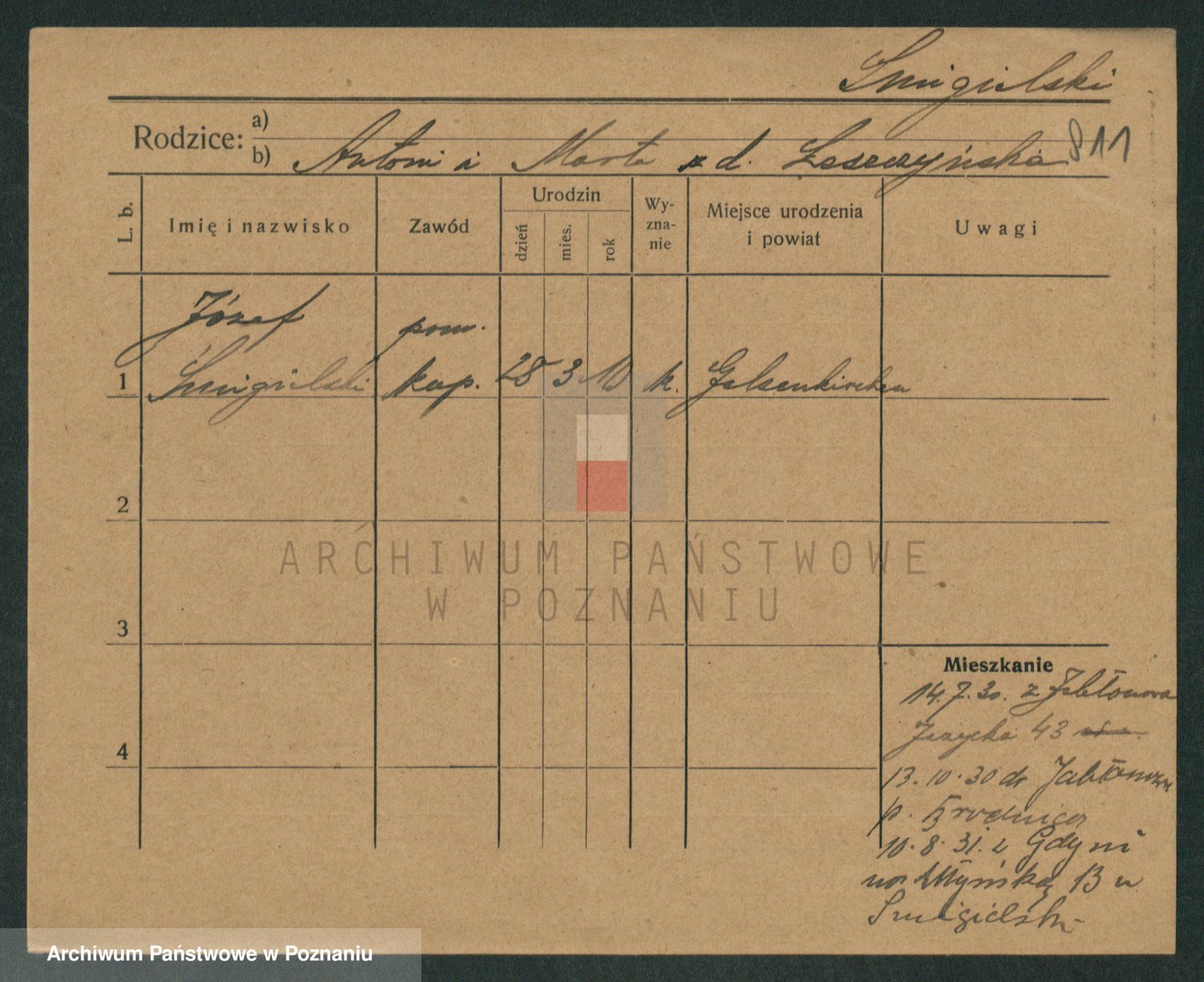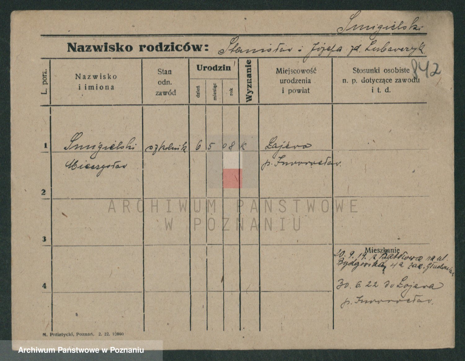 Podgląd karty osobowej dostępny jest po kliknięciu na nazwisko lub ikonkę karty. Można dokonywać powiększenia (ikony na górze) lub przechodzić między kolejnymi skanami (strzałki po bokach).