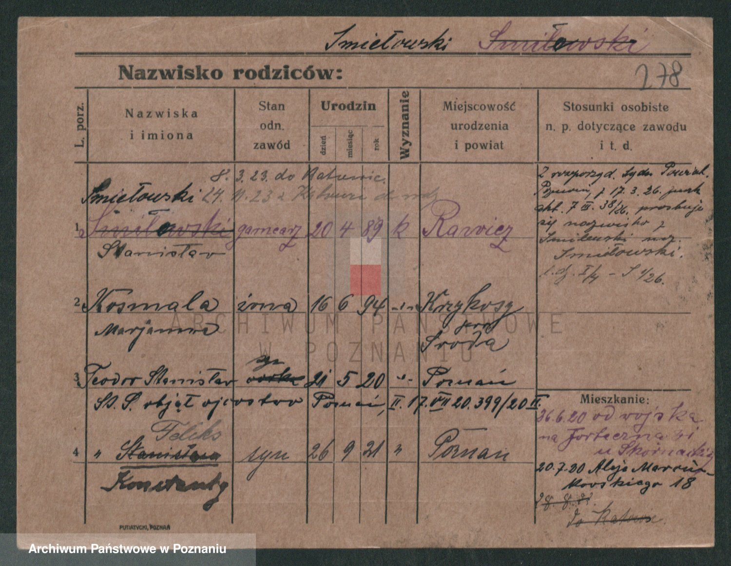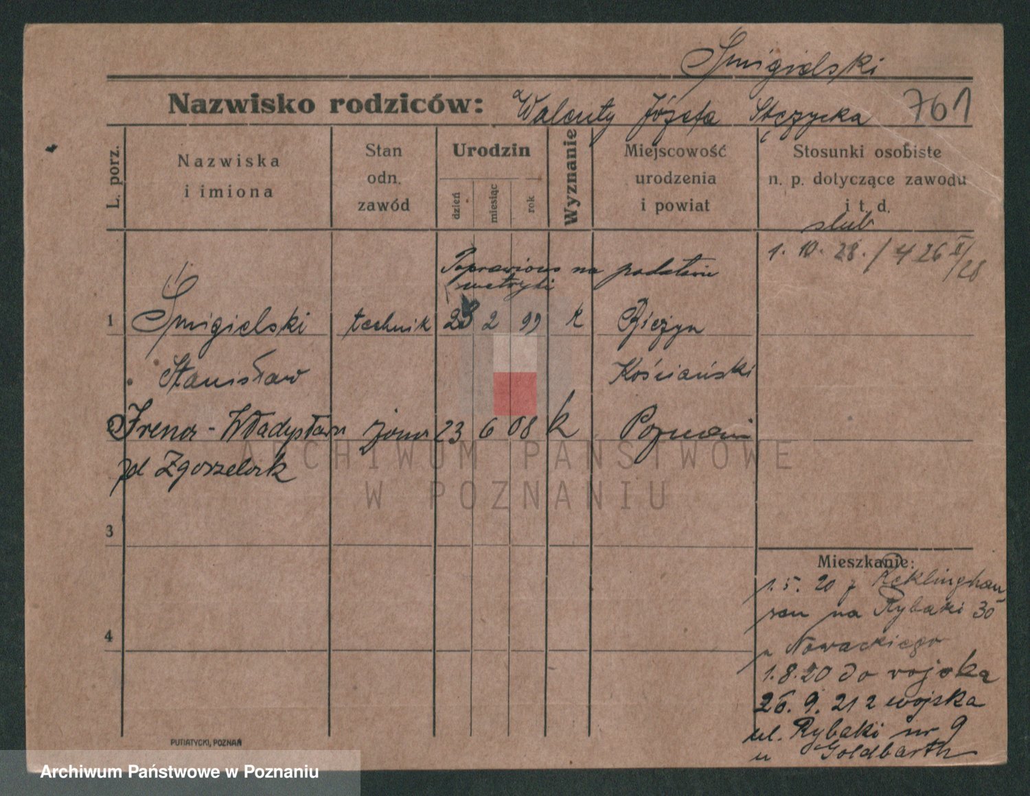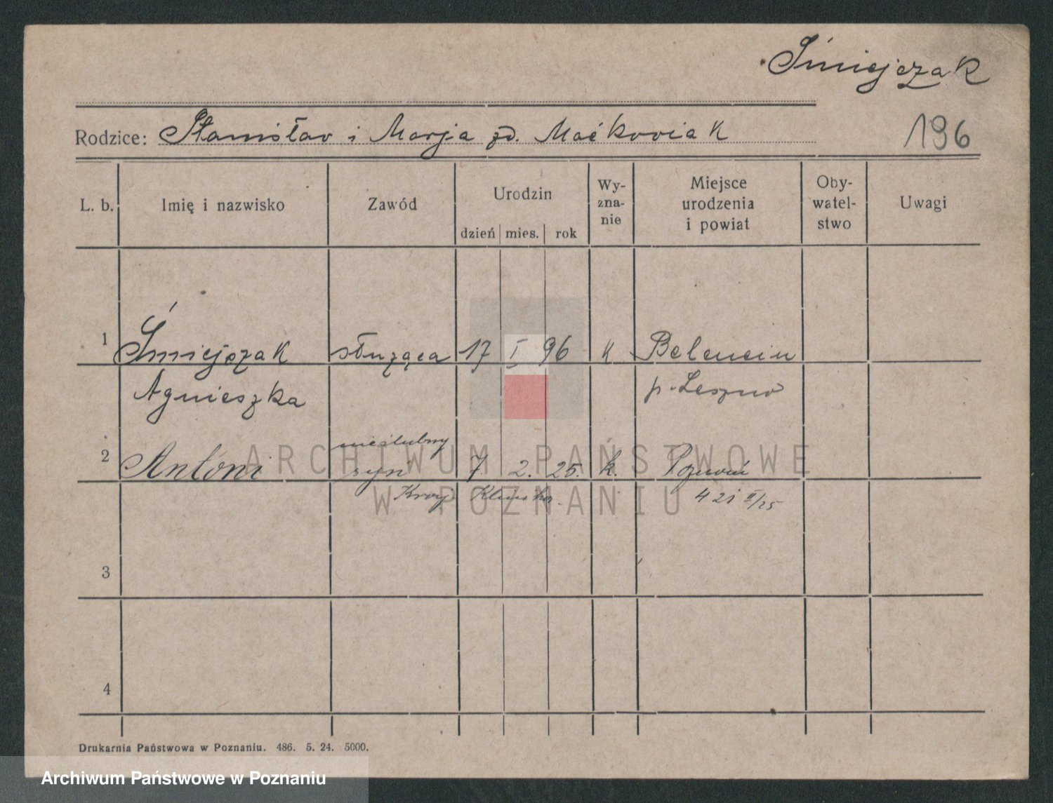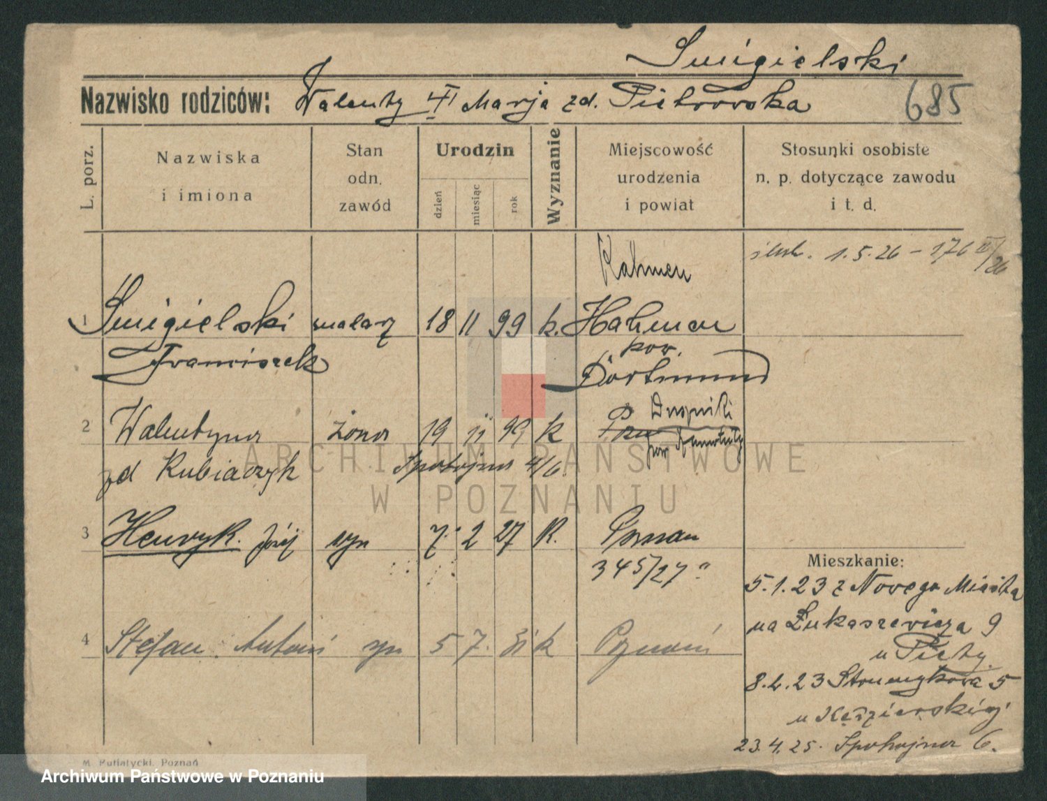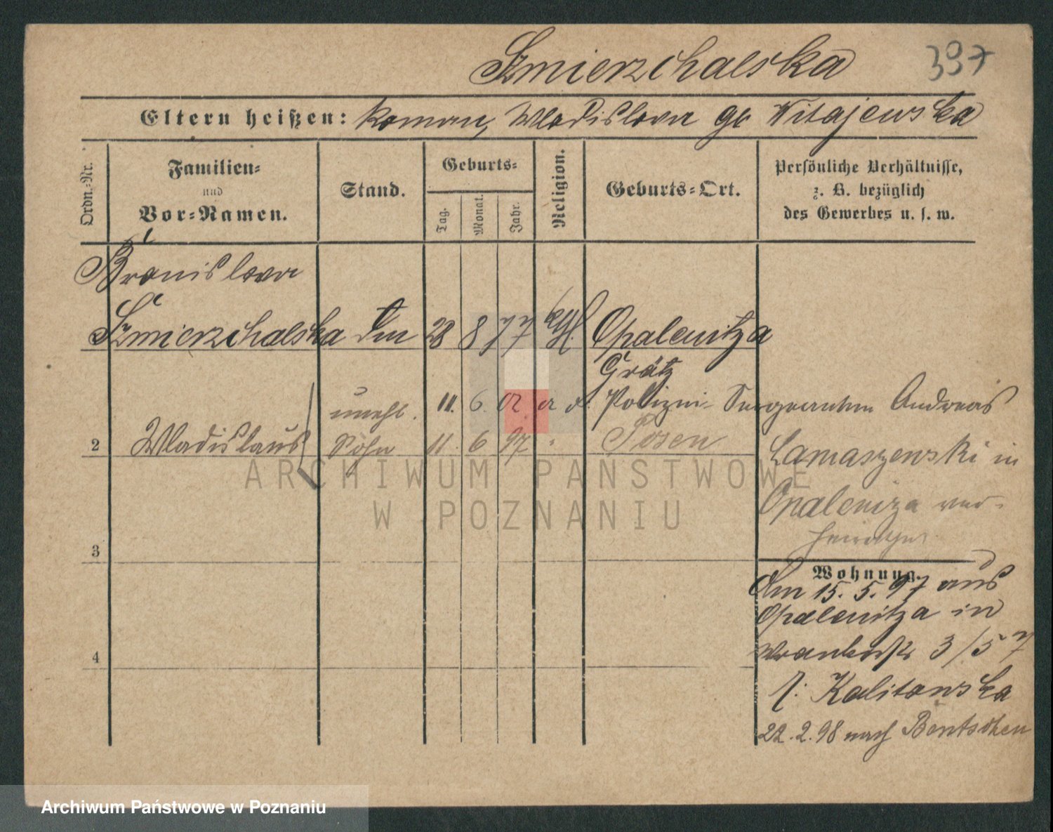 Podgląd karty osobowej dostępny jest po kliknięciu na nazwisko lub ikonkę karty. Można dokonywać powiększenia (ikony na górze) lub przechodzić między kolejnymi skanami (strzałki po bokach).