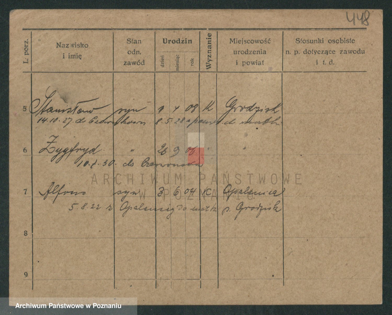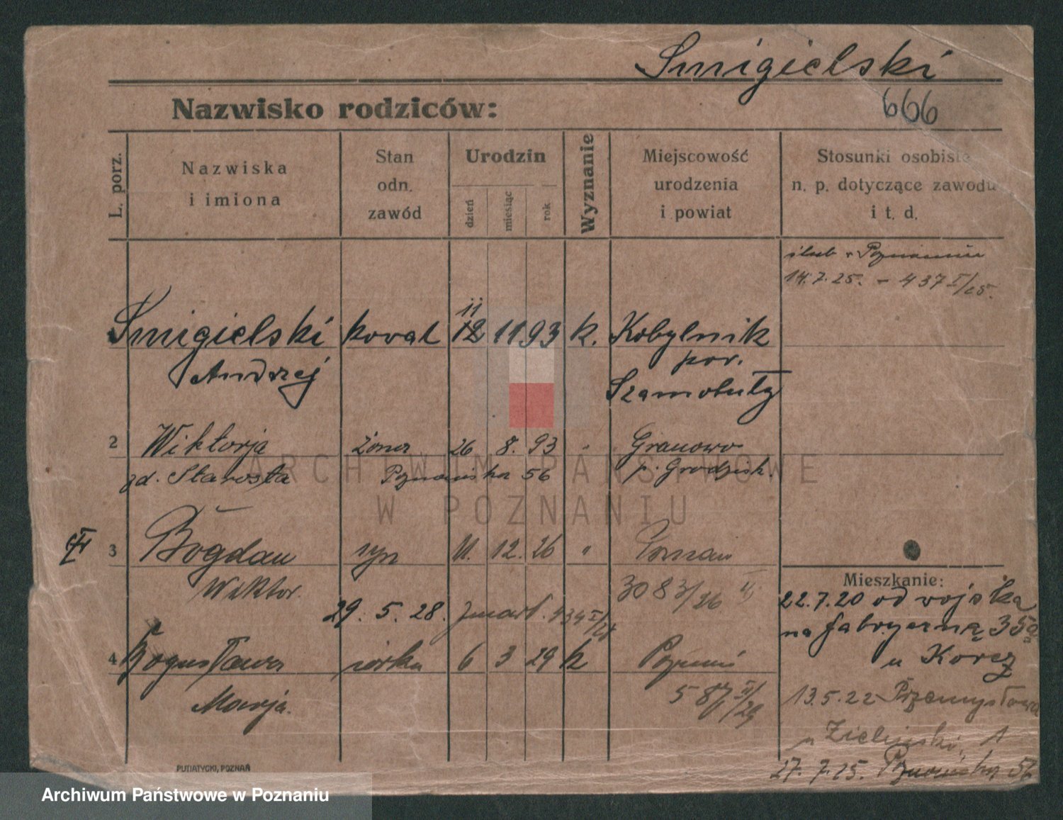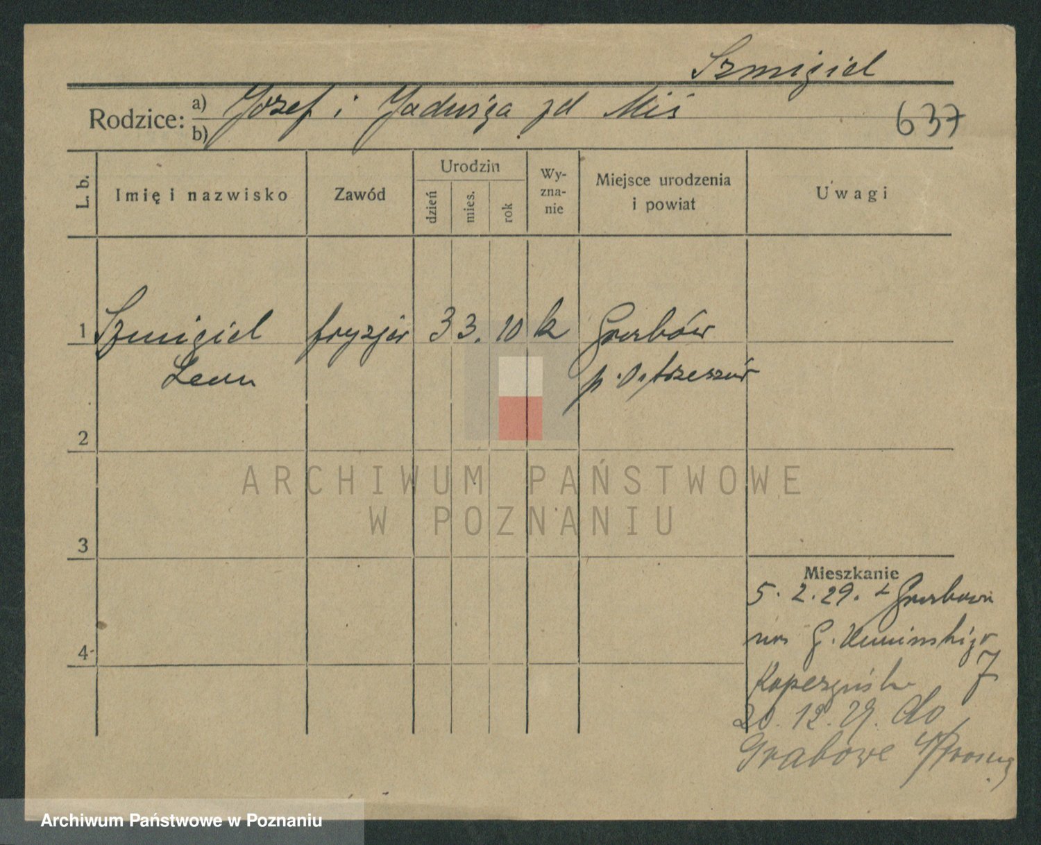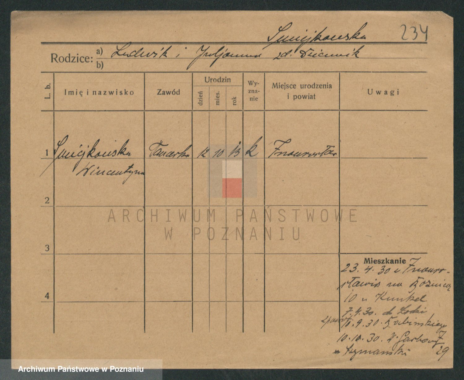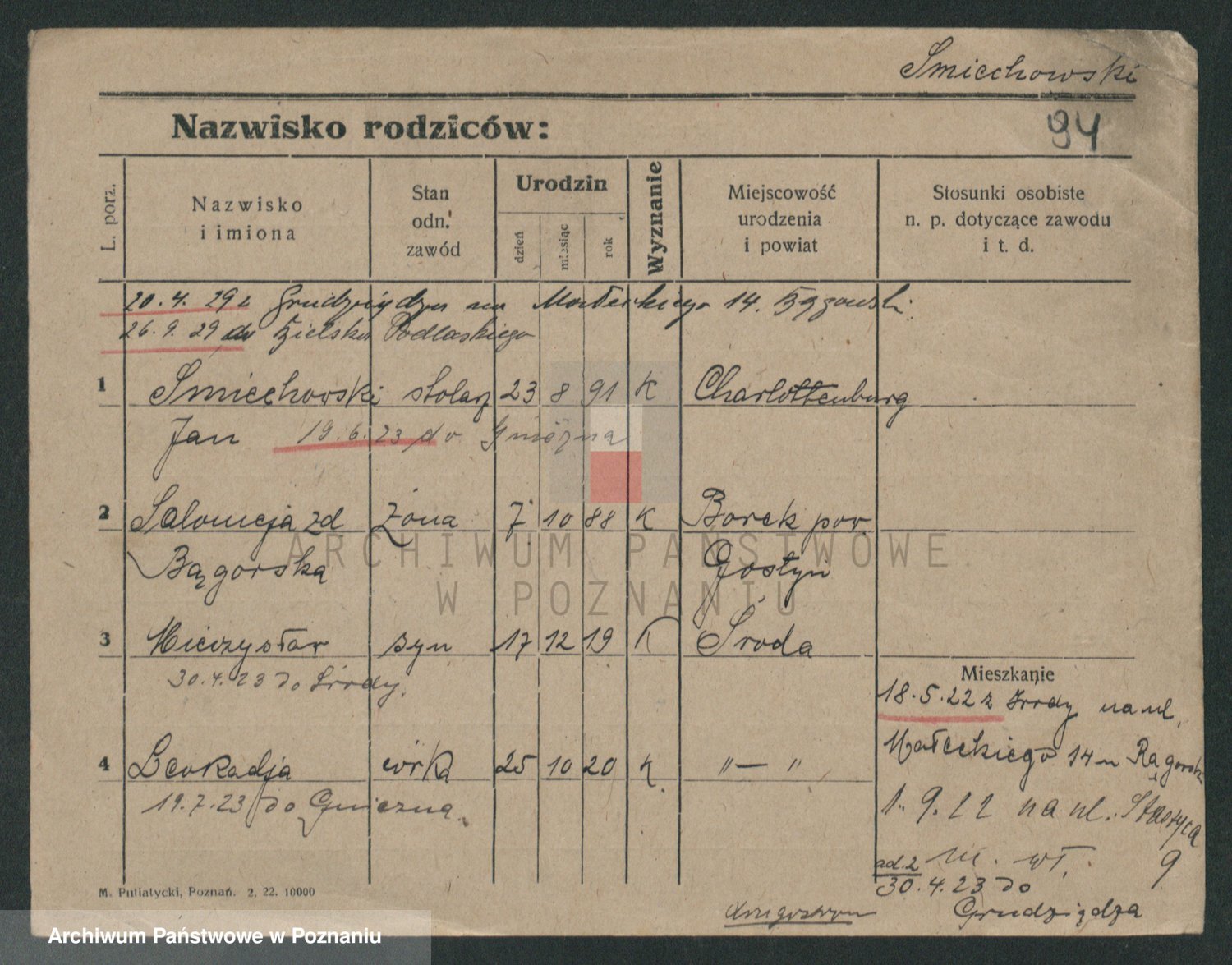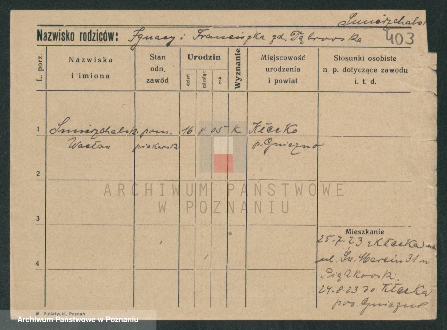 Podgląd karty osobowej dostępny jest po kliknięciu na nazwisko lub ikonkę karty. Można dokonywać powiększenia (ikony na górze) lub przechodzić między kolejnymi skanami (strzałki po bokach).