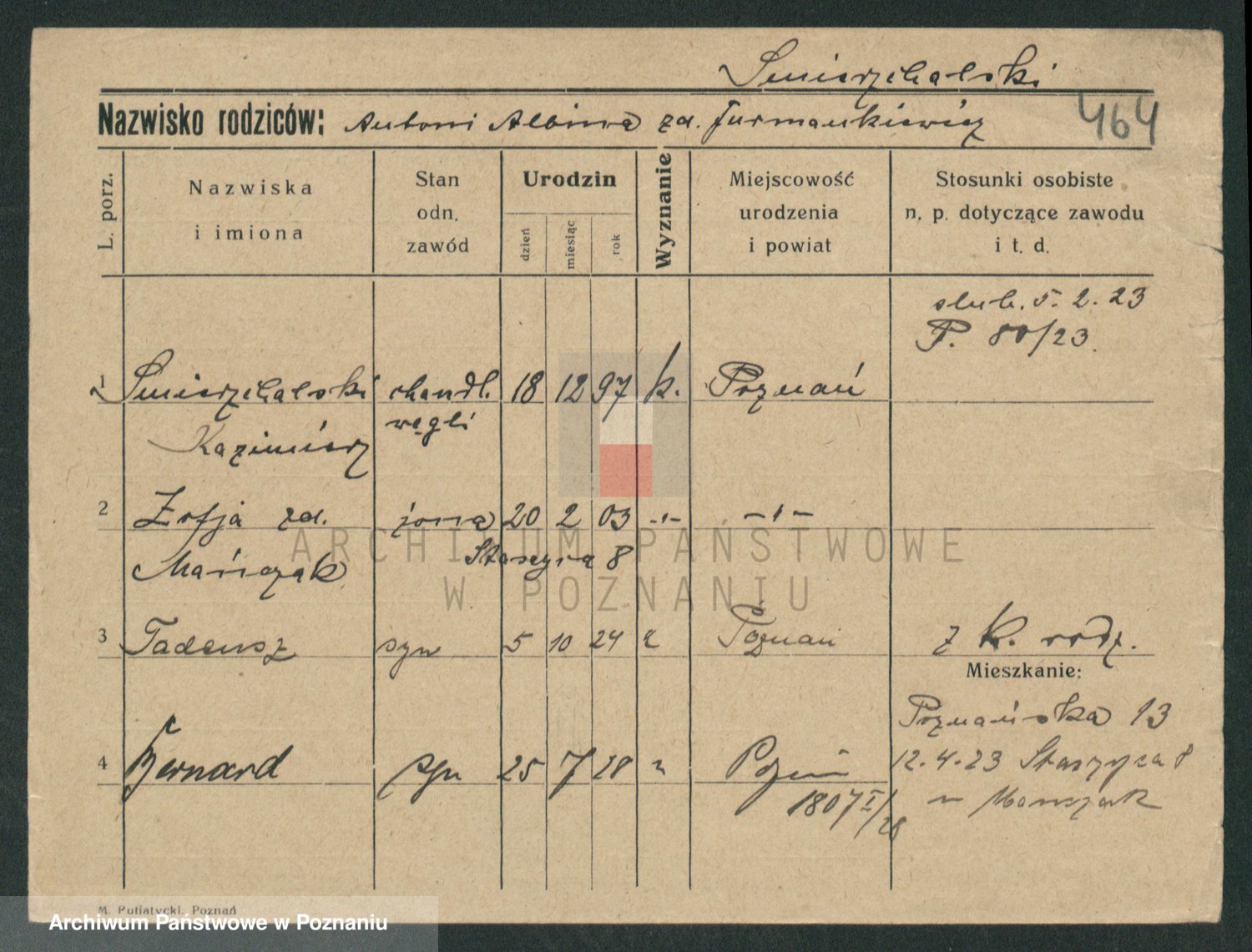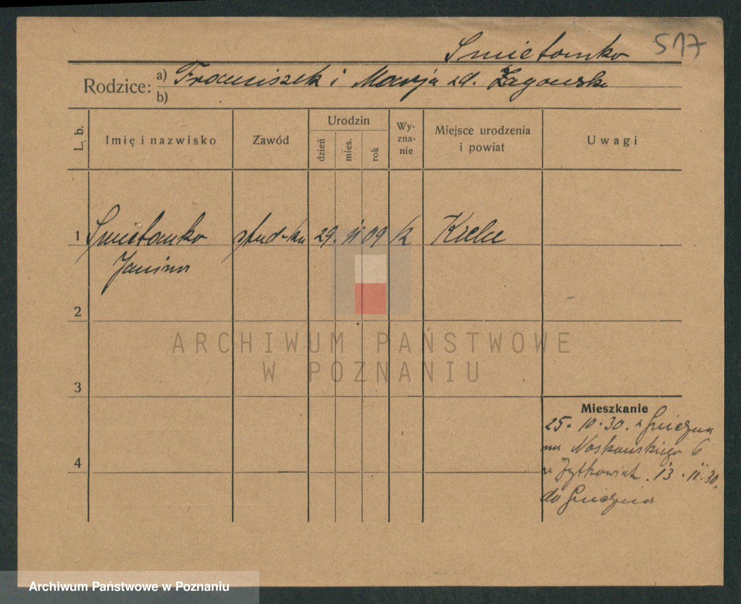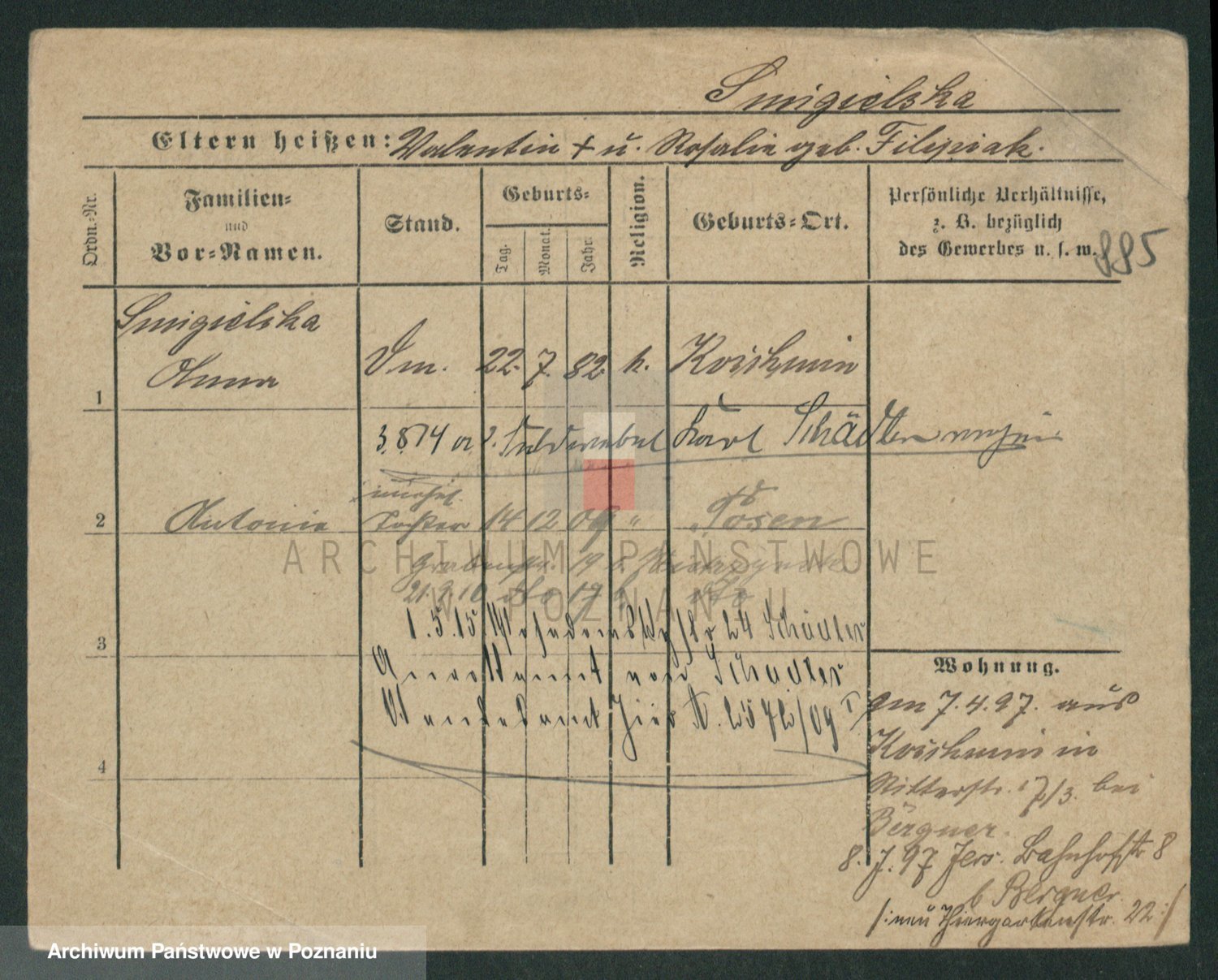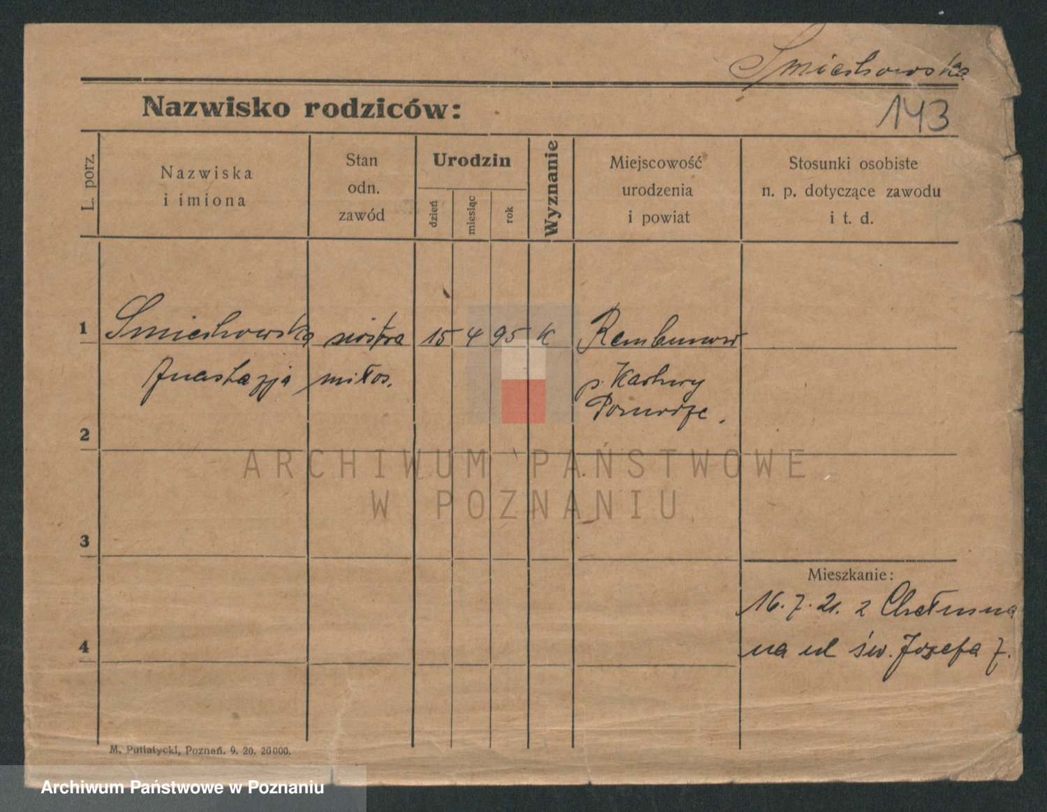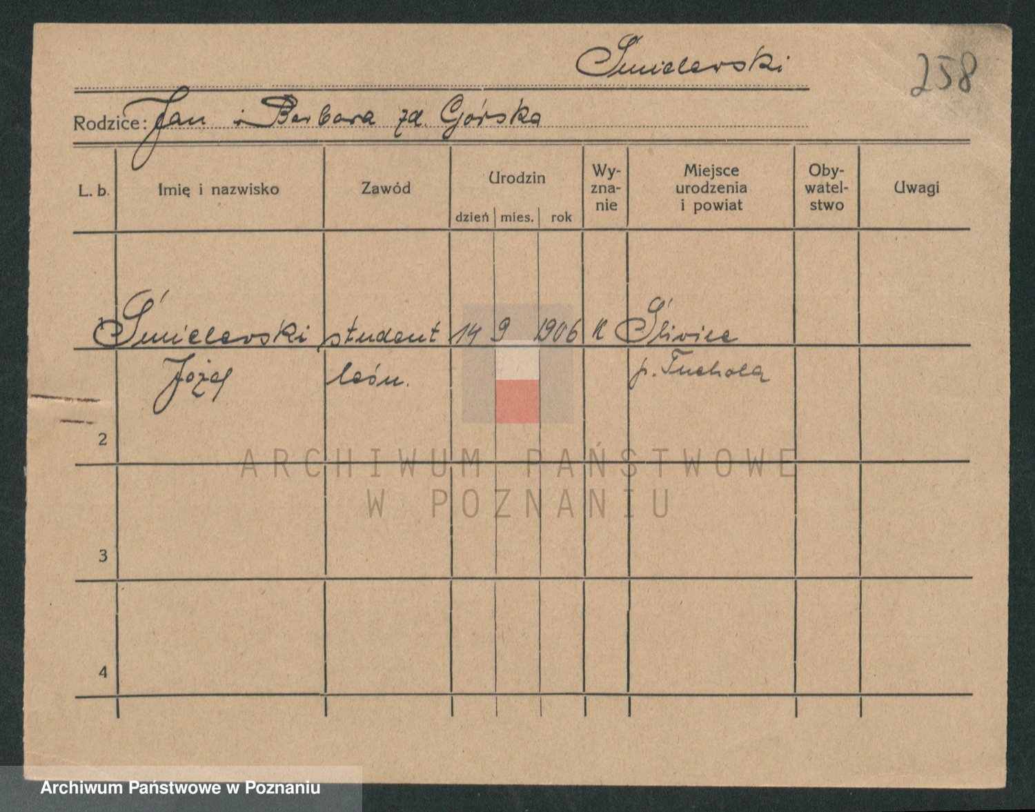 Podgląd karty osobowej dostępny jest po kliknięciu na nazwisko lub ikonkę karty. Można dokonywać powiększenia (ikony na górze) lub przechodzić między kolejnymi skanami (strzałki po bokach).