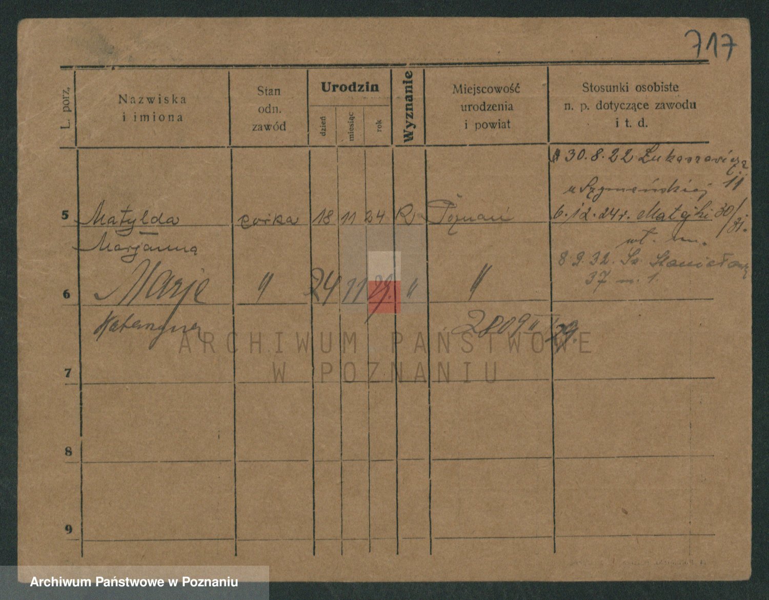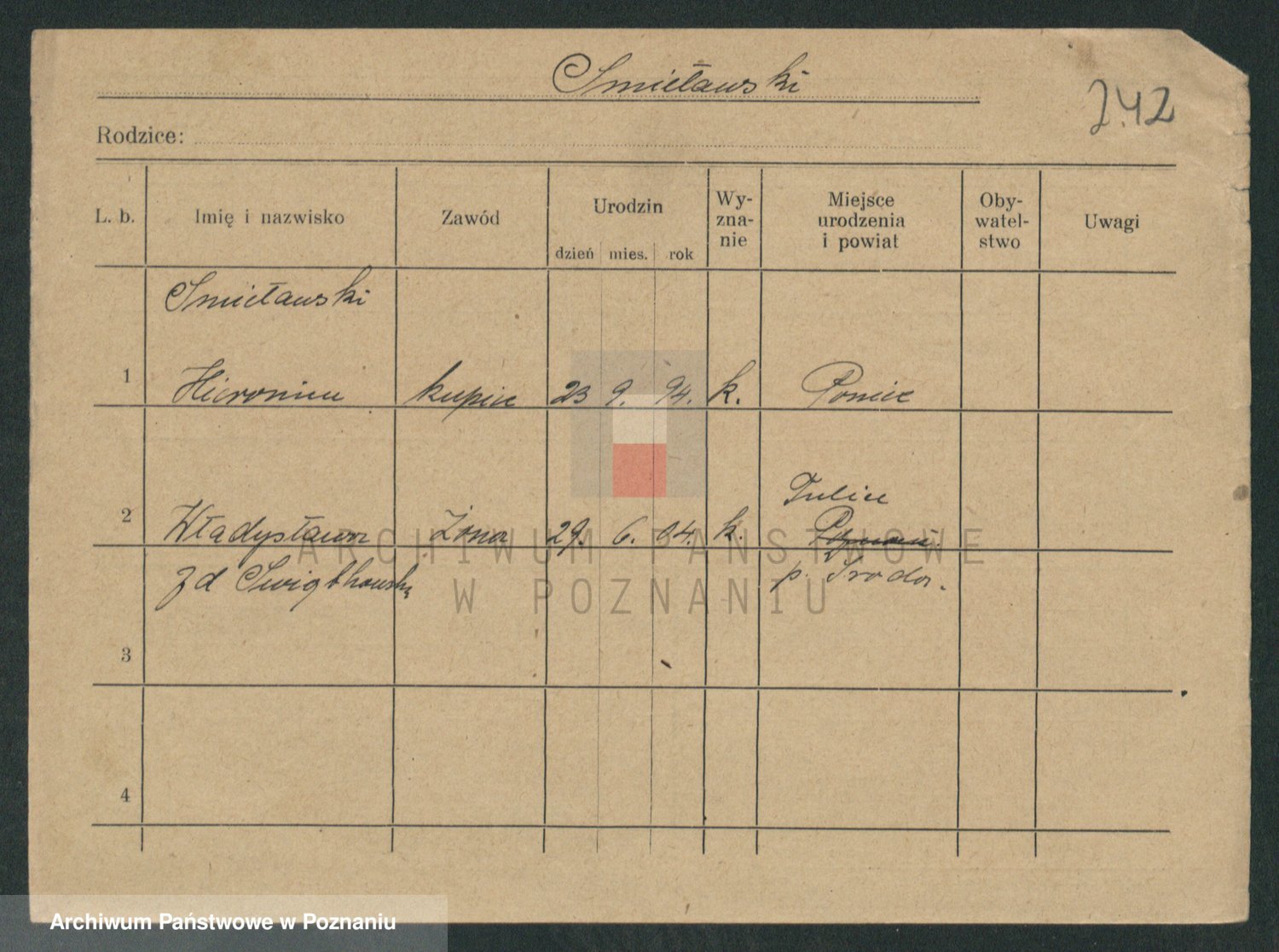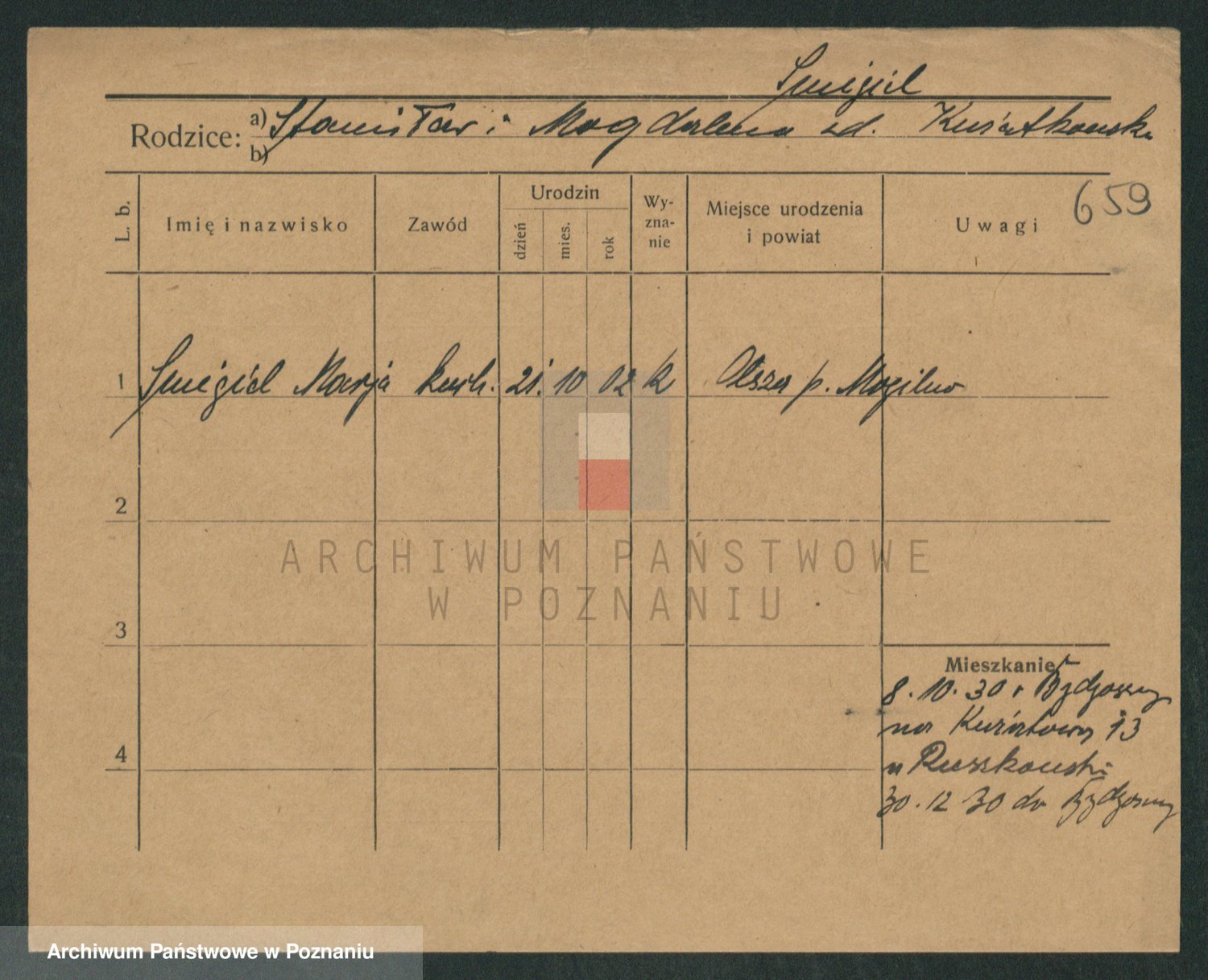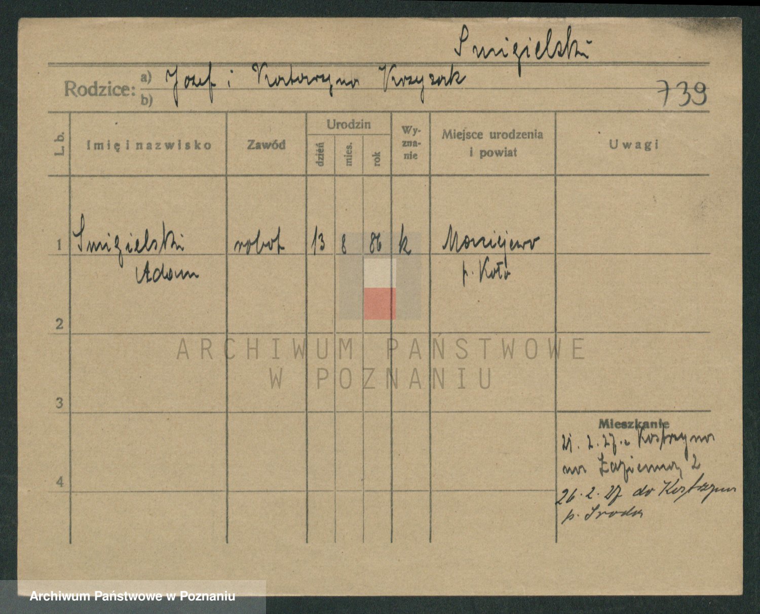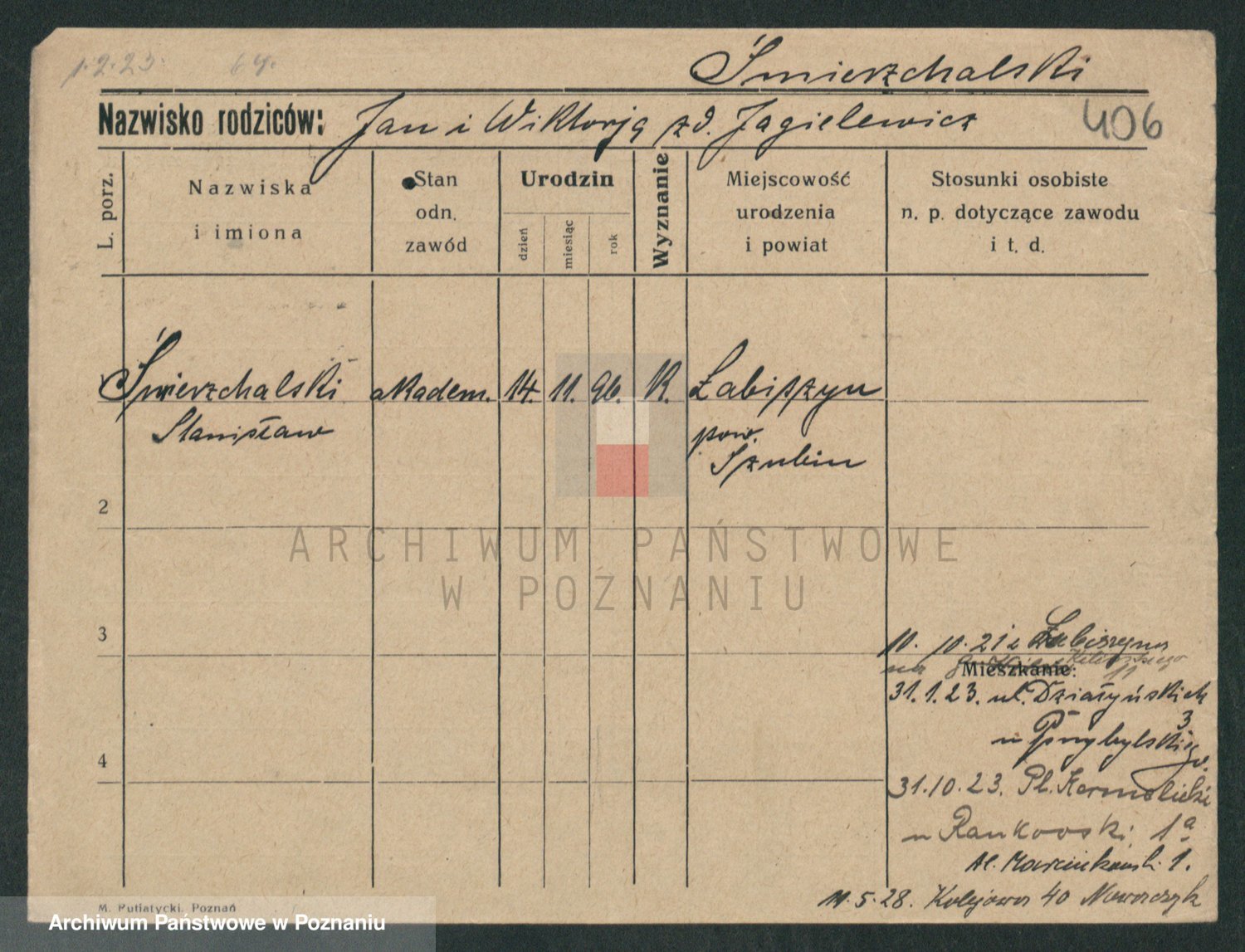 Podgląd karty osobowej dostępny jest po kliknięciu na nazwisko lub ikonkę karty. Można dokonywać powiększenia (ikony na górze) lub przechodzić między kolejnymi skanami (strzałki po bokach).