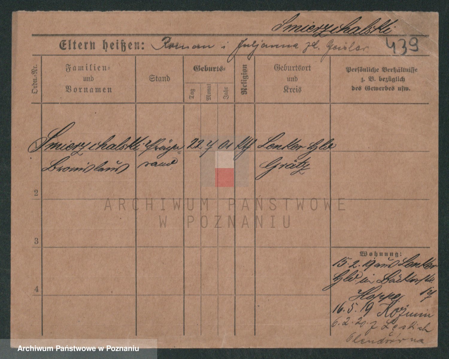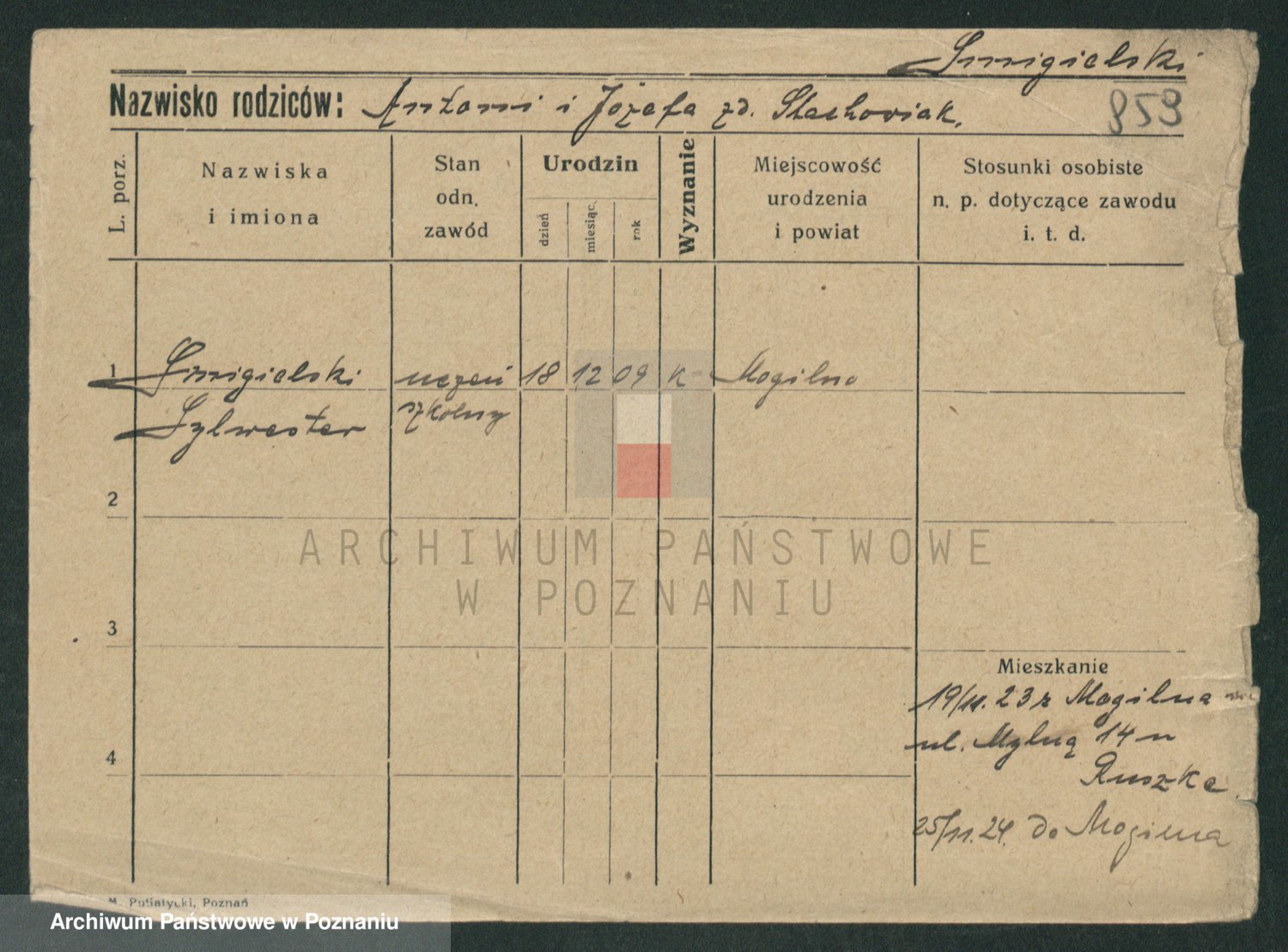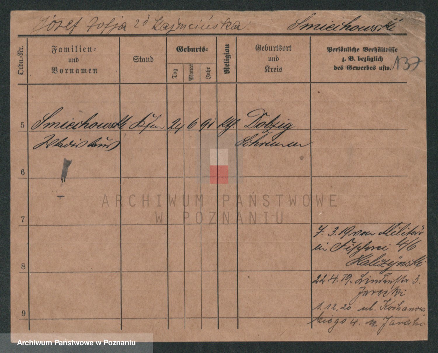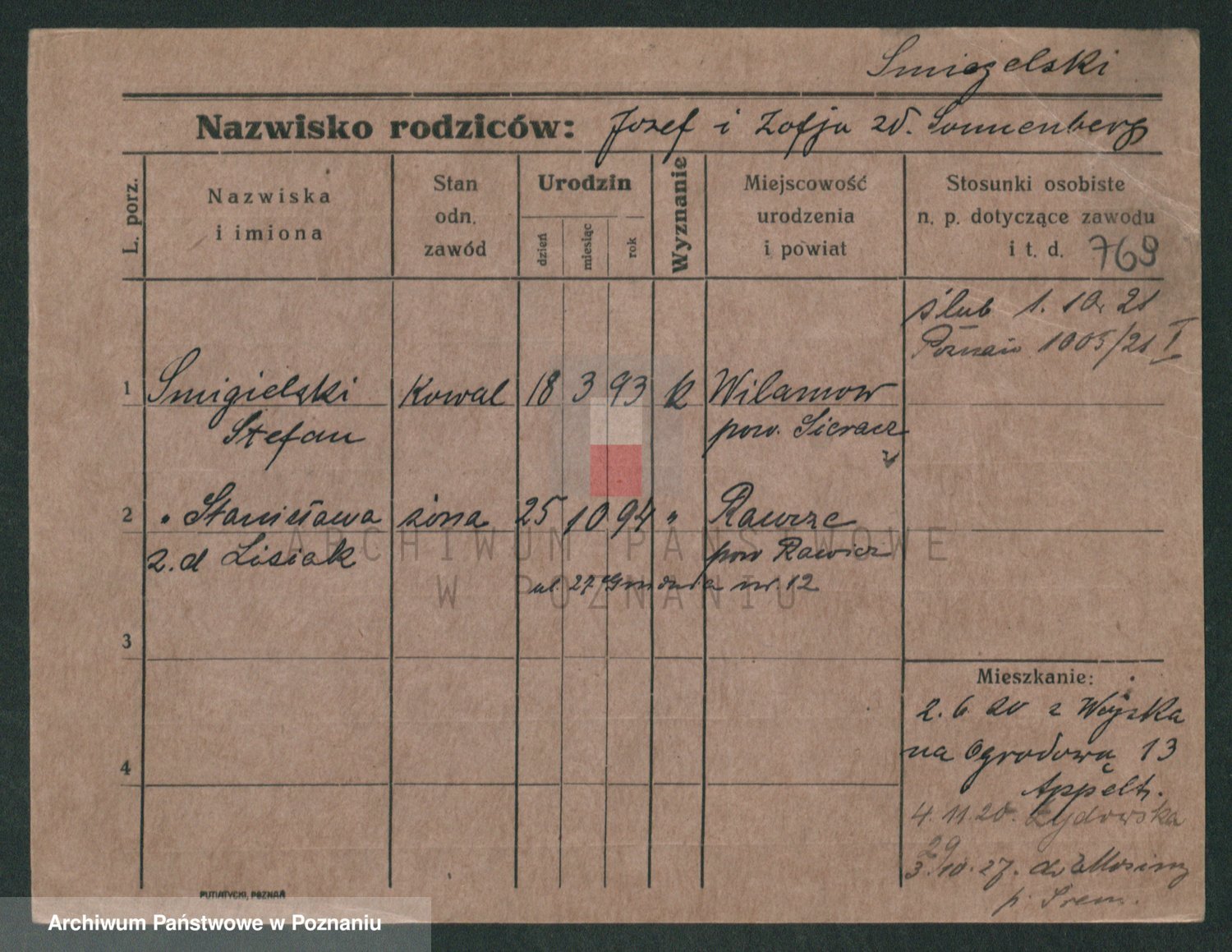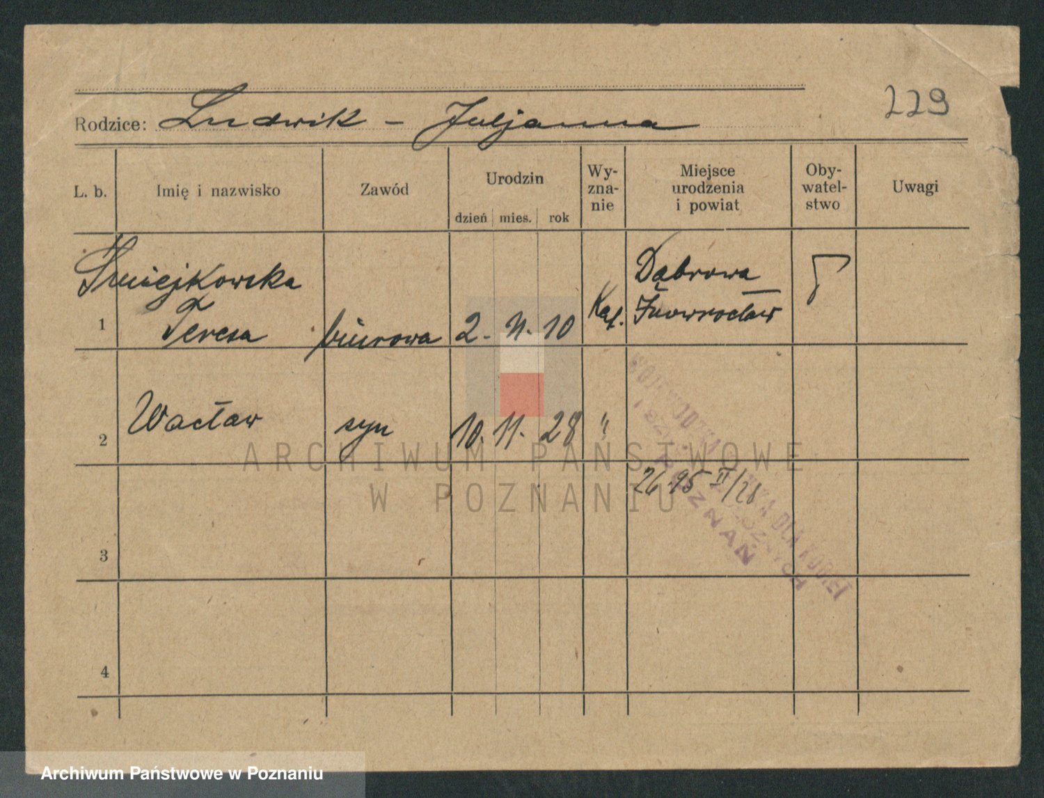 Podgląd karty osobowej dostępny jest po kliknięciu na nazwisko lub ikonkę karty. Można dokonywać powiększenia (ikony na górze) lub przechodzić między kolejnymi skanami (strzałki po bokach).