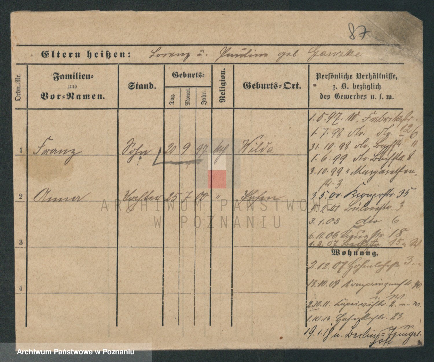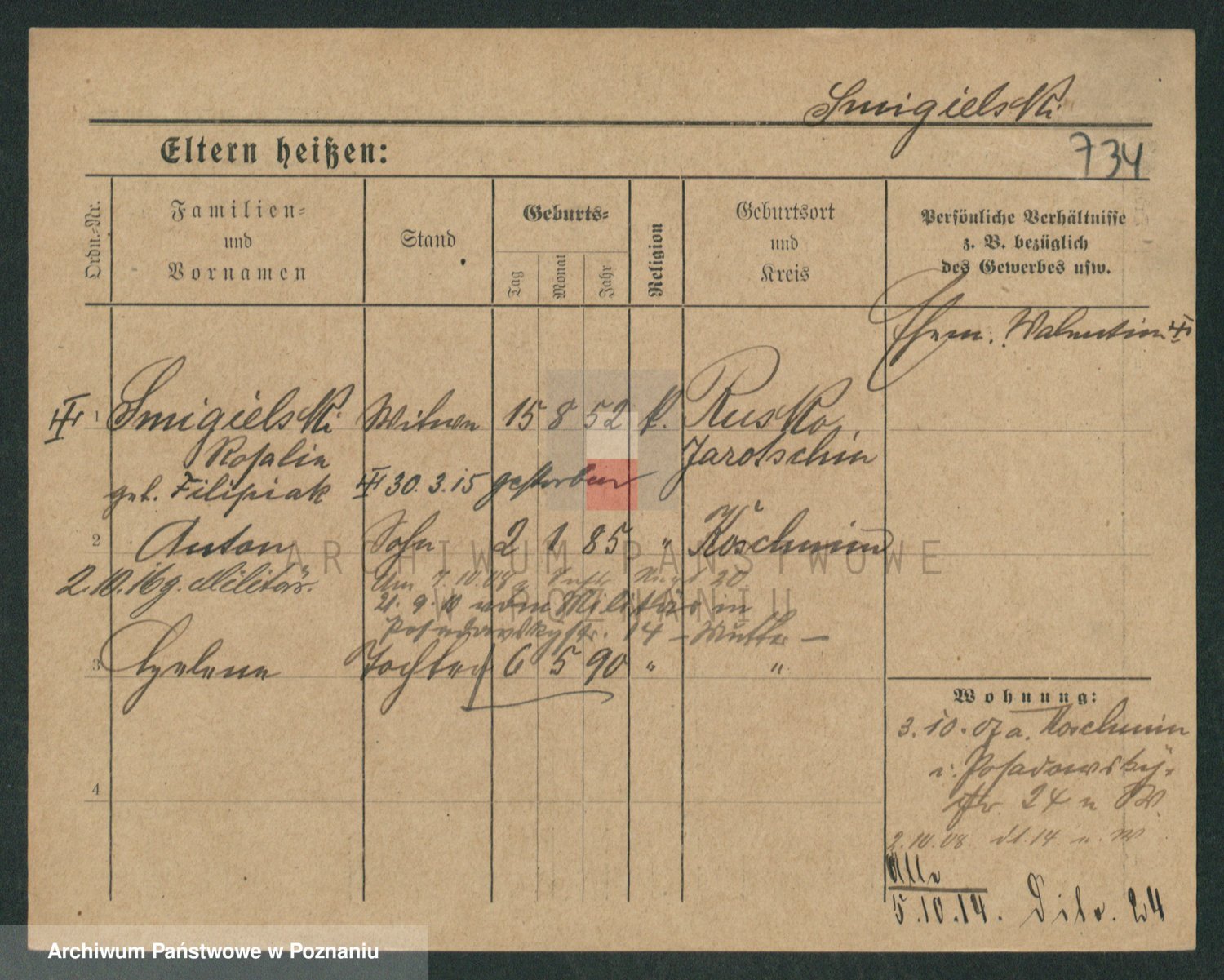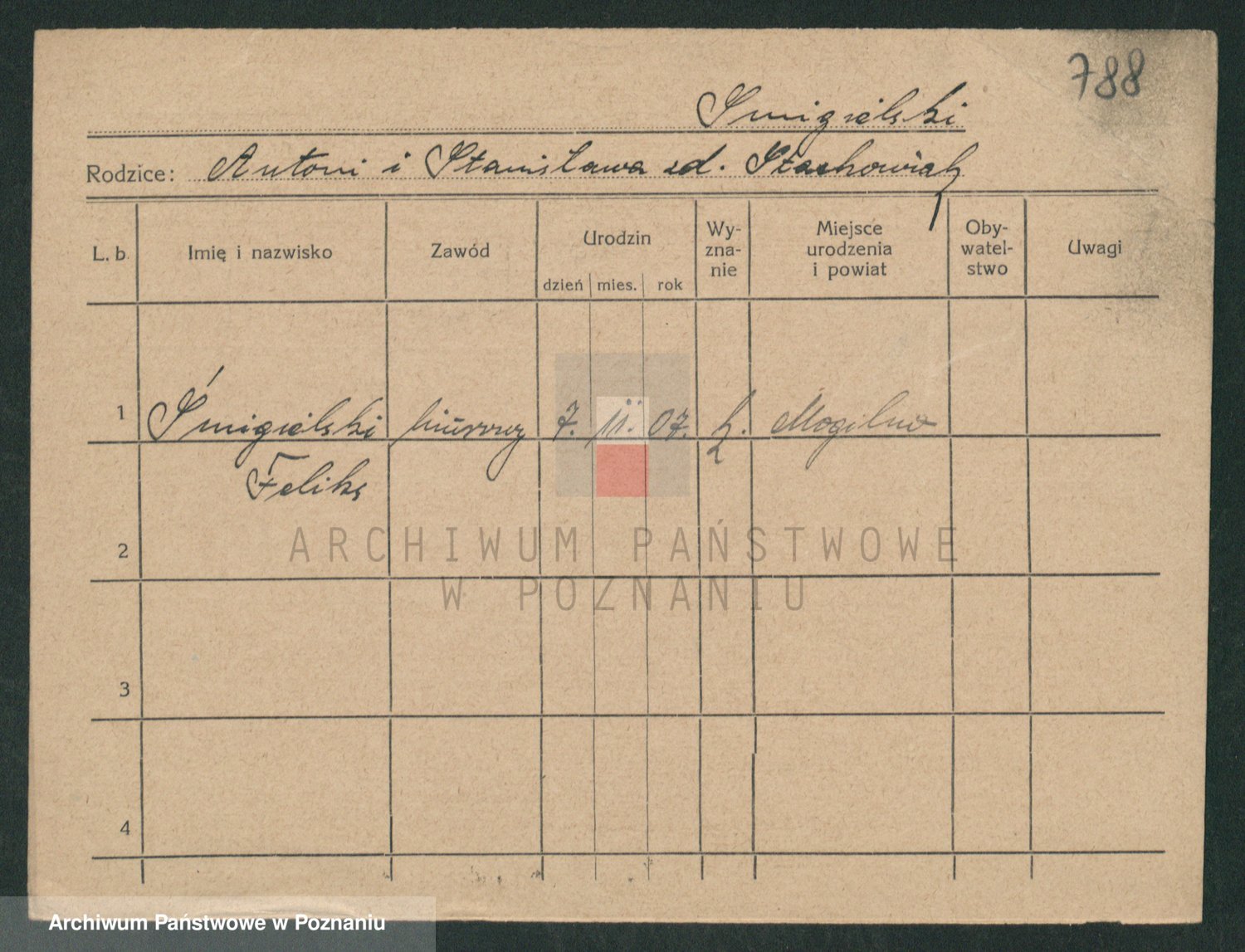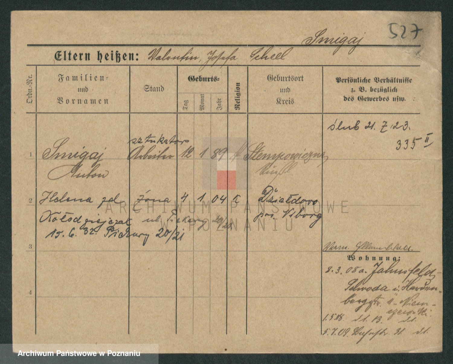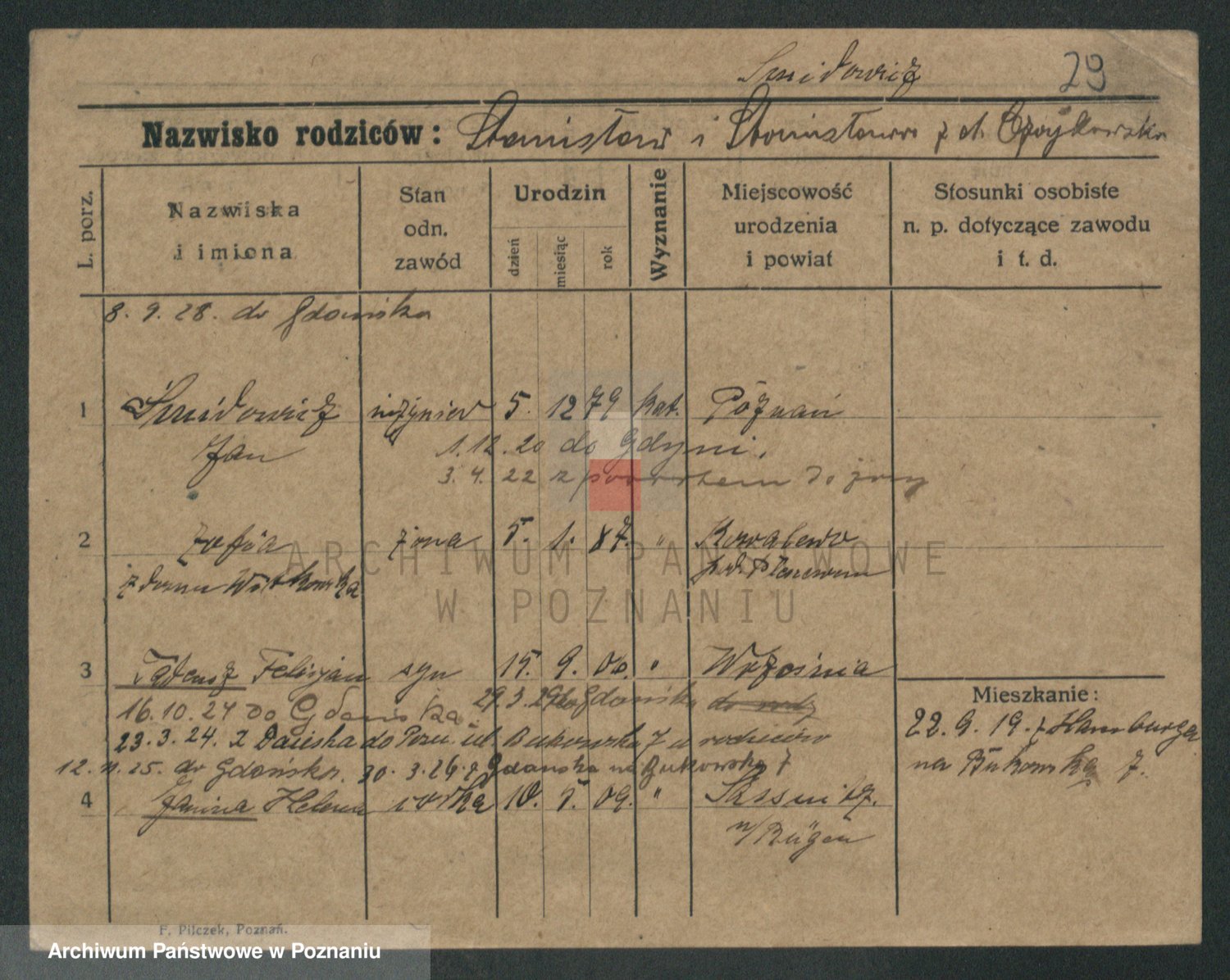 Podgląd karty osobowej dostępny jest po kliknięciu na nazwisko lub ikonkę karty. Można dokonywać powiększenia (ikony na górze) lub przechodzić między kolejnymi skanami (strzałki po bokach).