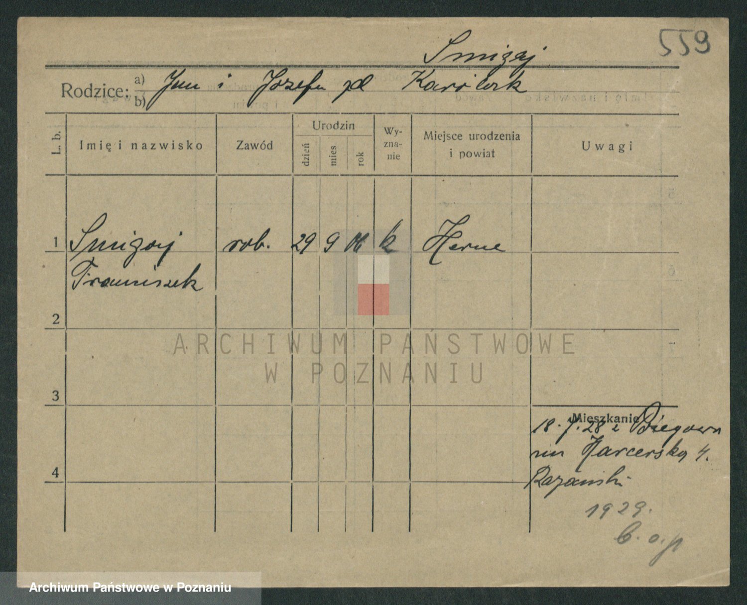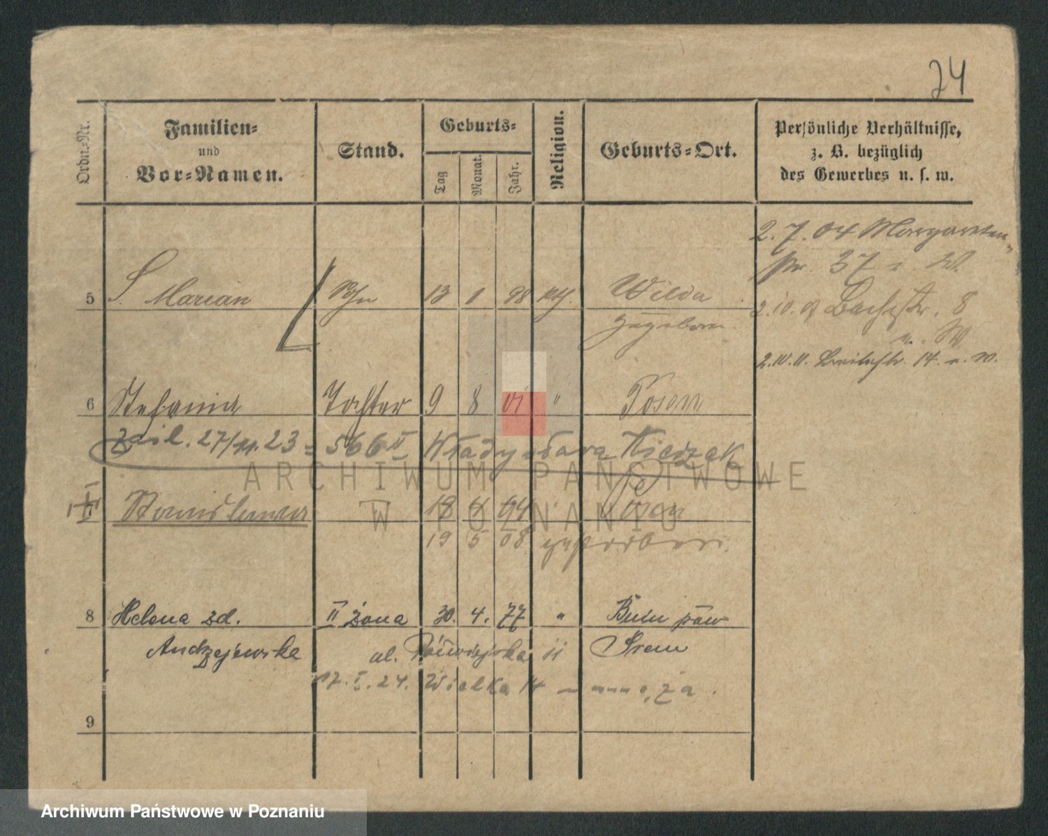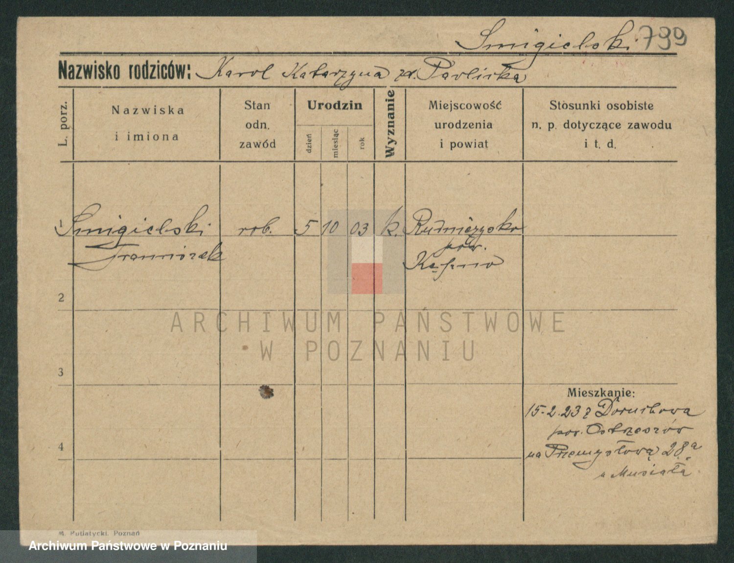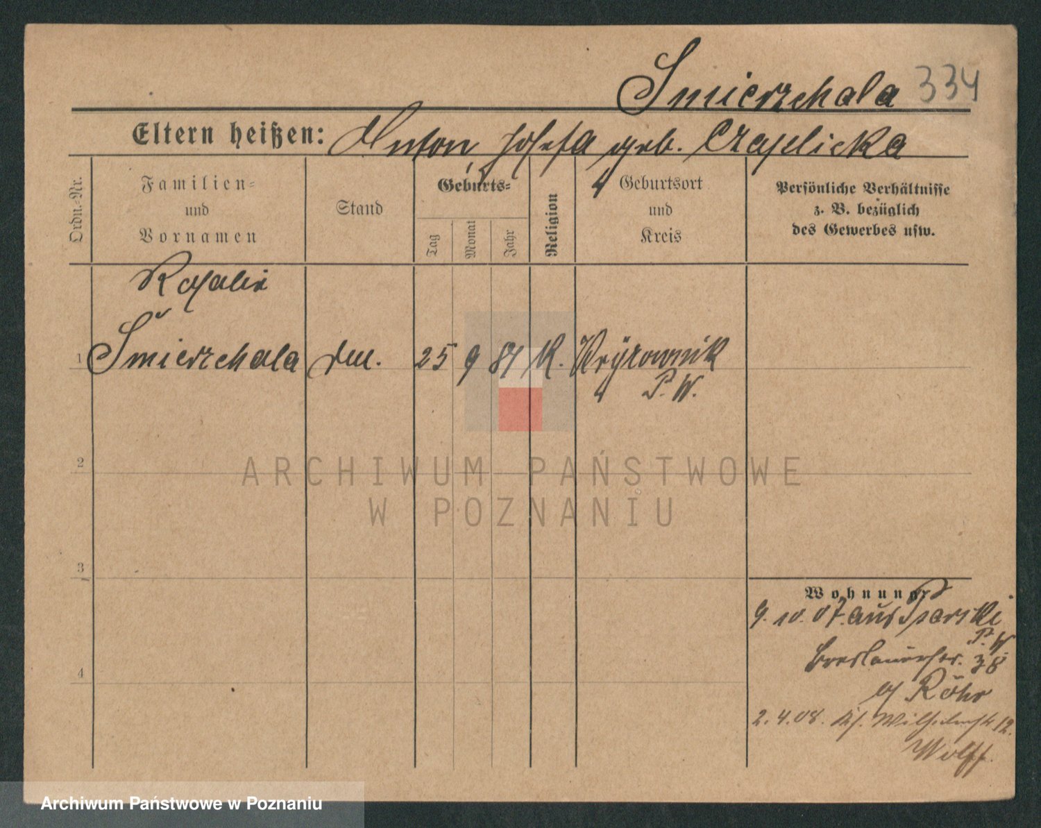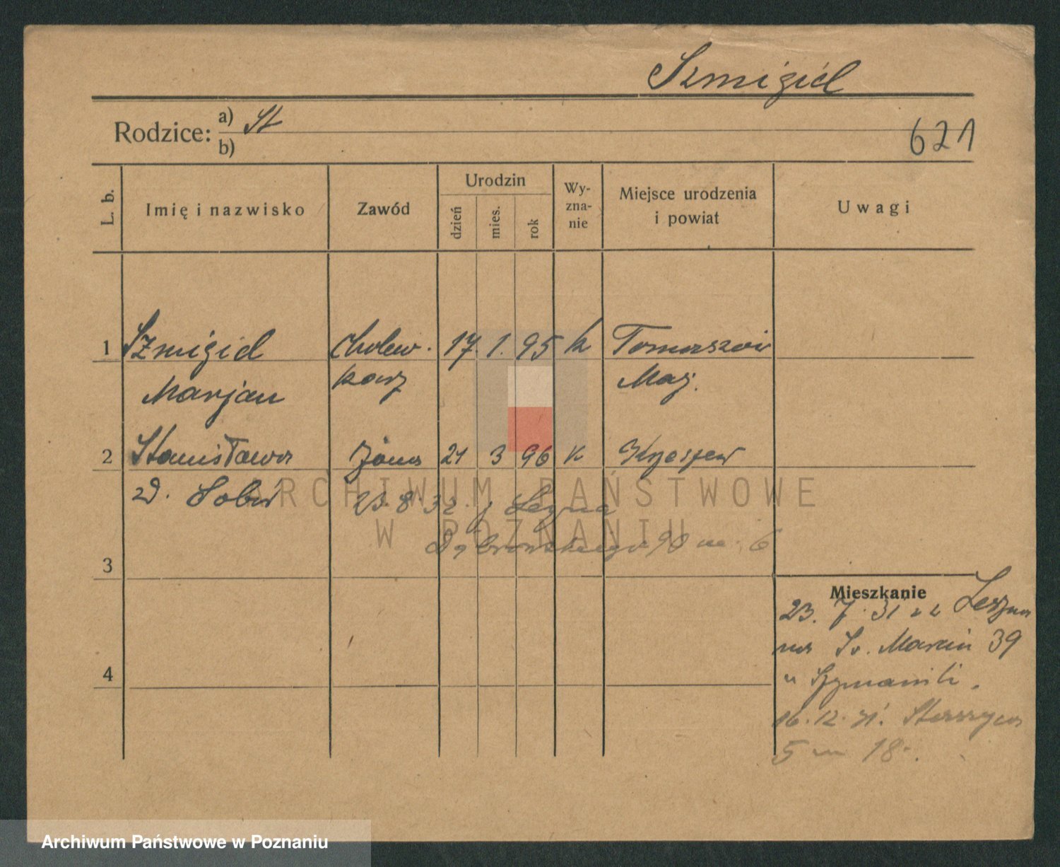 Podgląd karty osobowej dostępny jest po kliknięciu na nazwisko lub ikonkę karty. Można dokonywać powiększenia (ikony na górze) lub przechodzić między kolejnymi skanami (strzałki po bokach).