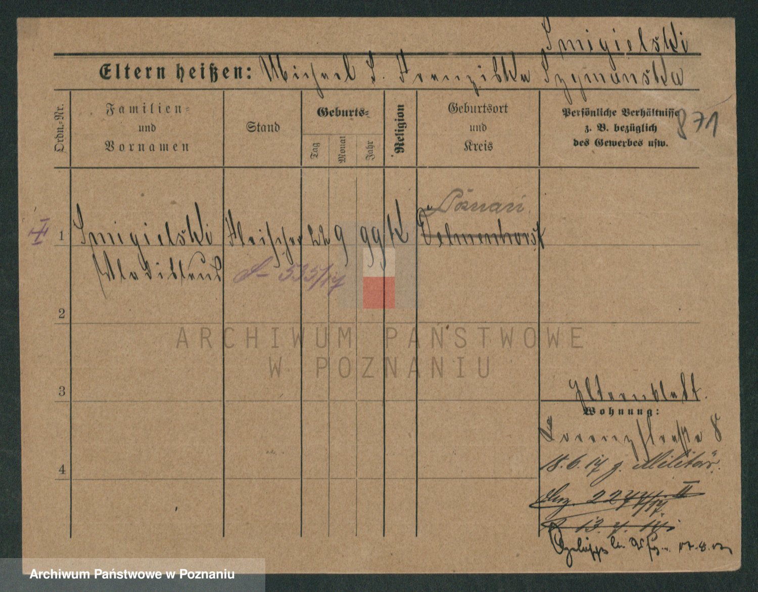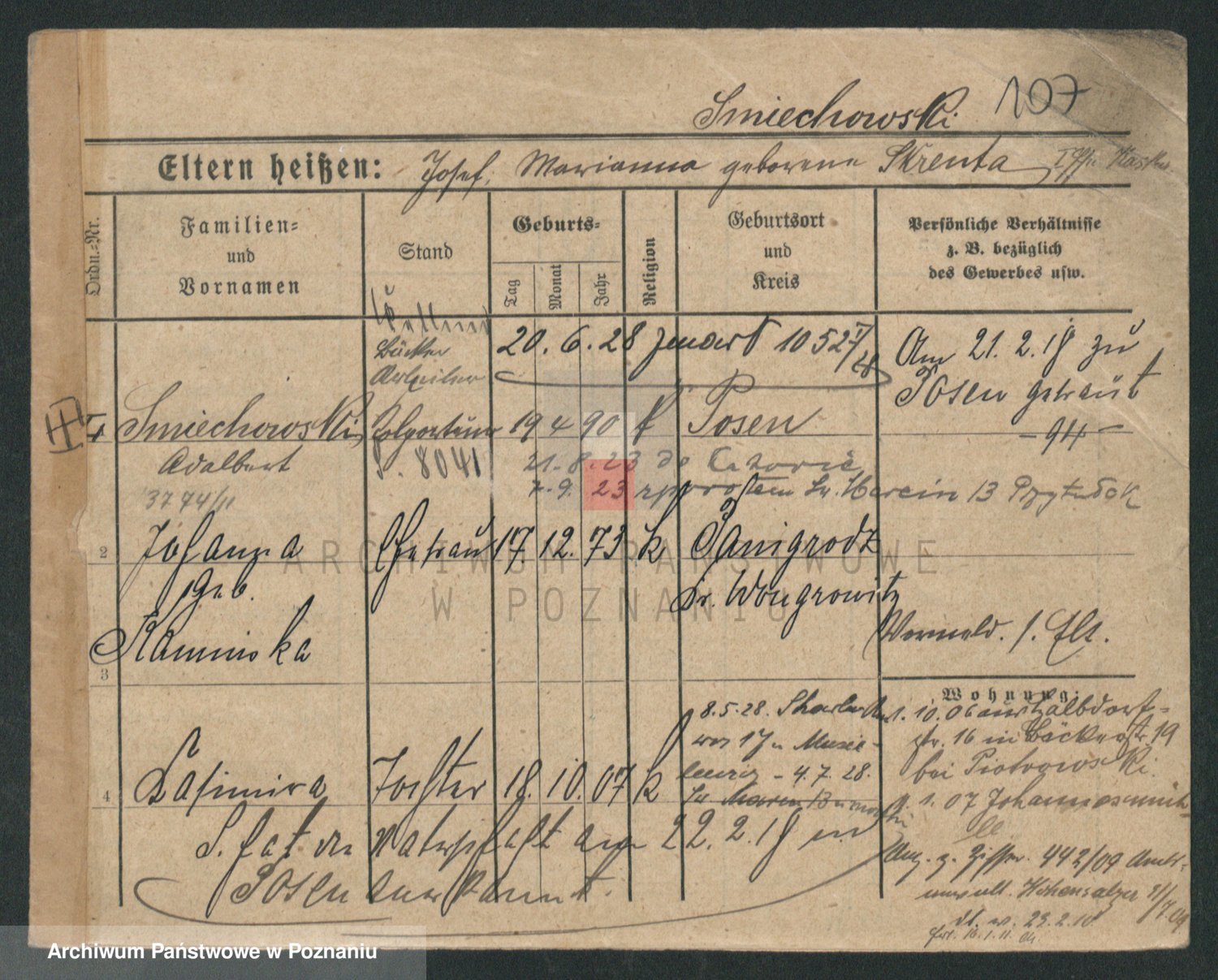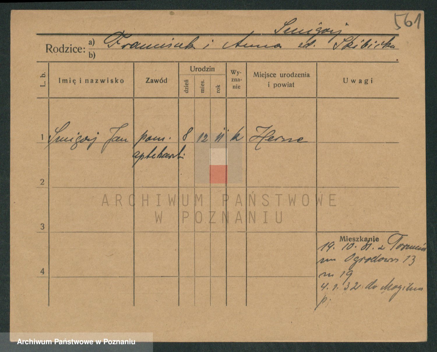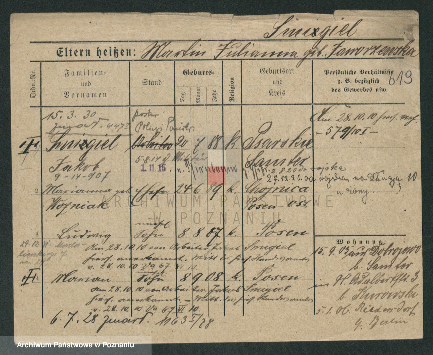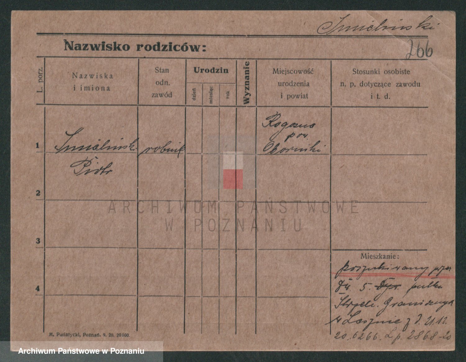 Podgląd karty osobowej dostępny jest po kliknięciu na nazwisko lub ikonkę karty. Można dokonywać powiększenia (ikony na górze) lub przechodzić między kolejnymi skanami (strzałki po bokach).