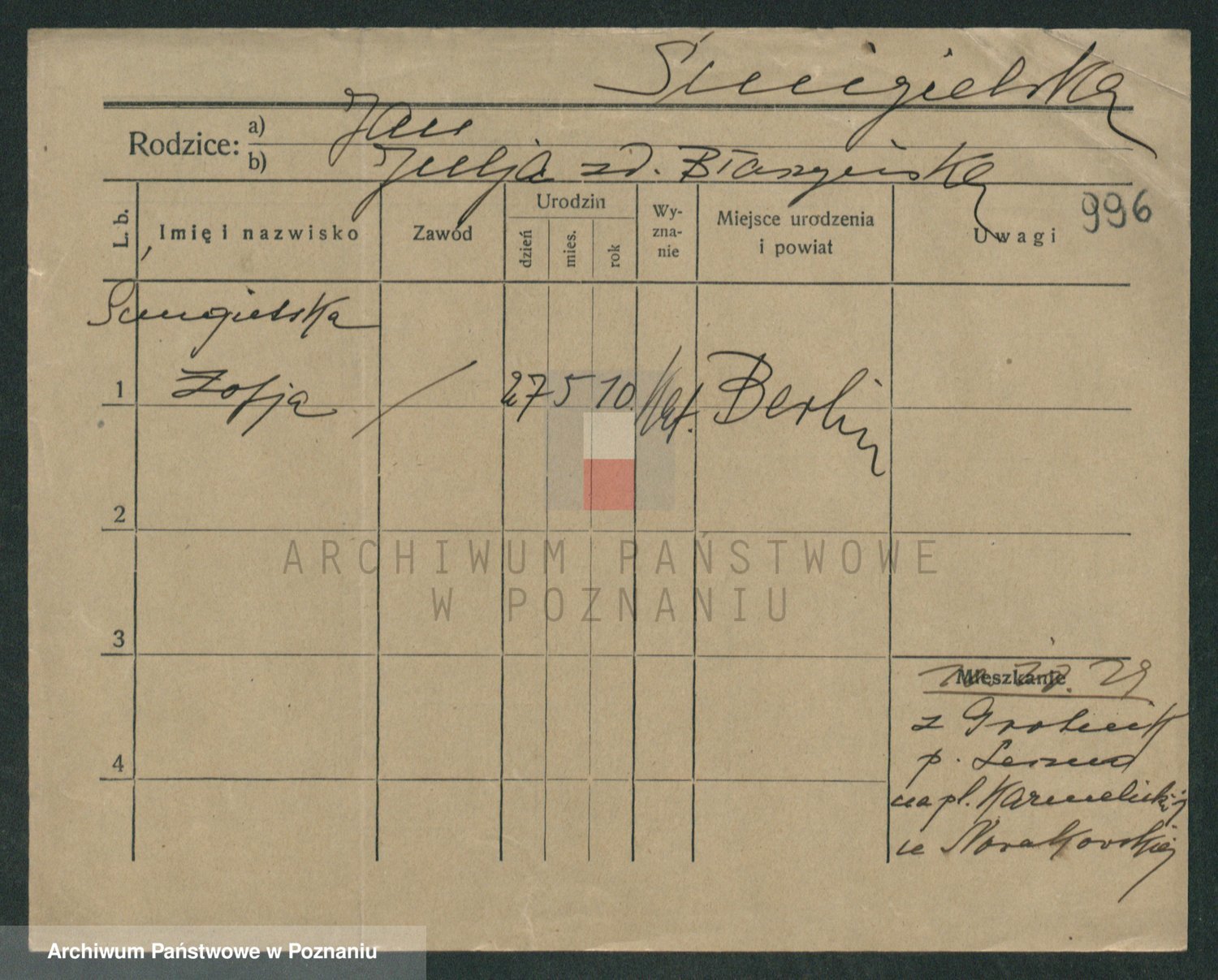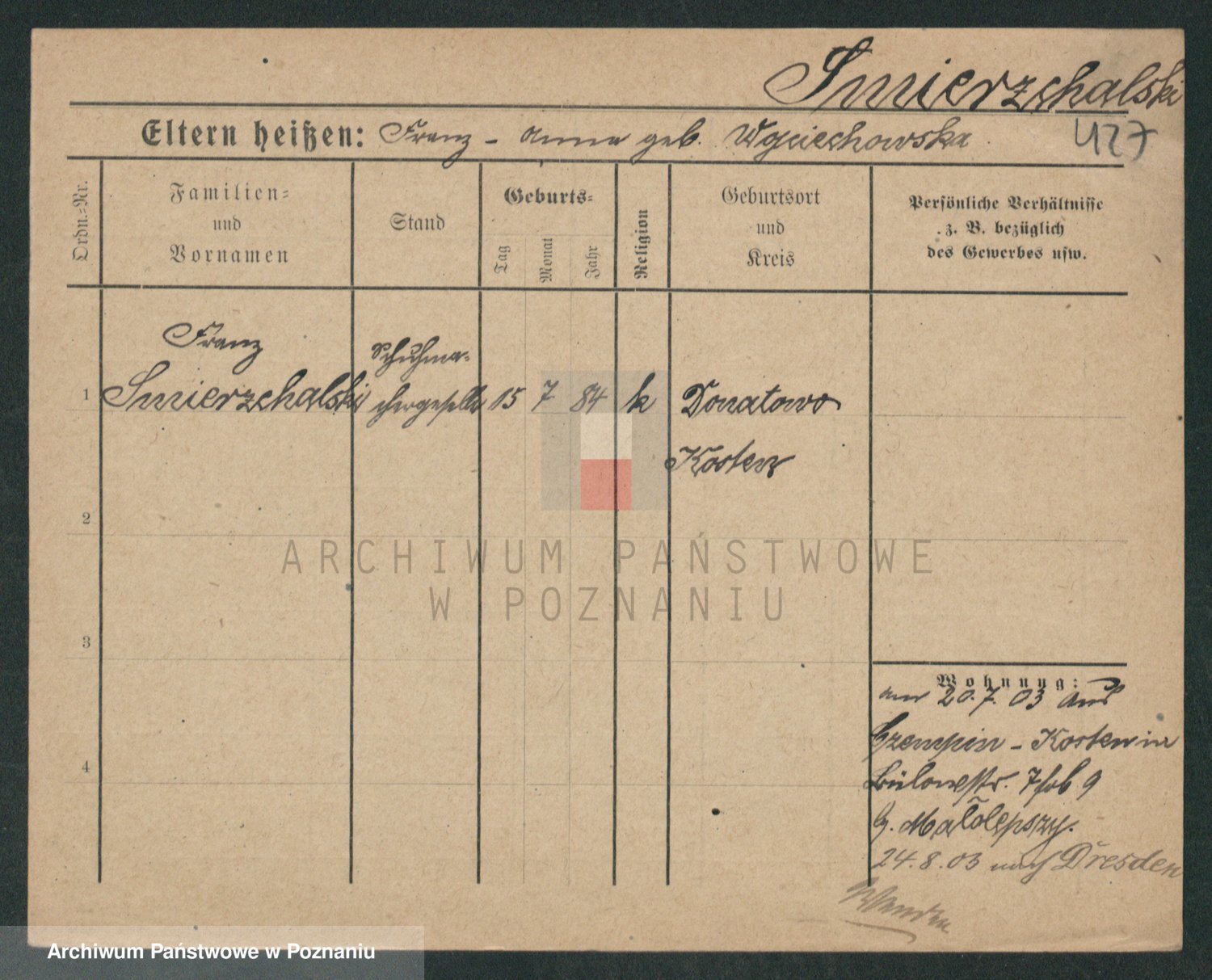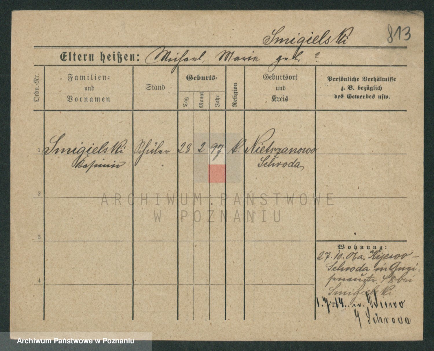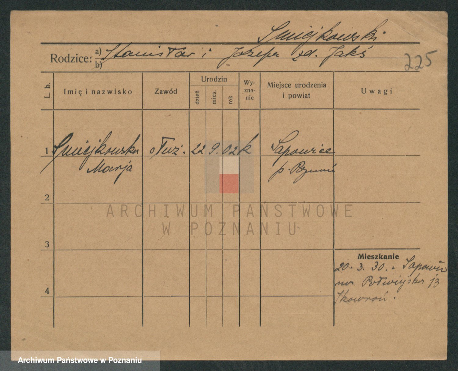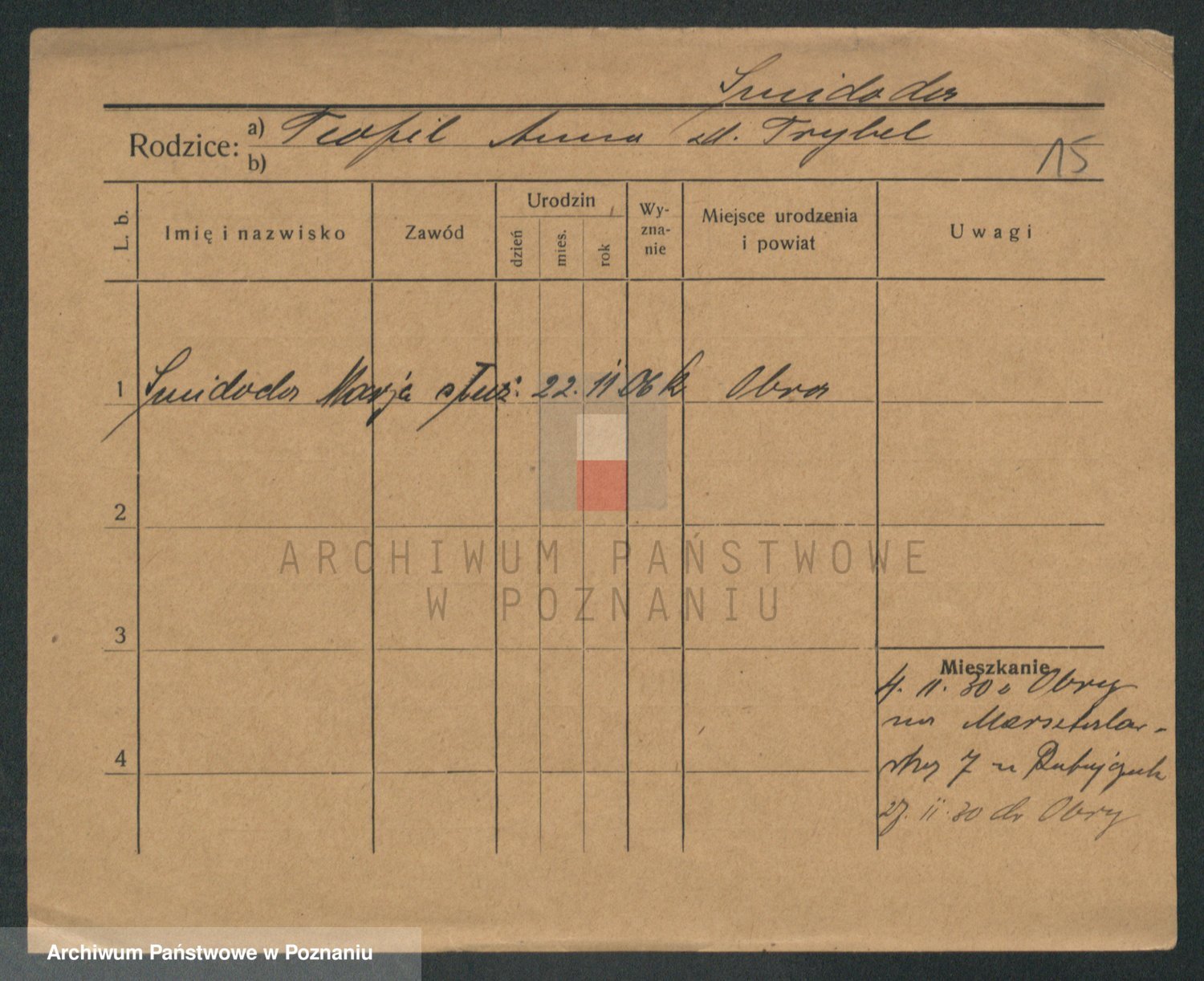 Podgląd karty osobowej dostępny jest po kliknięciu na nazwisko lub ikonkę karty. Można dokonywać powiększenia (ikony na górze) lub przechodzić między kolejnymi skanami (strzałki po bokach).