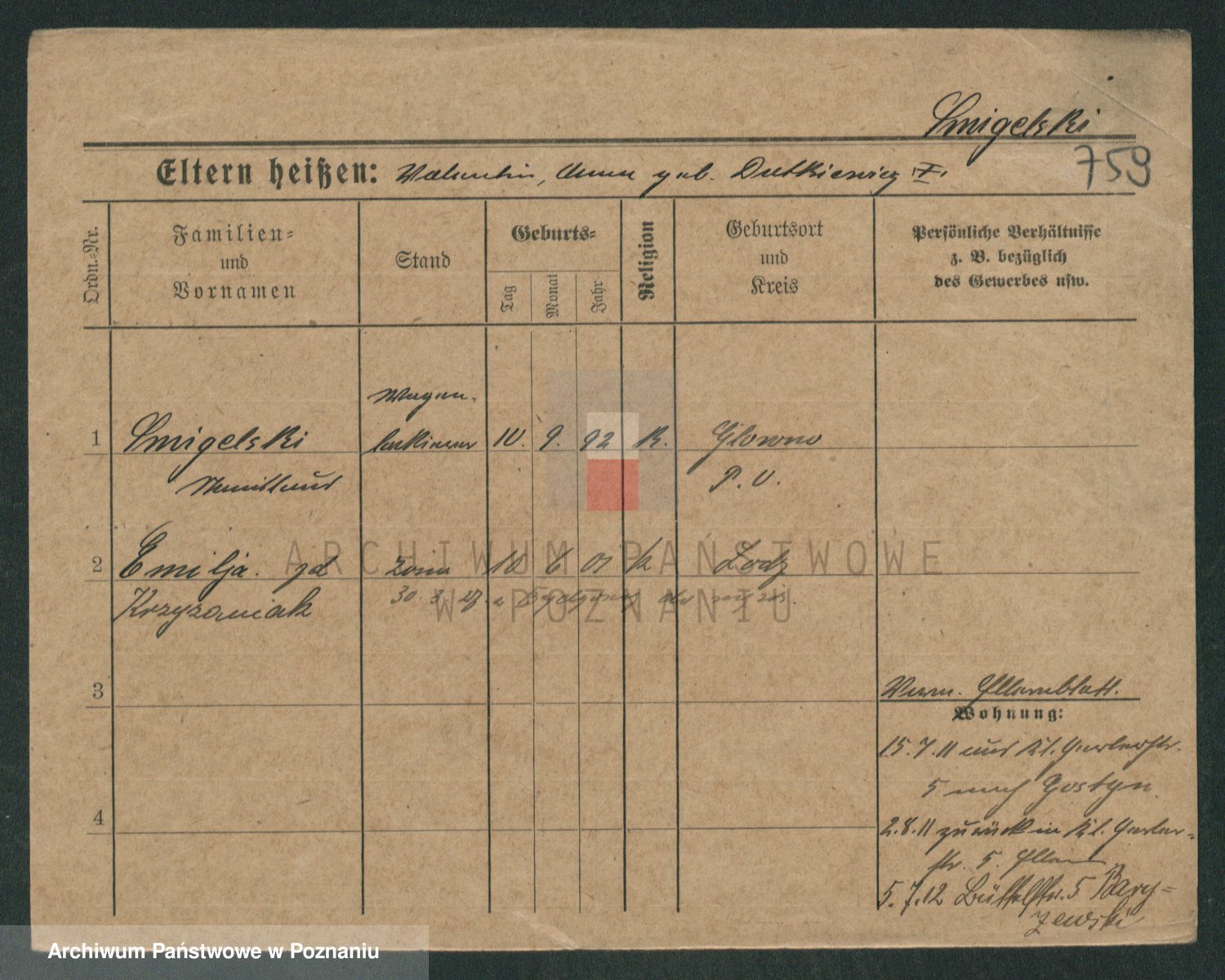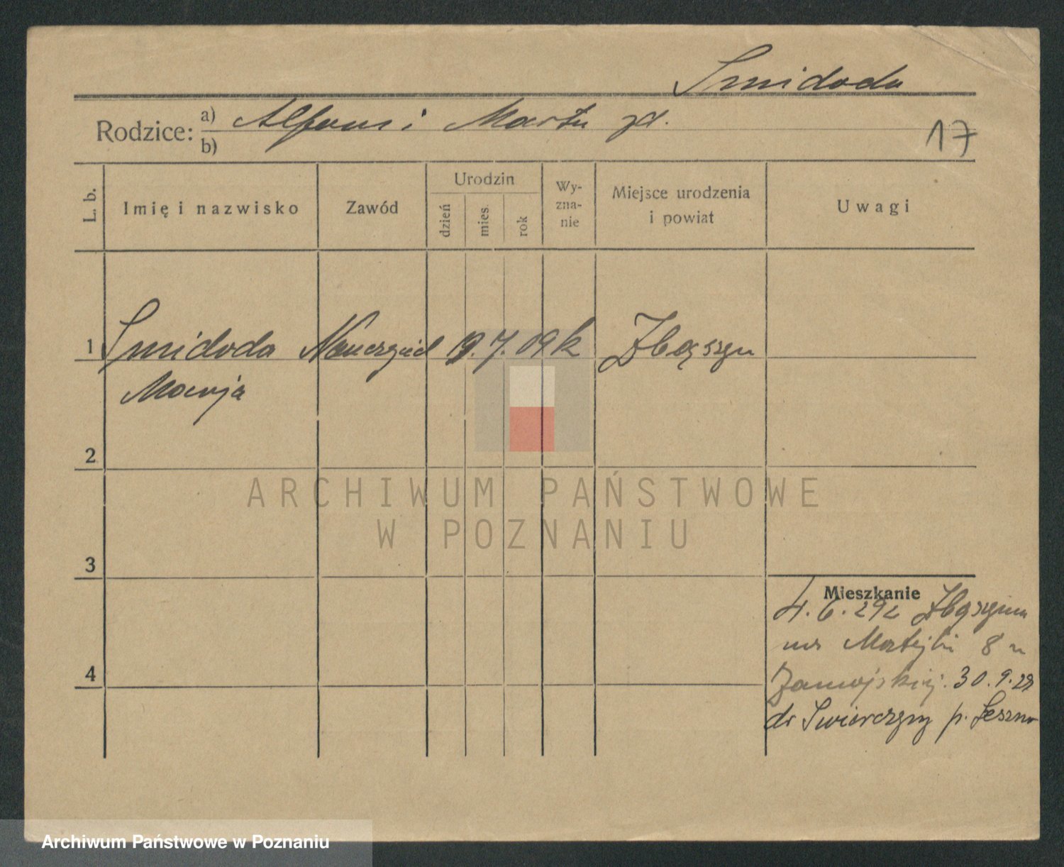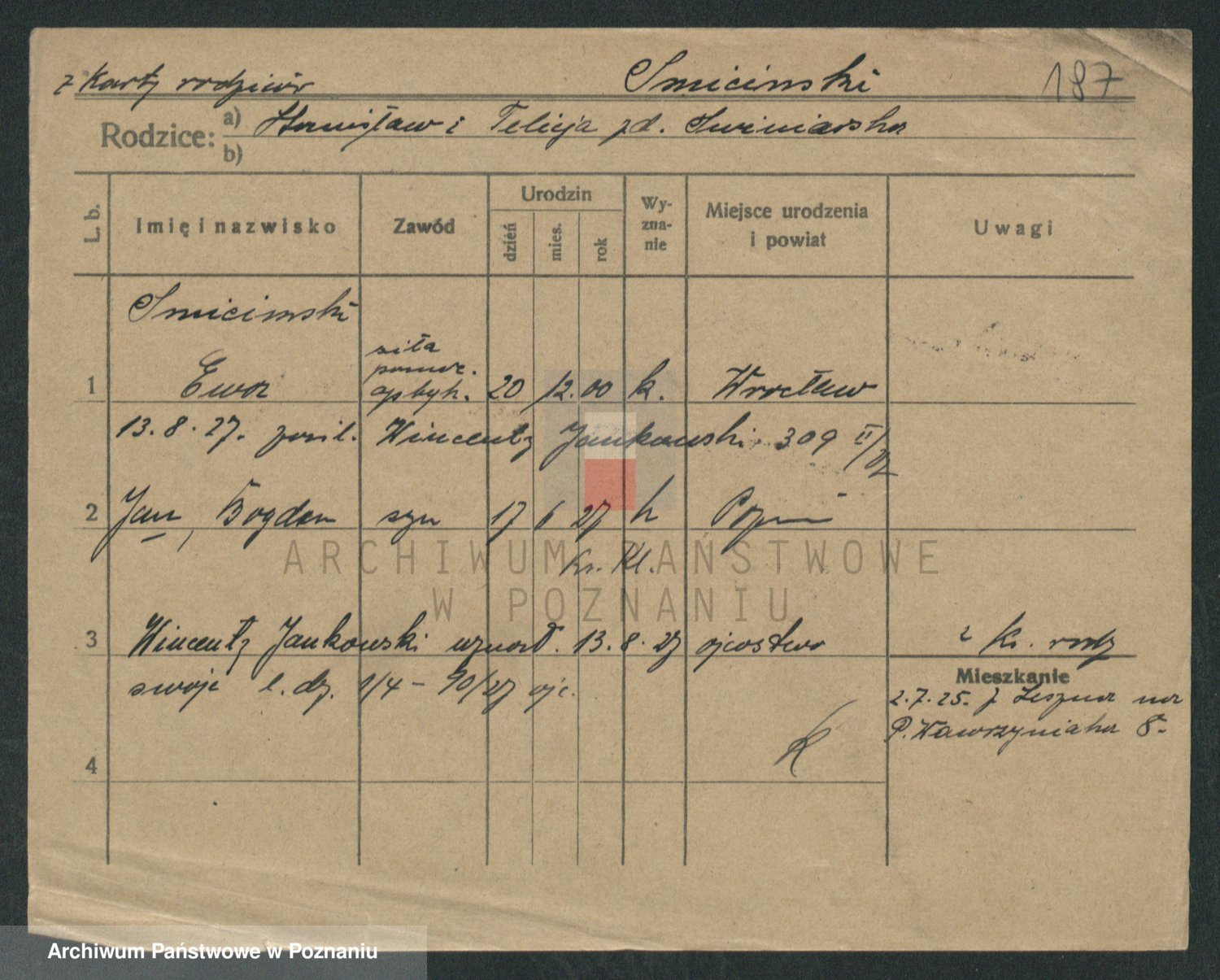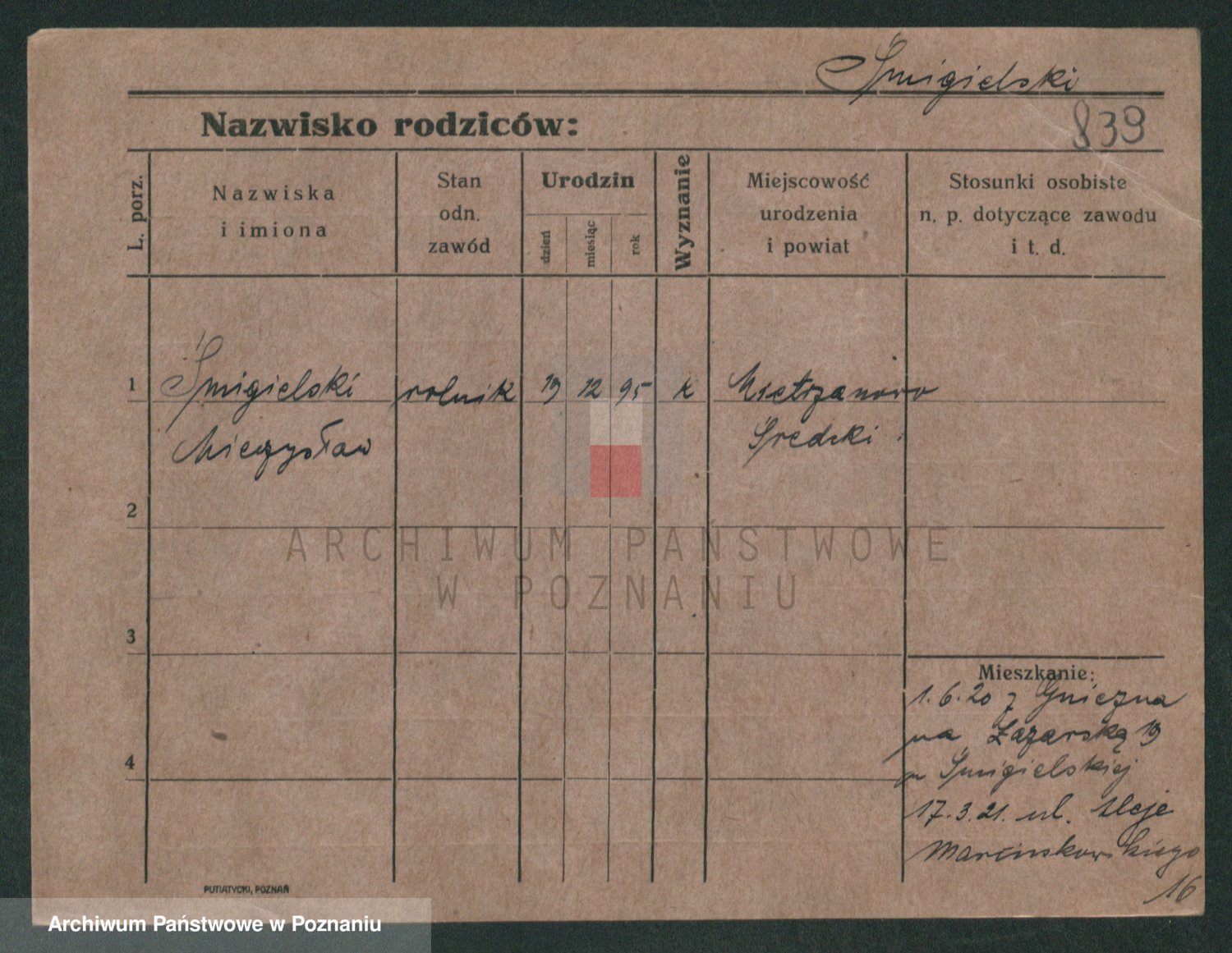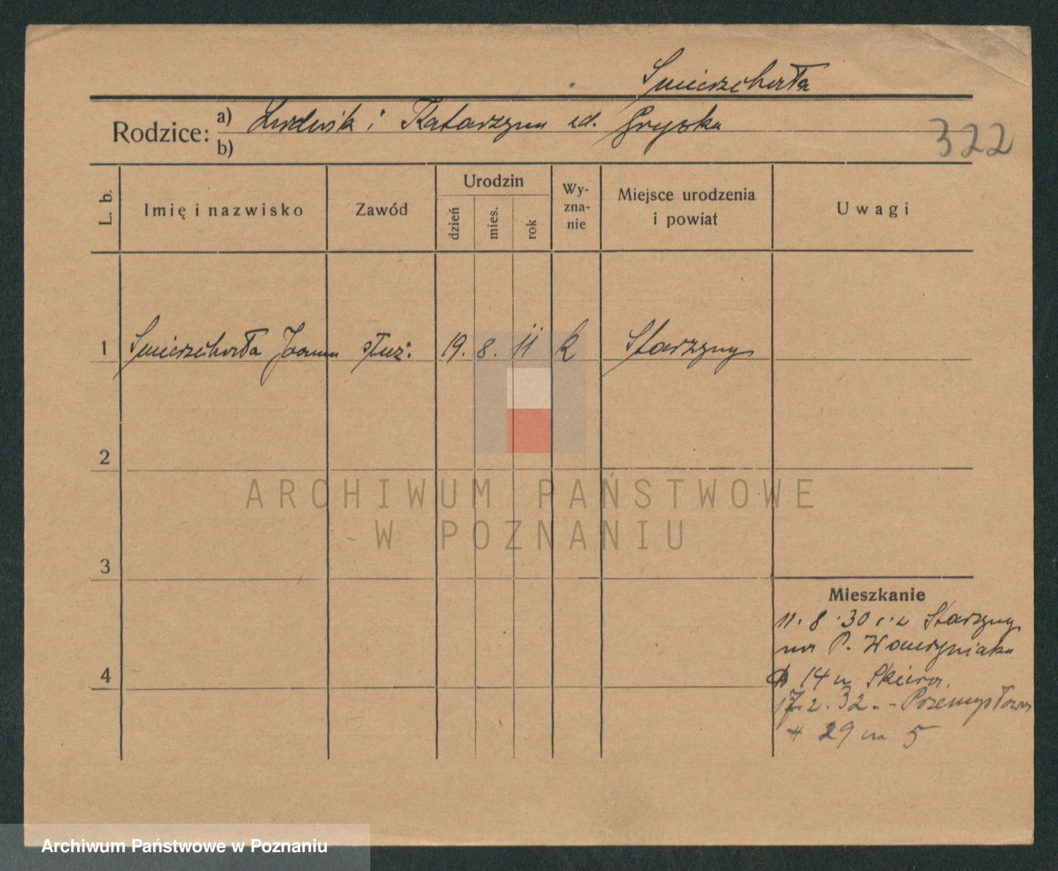 Podgląd karty osobowej dostępny jest po kliknięciu na nazwisko lub ikonkę karty. Można dokonywać powiększenia (ikony na górze) lub przechodzić między kolejnymi skanami (strzałki po bokach).