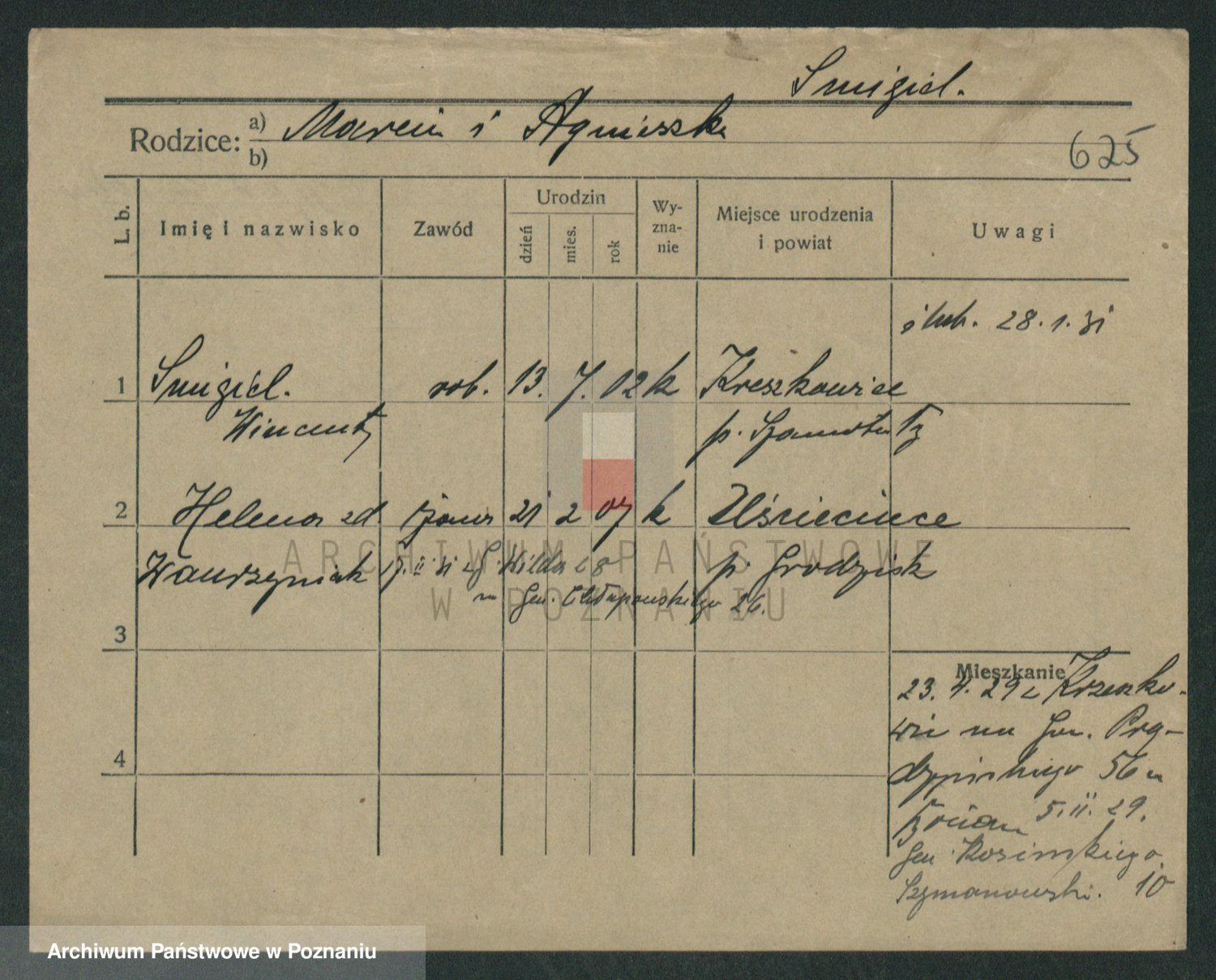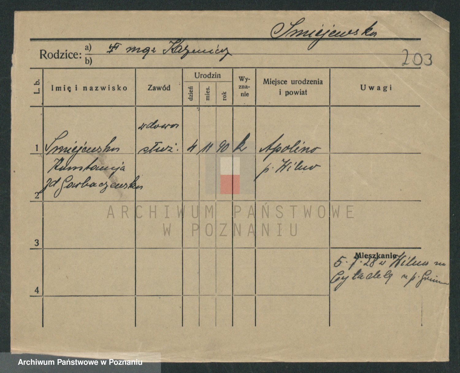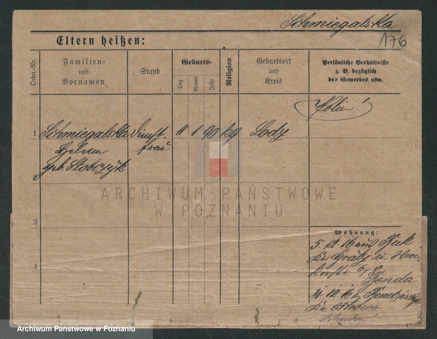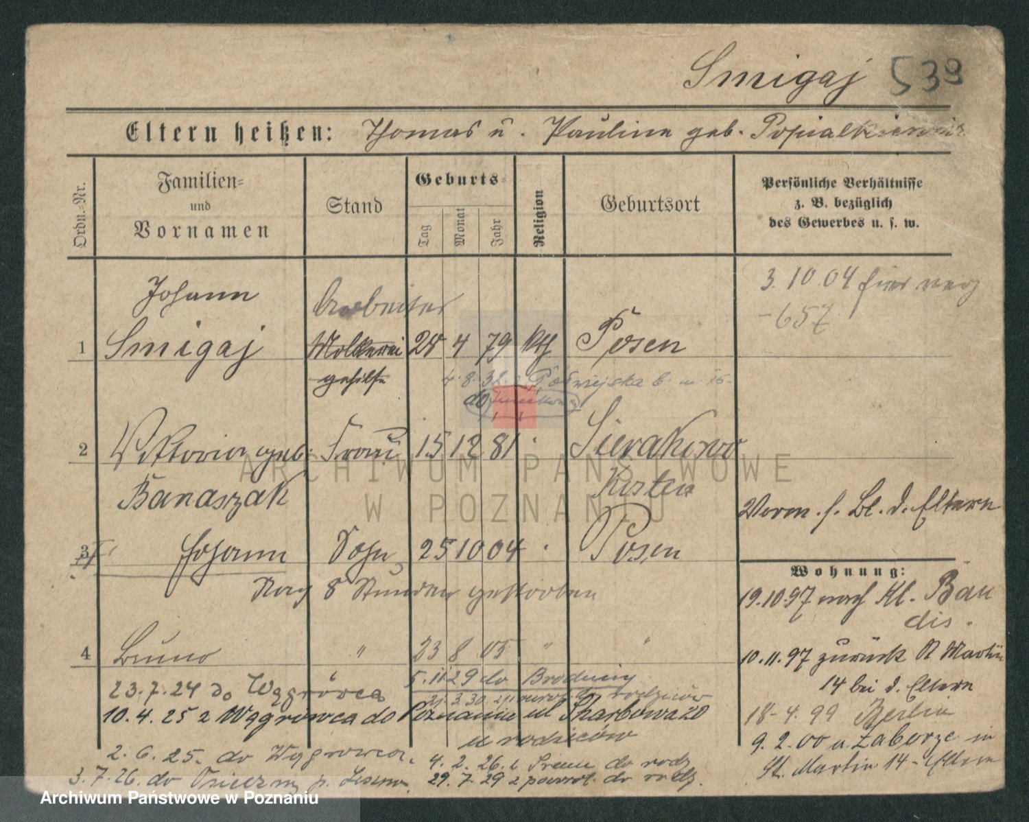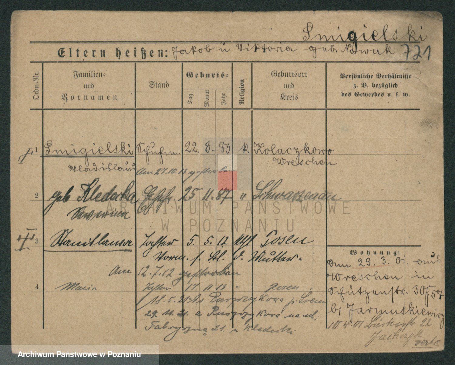Podgląd karty osobowej dostępny jest po kliknięciu na nazwisko lub ikonkę karty. Można dokonywać powiększenia (ikony na górze) lub przechodzić między kolejnymi skanami (strzałki po bokach).
