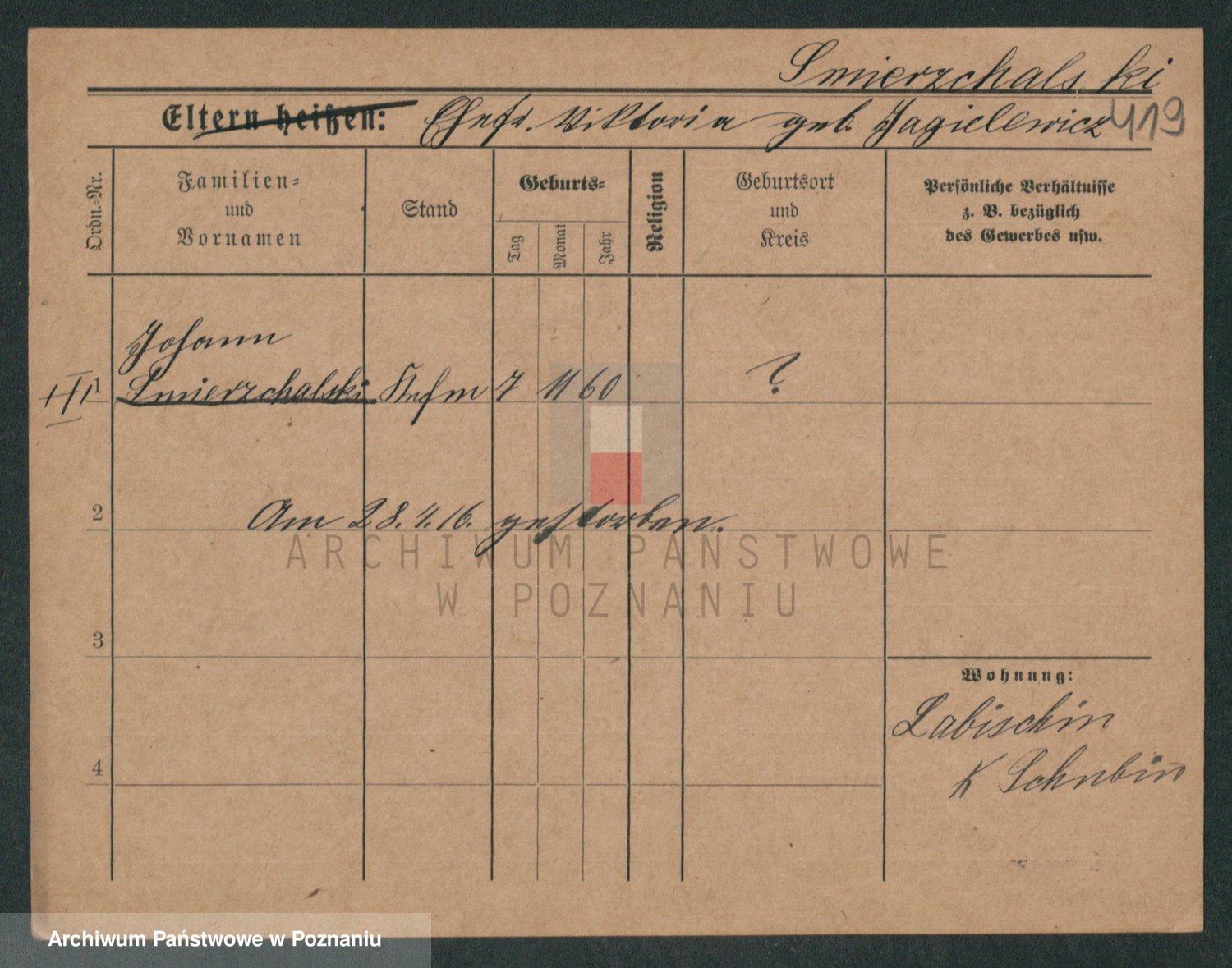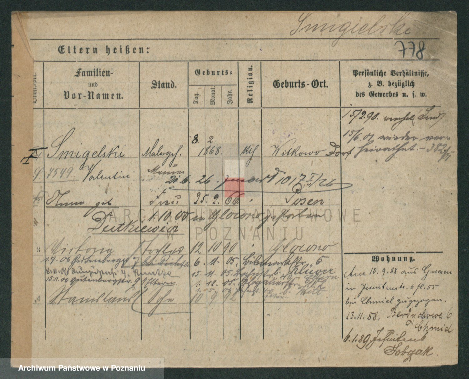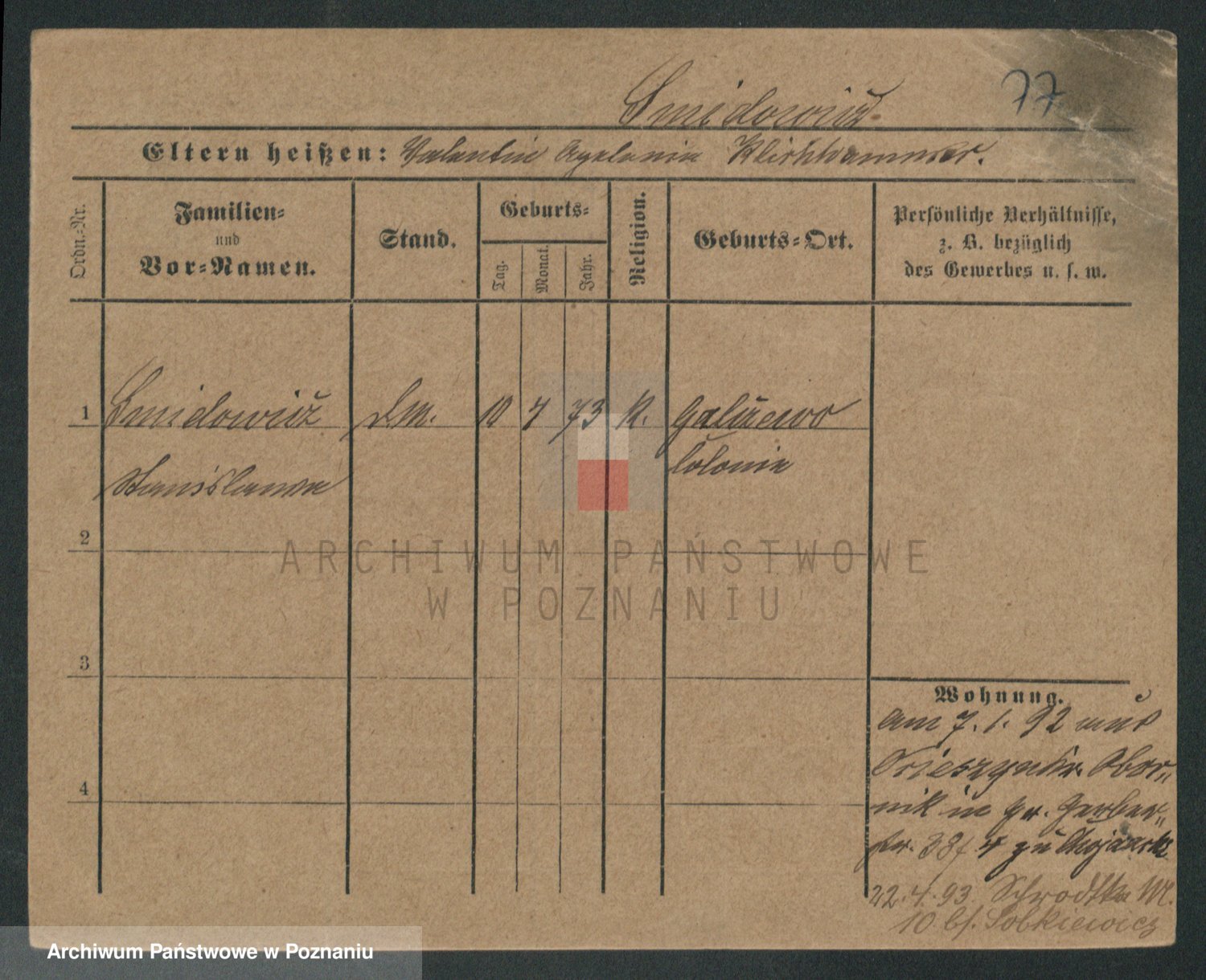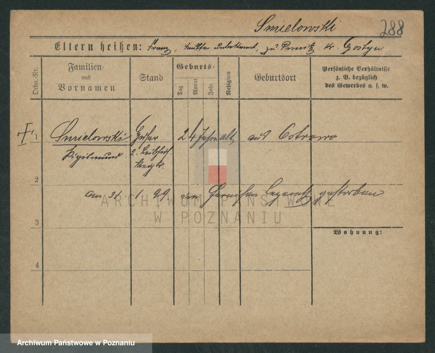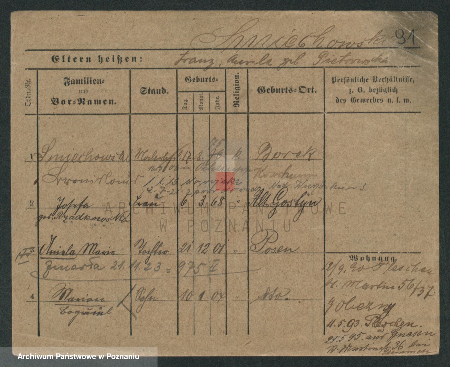 Podgląd karty osobowej dostępny jest po kliknięciu na nazwisko lub ikonkę karty. Można dokonywać powiększenia (ikony na górze) lub przechodzić między kolejnymi skanami (strzałki po bokach).