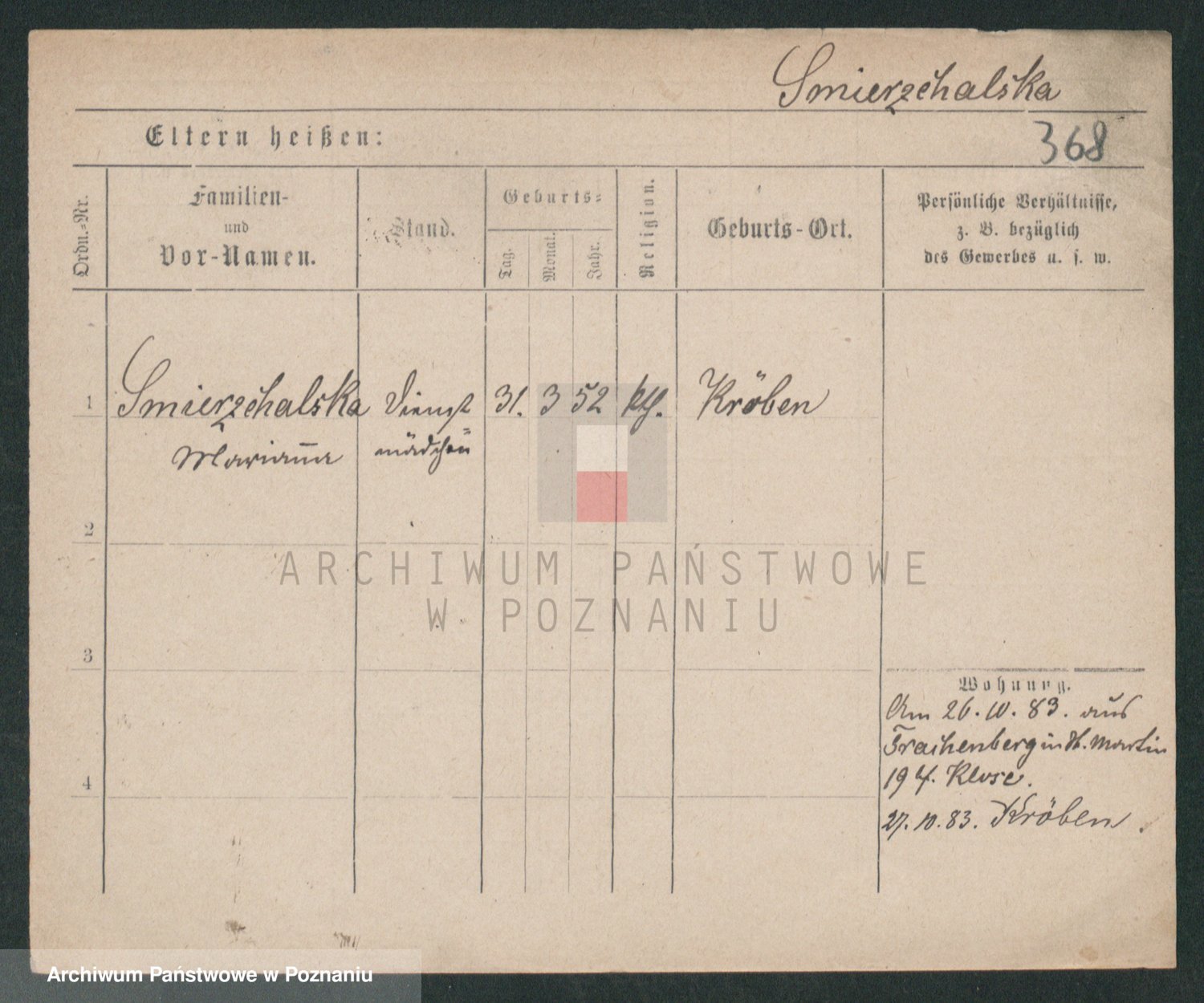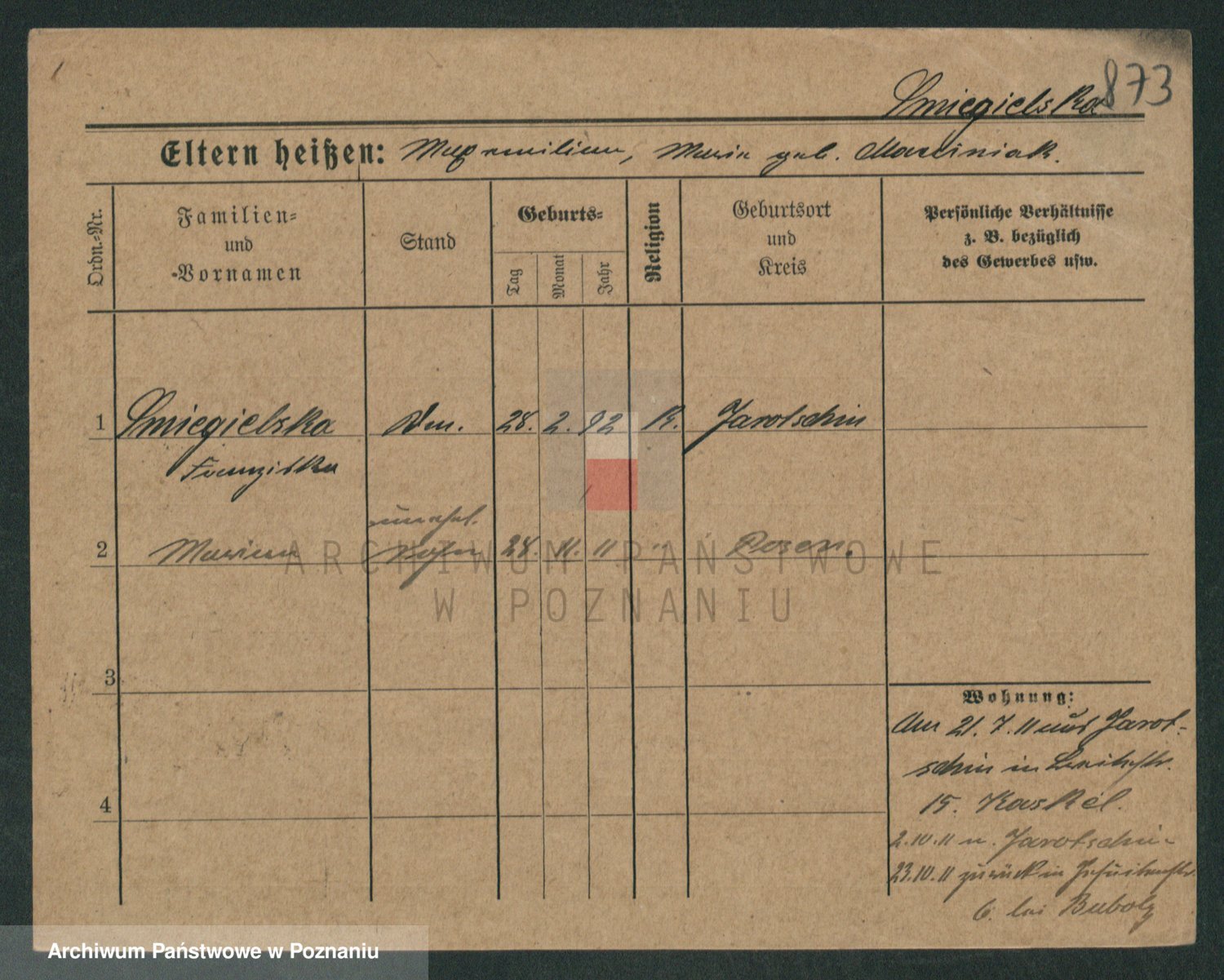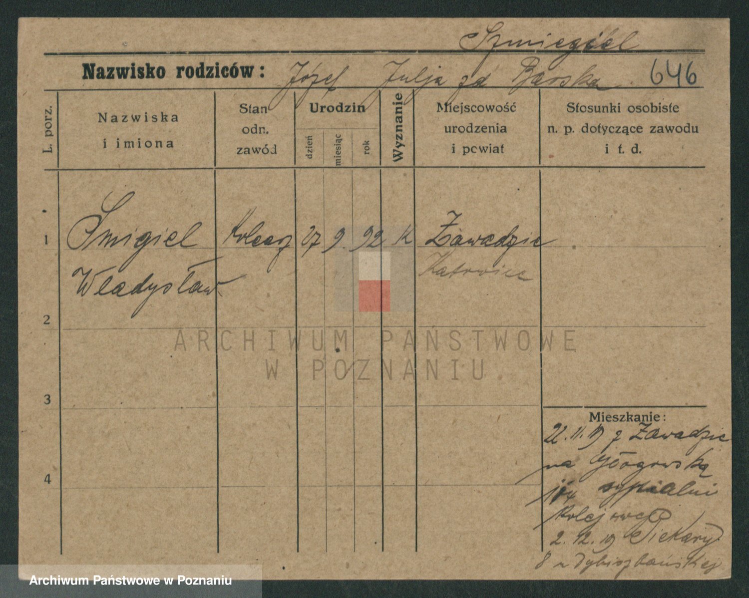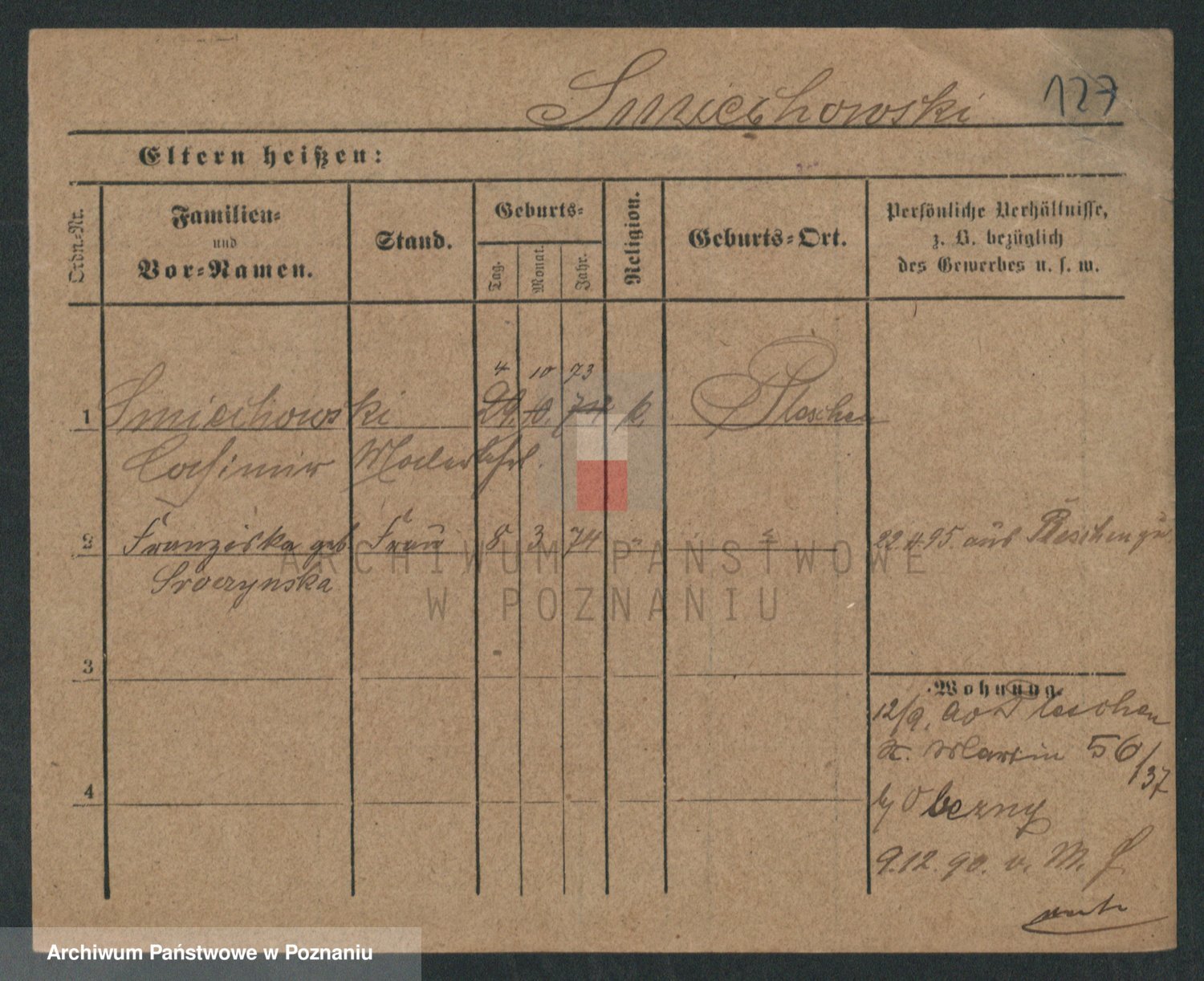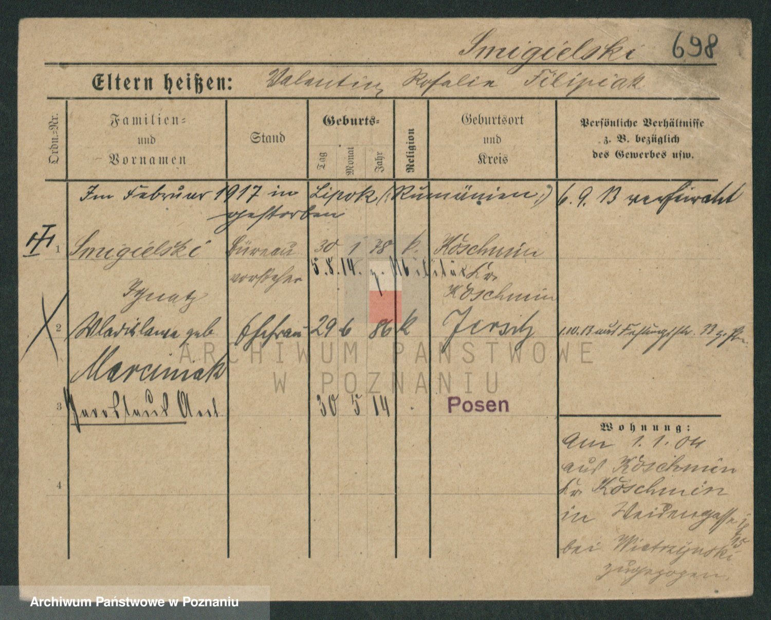 Podgląd karty osobowej dostępny jest po kliknięciu na nazwisko lub ikonkę karty. Można dokonywać powiększenia (ikony na górze) lub przechodzić między kolejnymi skanami (strzałki po bokach).