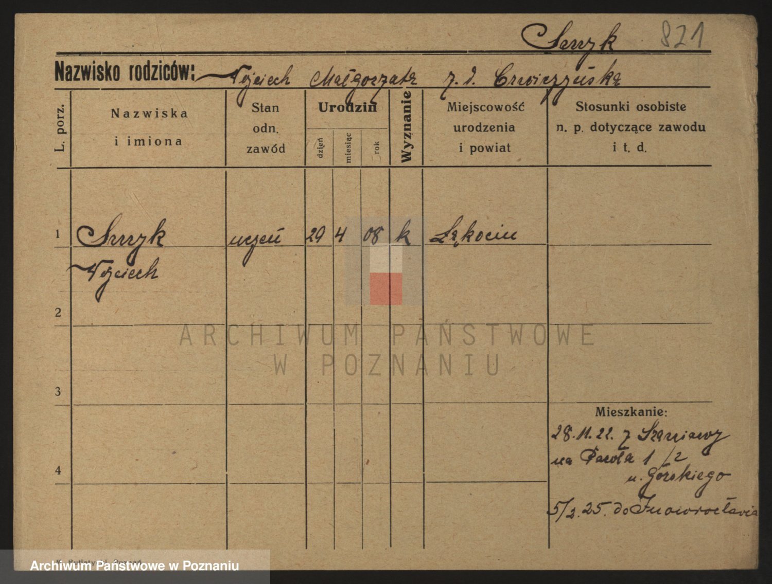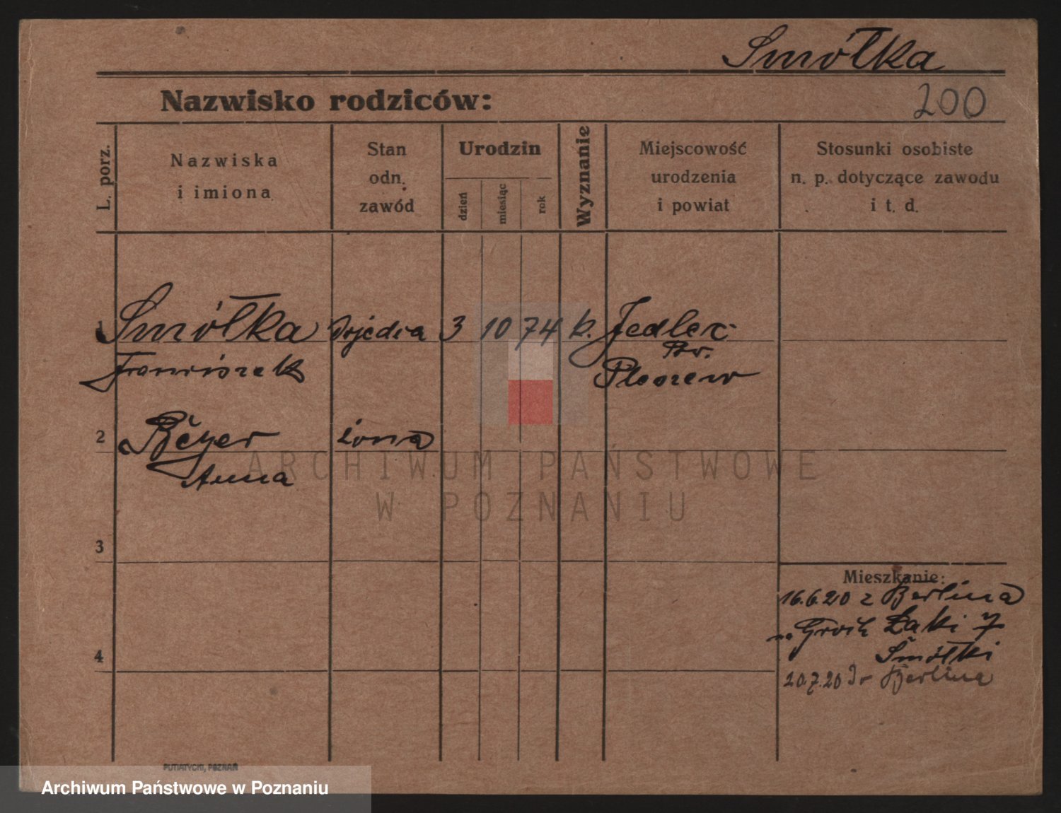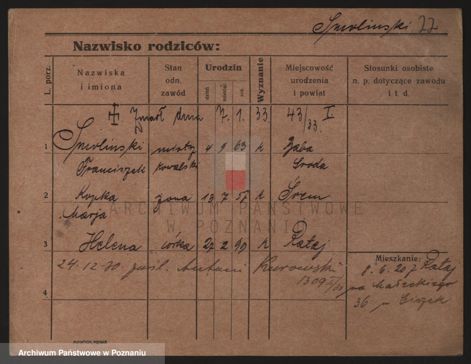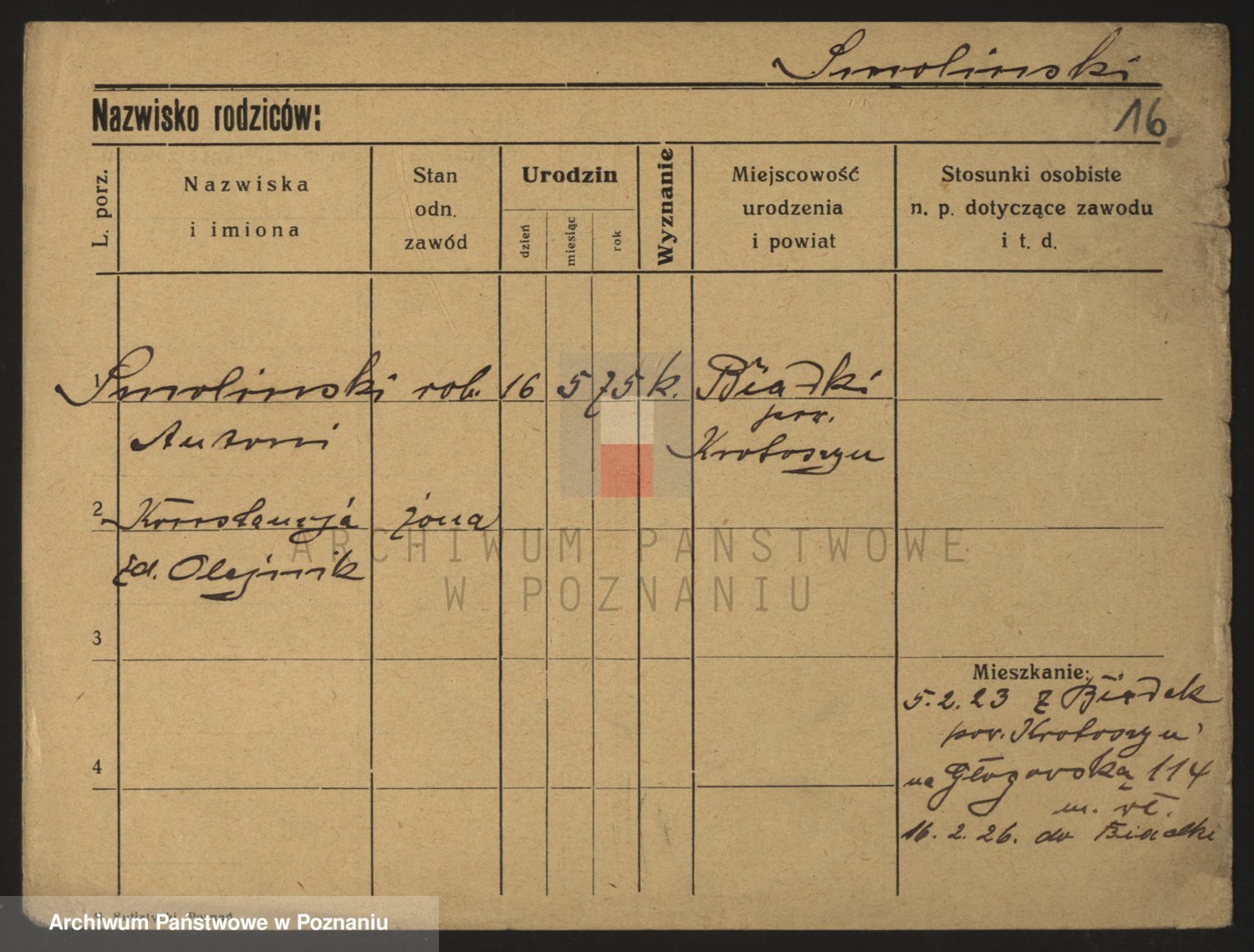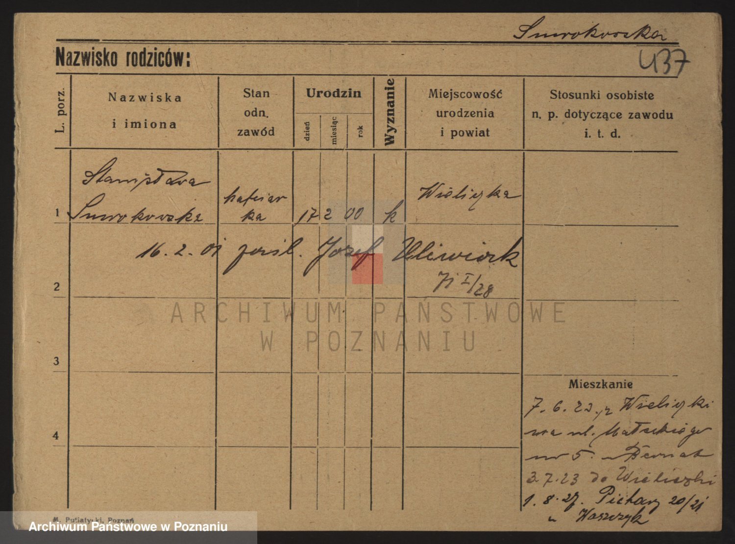 Podgląd karty osobowej dostępny jest po kliknięciu na nazwisko lub ikonkę karty. Można dokonywać powiększenia (ikony na górze) lub przechodzić między kolejnymi skanami (strzałki po bokach).