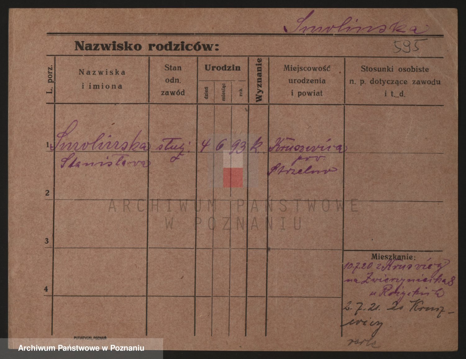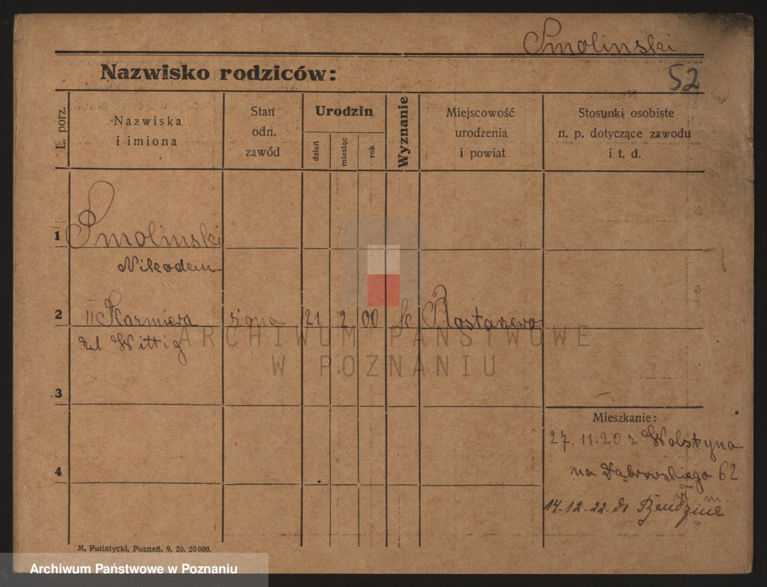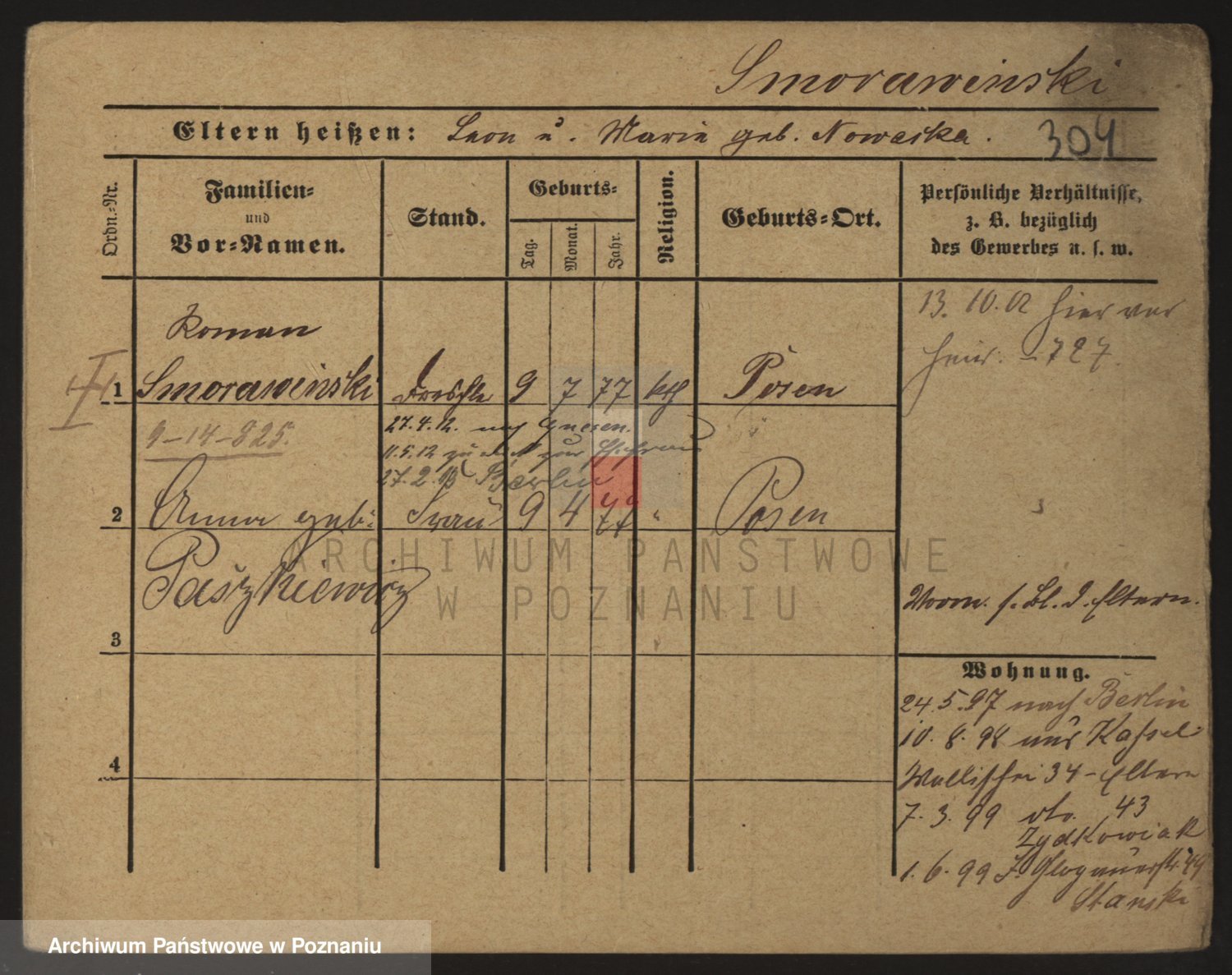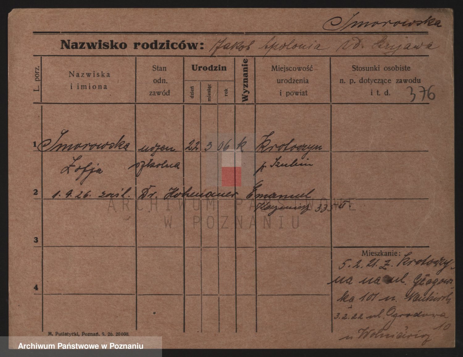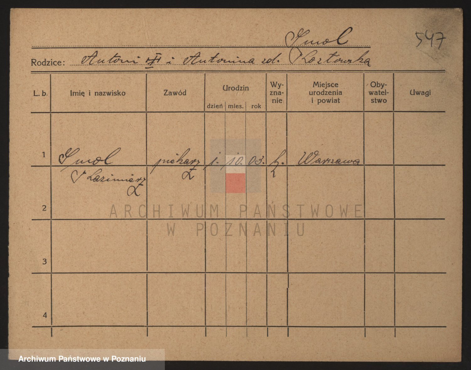 Podgląd karty osobowej dostępny jest po kliknięciu na nazwisko lub ikonkę karty. Można dokonywać powiększenia (ikony na górze) lub przechodzić między kolejnymi skanami (strzałki po bokach).