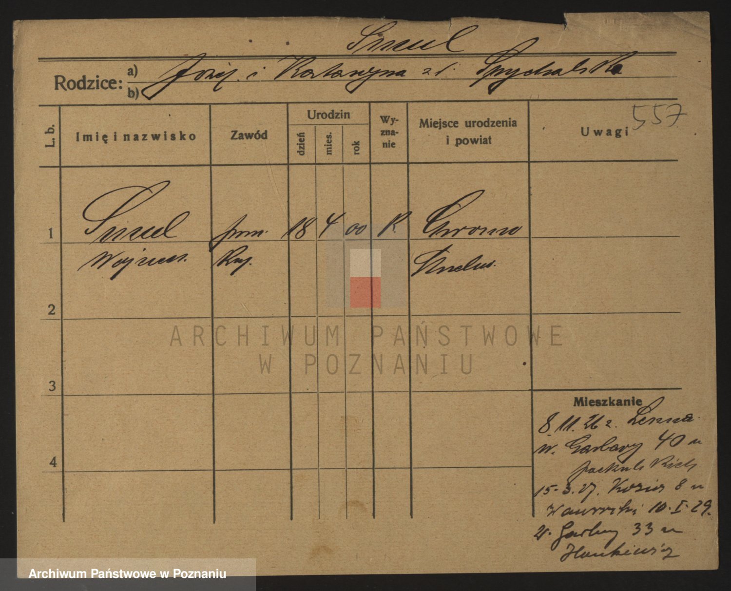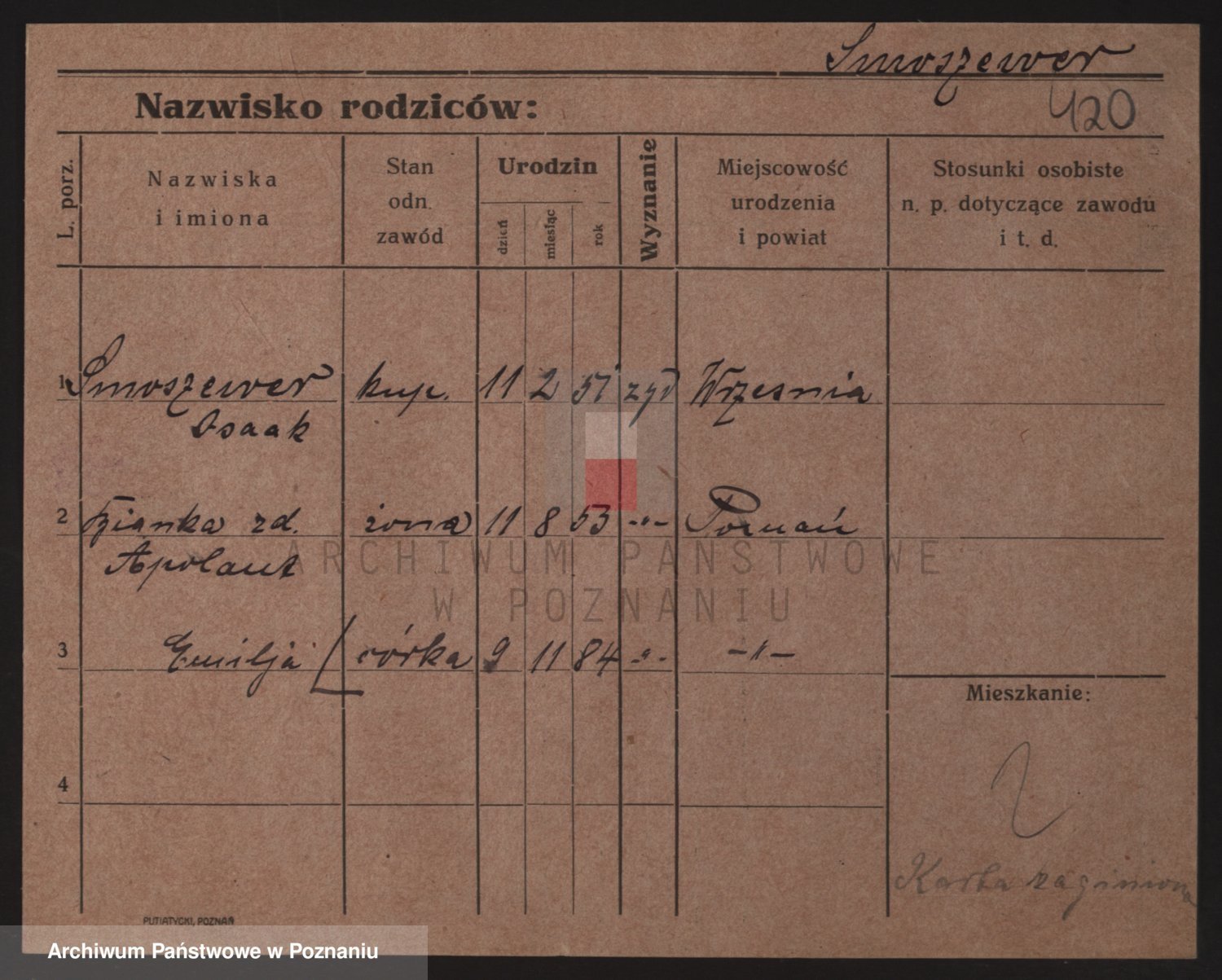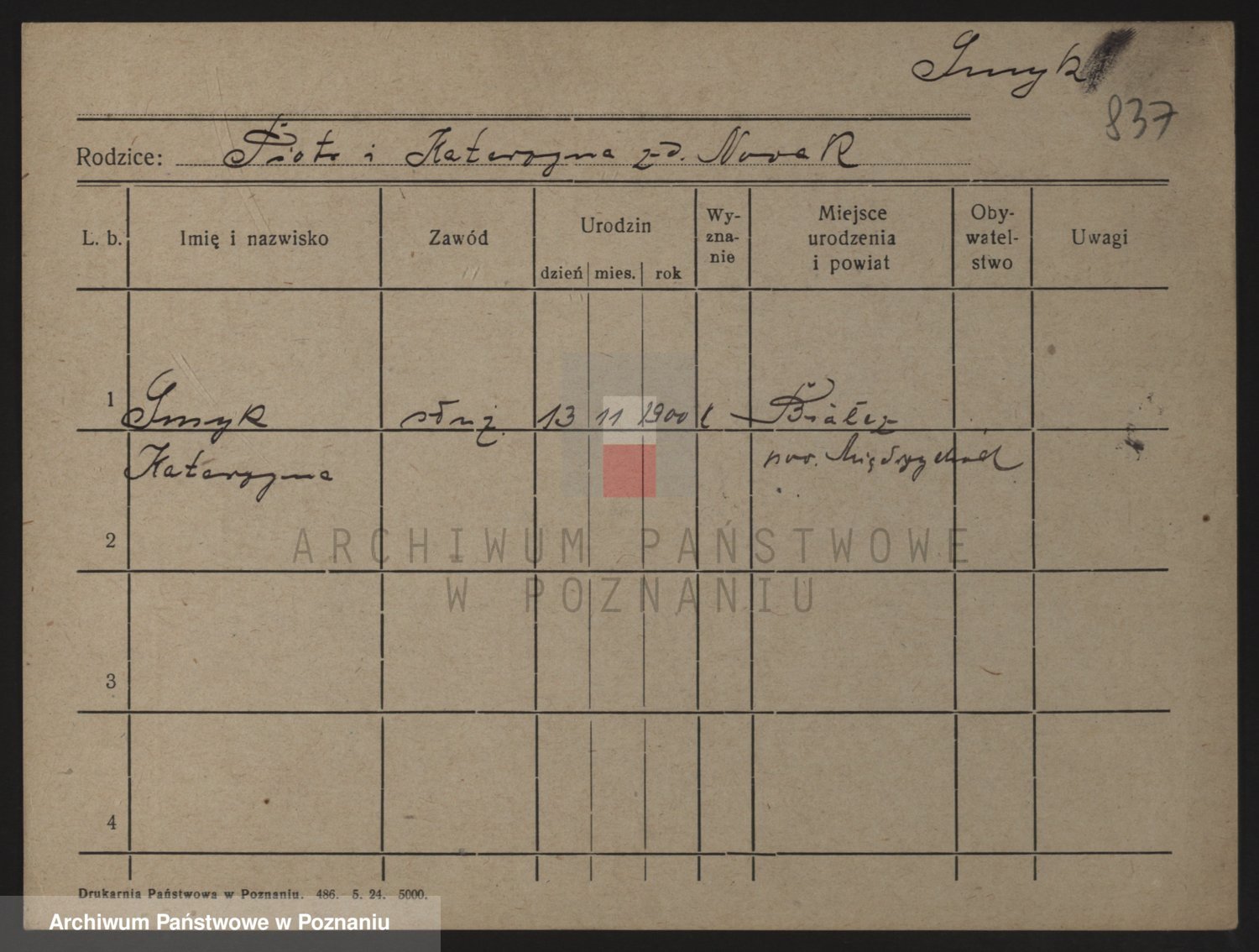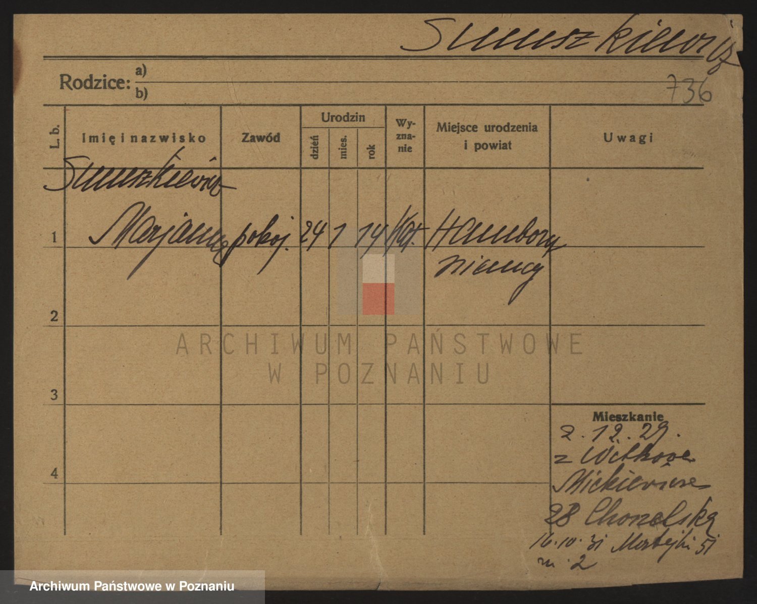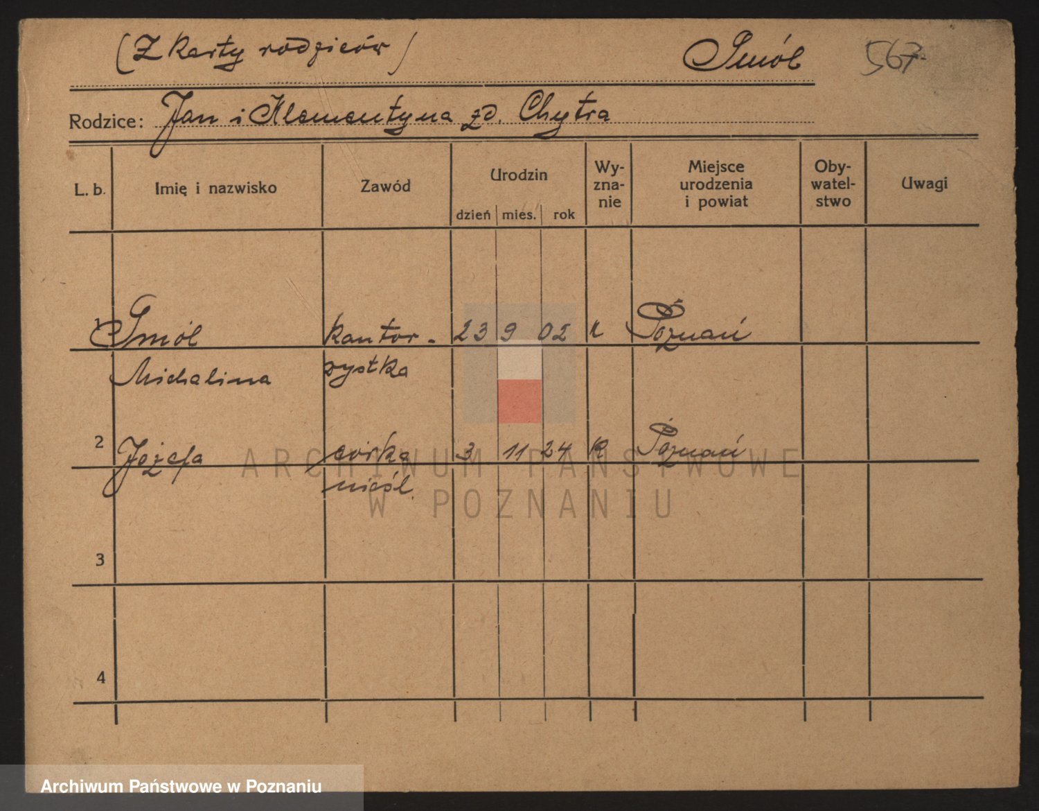 Podgląd karty osobowej dostępny jest po kliknięciu na nazwisko lub ikonkę karty. Można dokonywać powiększenia (ikony na górze) lub przechodzić między kolejnymi skanami (strzałki po bokach).