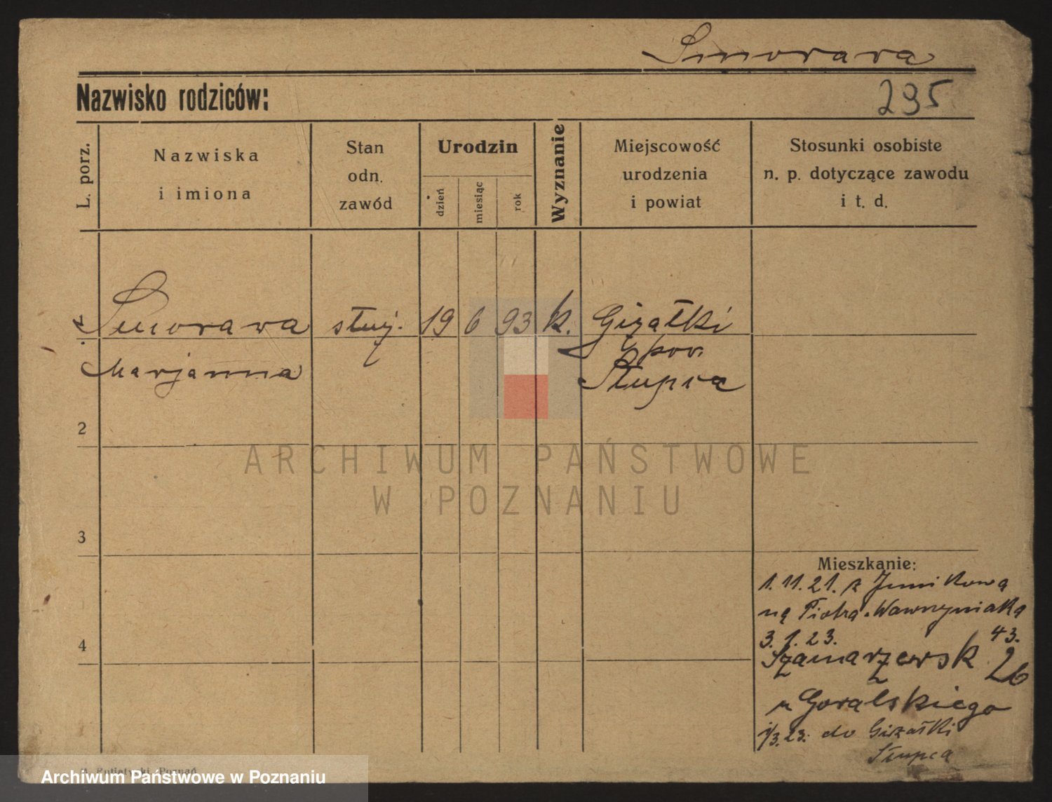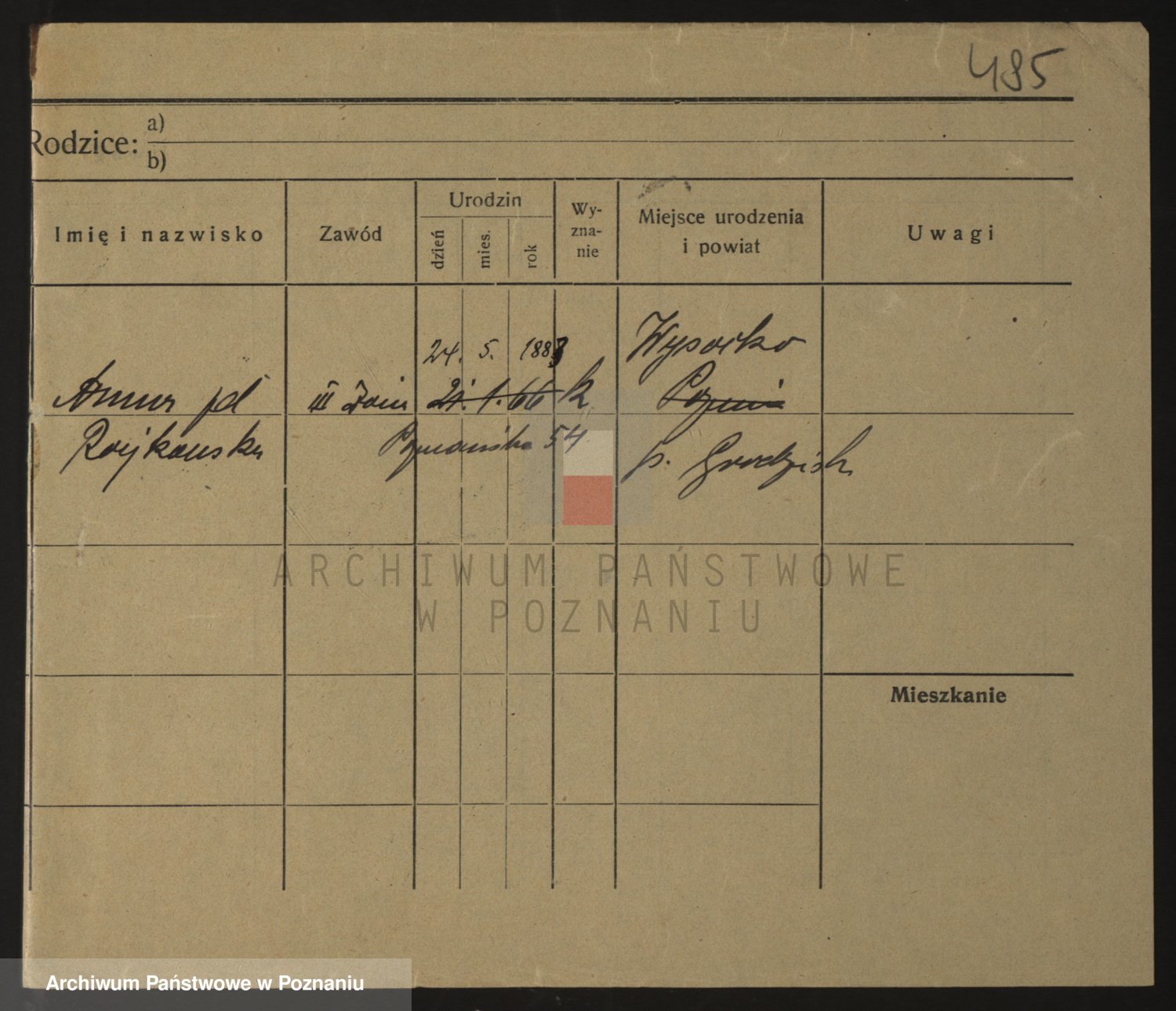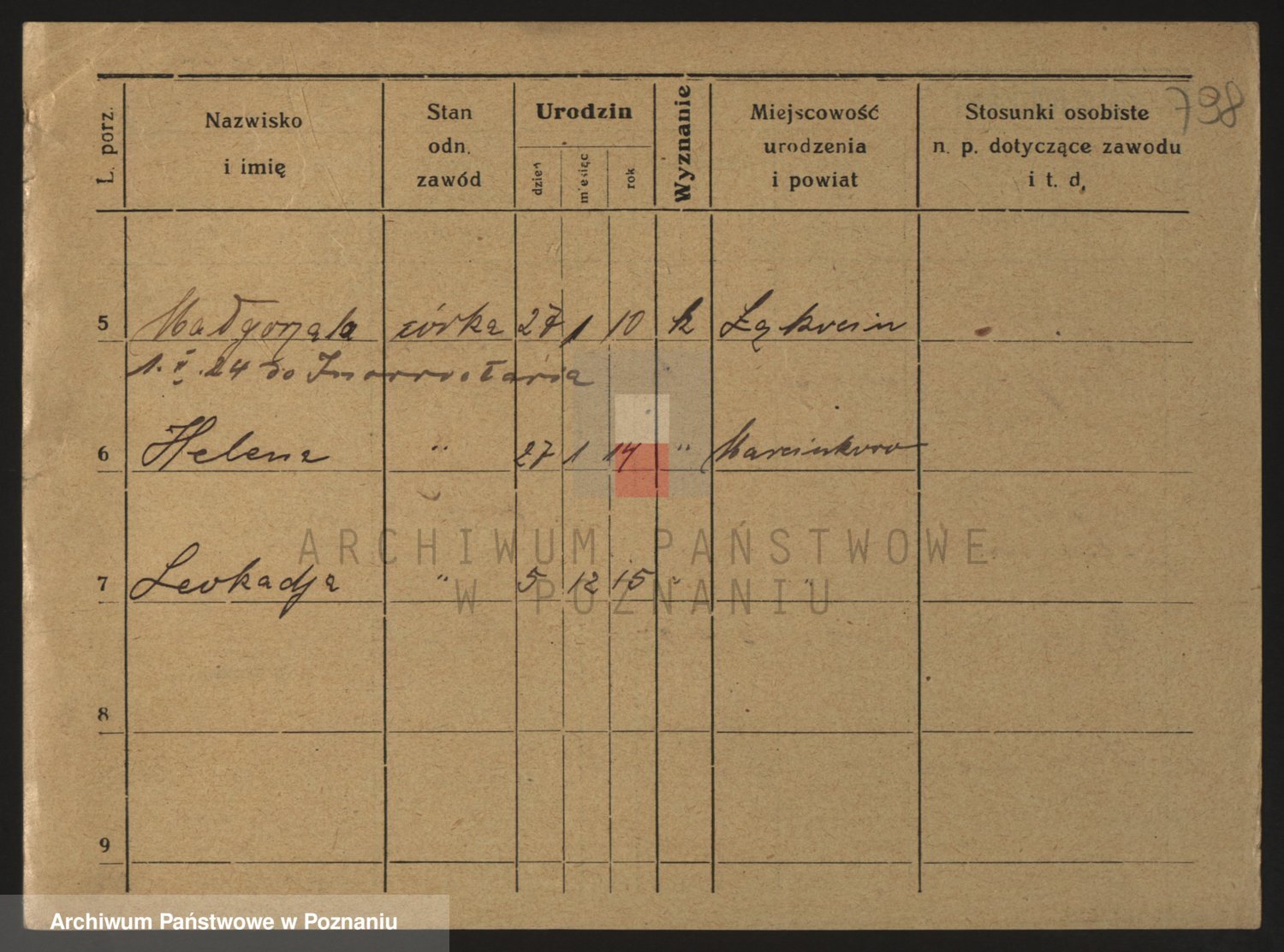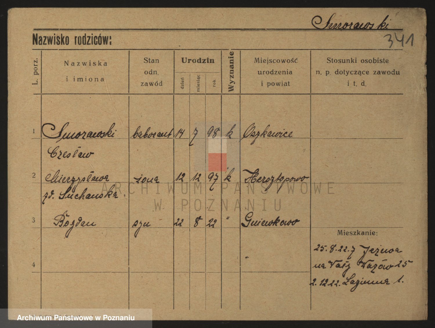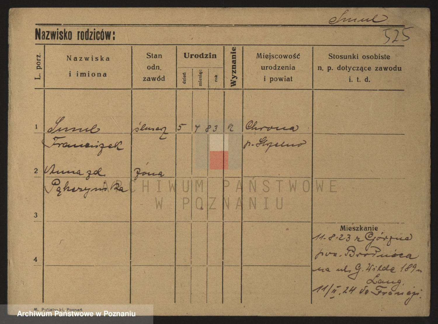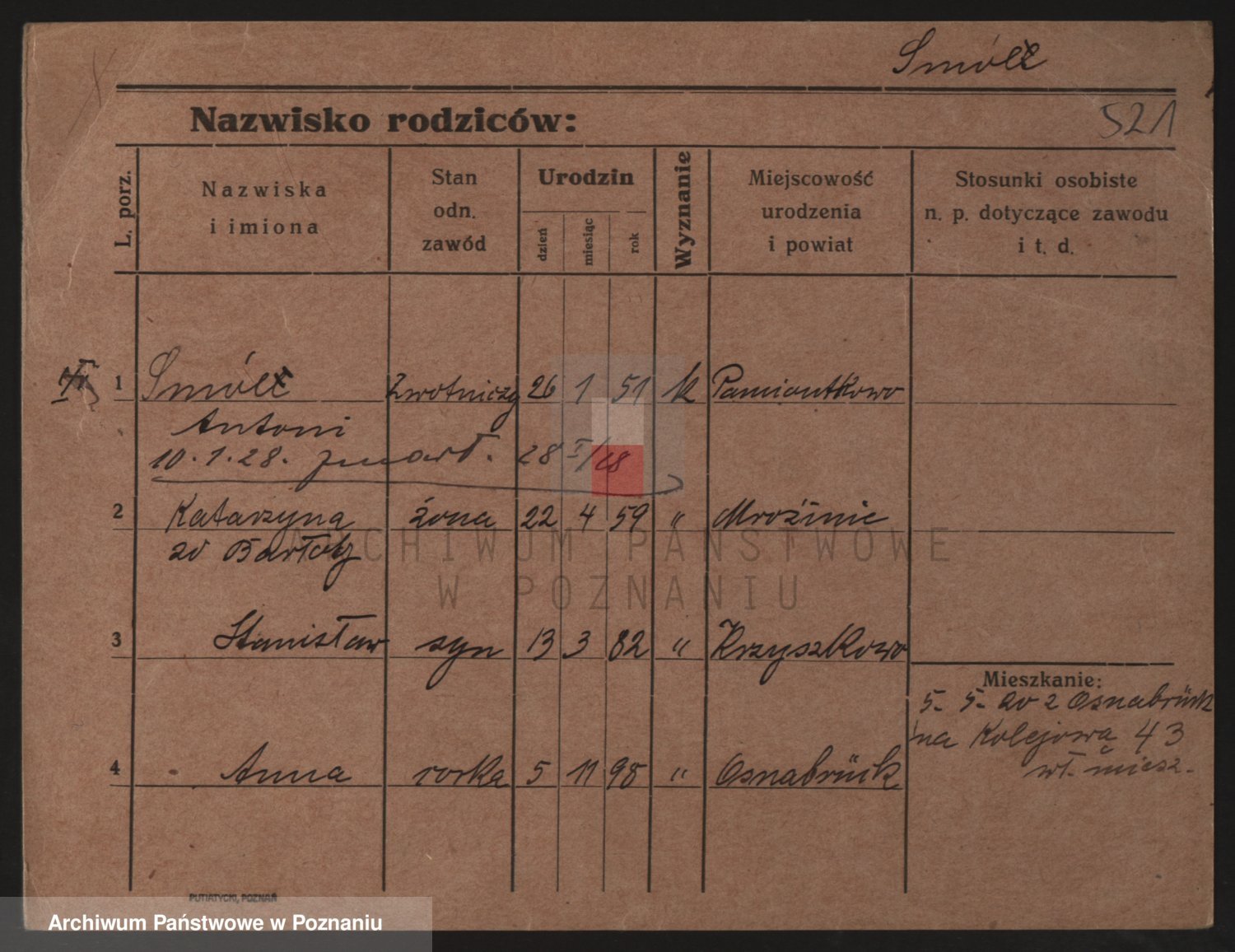 Podgląd karty osobowej dostępny jest po kliknięciu na nazwisko lub ikonkę karty. Można dokonywać powiększenia (ikony na górze) lub przechodzić między kolejnymi skanami (strzałki po bokach).