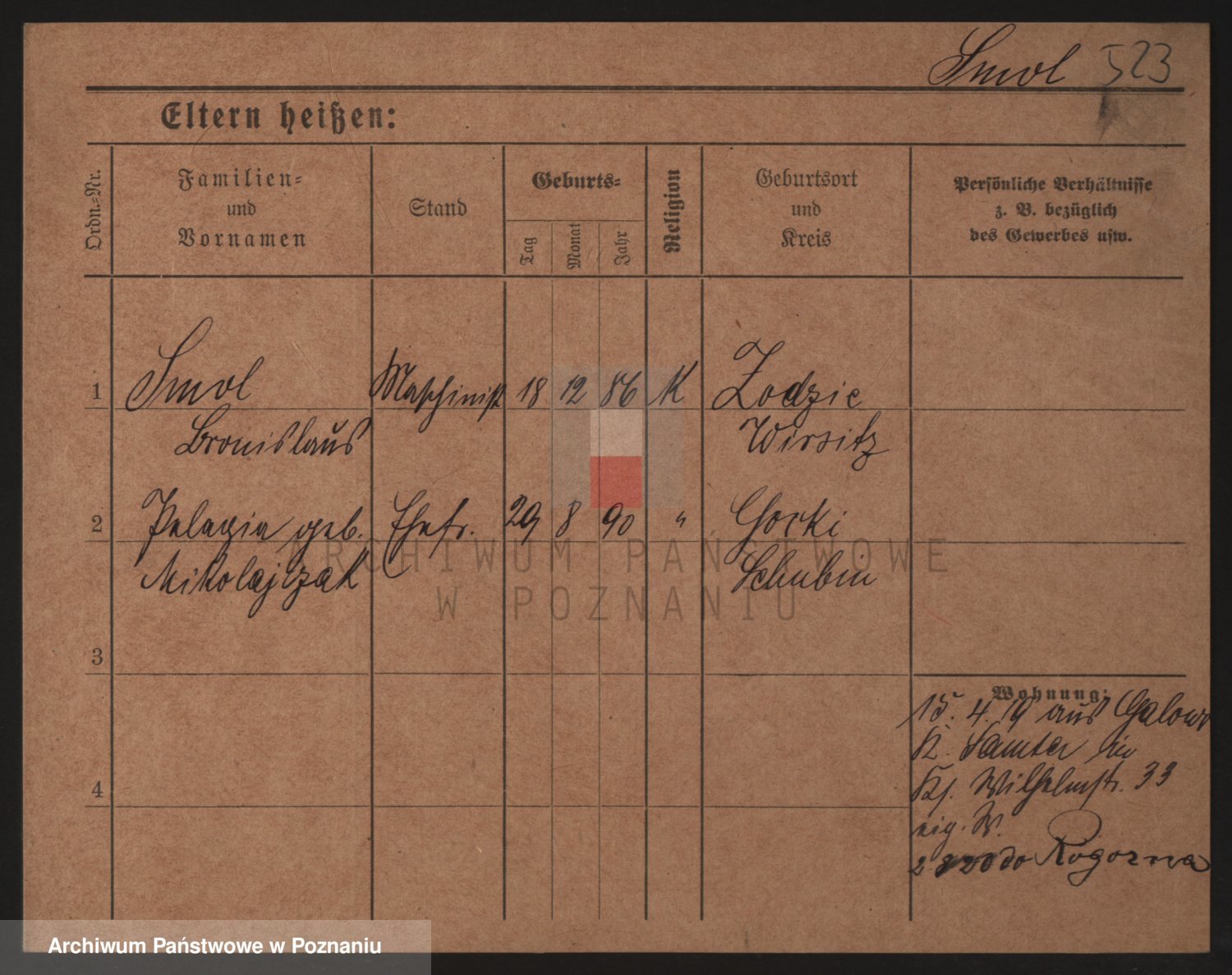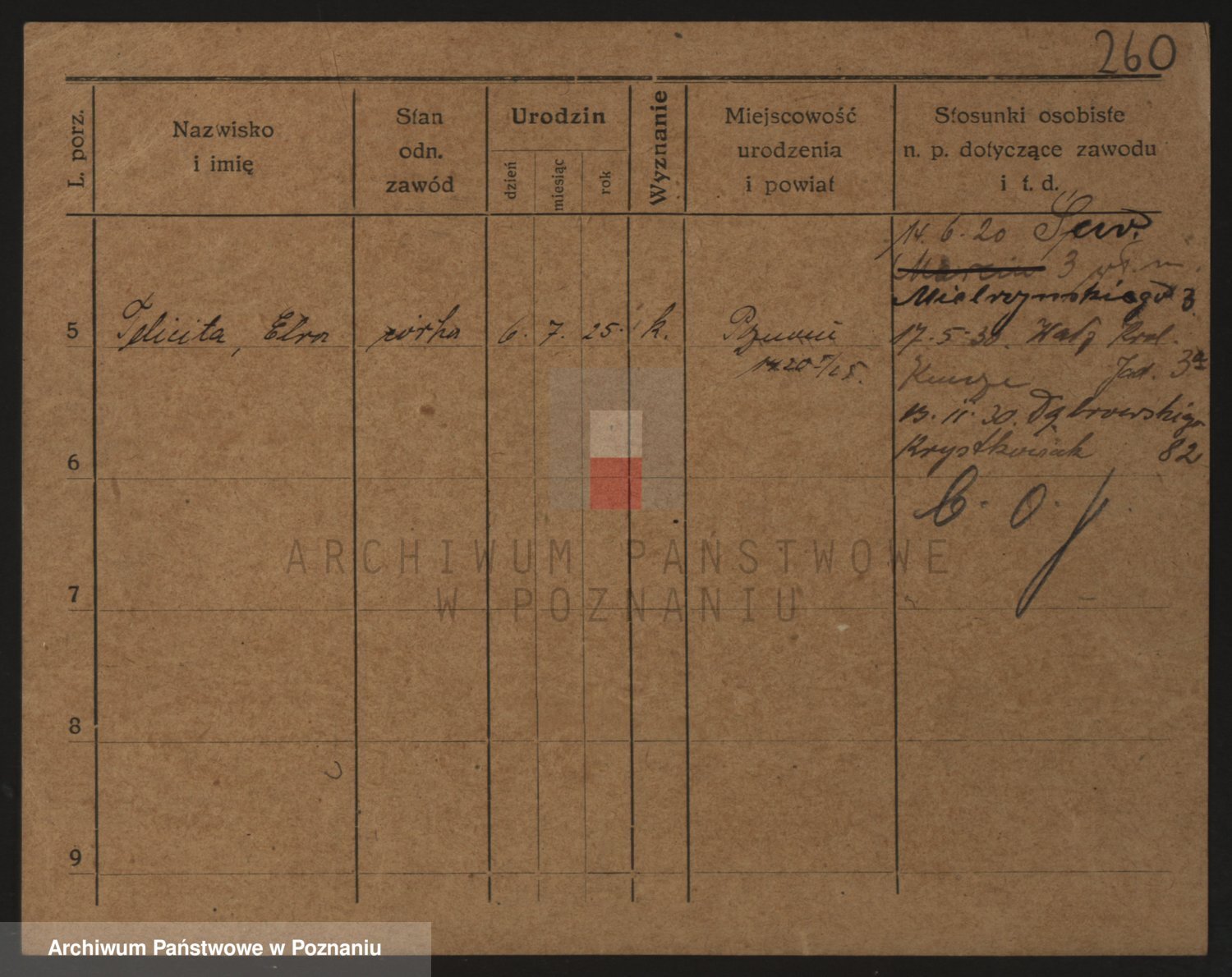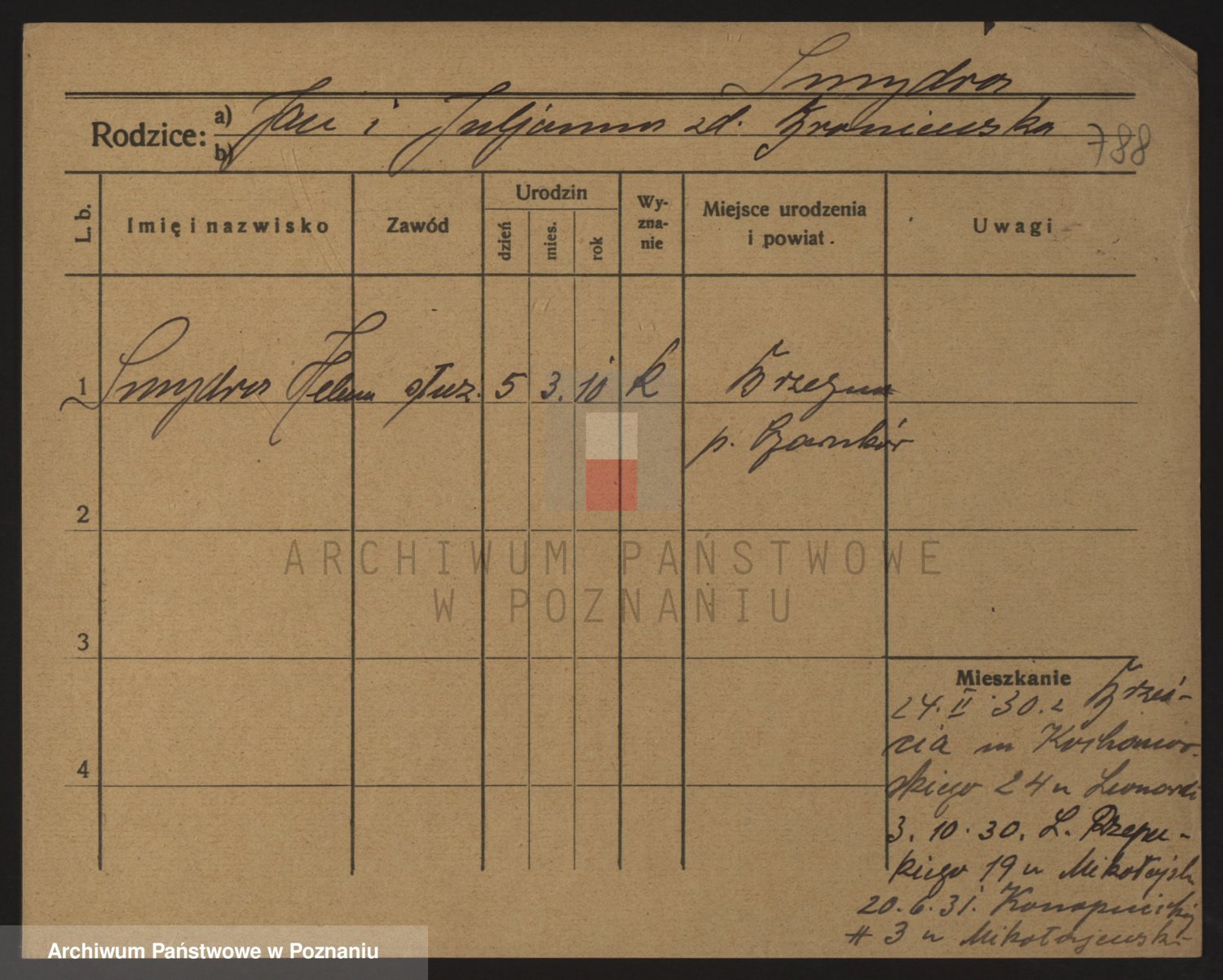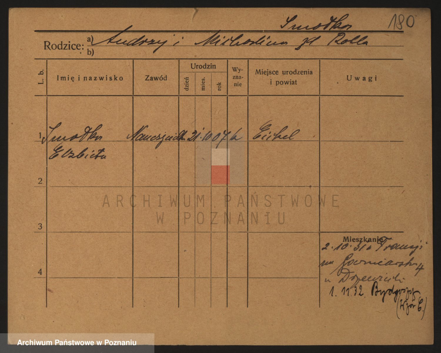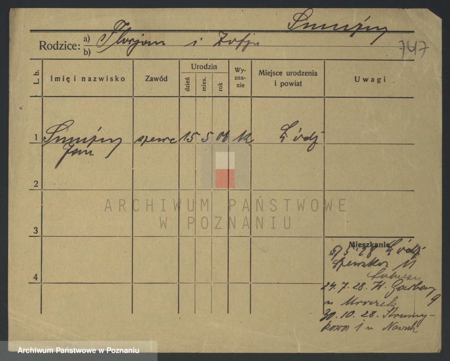 Podgląd karty osobowej dostępny jest po kliknięciu na nazwisko lub ikonkę karty. Można dokonywać powiększenia (ikony na górze) lub przechodzić między kolejnymi skanami (strzałki po bokach).