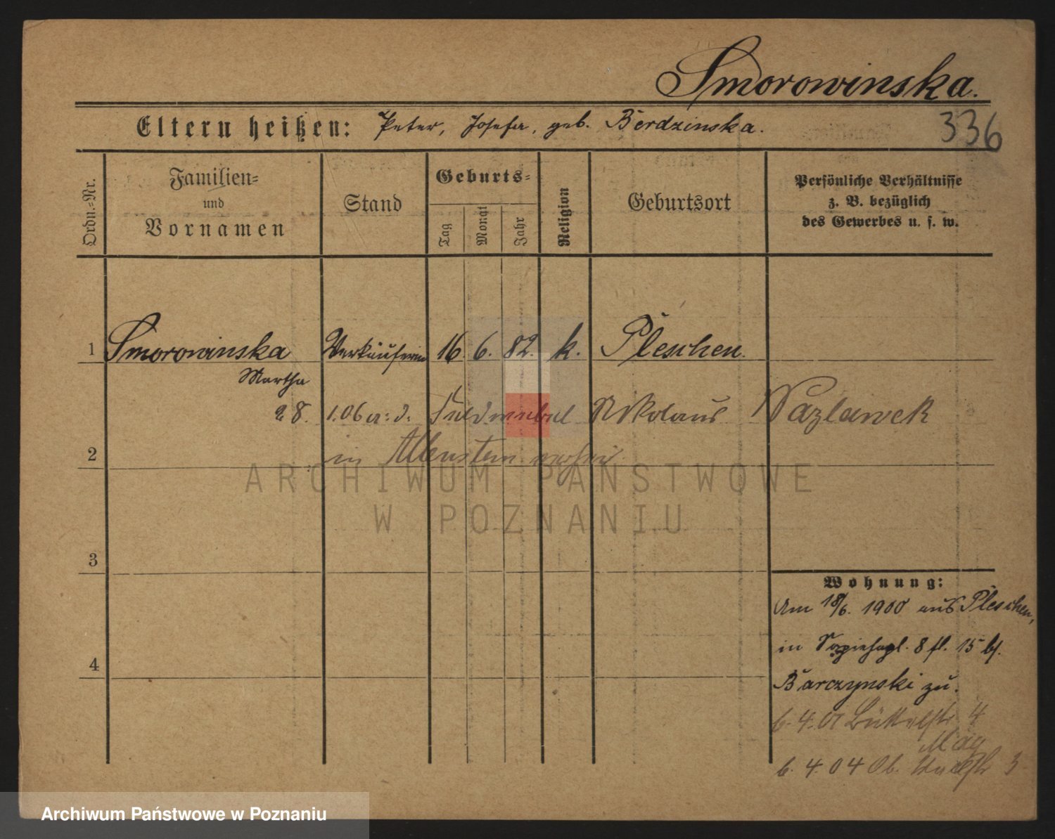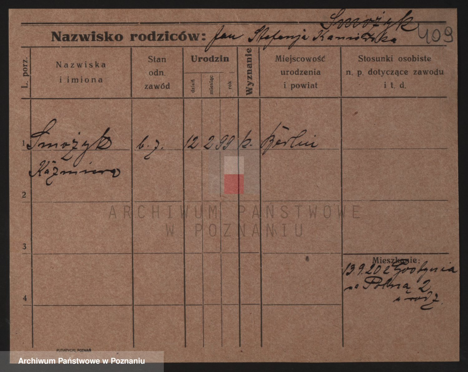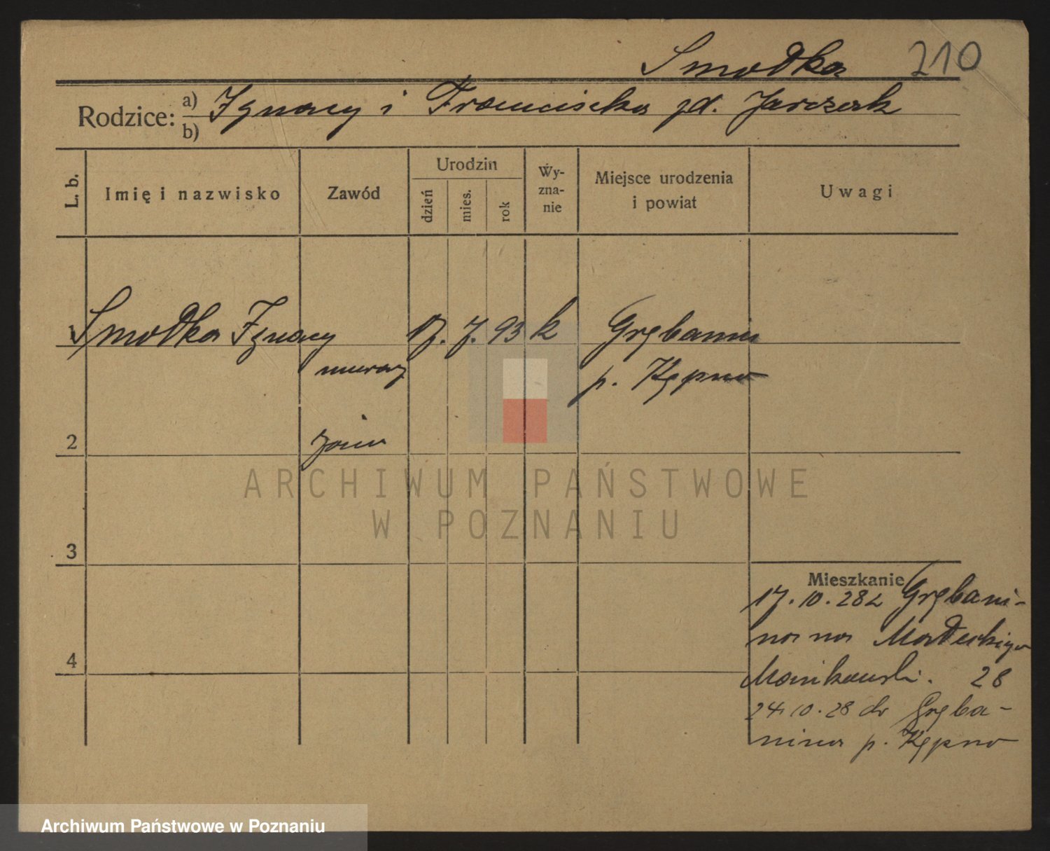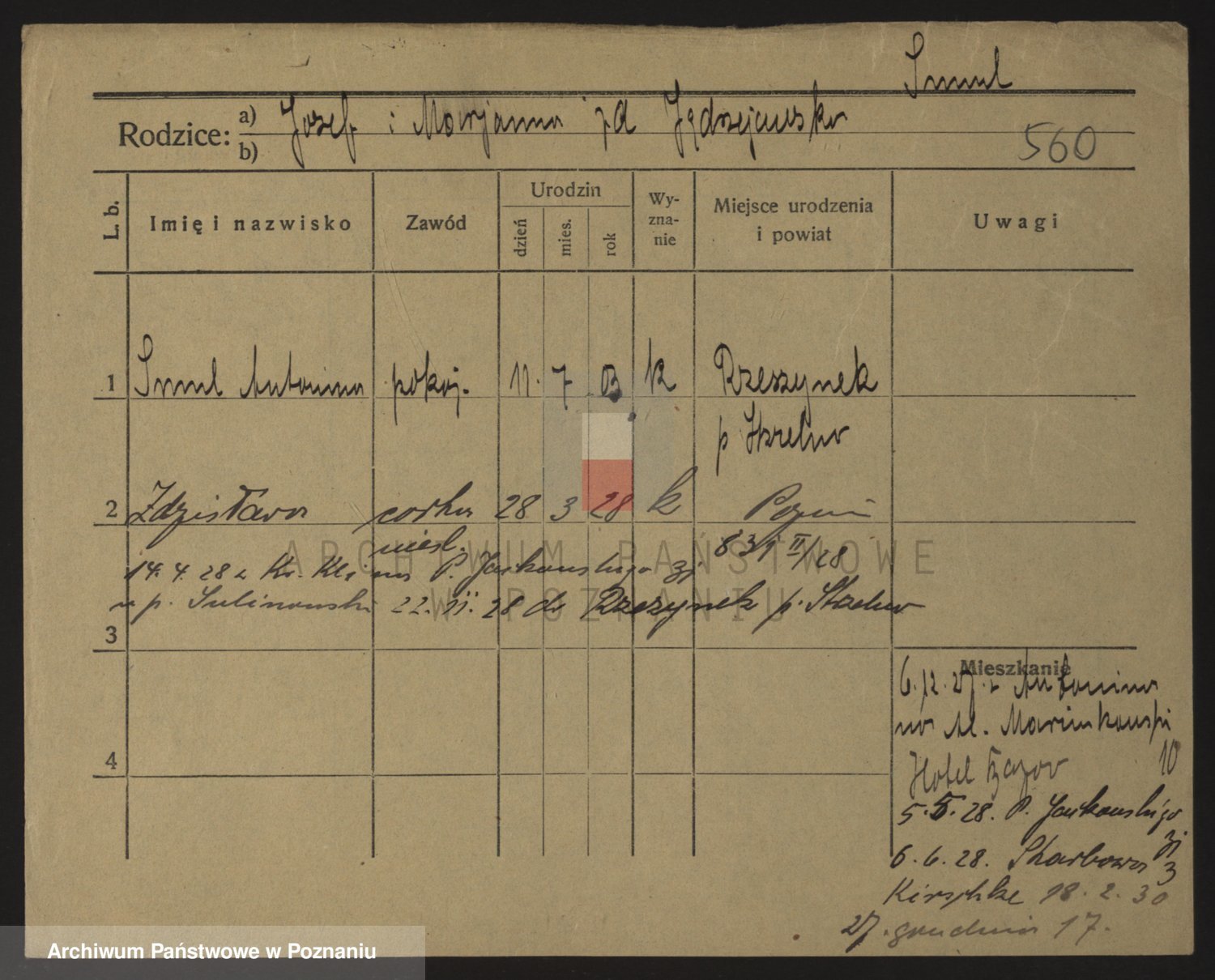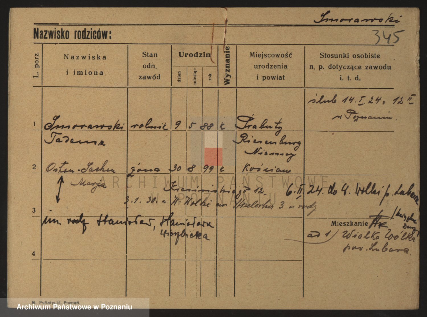 Podgląd karty osobowej dostępny jest po kliknięciu na nazwisko lub ikonkę karty. Można dokonywać powiększenia (ikony na górze) lub przechodzić między kolejnymi skanami (strzałki po bokach).