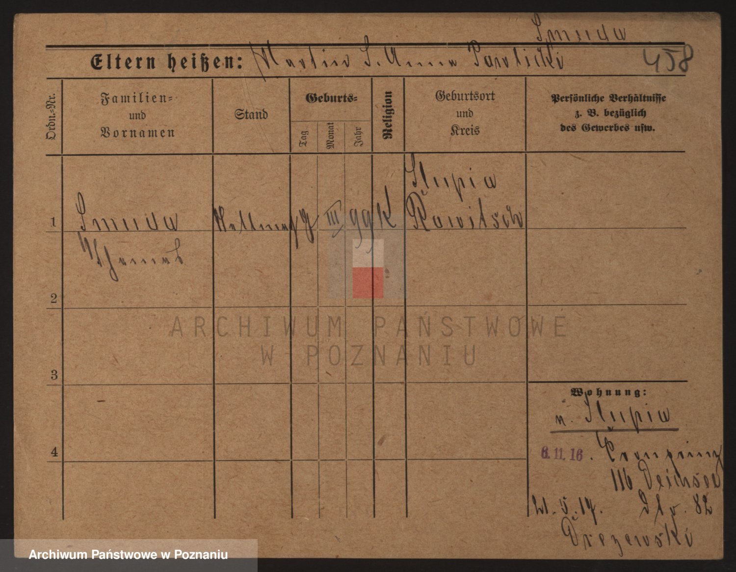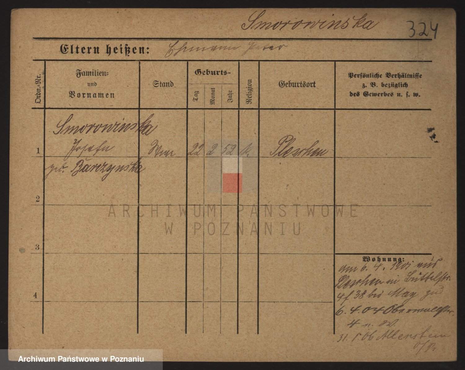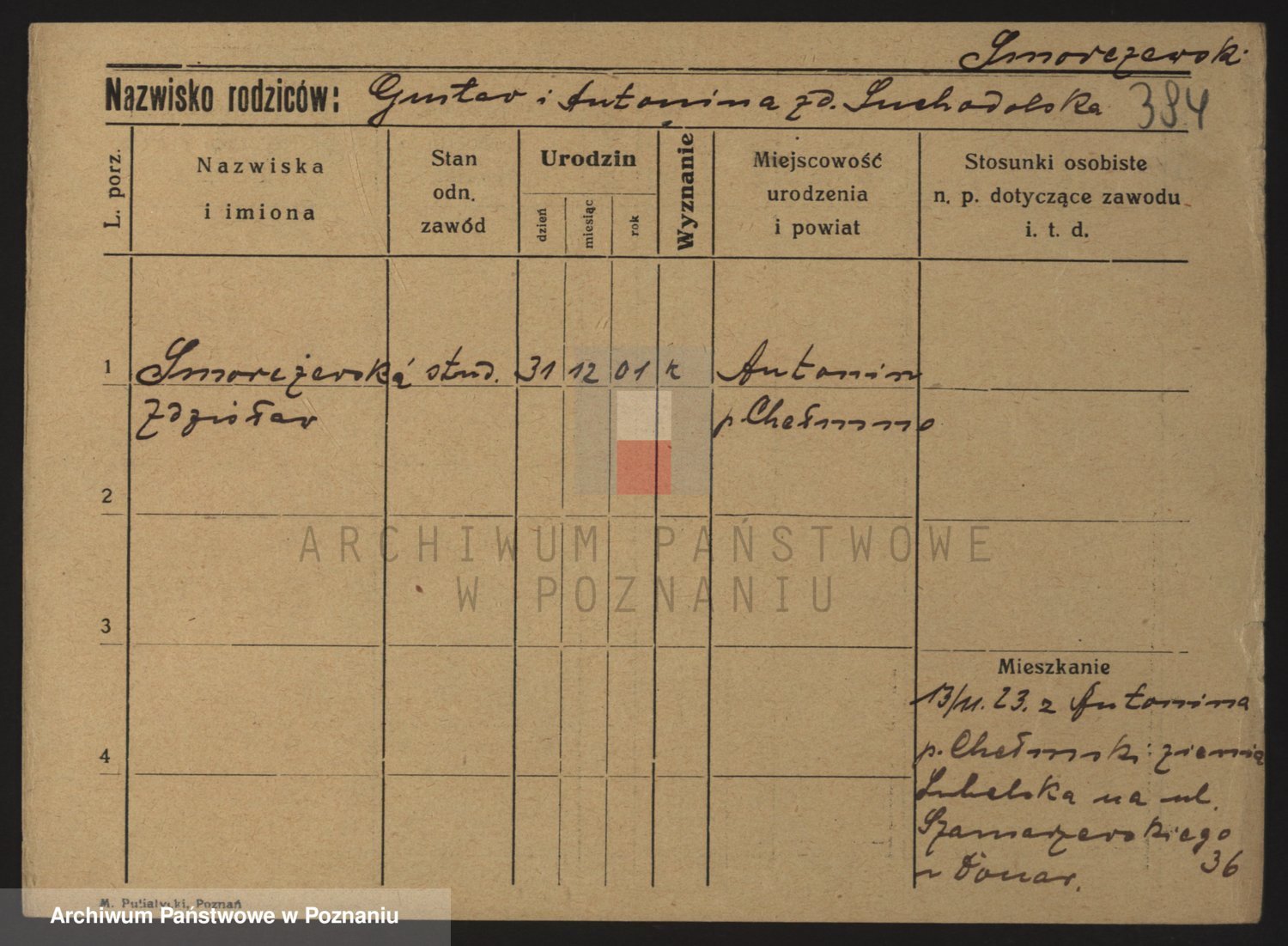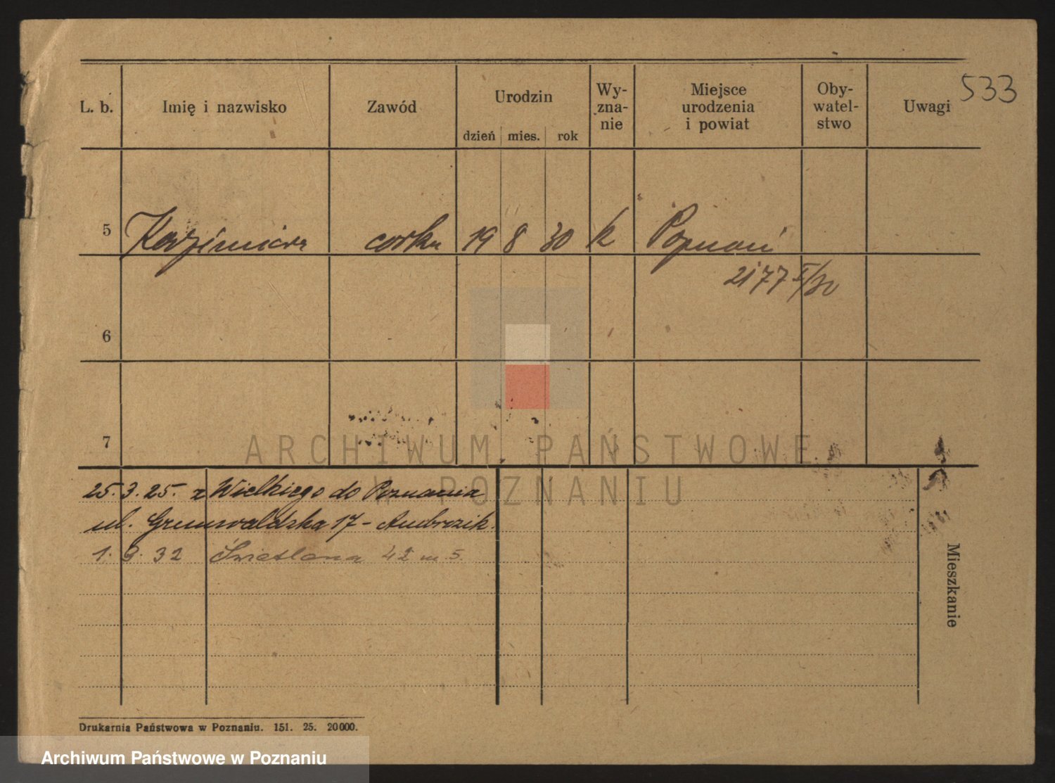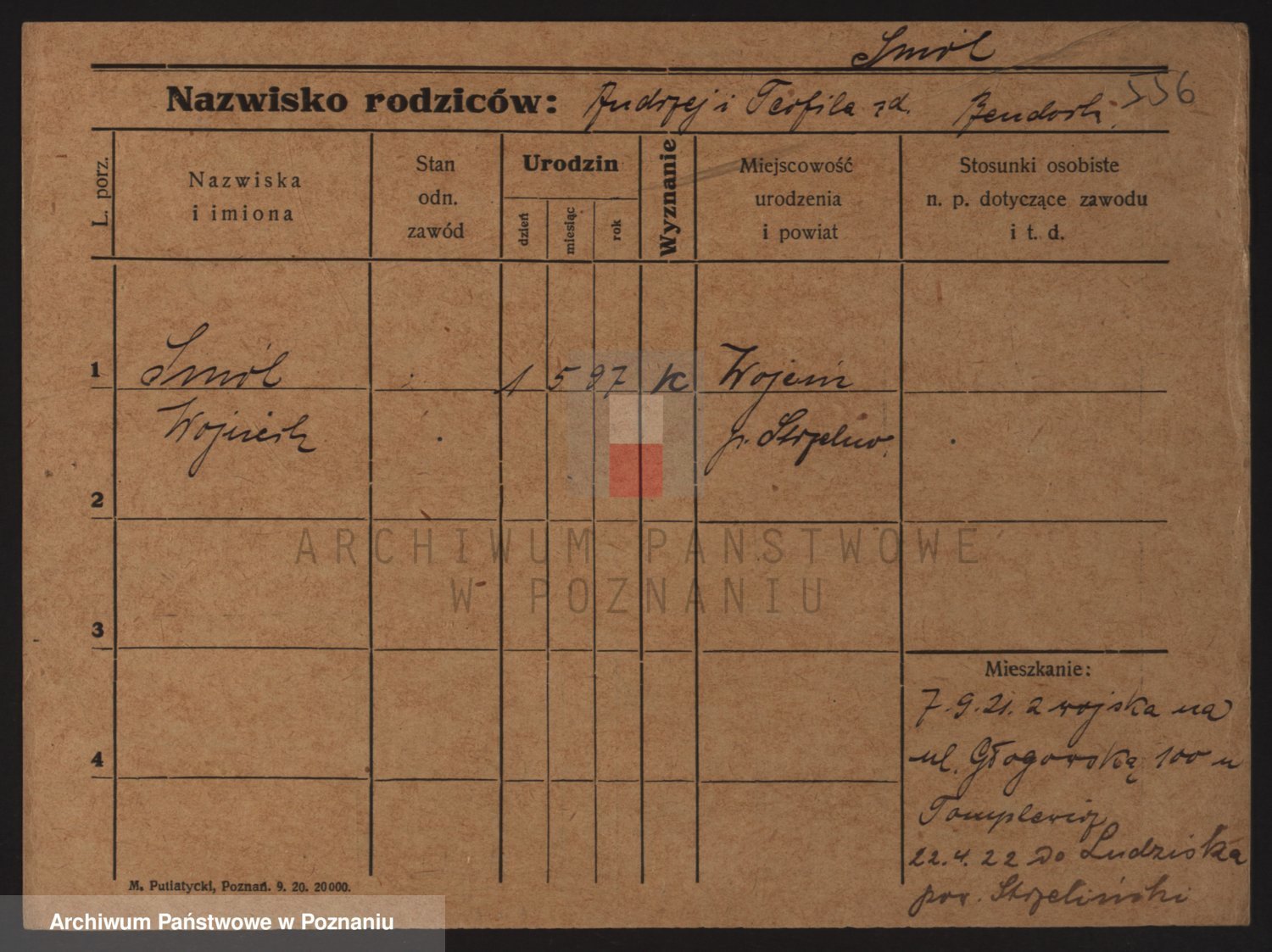 Podgląd karty osobowej dostępny jest po kliknięciu na nazwisko lub ikonkę karty. Można dokonywać powiększenia (ikony na górze) lub przechodzić między kolejnymi skanami (strzałki po bokach).