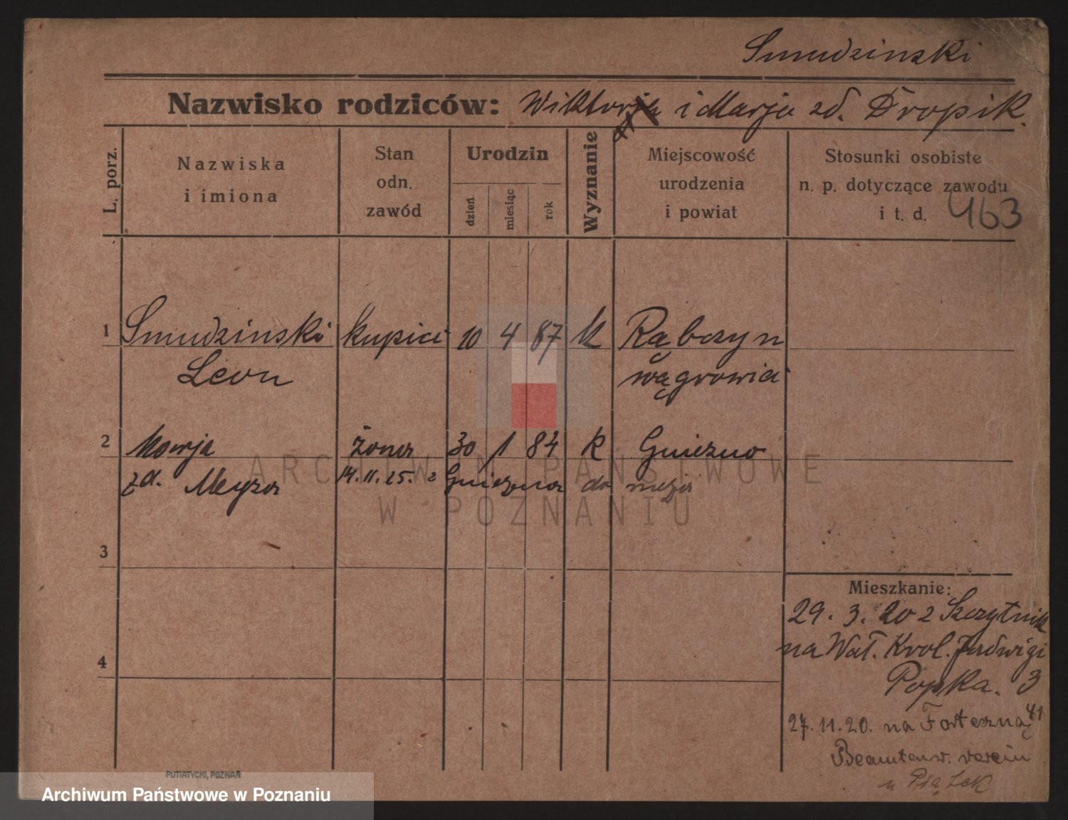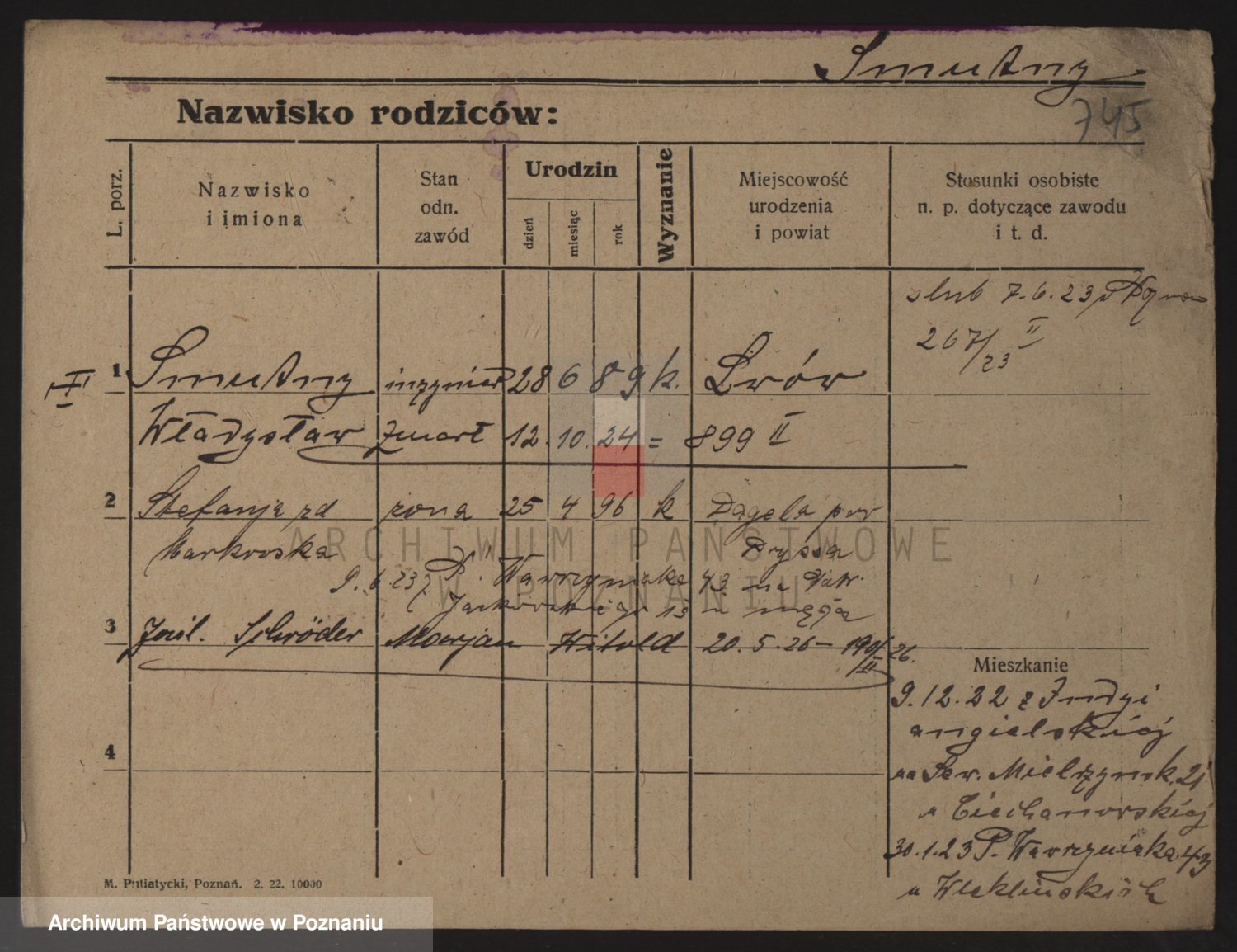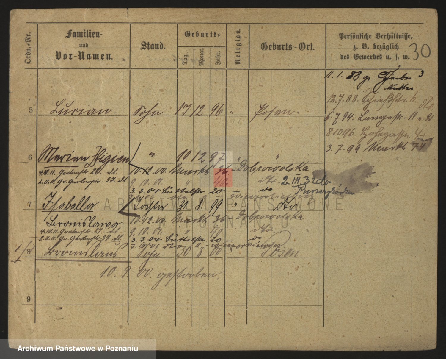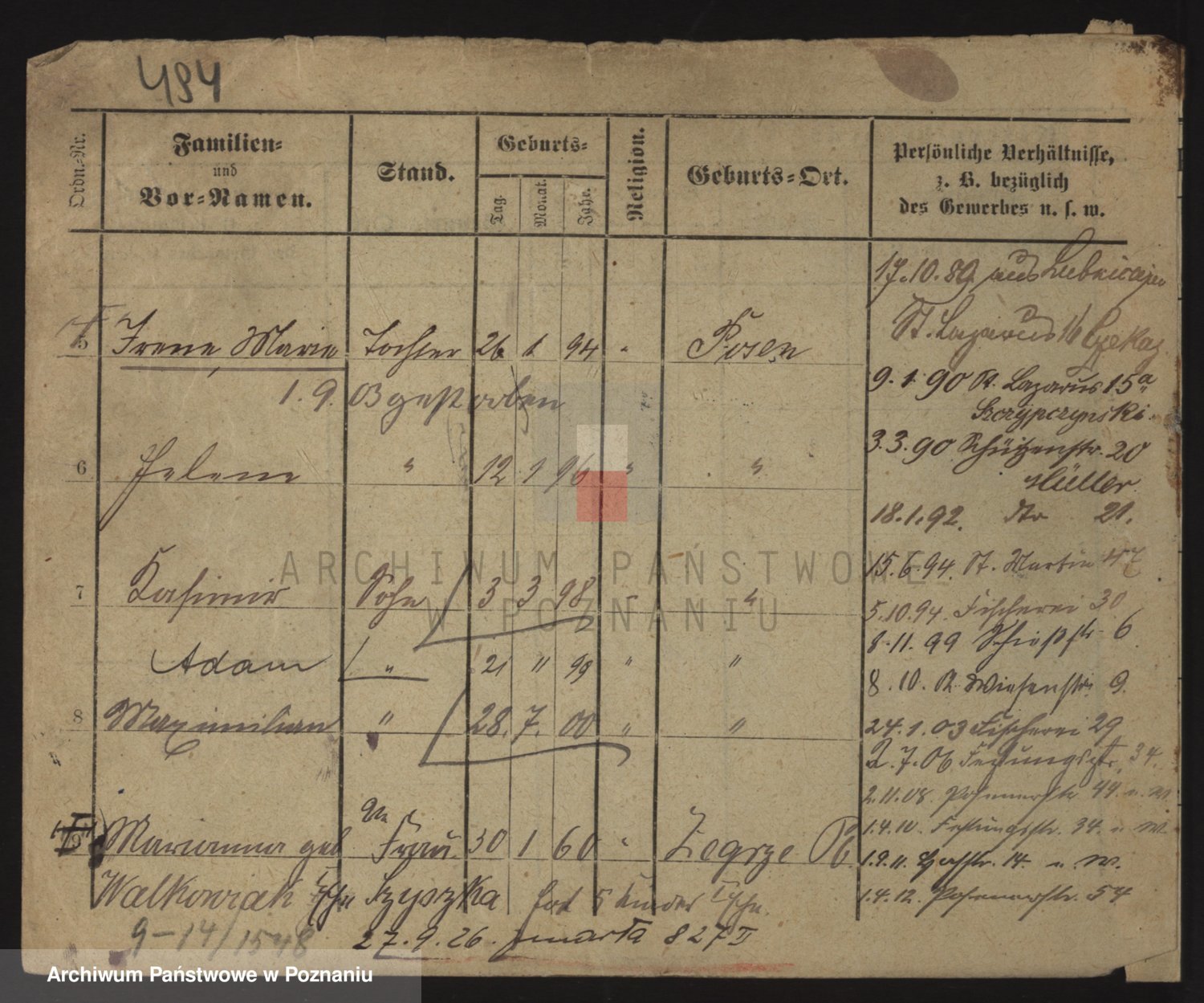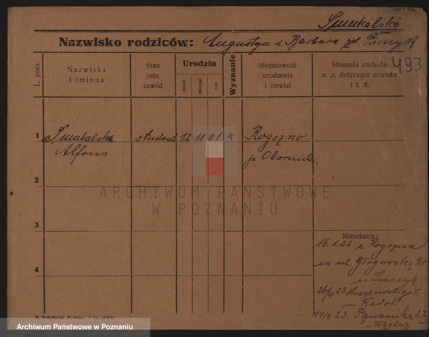 Podgląd karty osobowej dostępny jest po kliknięciu na nazwisko lub ikonkę karty. Można dokonywać powiększenia (ikony na górze) lub przechodzić między kolejnymi skanami (strzałki po bokach).