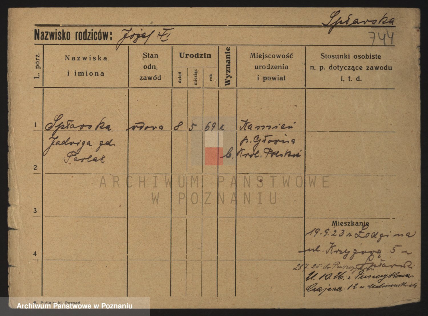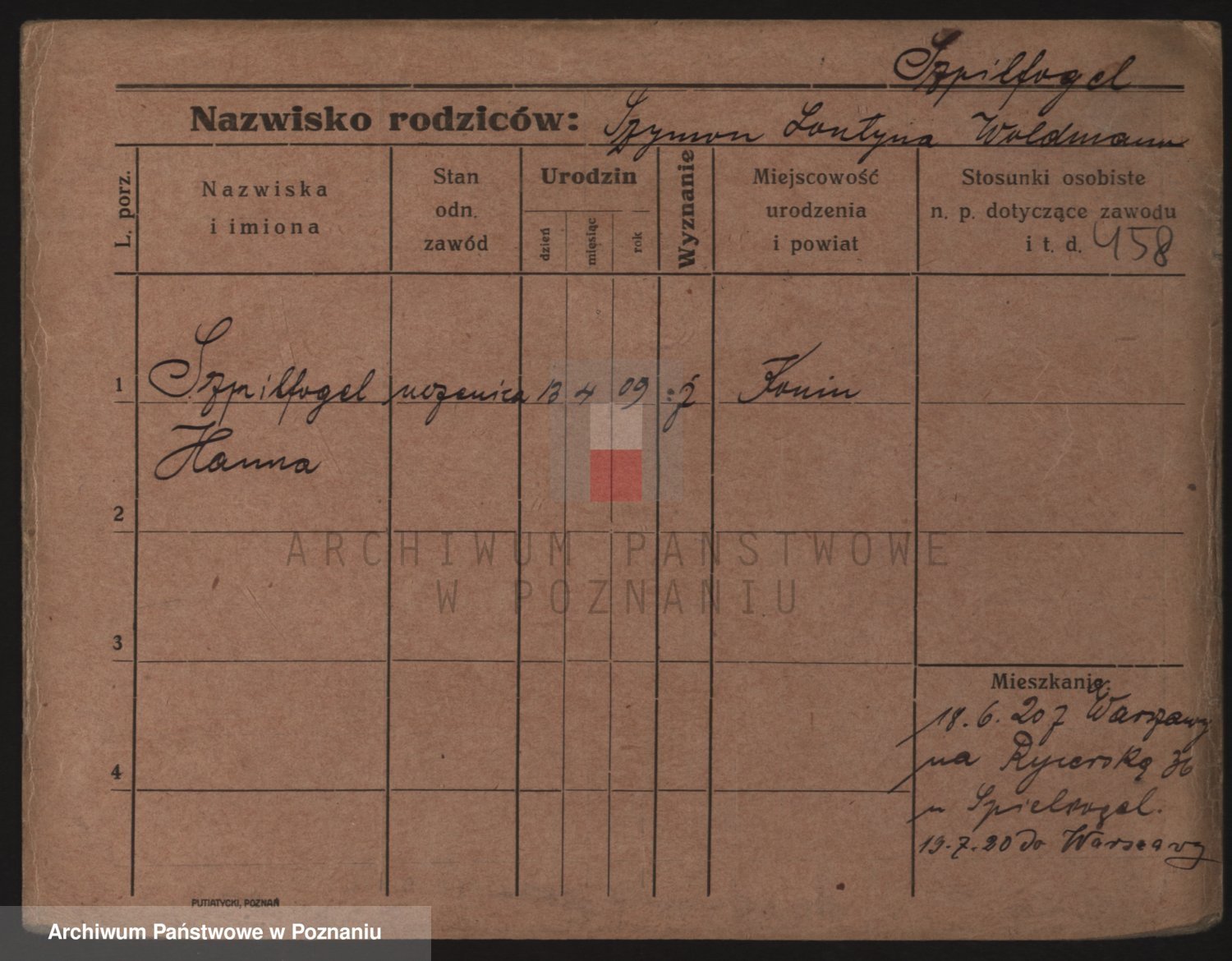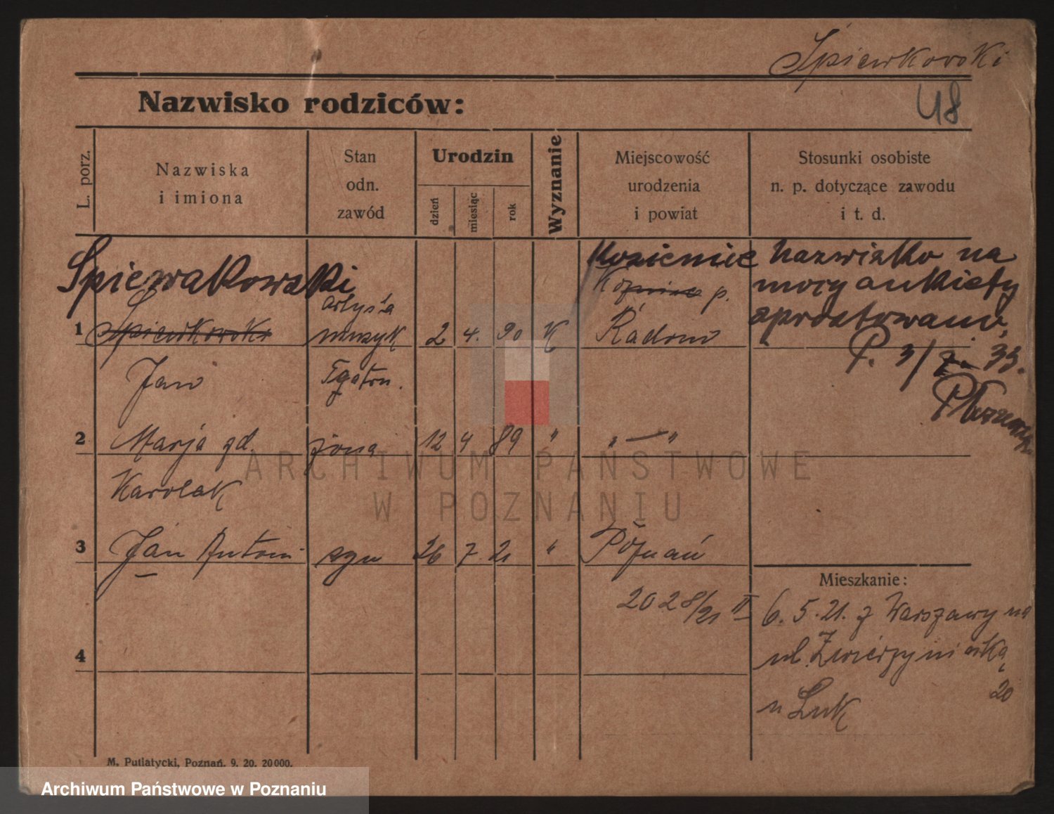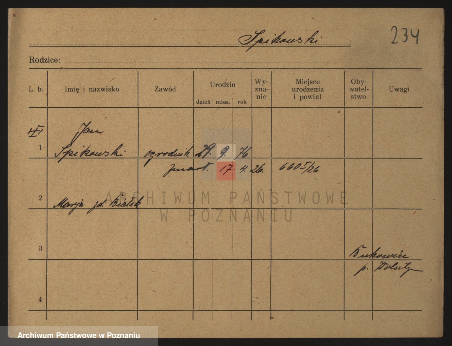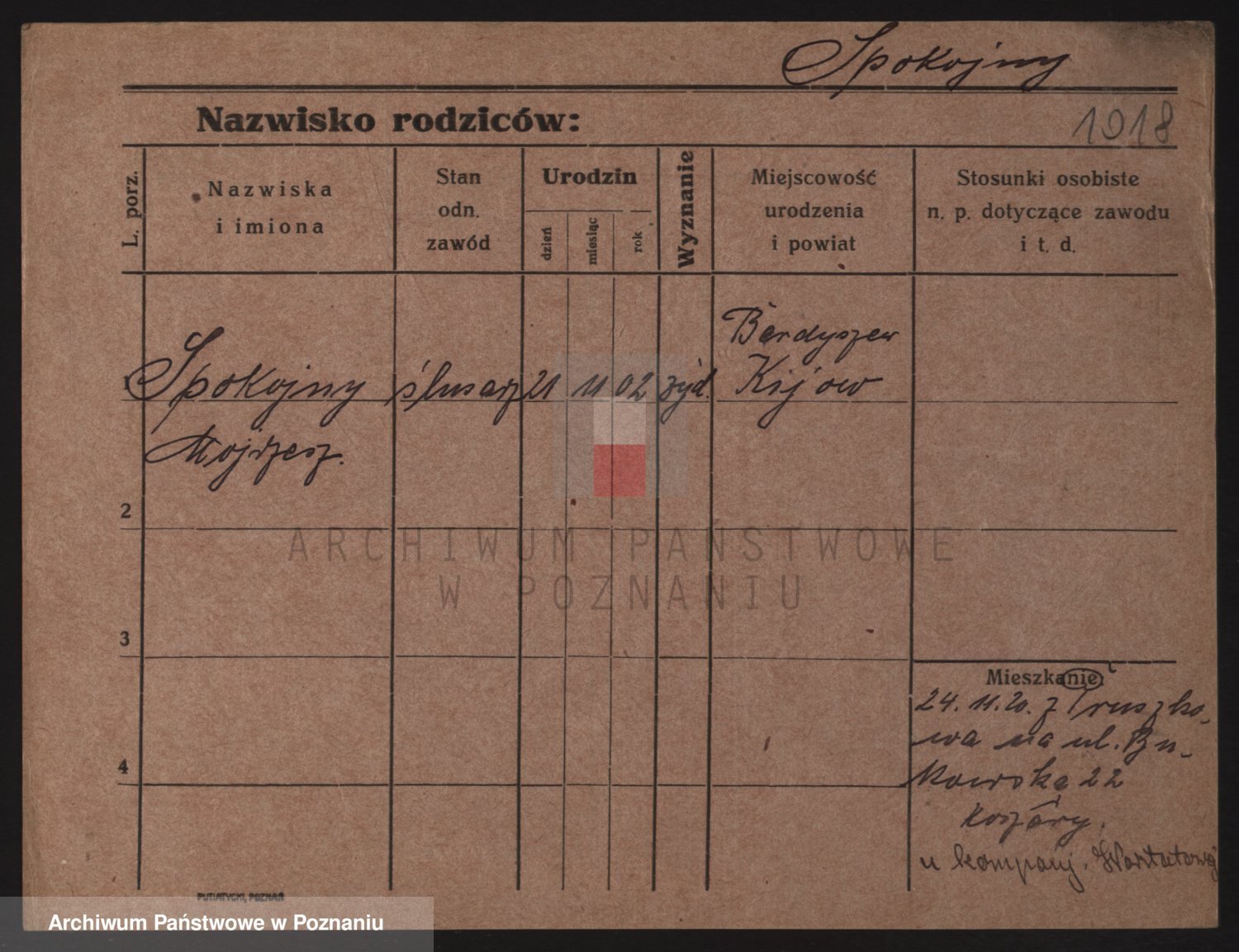 Podgląd karty osobowej dostępny jest po kliknięciu na nazwisko lub ikonkę karty. Można dokonywać powiększenia (ikony na górze) lub przechodzić między kolejnymi skanami (strzałki po bokach).